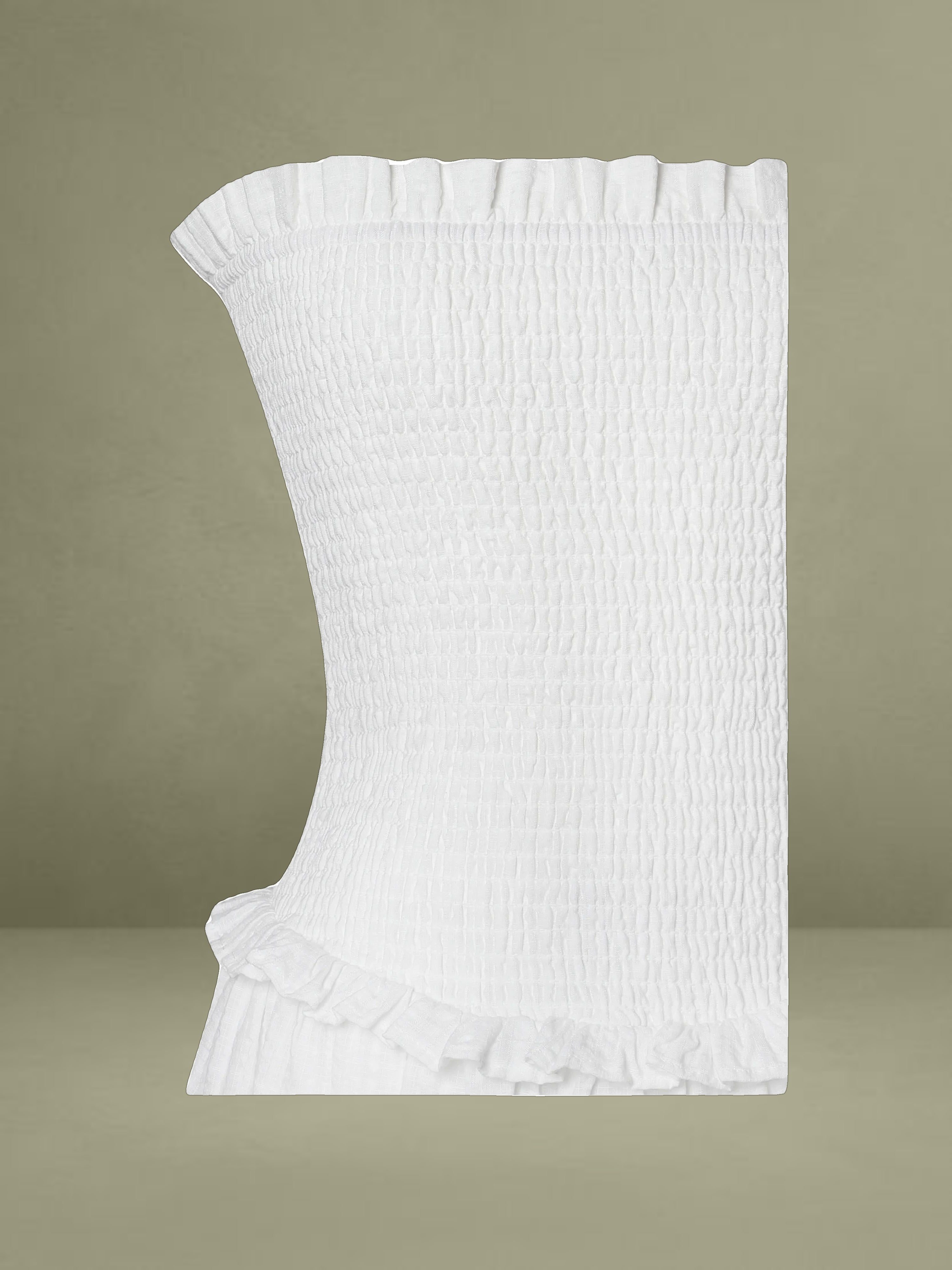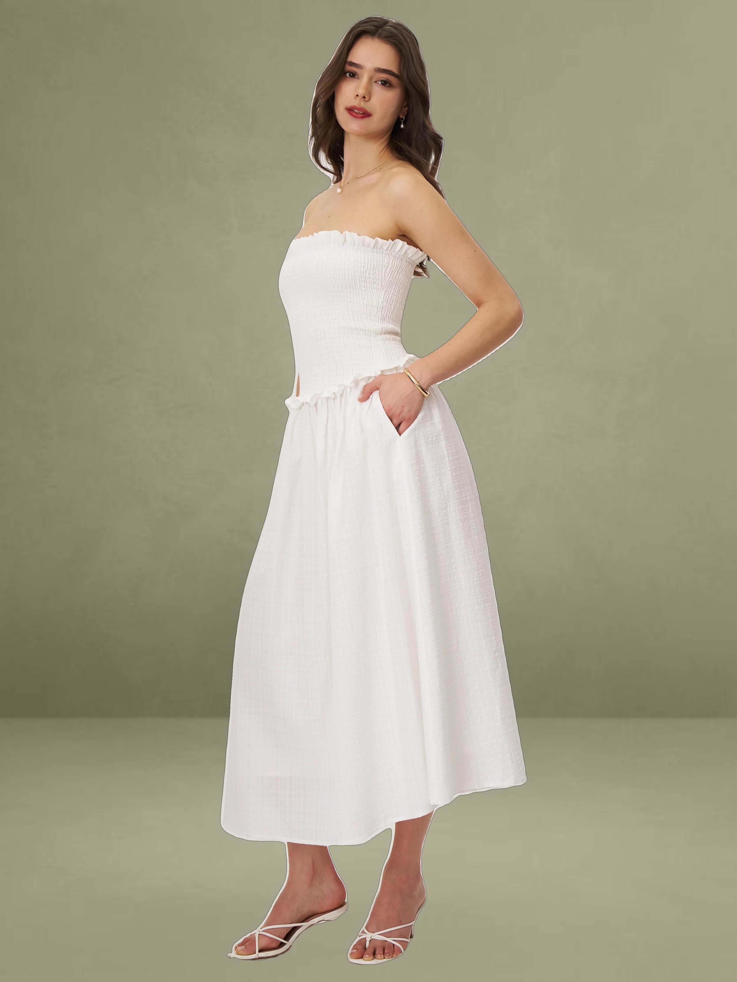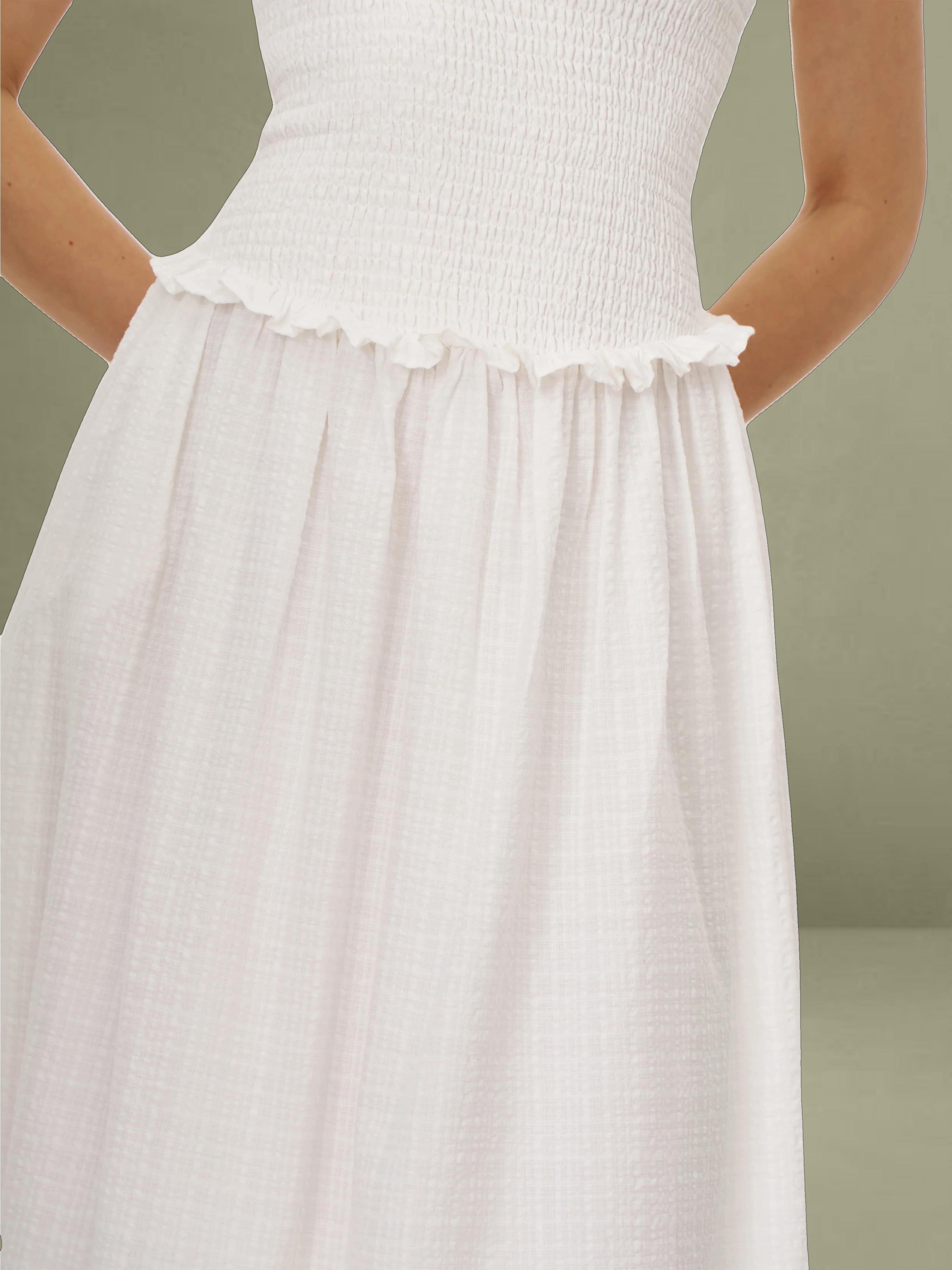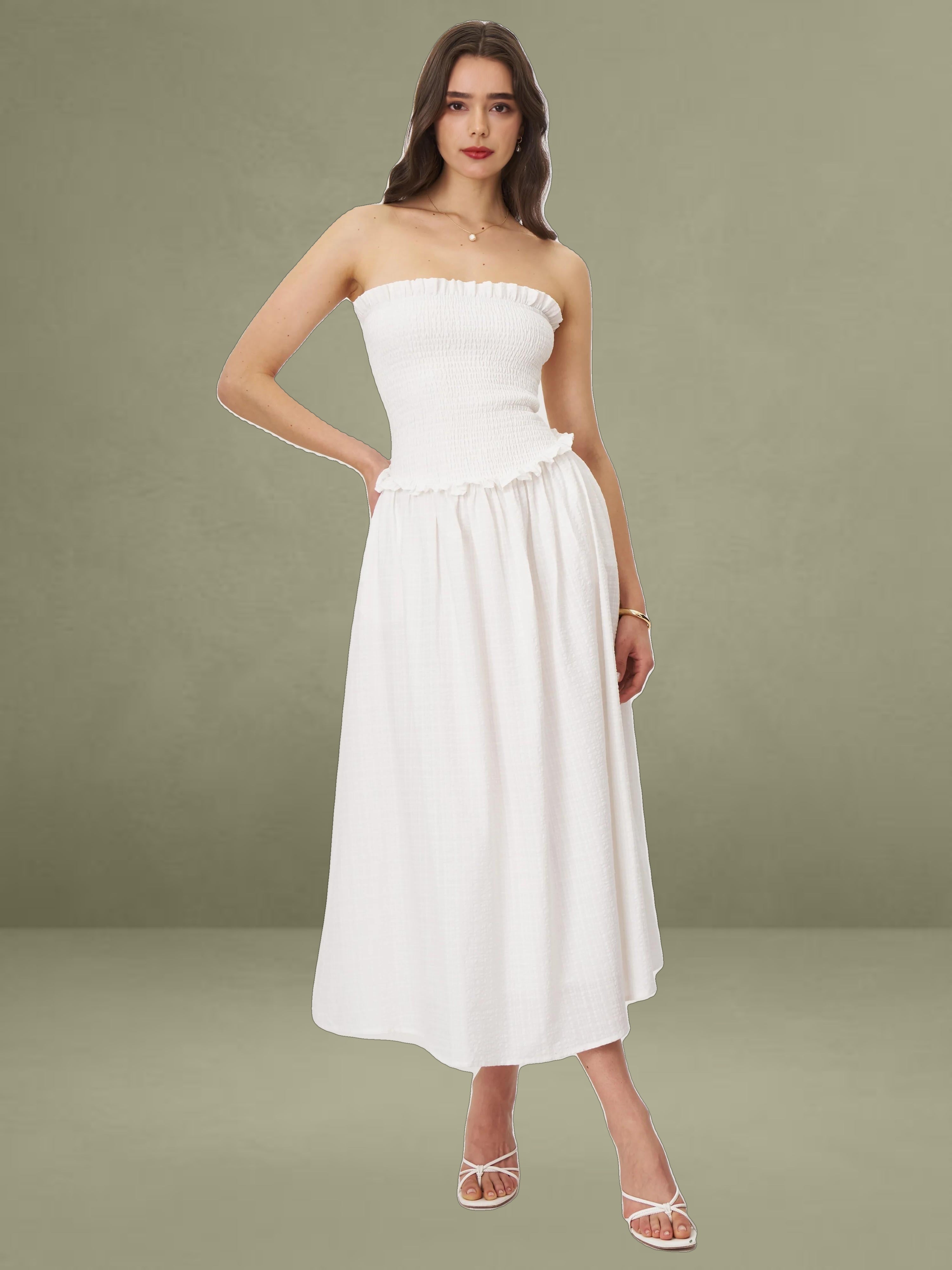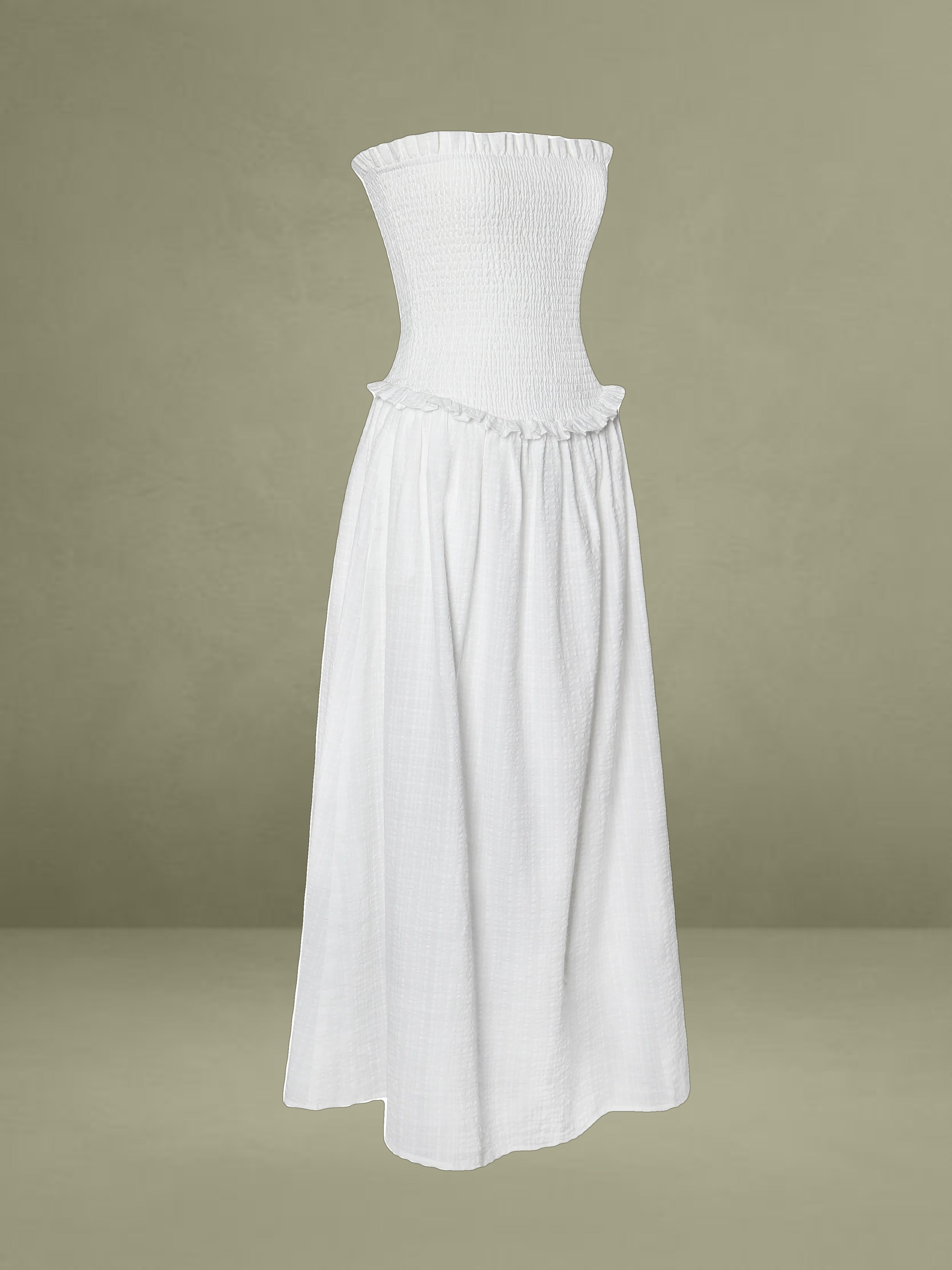 Breezy and romantic, the Quadiya Dress is your go-to piece for summer escapes. Crafted from airy white cotton seersucker, this strapless midi dress features a smocked top that hugs the body comfortably and a playful drop waist that flows into a ruffle-trimmed skirt. Lightweight and fully vacation-ready, it’s perfect for holidays, beach strolls, and sunny days. Finished with an invisible zipper for a seamless fit.