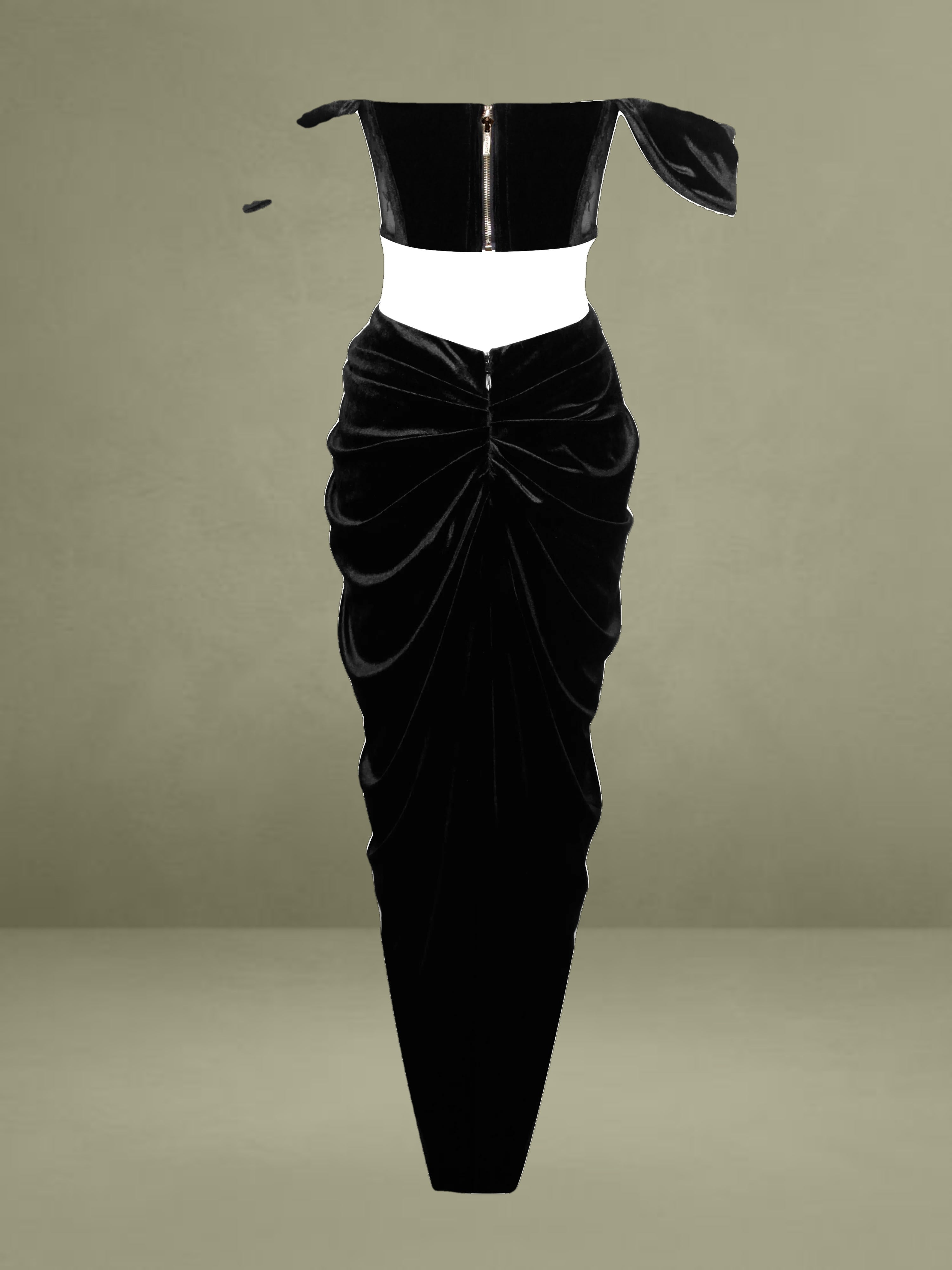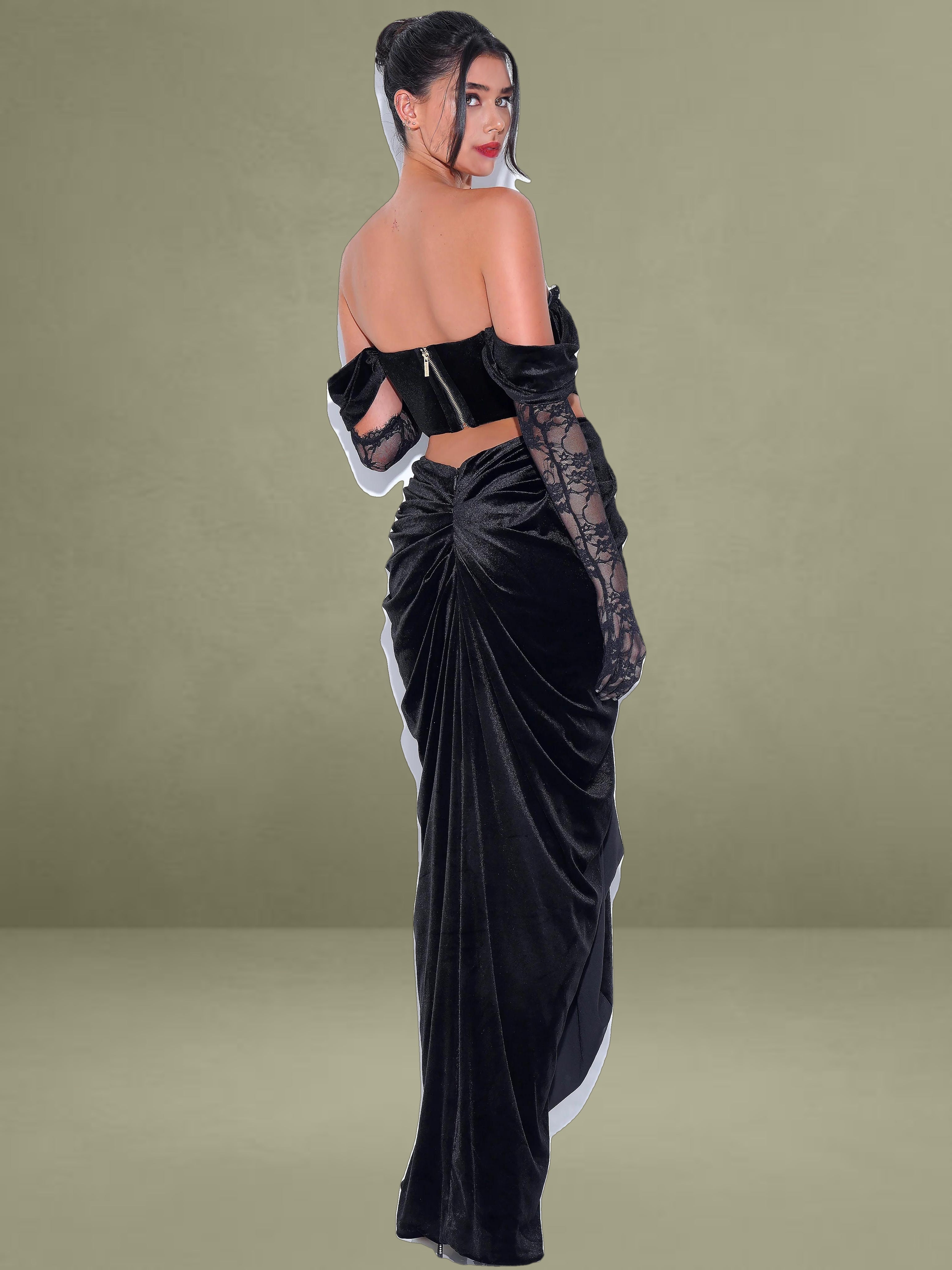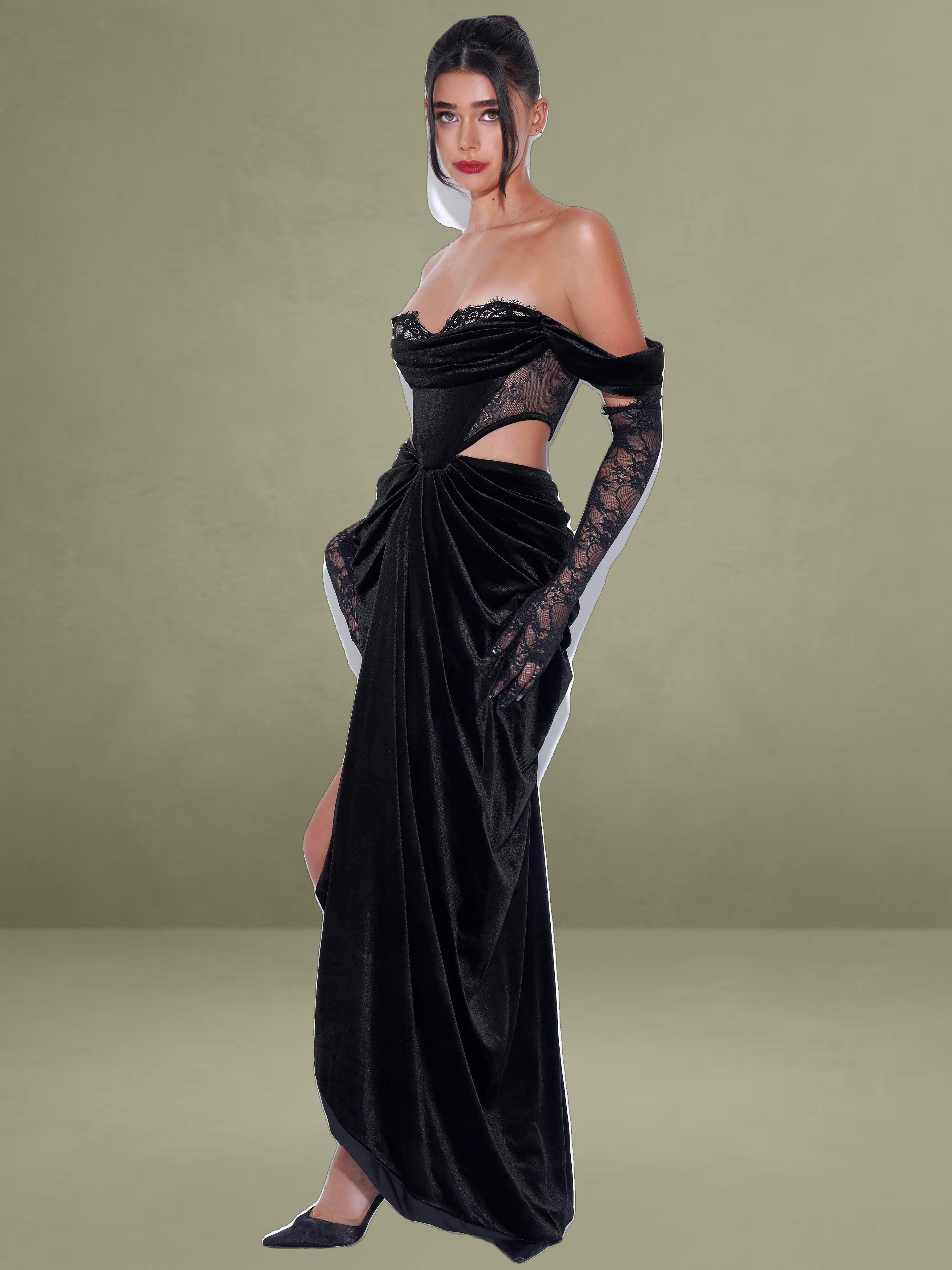 Classic and timeless, this Miss Circle strapless corset is designed to turn heads. Ruching detail, bodice cut-outs, and a sleek high-slit take this timeless look to the next level. Fully lined for a comfortable fit and made of stretch velvet, it guarantees to make you feel like a queen. Get it today and show 'em who's boss! Also available in teal. Don’t forget to complete the look with our Rae Black Lace Opera-length Gloves! (sold separately).