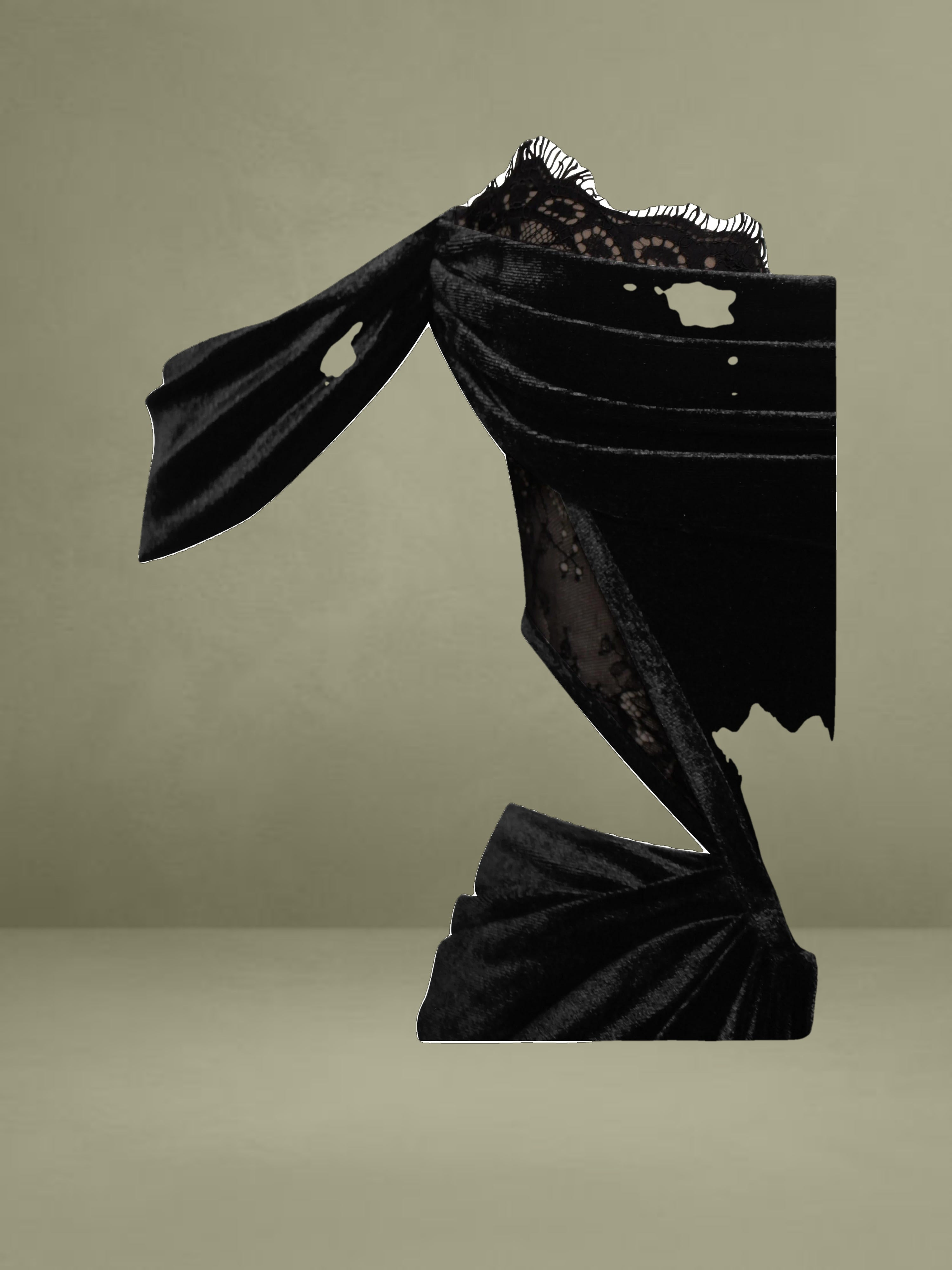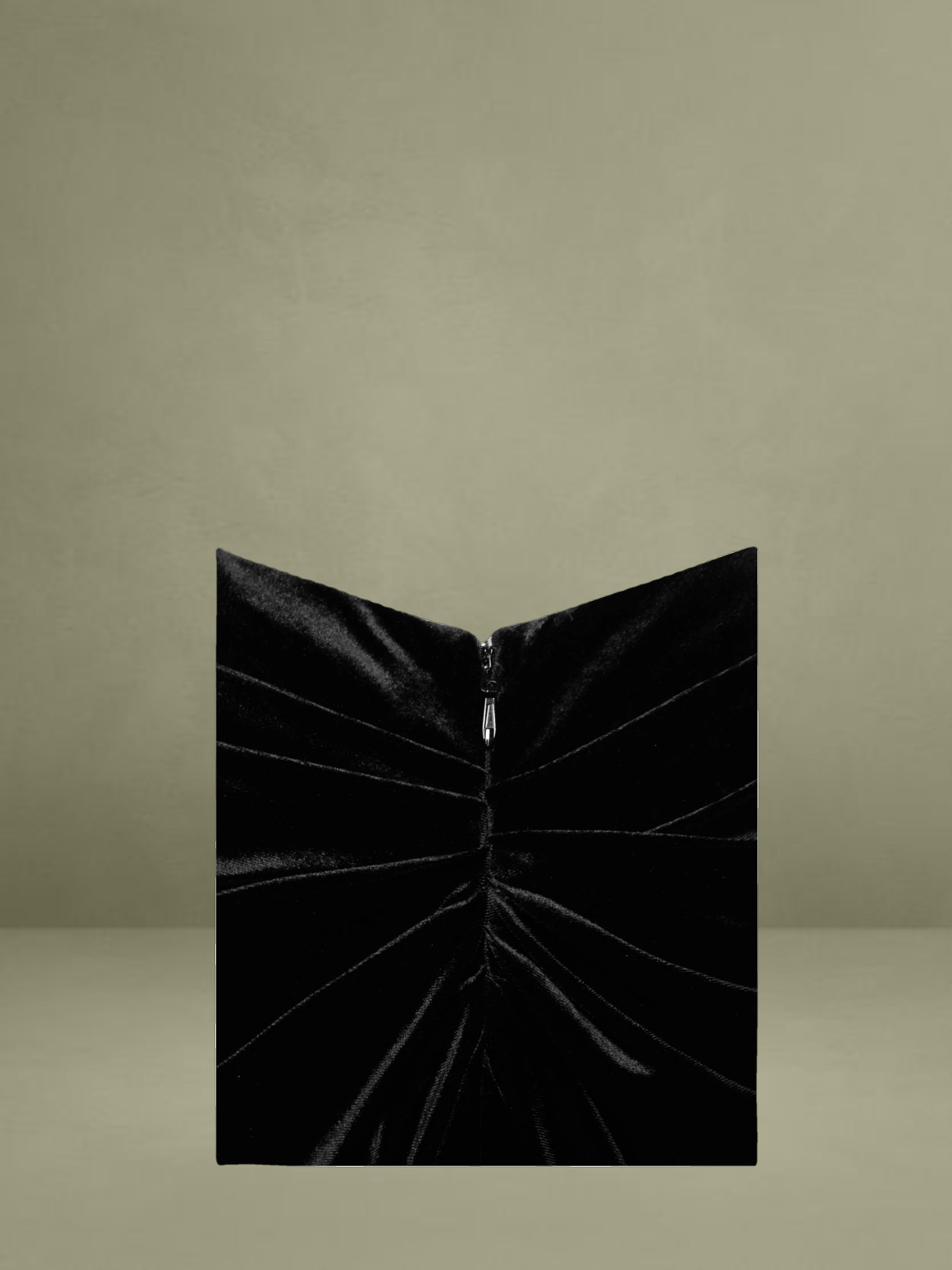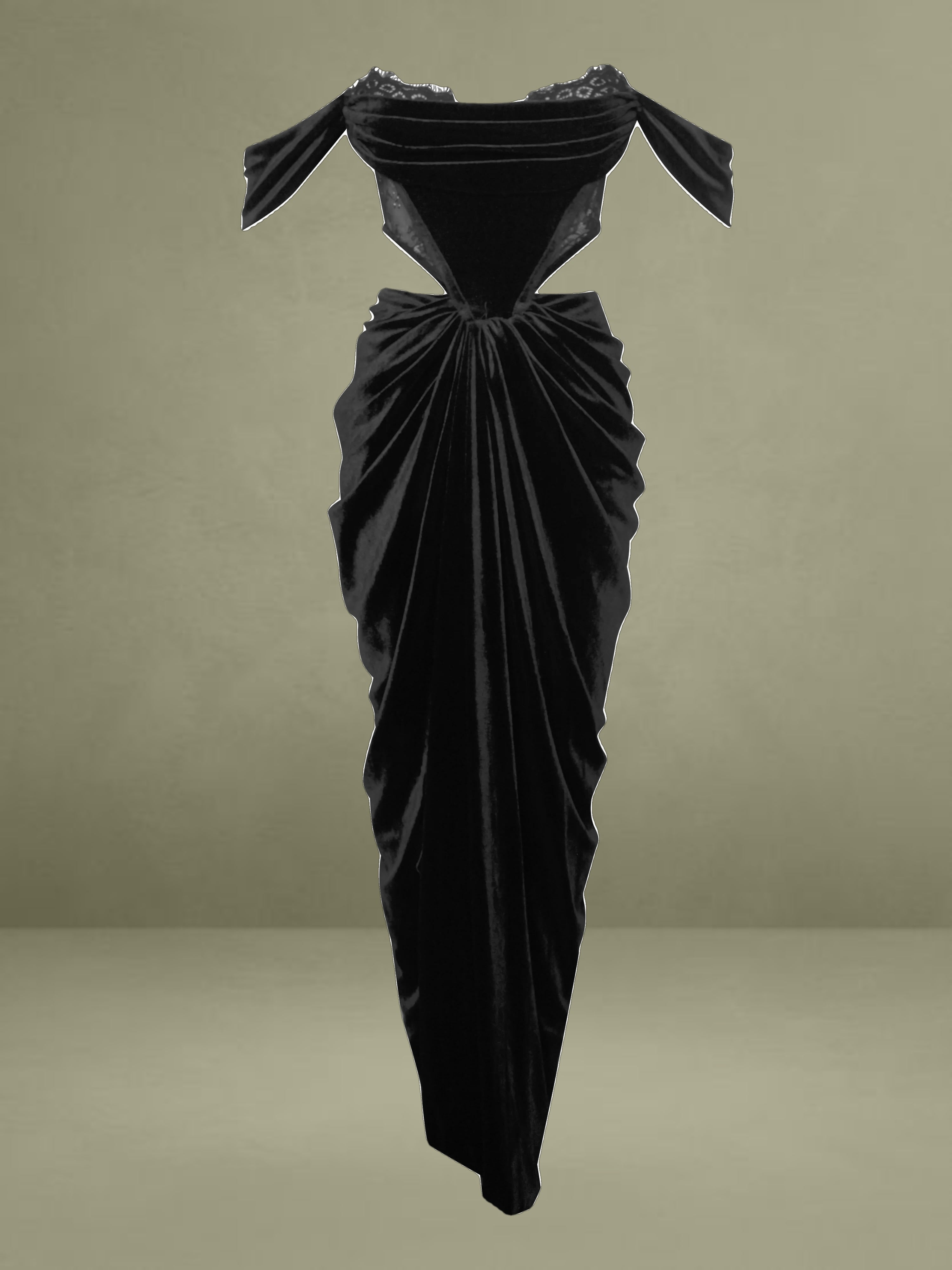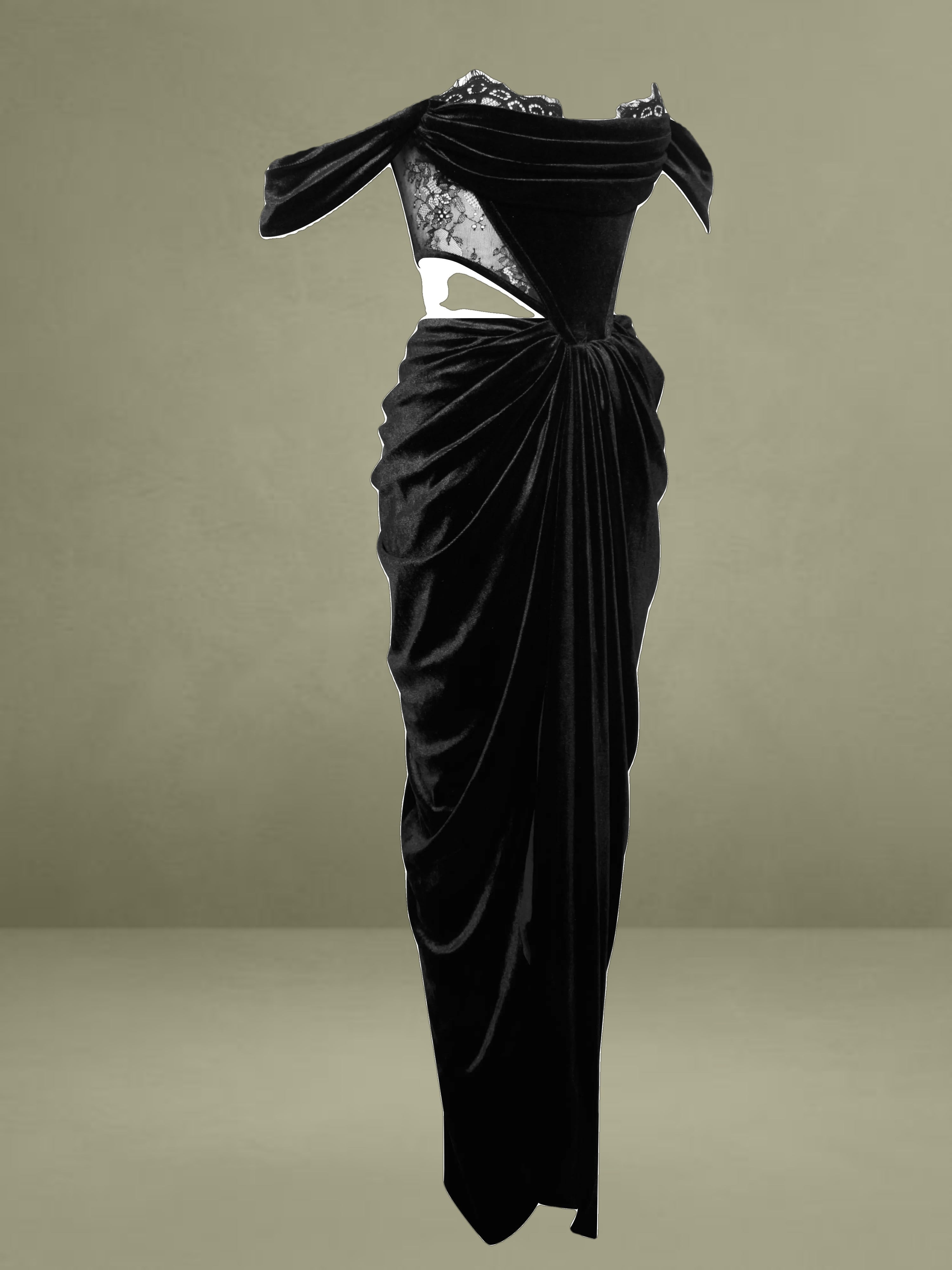 Classic and timeless, this Miss Circle strapless corset is designed to turn heads. Ruching detail, bodice cut-outs, and a sleek high-slit take this timeless look to the next level. Fully lined for a comfortable fit and made of stretch velvet, it guarantees to make you feel like a queen. Get it today and show 'em who's boss! Also available in teal. Don’t forget to complete the look with our Rae Black Lace Opera-length Gloves! (sold separately).