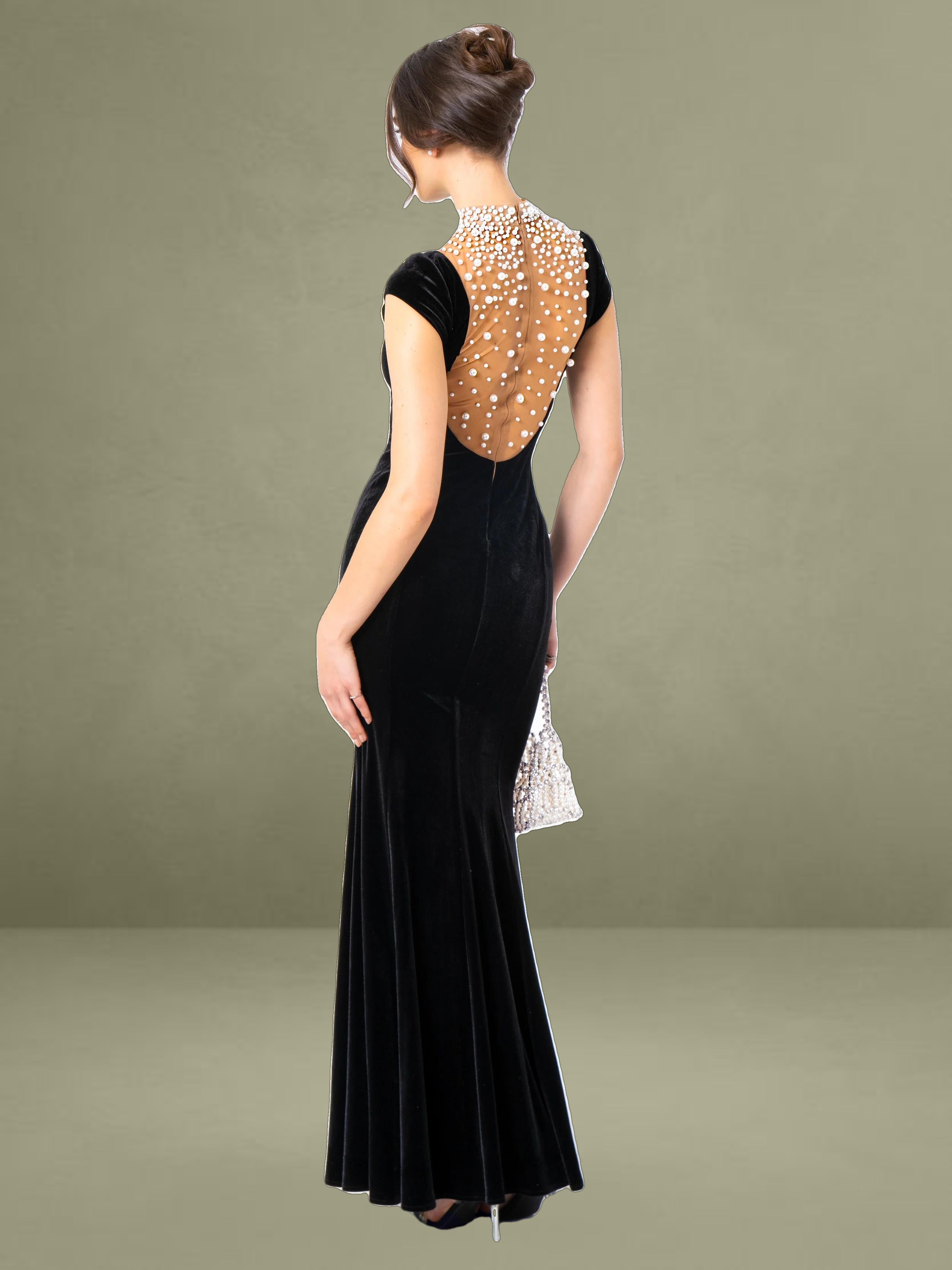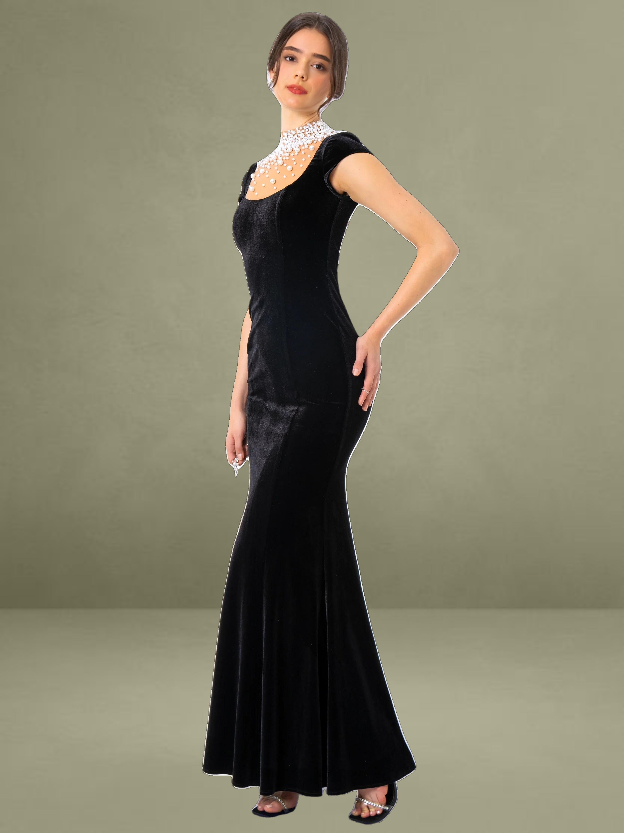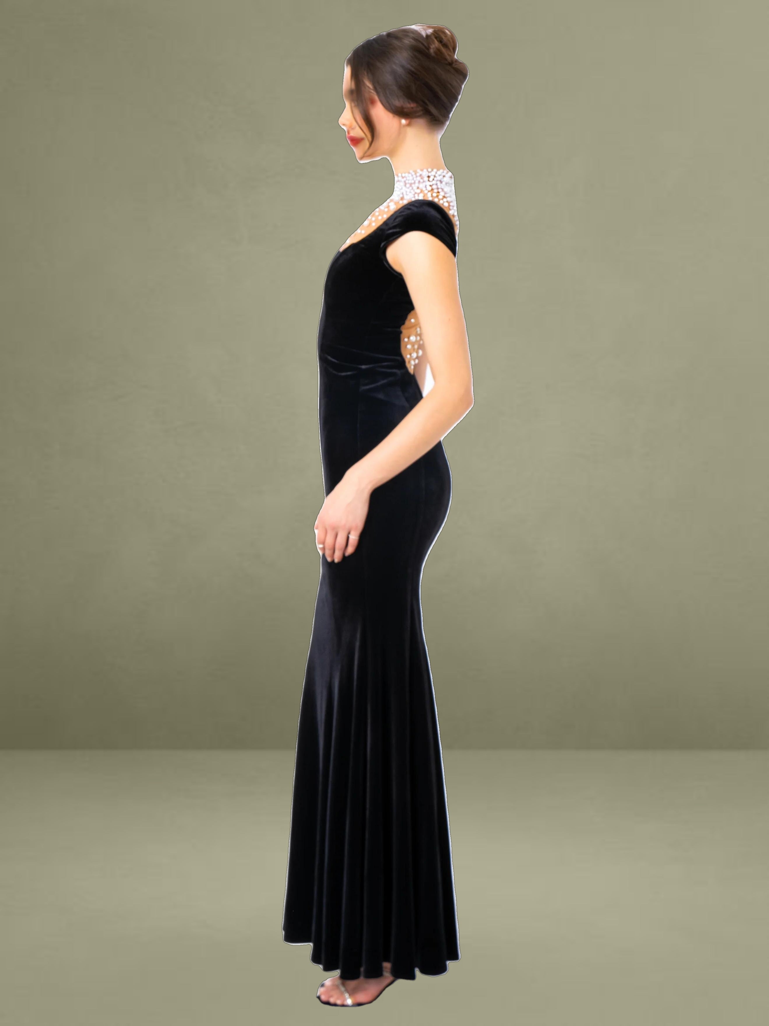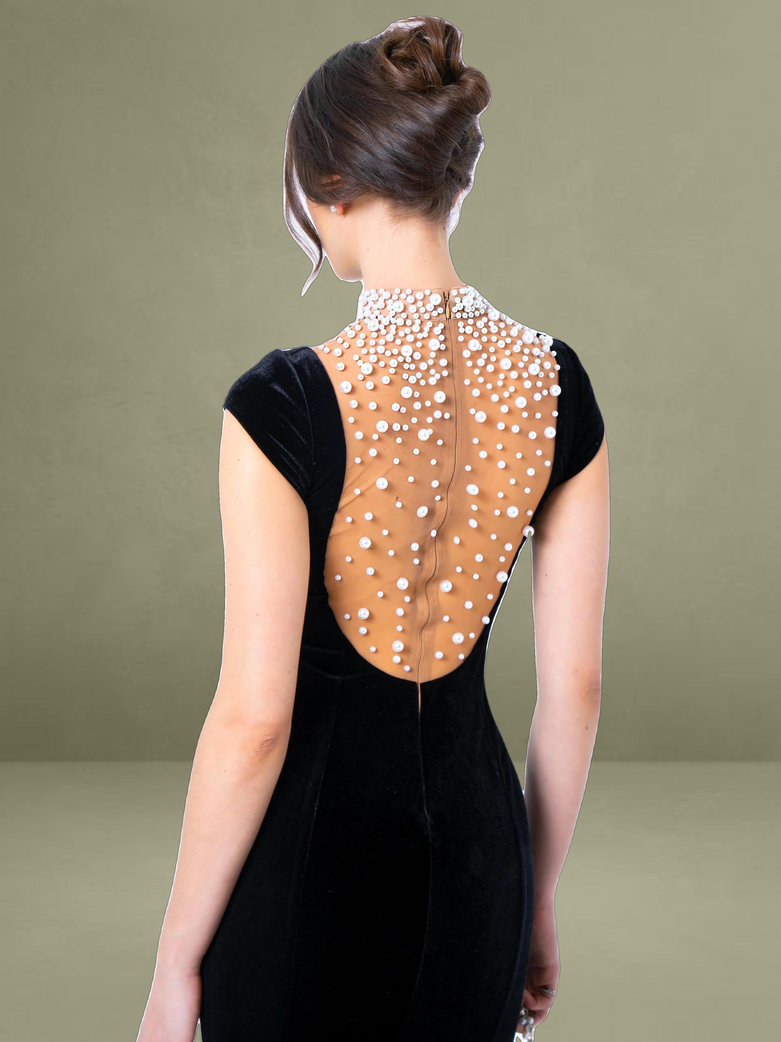 Introducing the epitome of elegance, the Rachael Gown. This breathtaking gown features a luxurious black velvet body, beautifully tailored to a mermaid silhouette that hugs your curves and flares gracefully at the hem. The delicate mesh turtleneck, adorned with shimmering pearl embellishments, adds a sophisticated and modern touch, while the chic cap sleeves enhance the sleek design. A cinched waist creates a flattering, hourglass figure, making this gown perfect for any occasion where timeless elegance is a must. And it makes a perfect match with our Pearl Handbag.