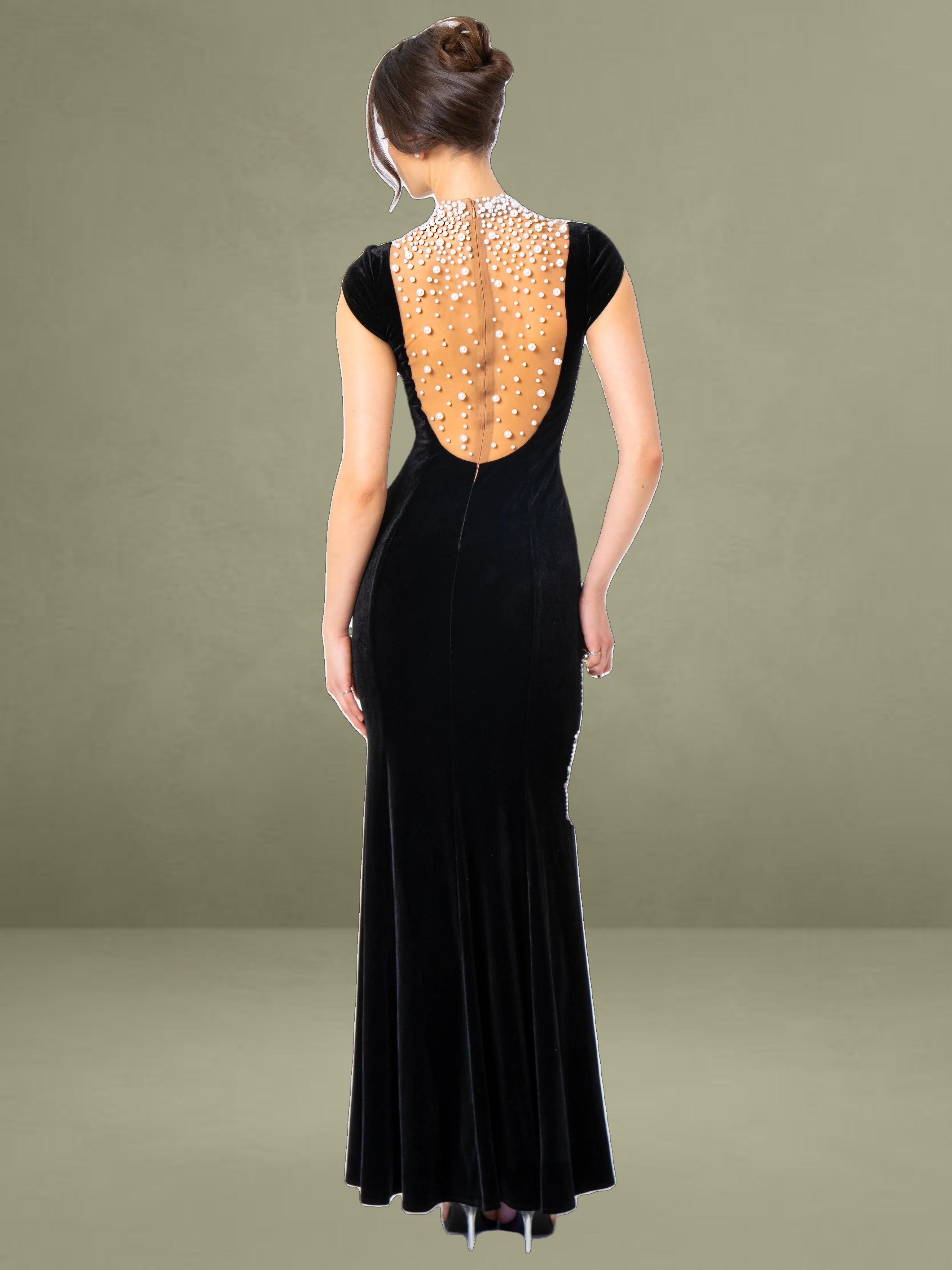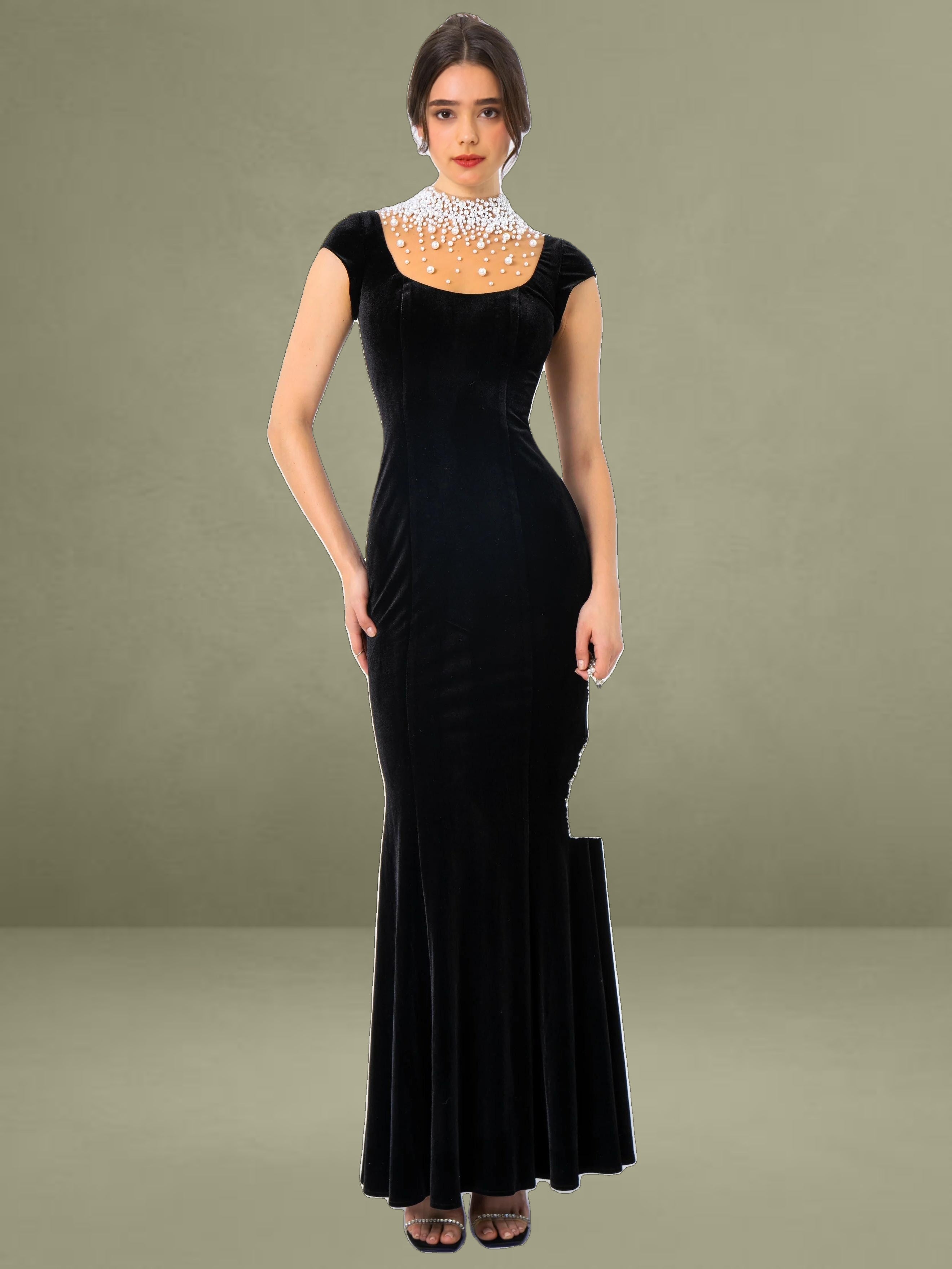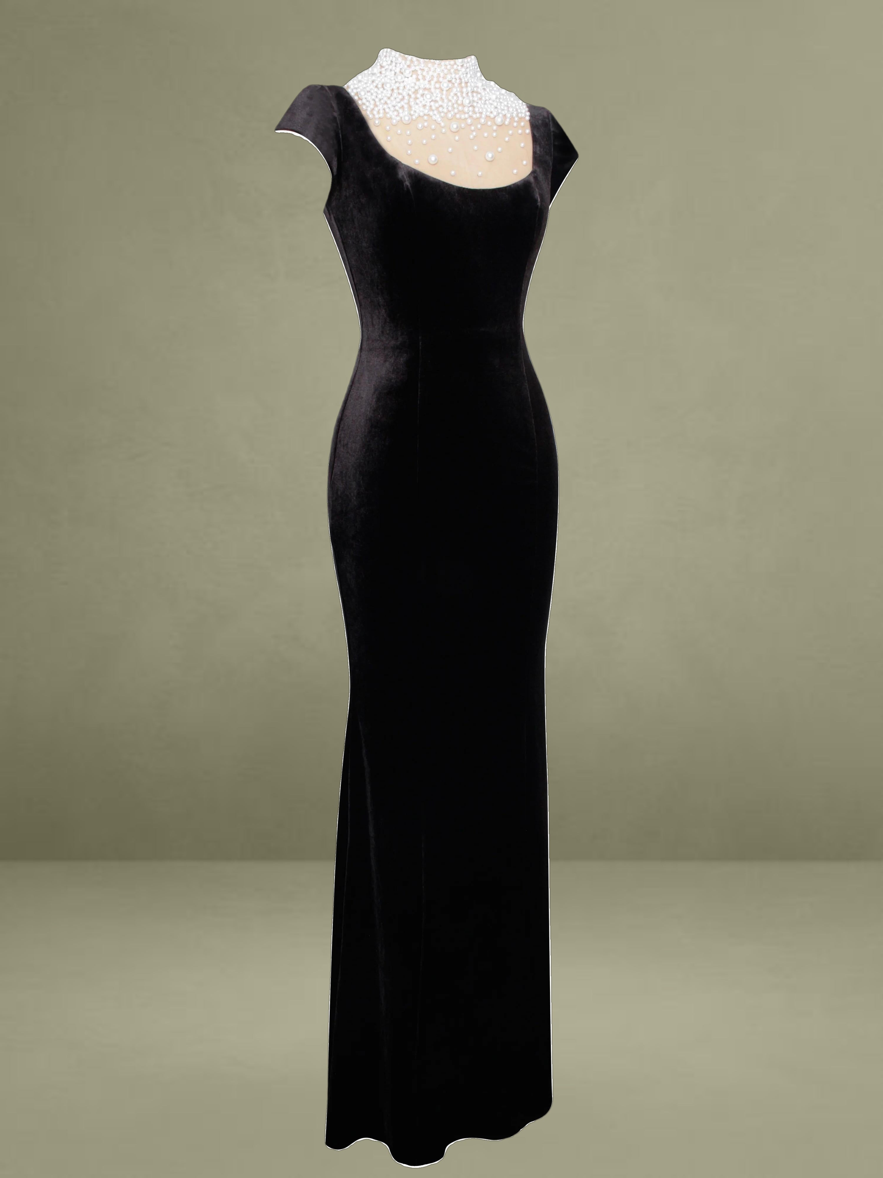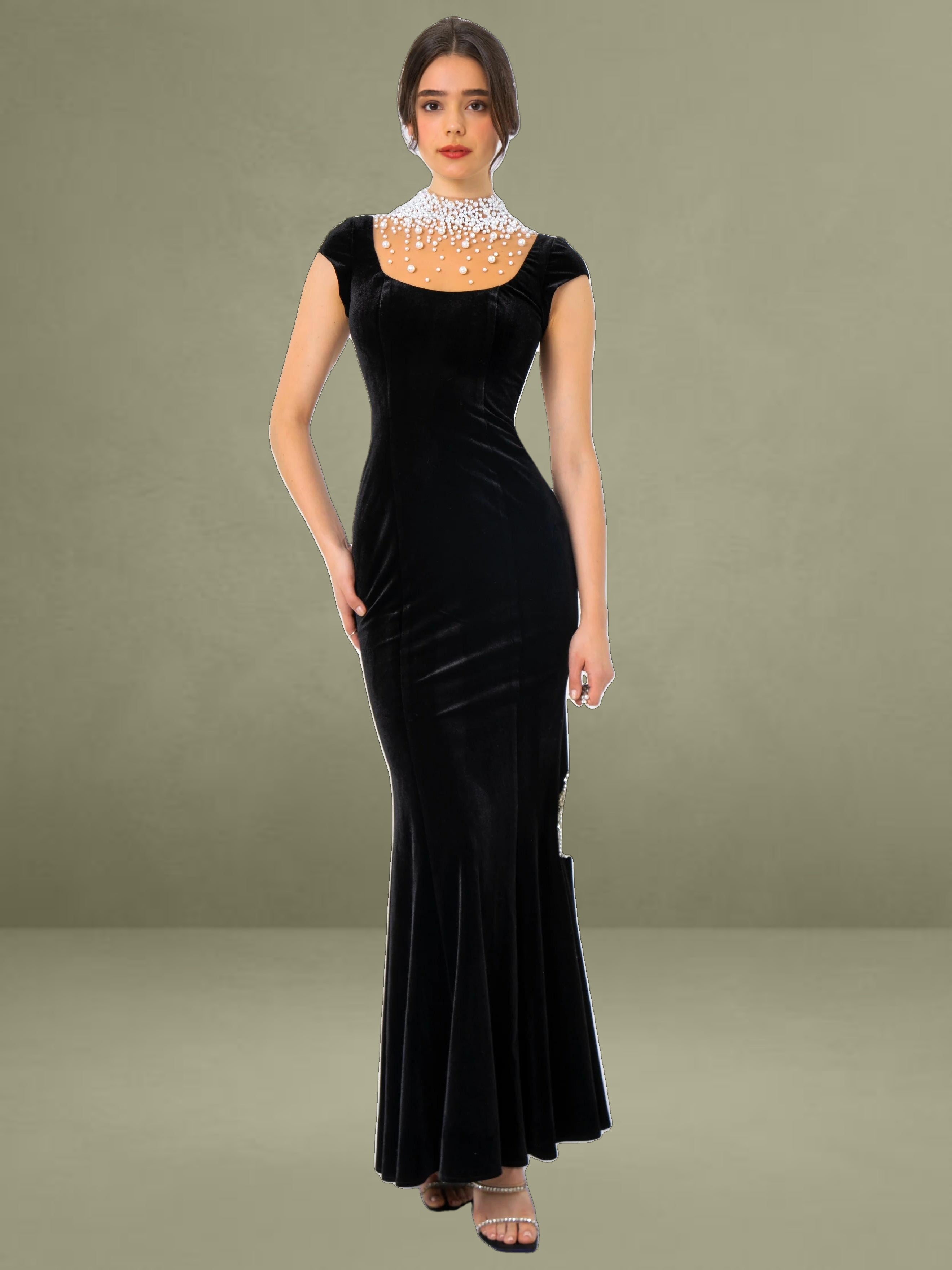 Introducing the epitome of elegance, the Rachael Gown. This breathtaking gown features a luxurious black velvet body, beautifully tailored to a mermaid silhouette that hugs your curves and flares gracefully at the hem. The delicate mesh turtleneck, adorned with shimmering pearl embellishments, adds a sophisticated and modern touch, while the chic cap sleeves enhance the sleek design. A cinched waist creates a flattering, hourglass figure, making this gown perfect for any occasion where timeless elegance is a must. And it makes a perfect match with our Pearl Handbag.