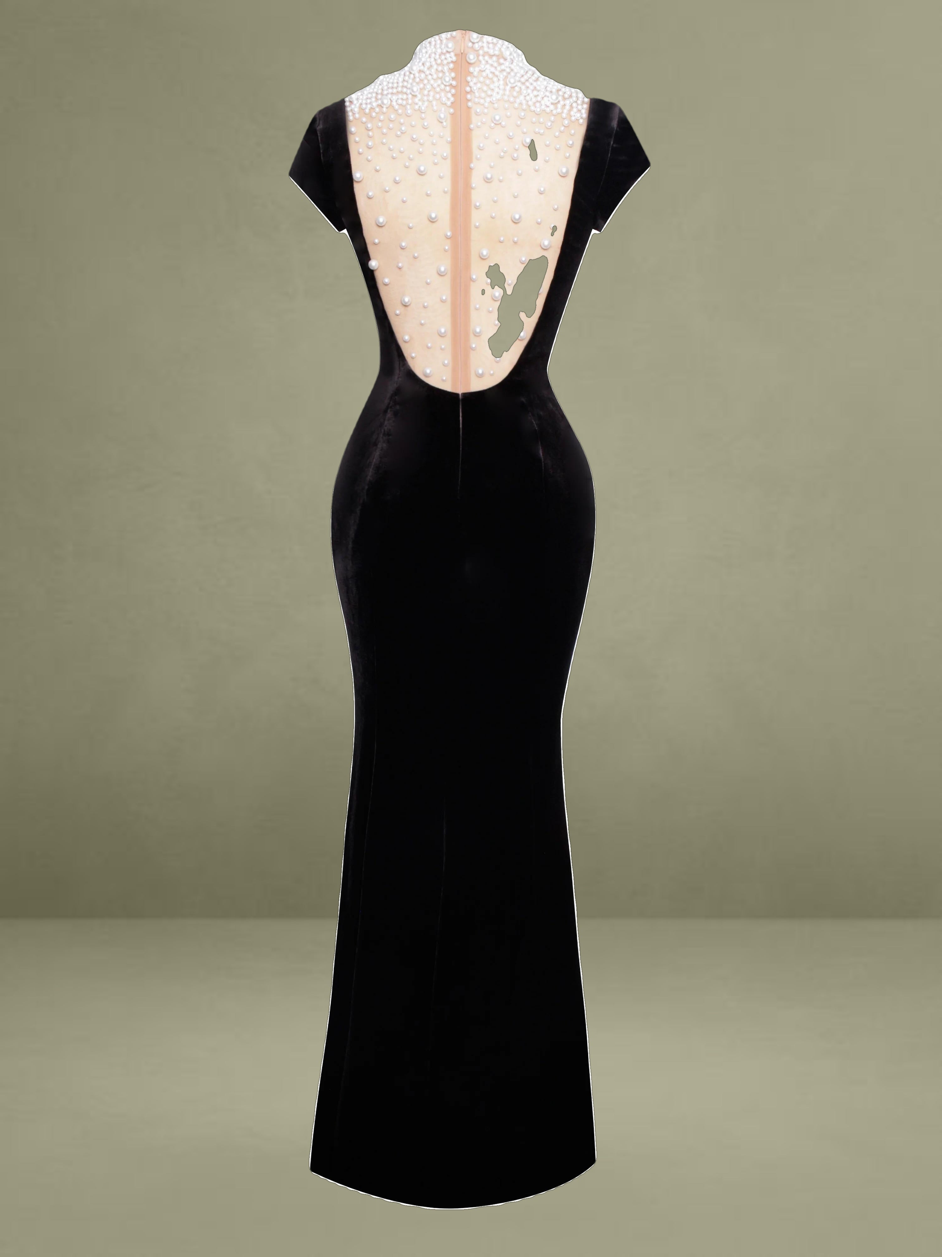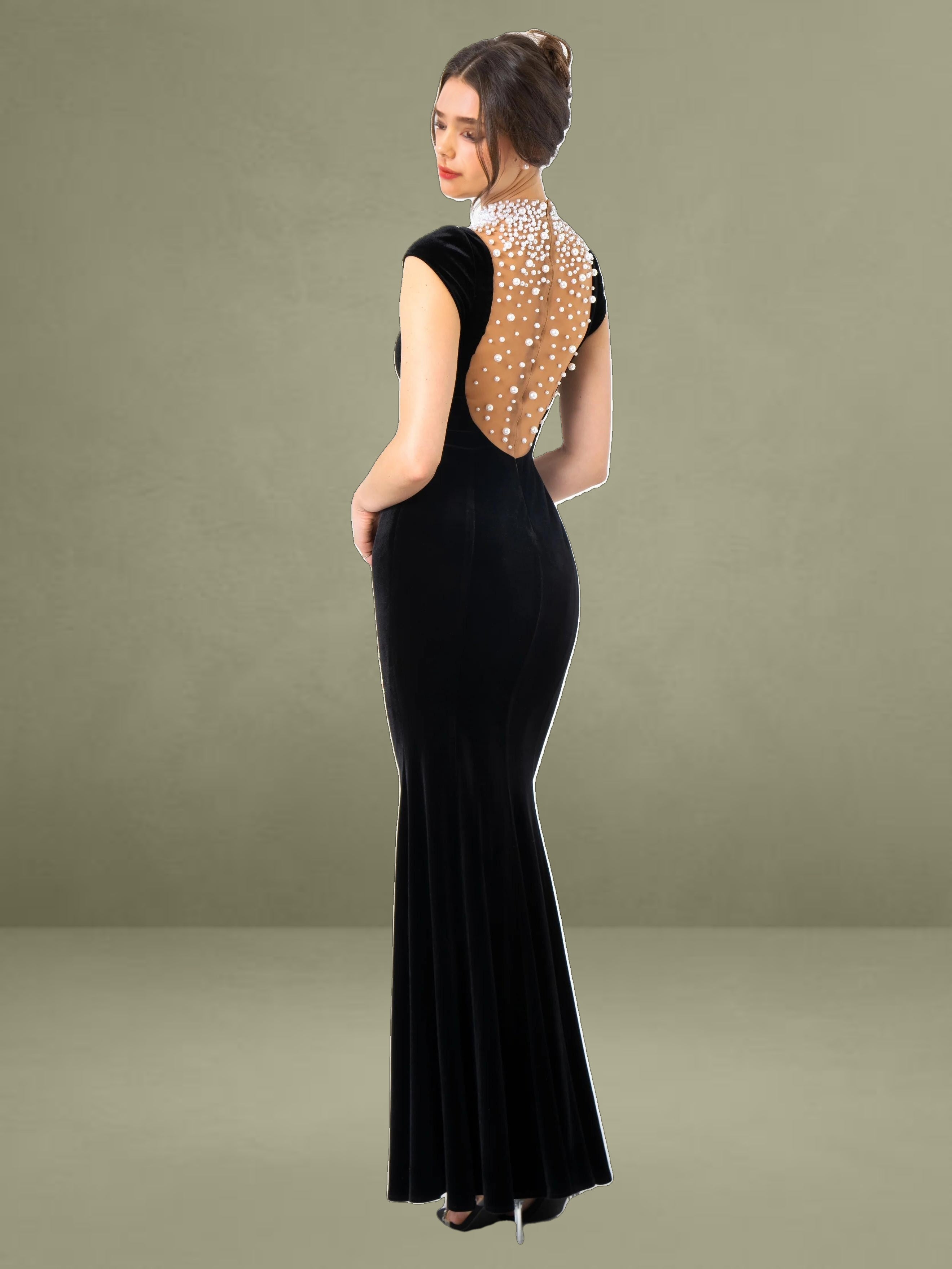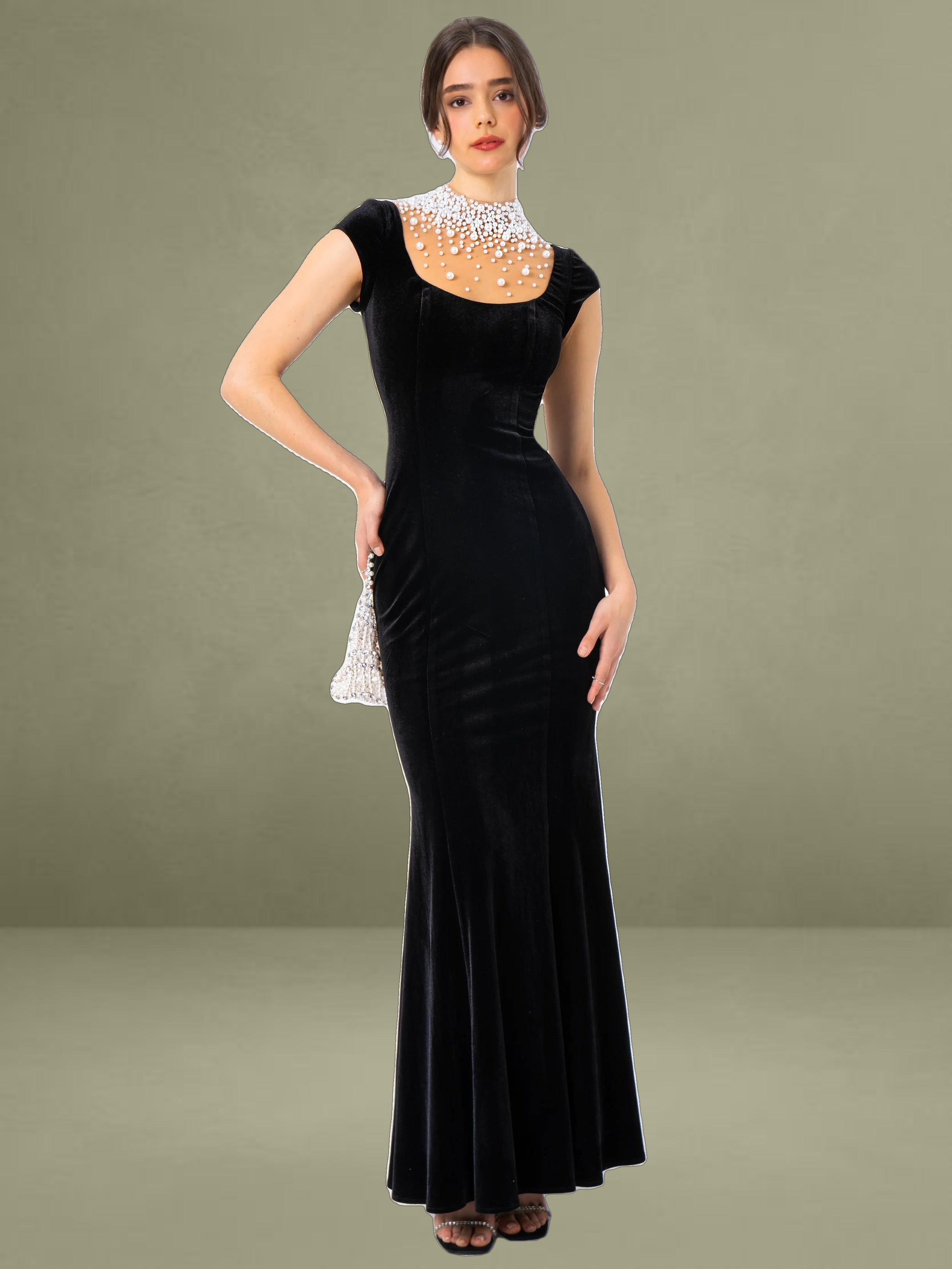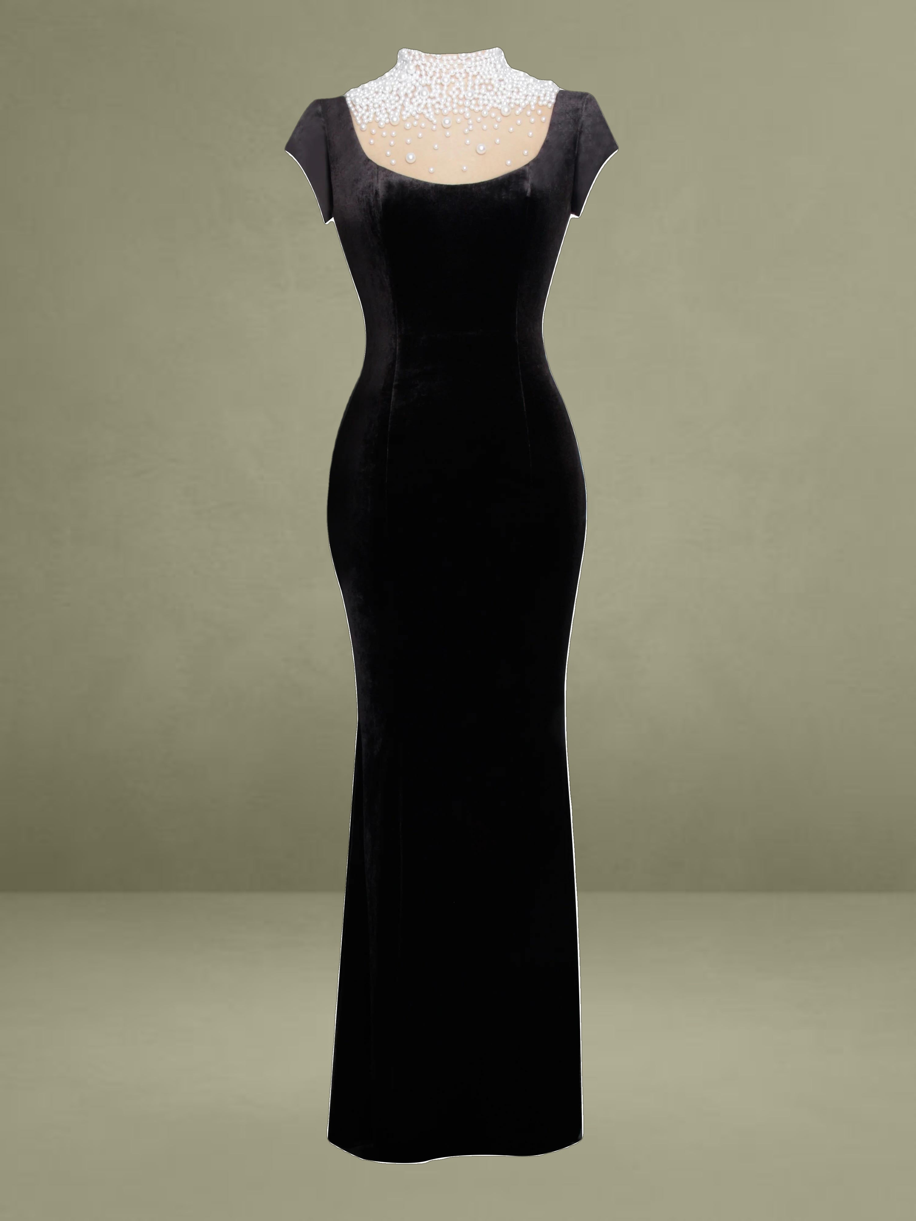 Introducing the epitome of elegance, the Rachael Gown. This breathtaking gown features a luxurious black velvet body, beautifully tailored to a mermaid silhouette that hugs your curves and flares gracefully at the hem. The delicate mesh turtleneck, adorned with shimmering pearl embellishments, adds a sophisticated and modern touch, while the chic cap sleeves enhance the sleek design. A cinched waist creates a flattering, hourglass figure, making this gown perfect for any occasion where timeless elegance is a must. And it makes a perfect match with our Pearl Handbag.