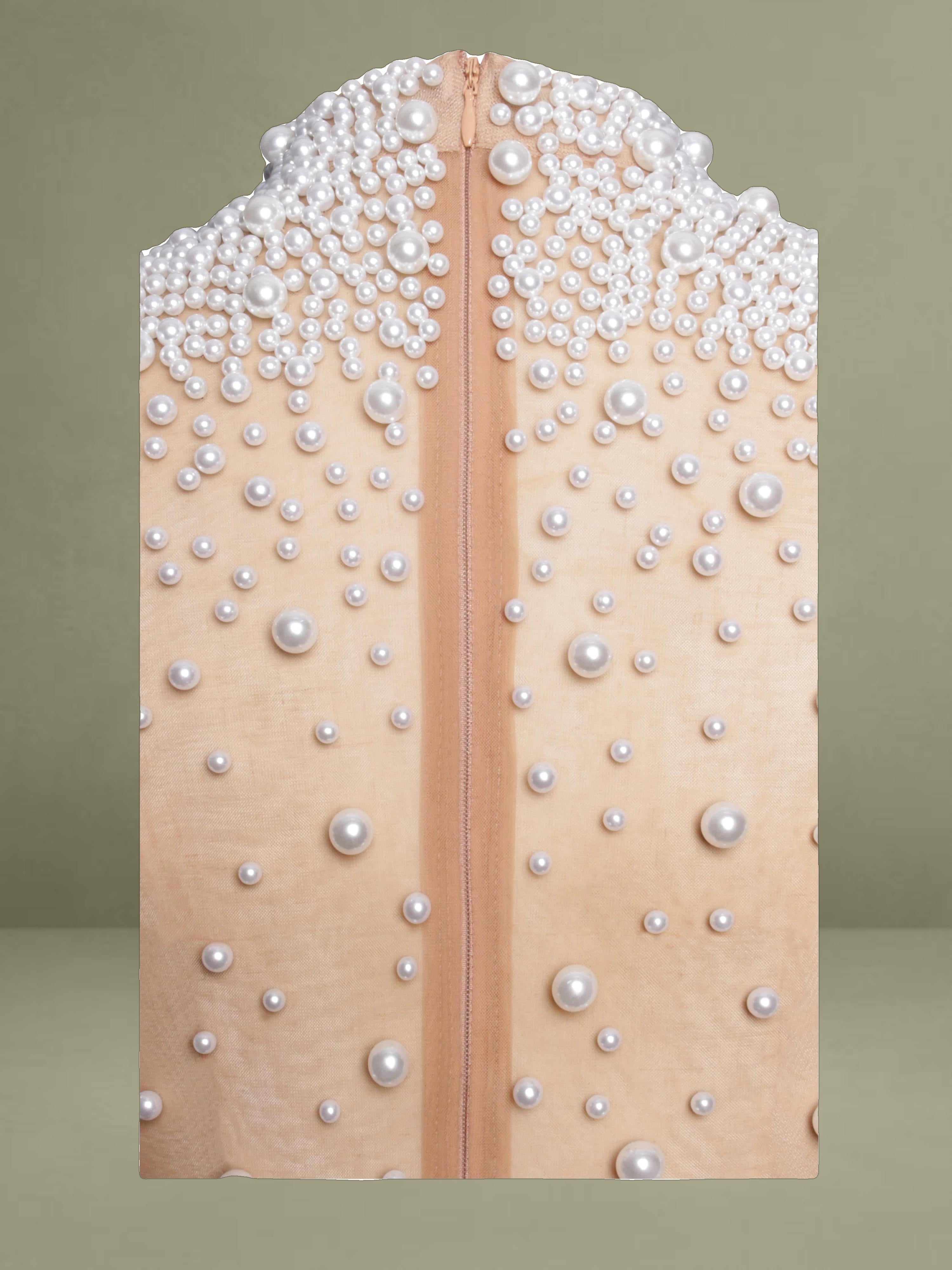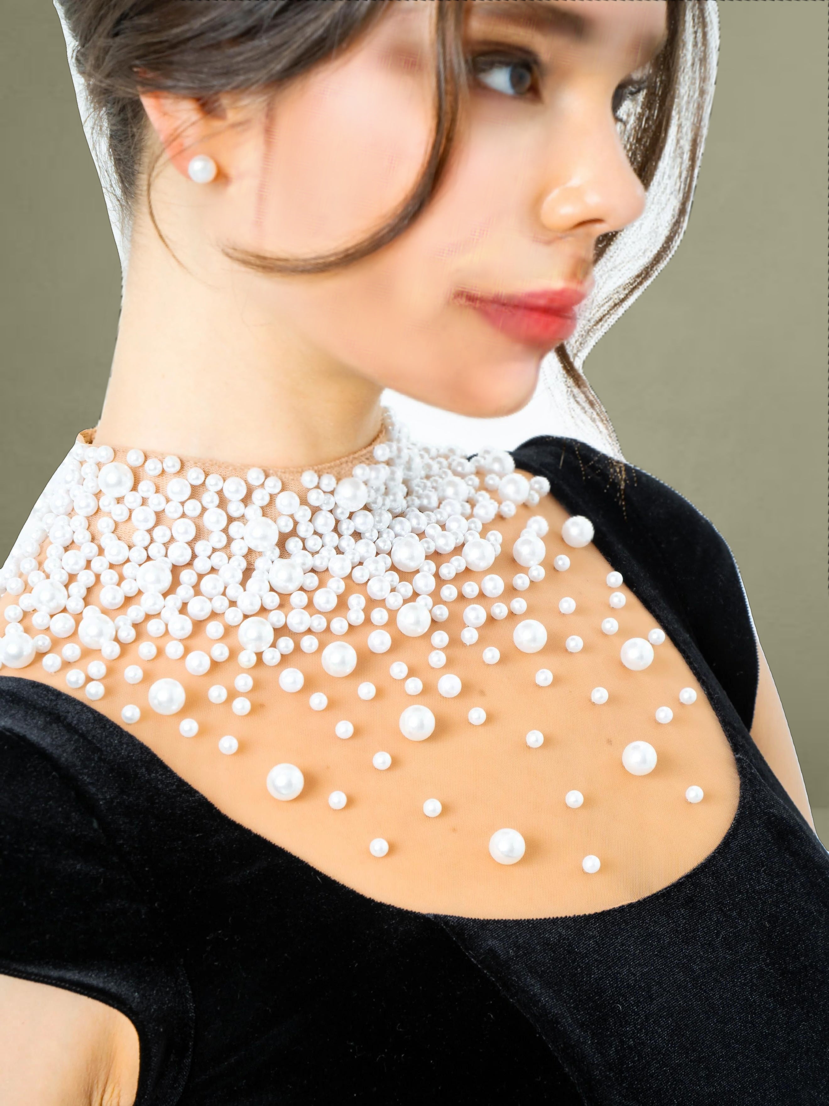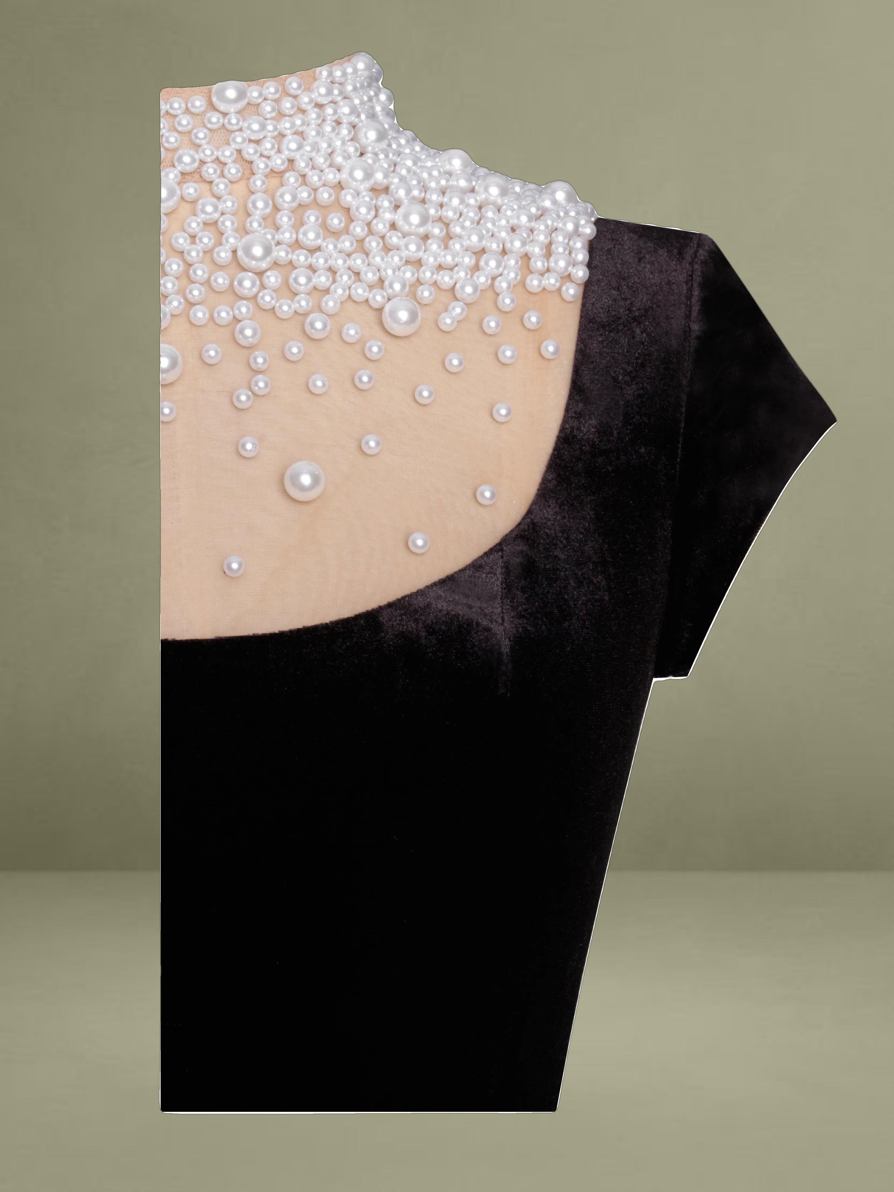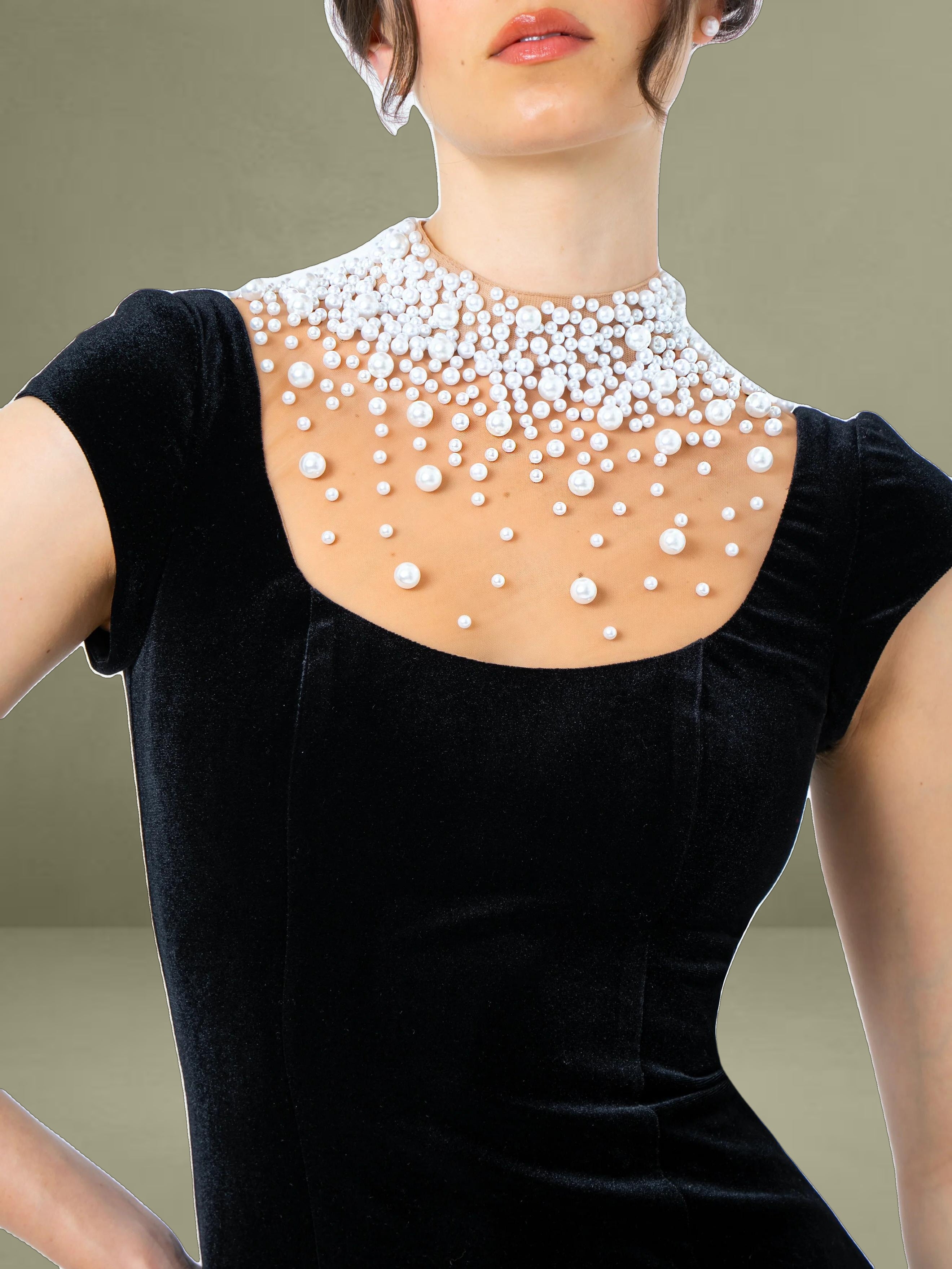Introducing the epitome of elegance, the Rachael Gown. This breathtaking gown features a luxurious black velvet body, beautifully tailored to a mermaid silhouette that hugs your curves and flares gracefully at the hem. The delicate mesh turtleneck, adorned with shimmering pearl embellishments, adds a sophisticated and modern touch, while the chic cap sleeves enhance the sleek design. A cinched waist creates a flattering, hourglass figure, making this gown perfect for any occasion where timeless elegance is a must. And it makes a perfect match with our Pearl Handbag.
