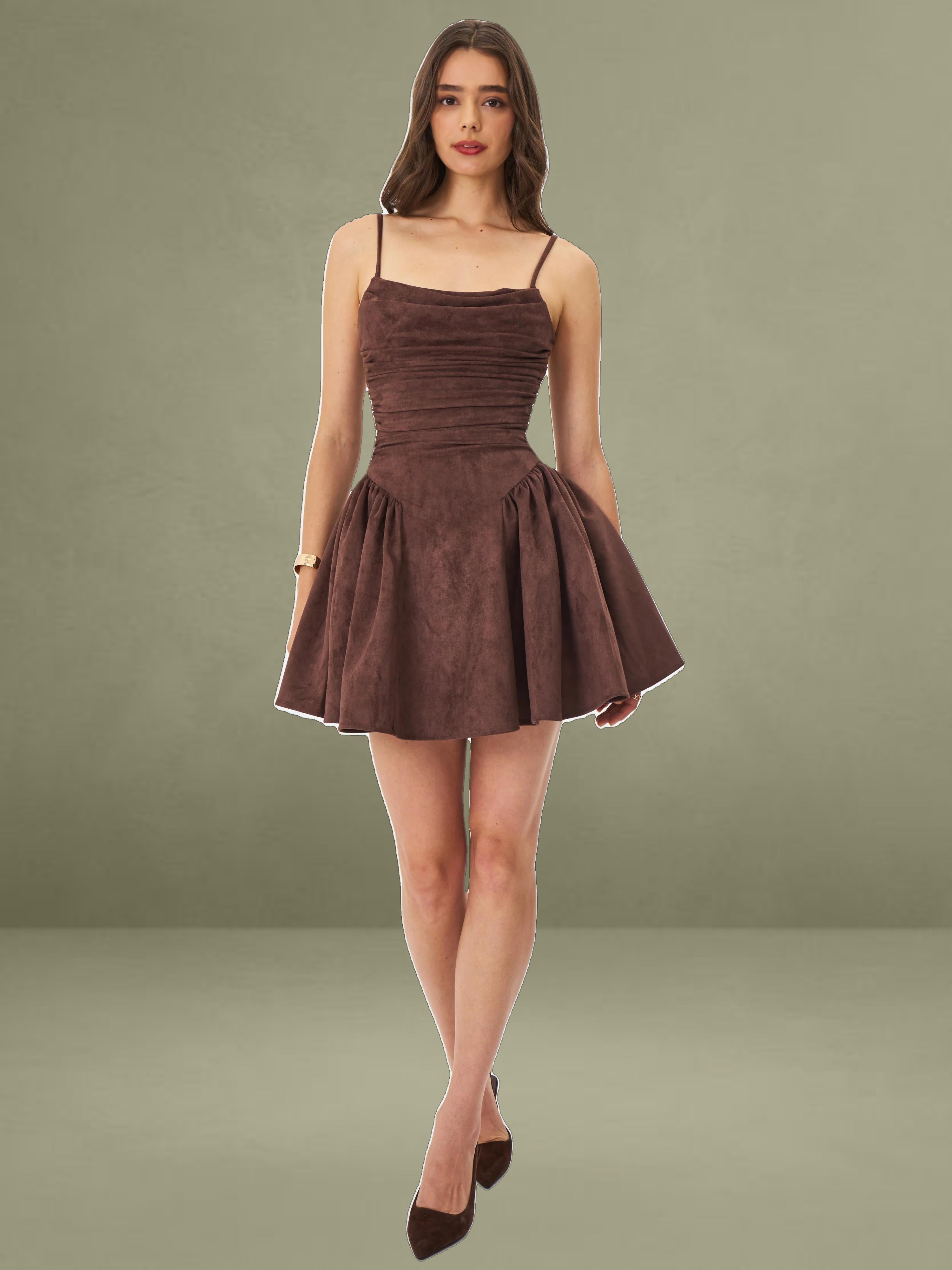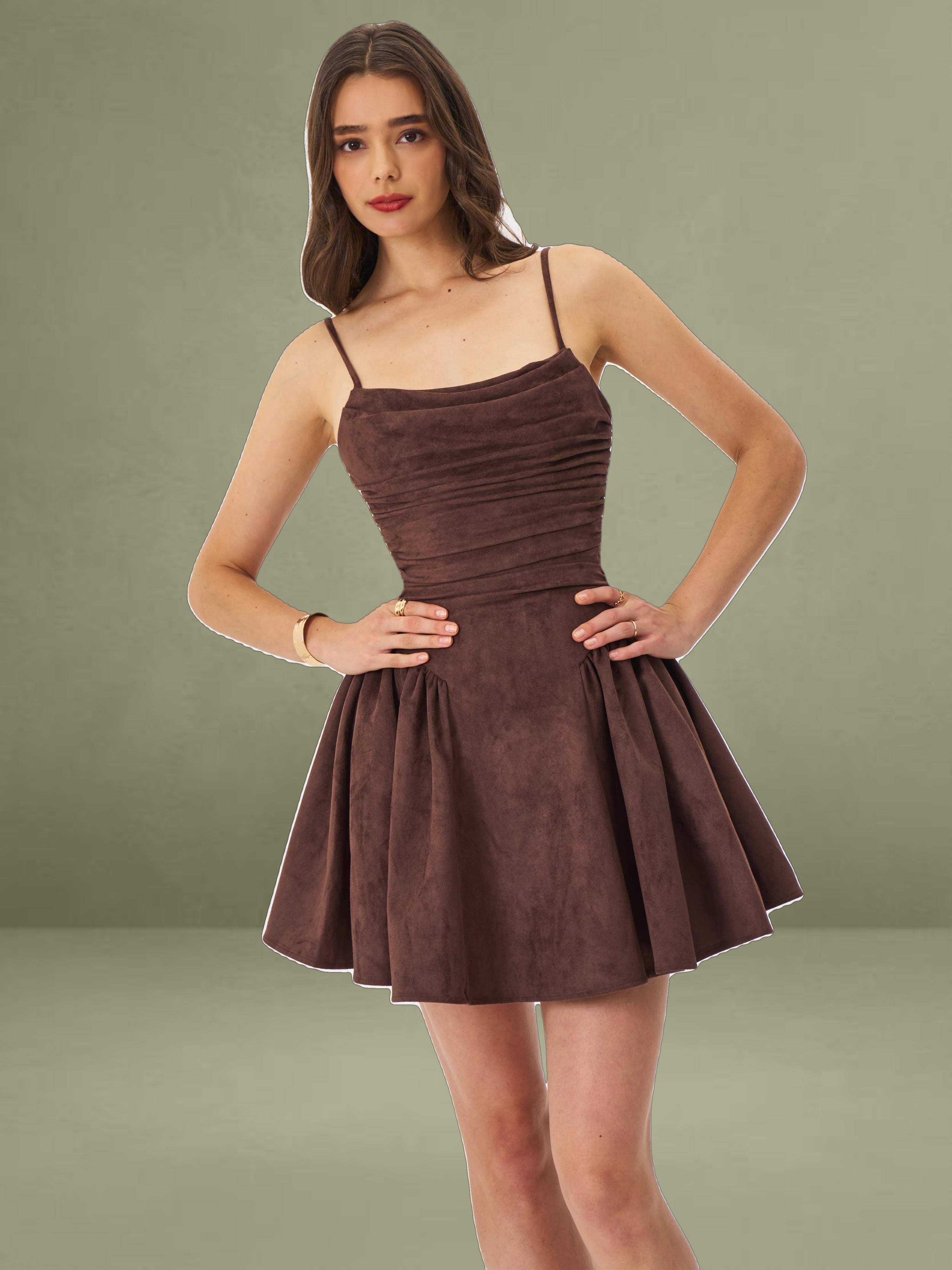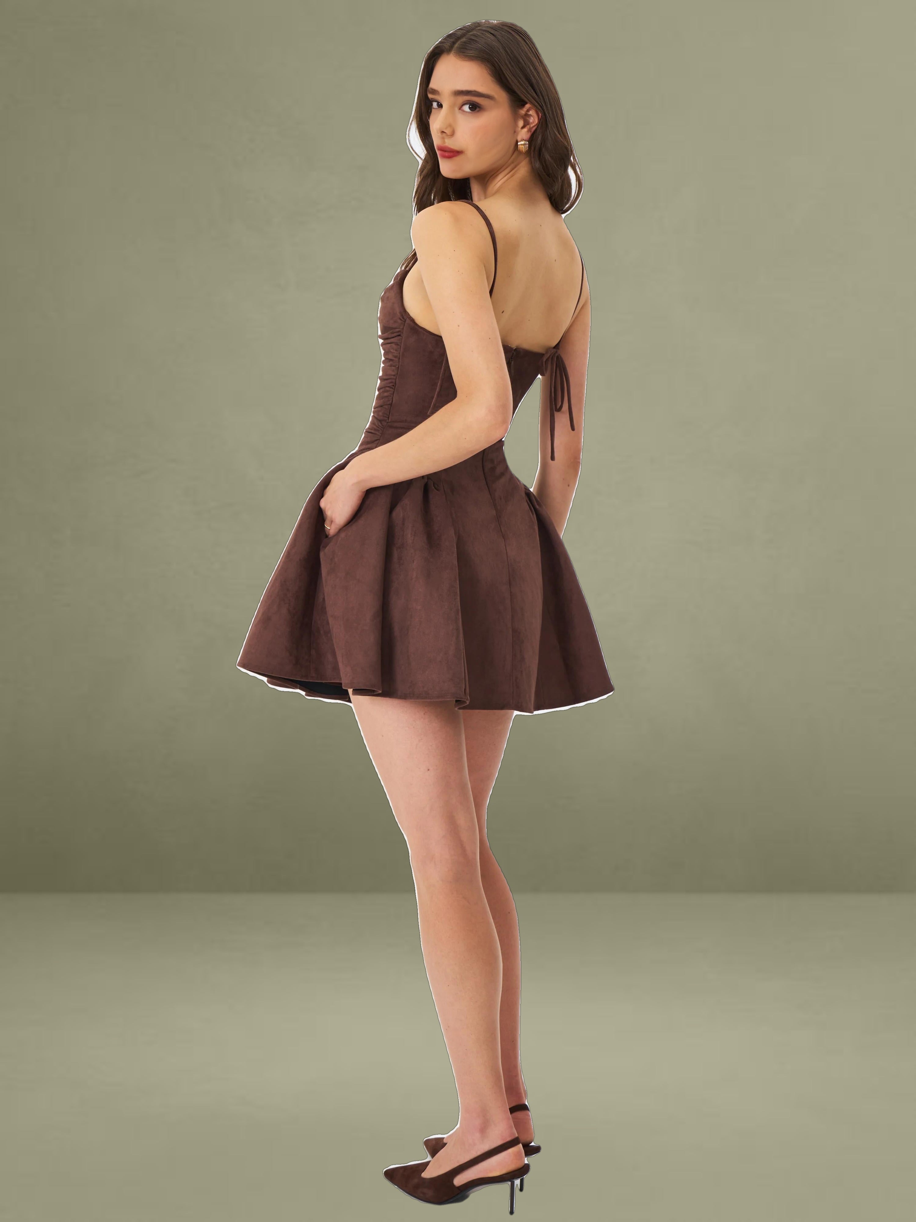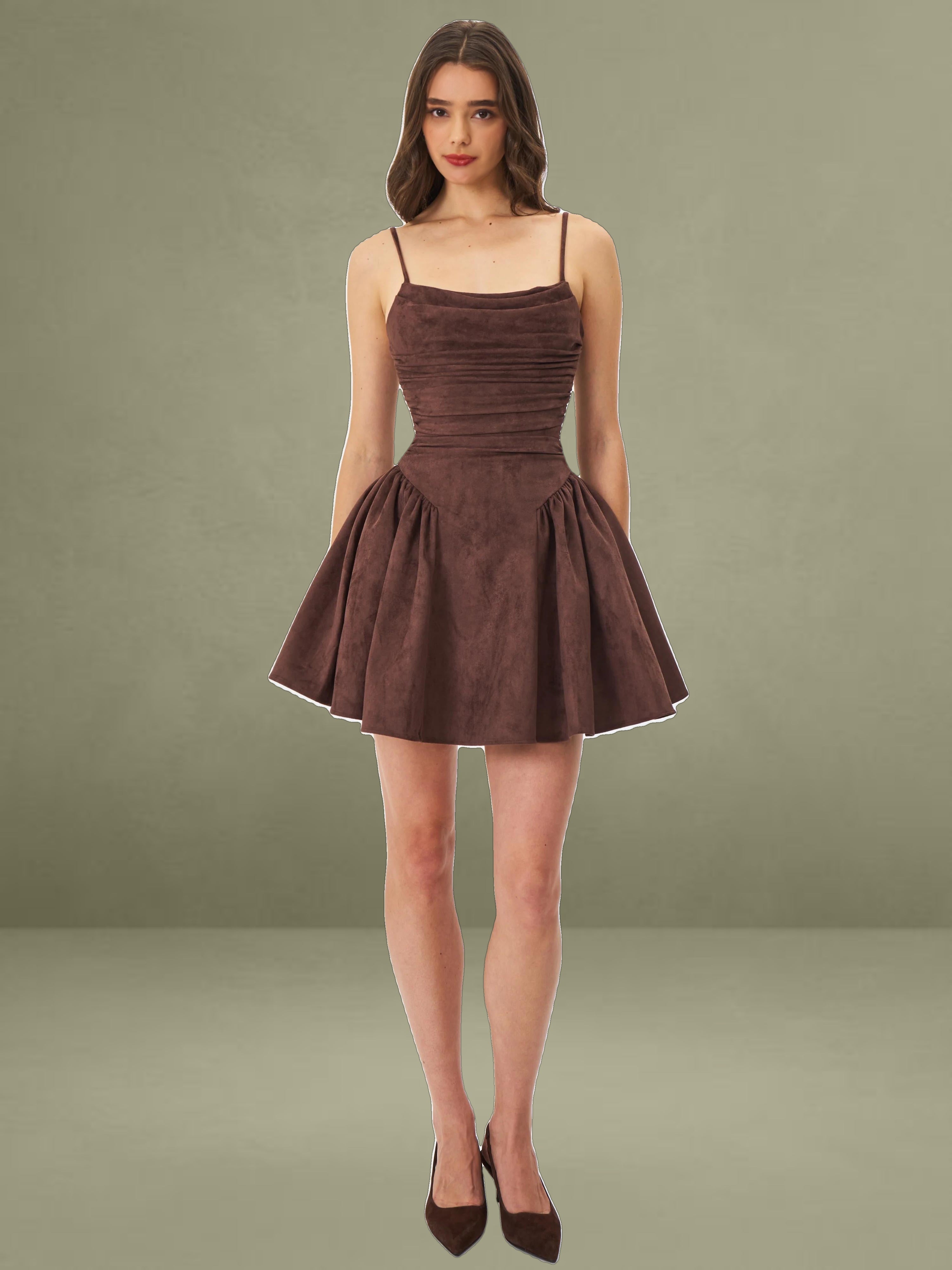 The Raisa Dress is your shortcut to looking sweet, sculpted, and ready for compliments. Cut in plush mahogany vegan suede and fully lined in satin, this mini moment features a softly ruched bodice with a straight neckline and padded cups for a flattering, cinched look. Spaghetti straps tie into a charming bow at the back, while gentle ruching flares from the hips into a voluminous A-line skirt that moves like a daydream. Finished with an invisible back zipper for a smooth fit, this piece was made for coffee shop flirtations, golden hour park strolls, or that picnic that turns into a photoshoot.
