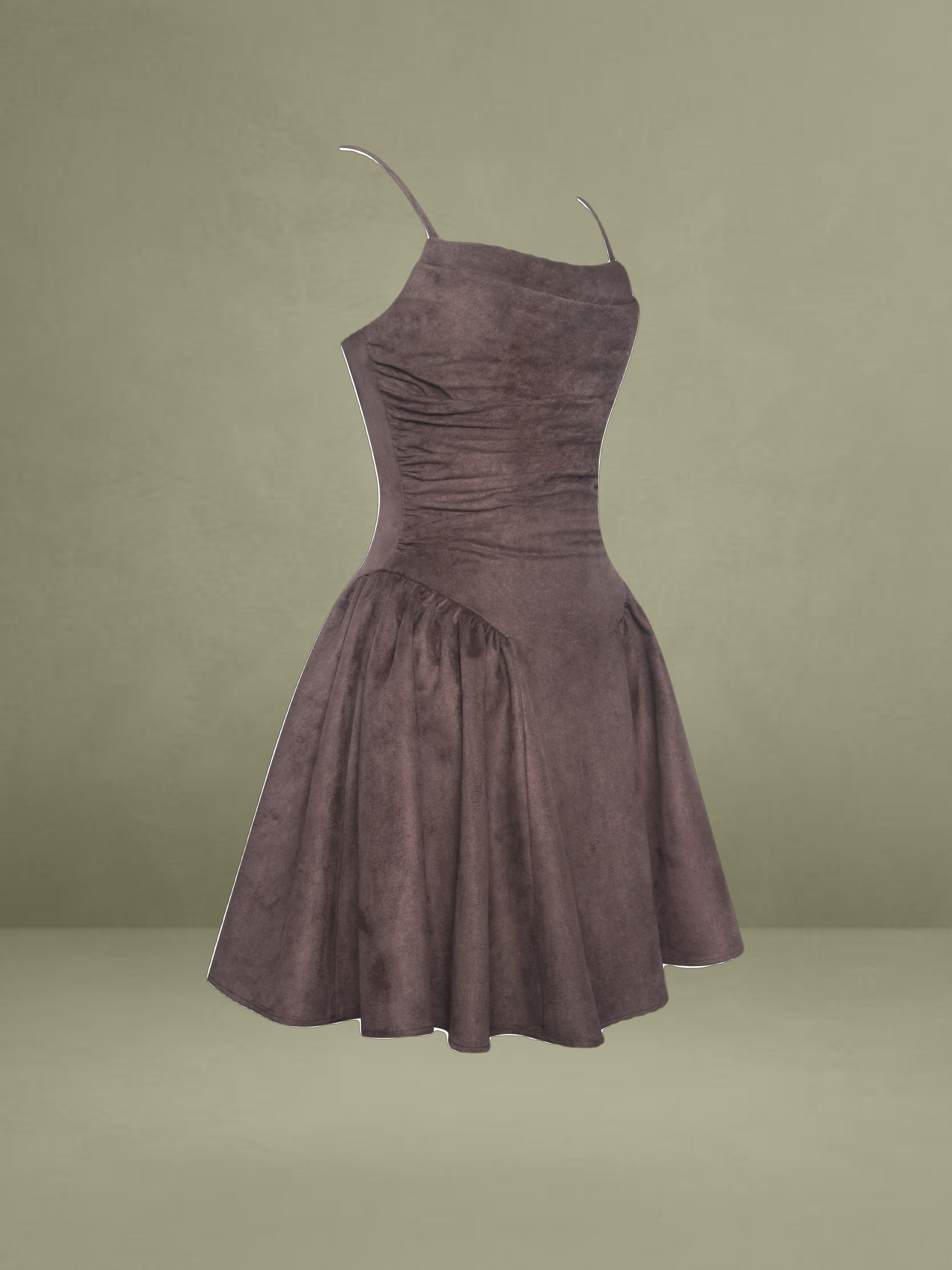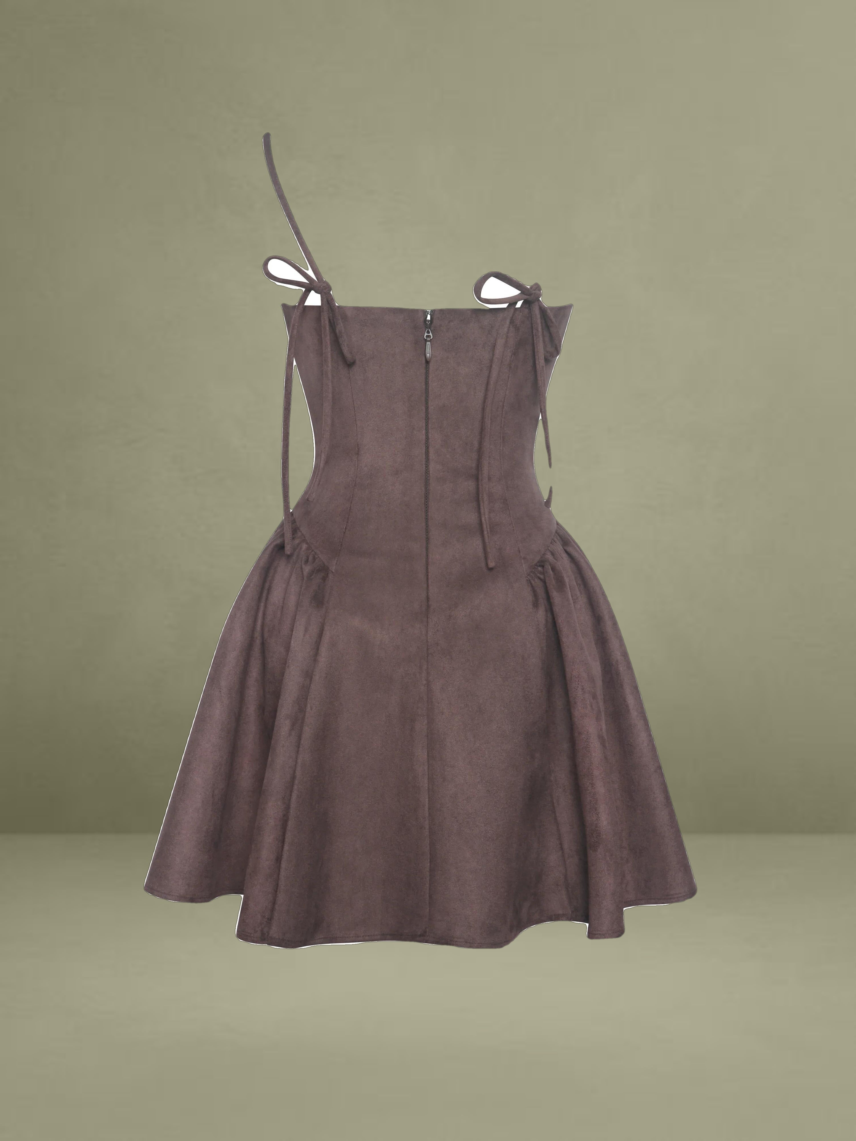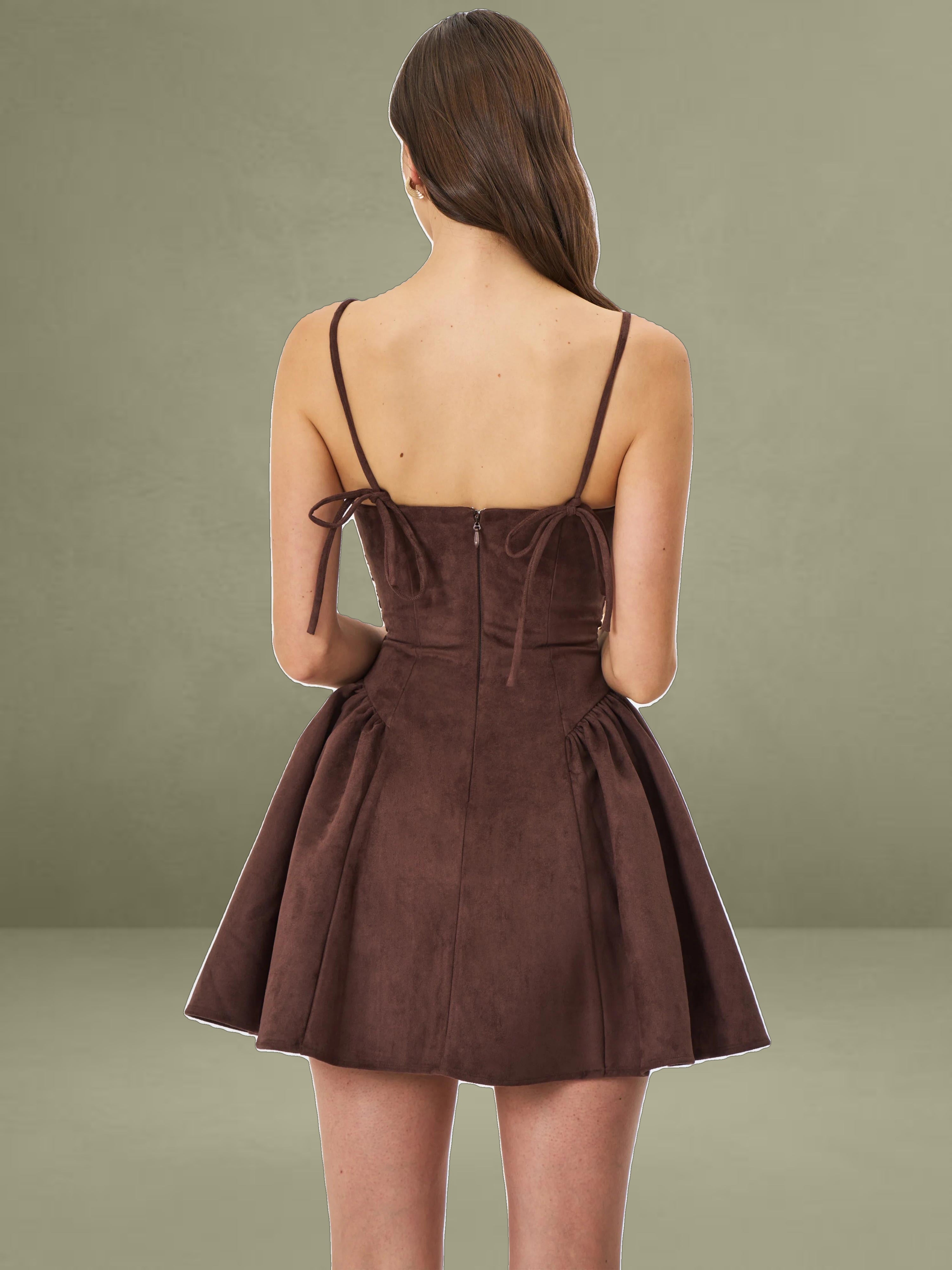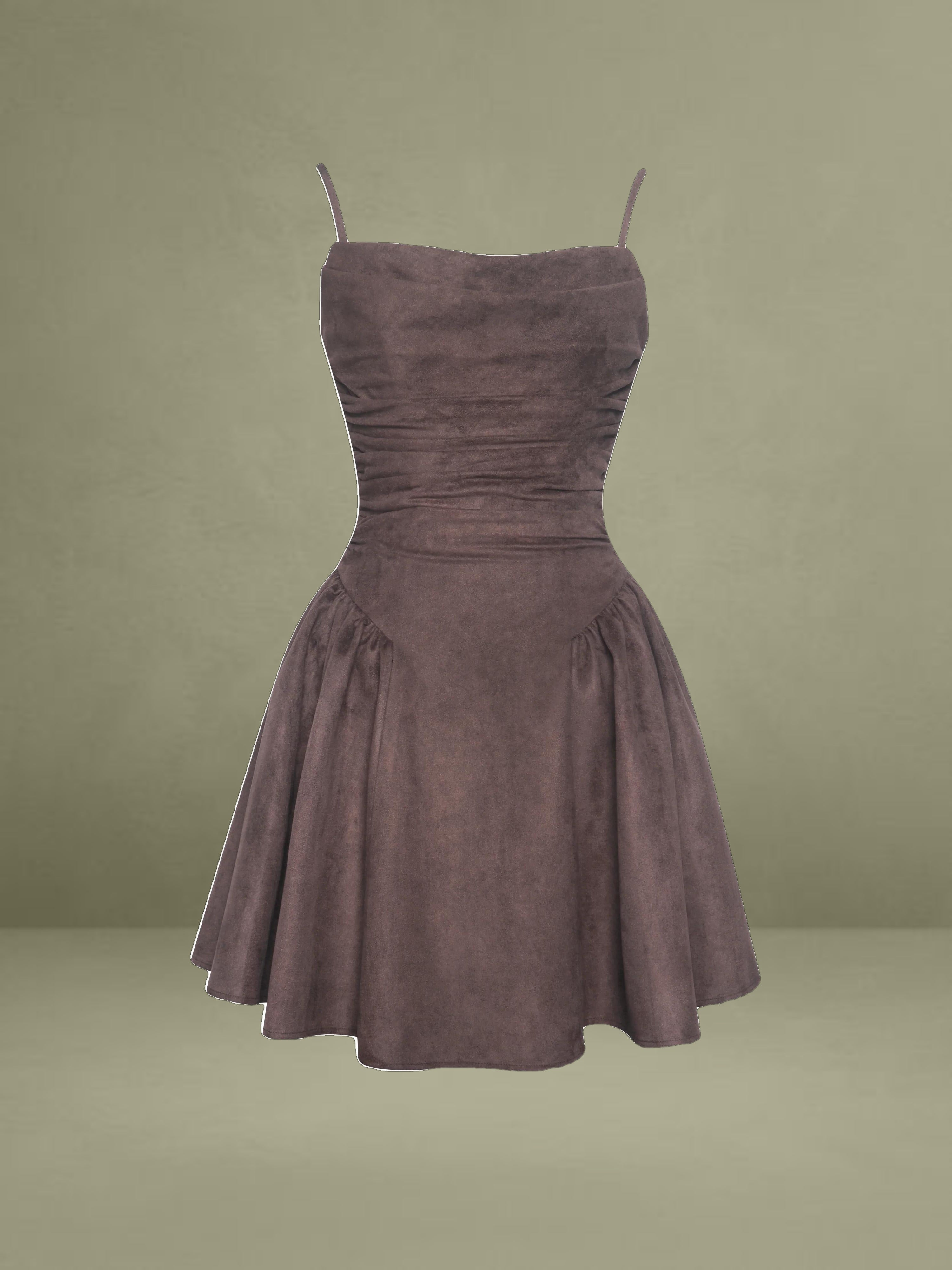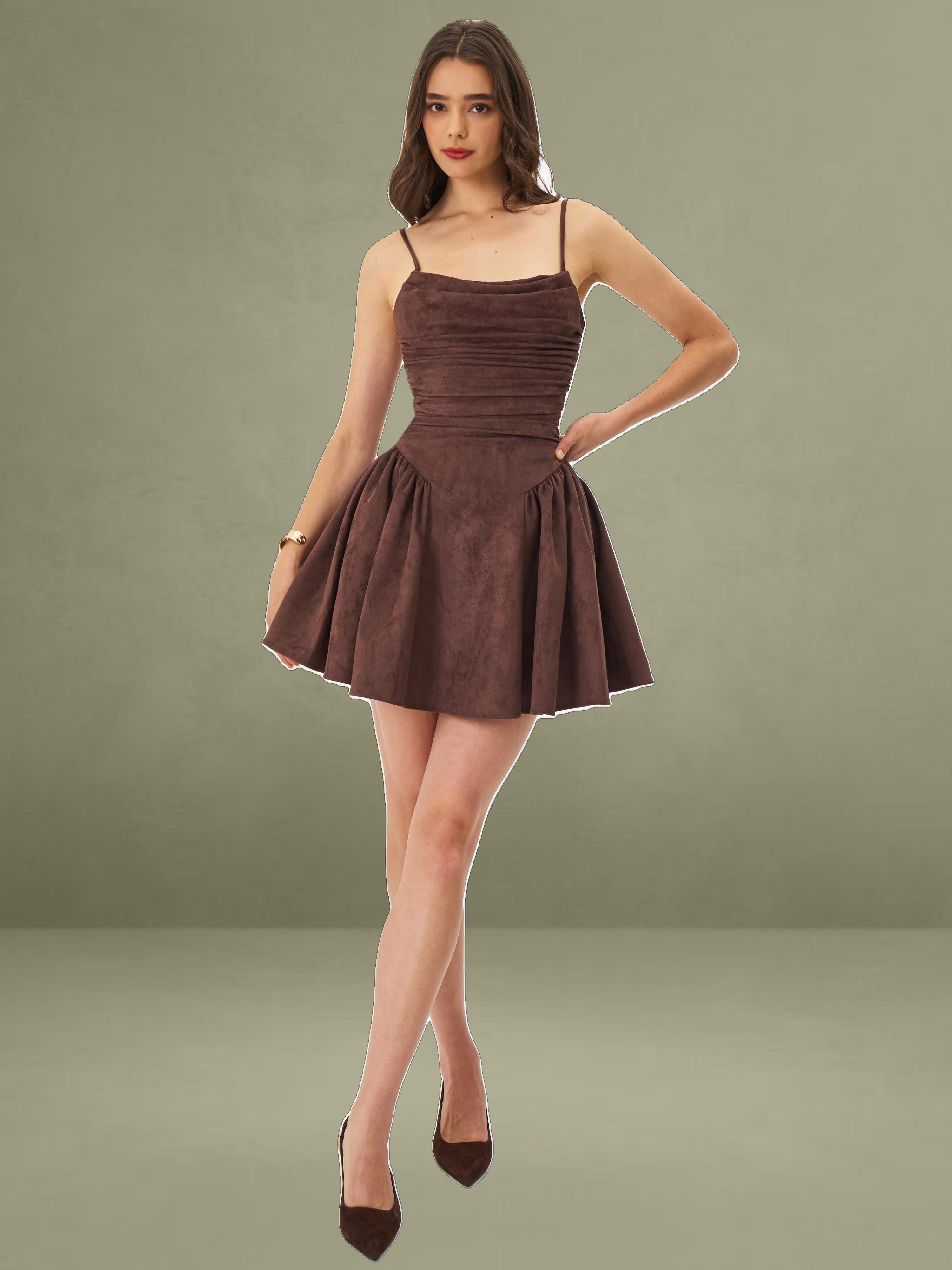 The Raisa Dress is your shortcut to looking sweet, sculpted, and ready for compliments. Cut in plush mahogany vegan suede and fully lined in satin, this mini moment features a softly ruched bodice with a straight neckline and padded cups for a flattering, cinched look. Spaghetti straps tie into a charming bow at the back, while gentle ruching flares from the hips into a voluminous A-line skirt that moves like a daydream. Finished with an invisible back zipper for a smooth fit, this piece was made for coffee shop flirtations, golden hour park strolls, or that picnic that turns into a photoshoot.