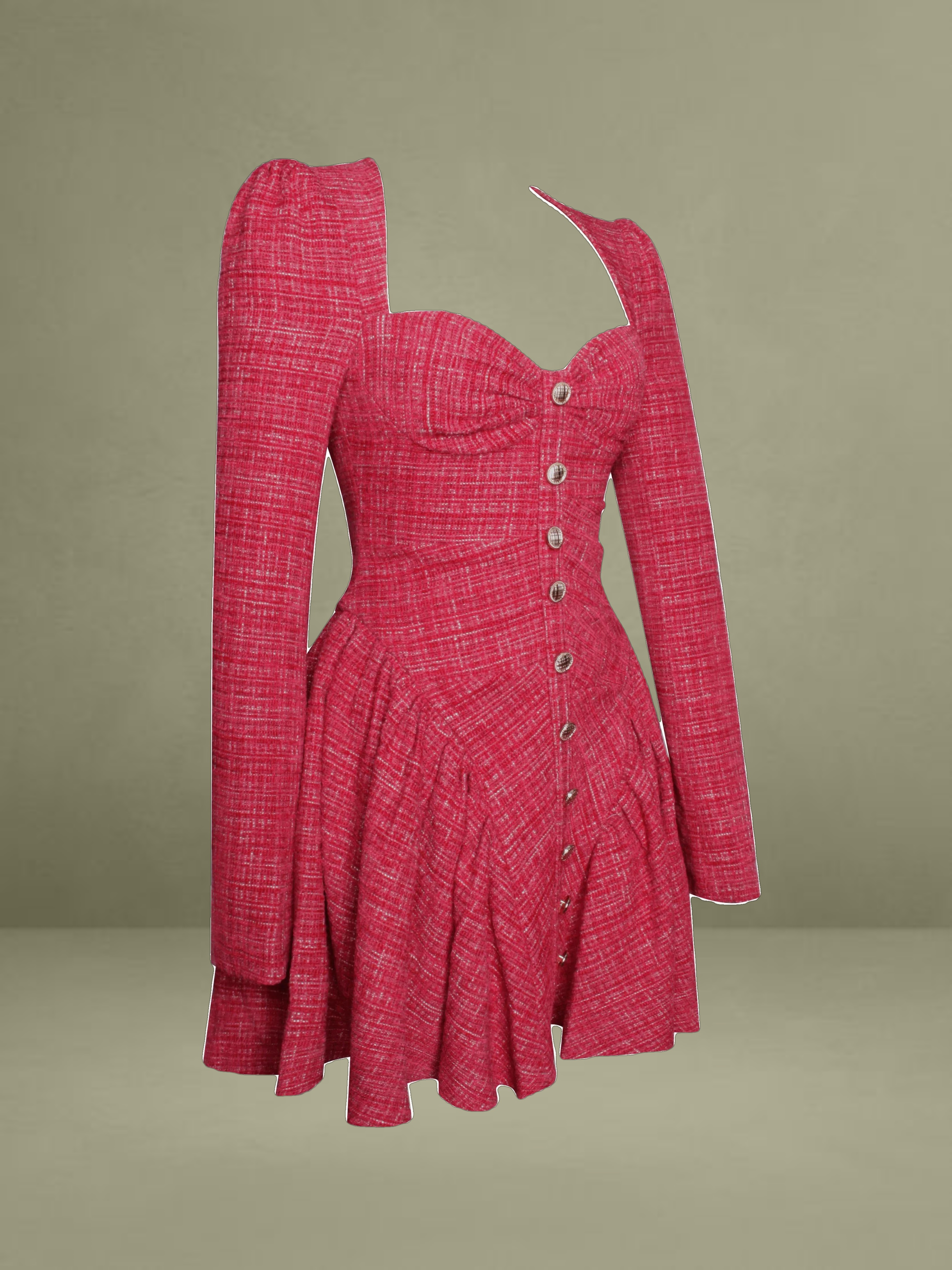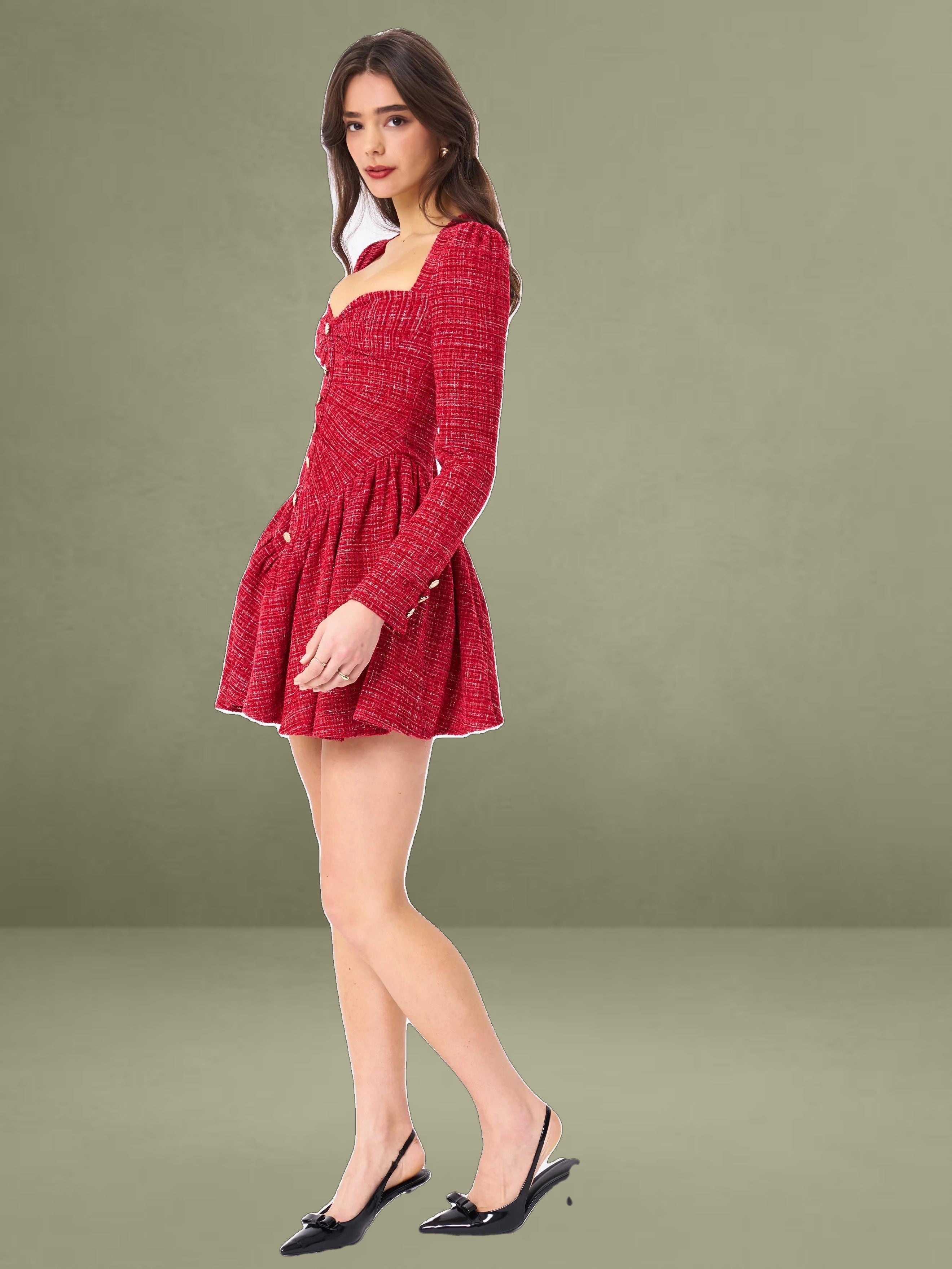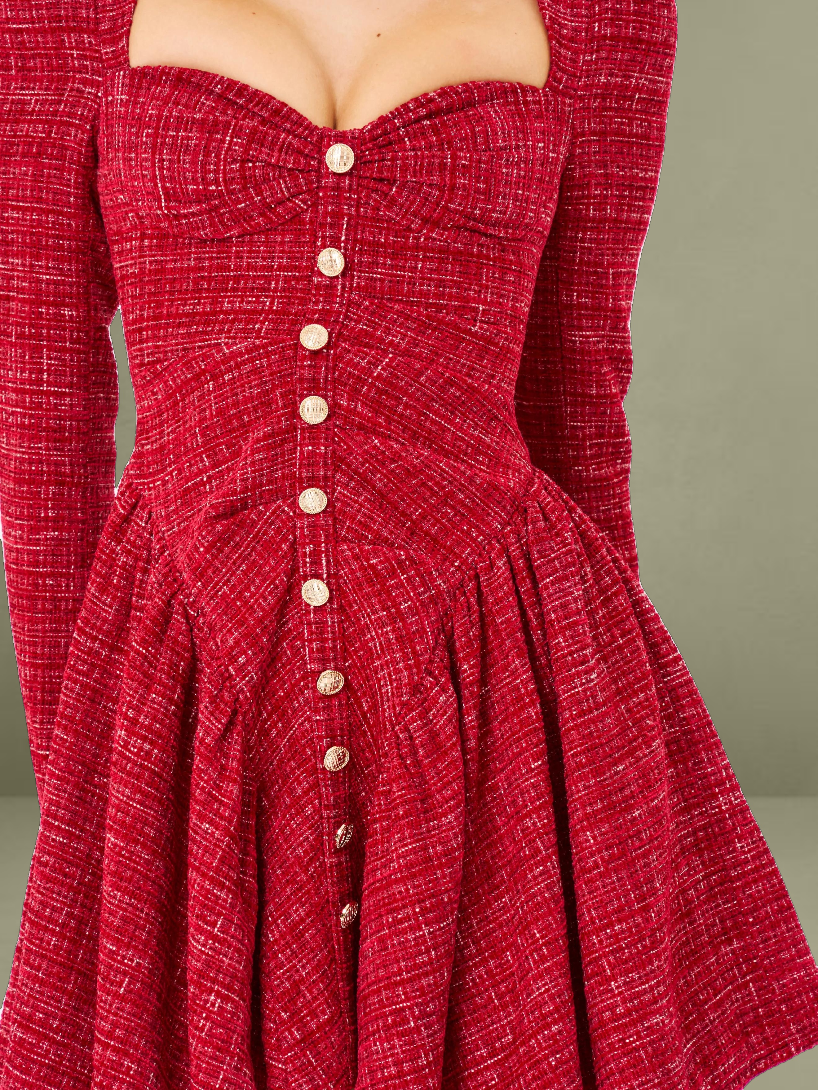 Discover this stylish and elegant dress made from high - quality red tweed boucle fabric. It comes with structured padded cups and padded shoulders, creating a well - defined and sophisticated silhouette. The front is adorned with gold buttons for a refined look, and the rouched design adds a unique texture. Long sleeves and a full skirt with inner tulle support blend classic style with modern elements. An invisible zipper ensures a seamless fit, making it an excellent option to show elegance and grace.