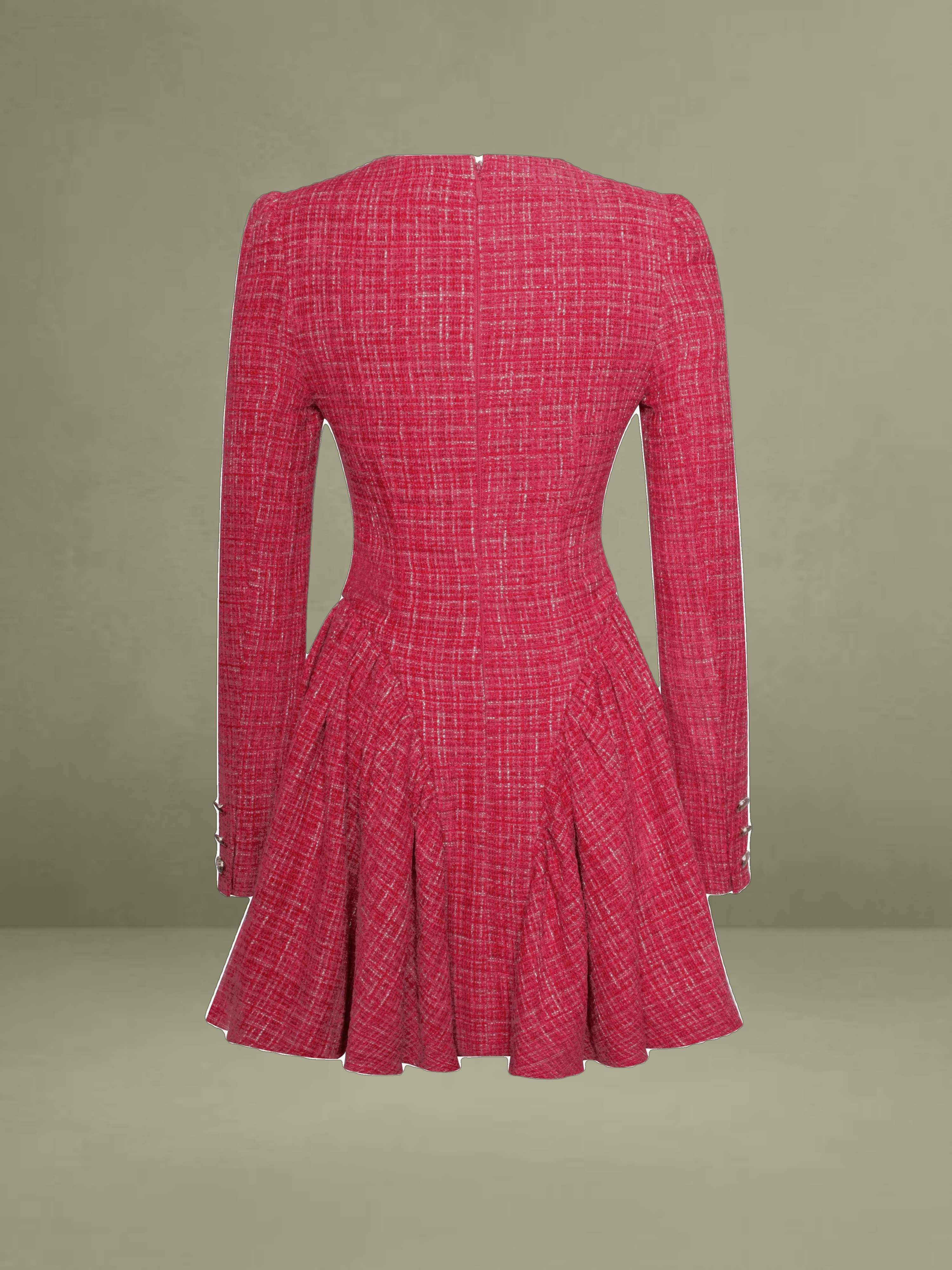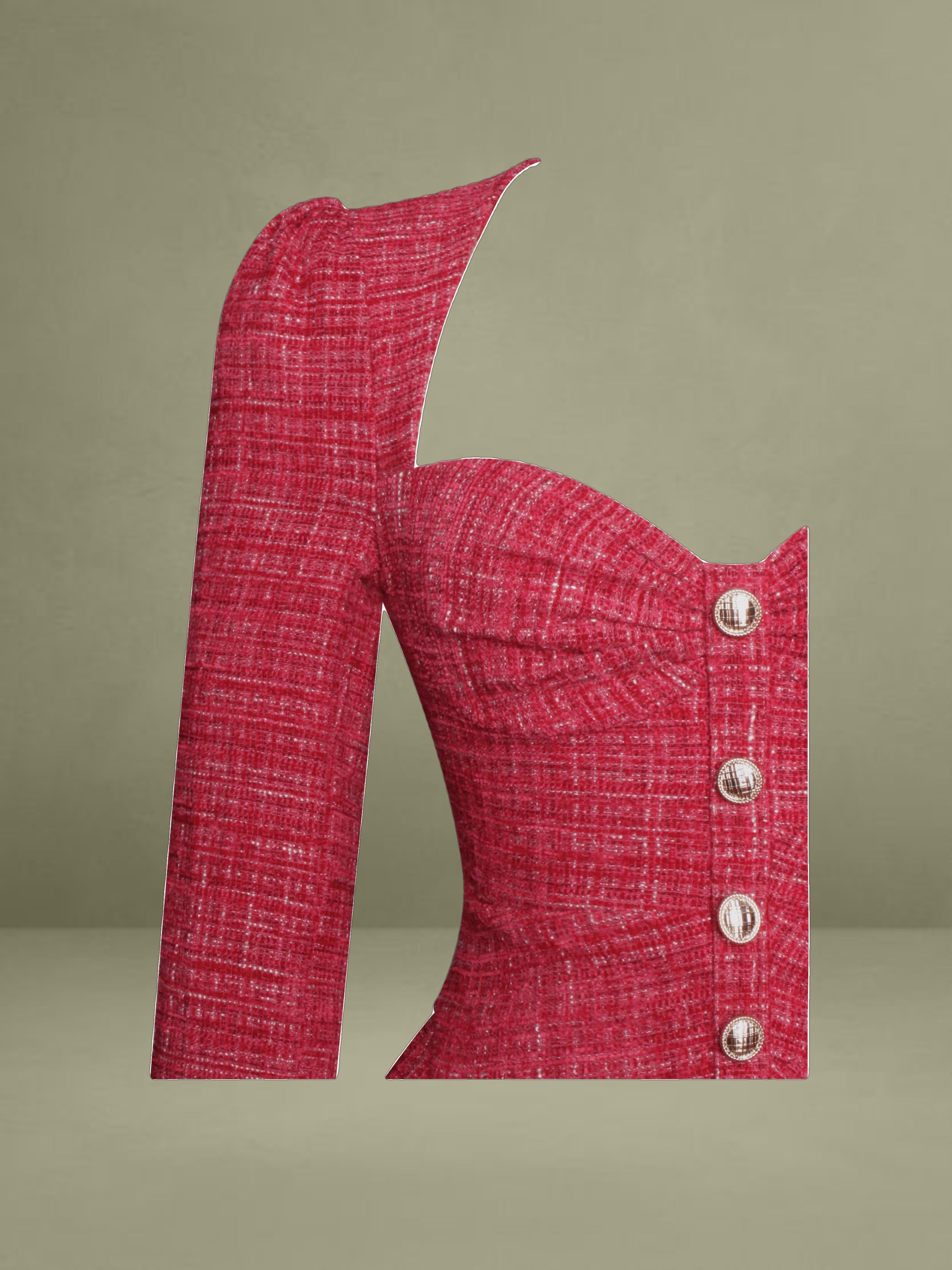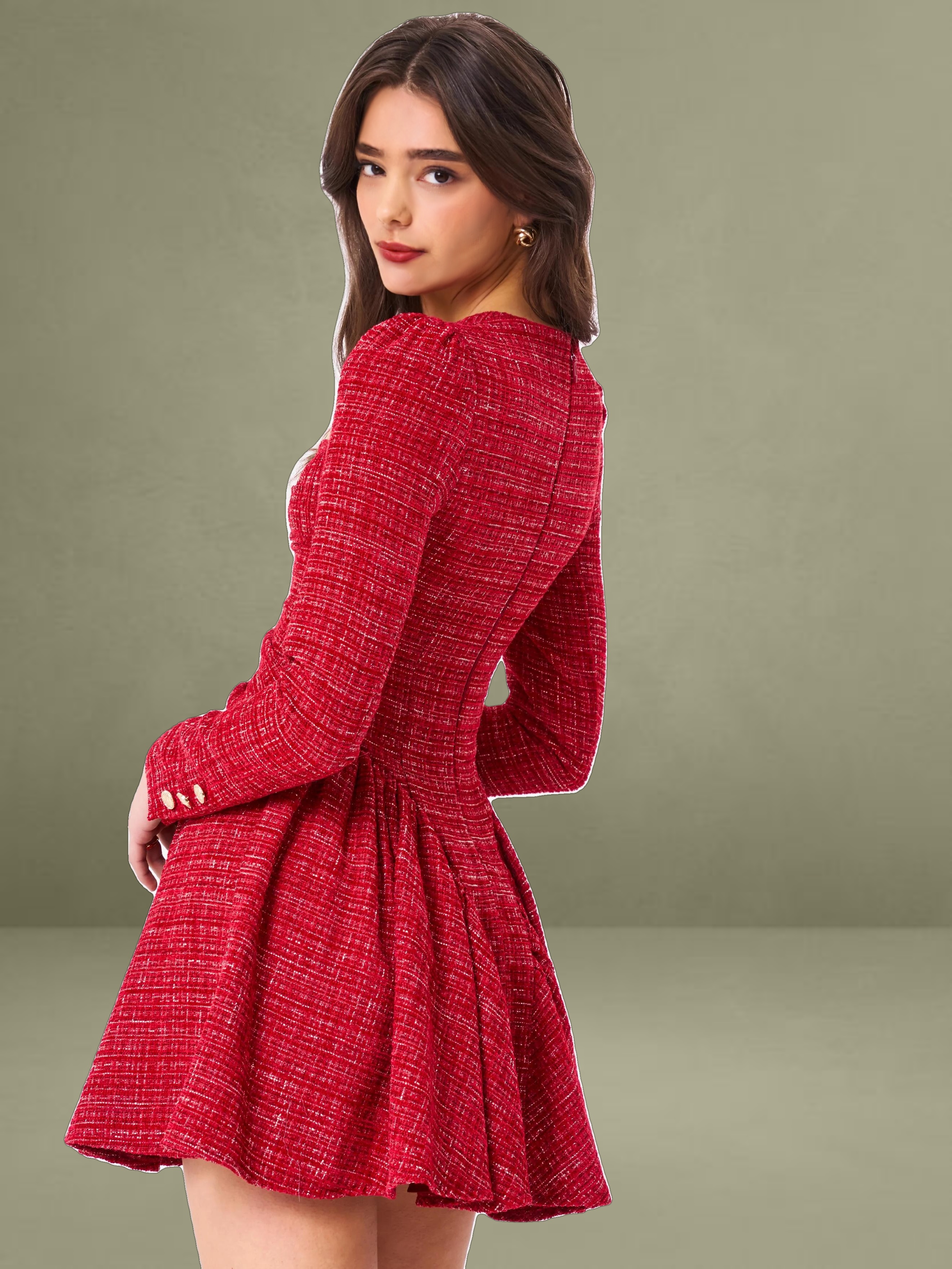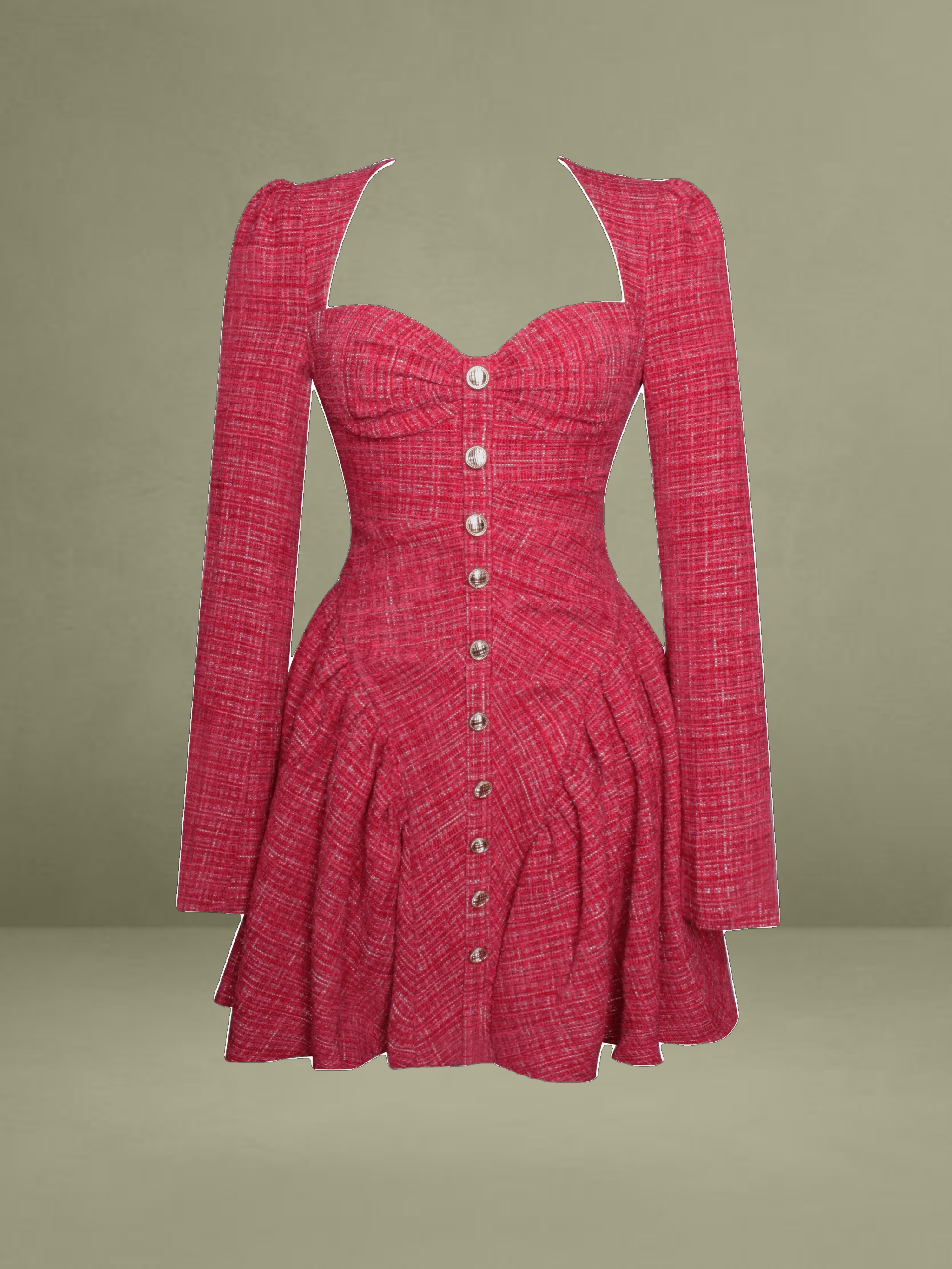 Discover this stylish and elegant dress made from high - quality red tweed boucle fabric. It comes with structured padded cups and padded shoulders, creating a well - defined and sophisticated silhouette. The front is adorned with gold buttons for a refined look, and the rouched design adds a unique texture. Long sleeves and a full skirt with inner tulle support blend classic style with modern elements. An invisible zipper ensures a seamless fit, making it an excellent option to show elegance and grace.