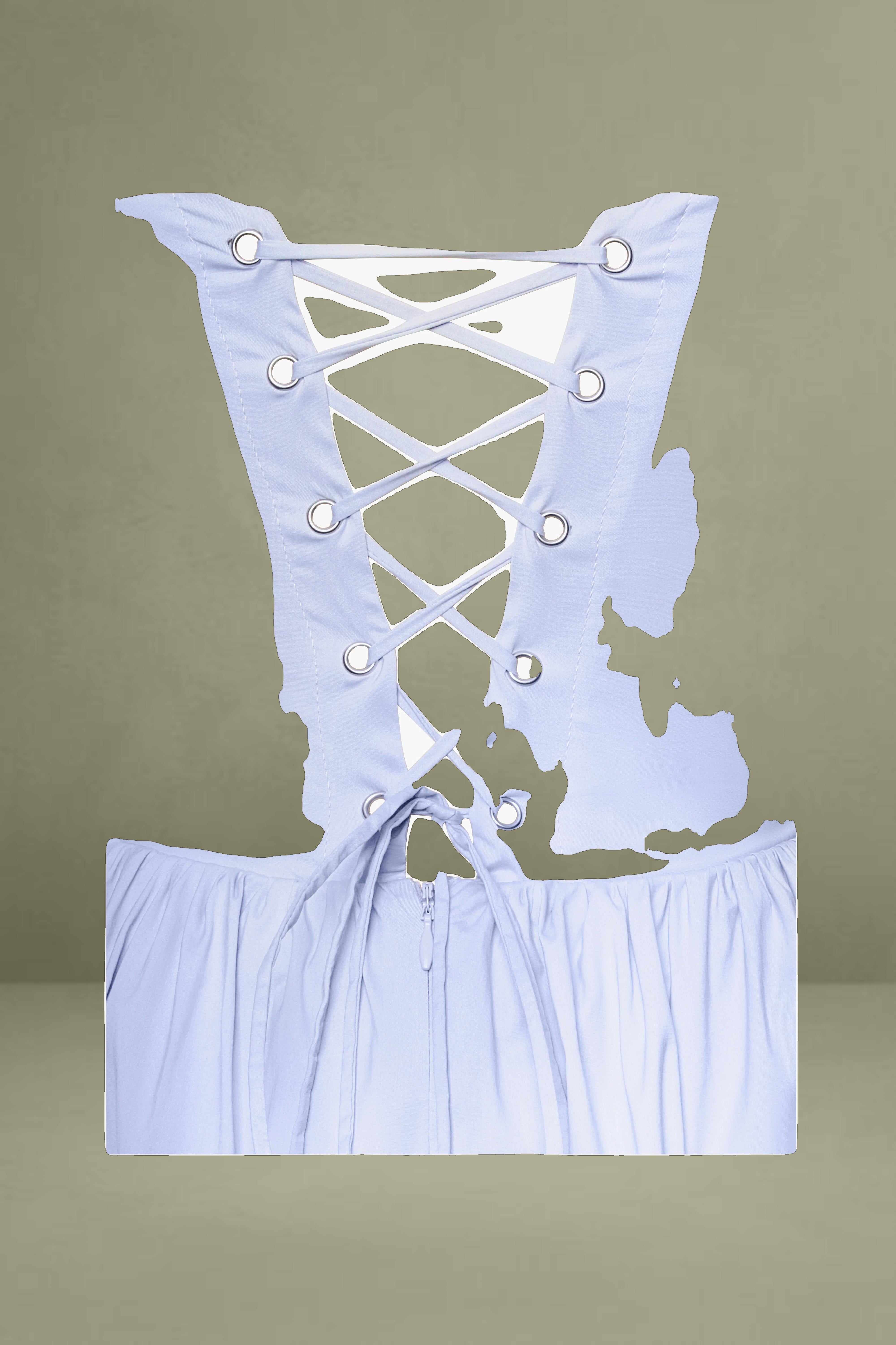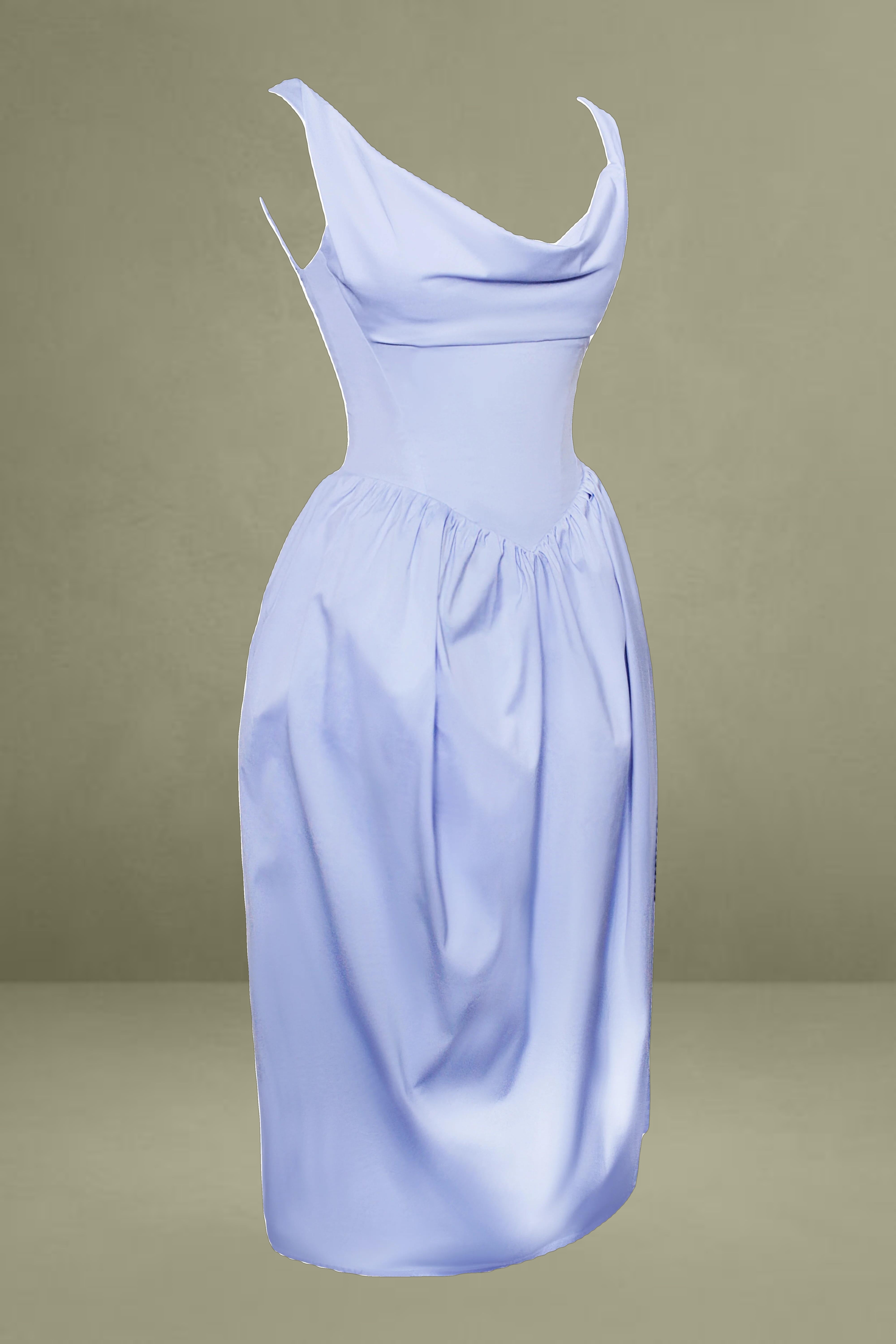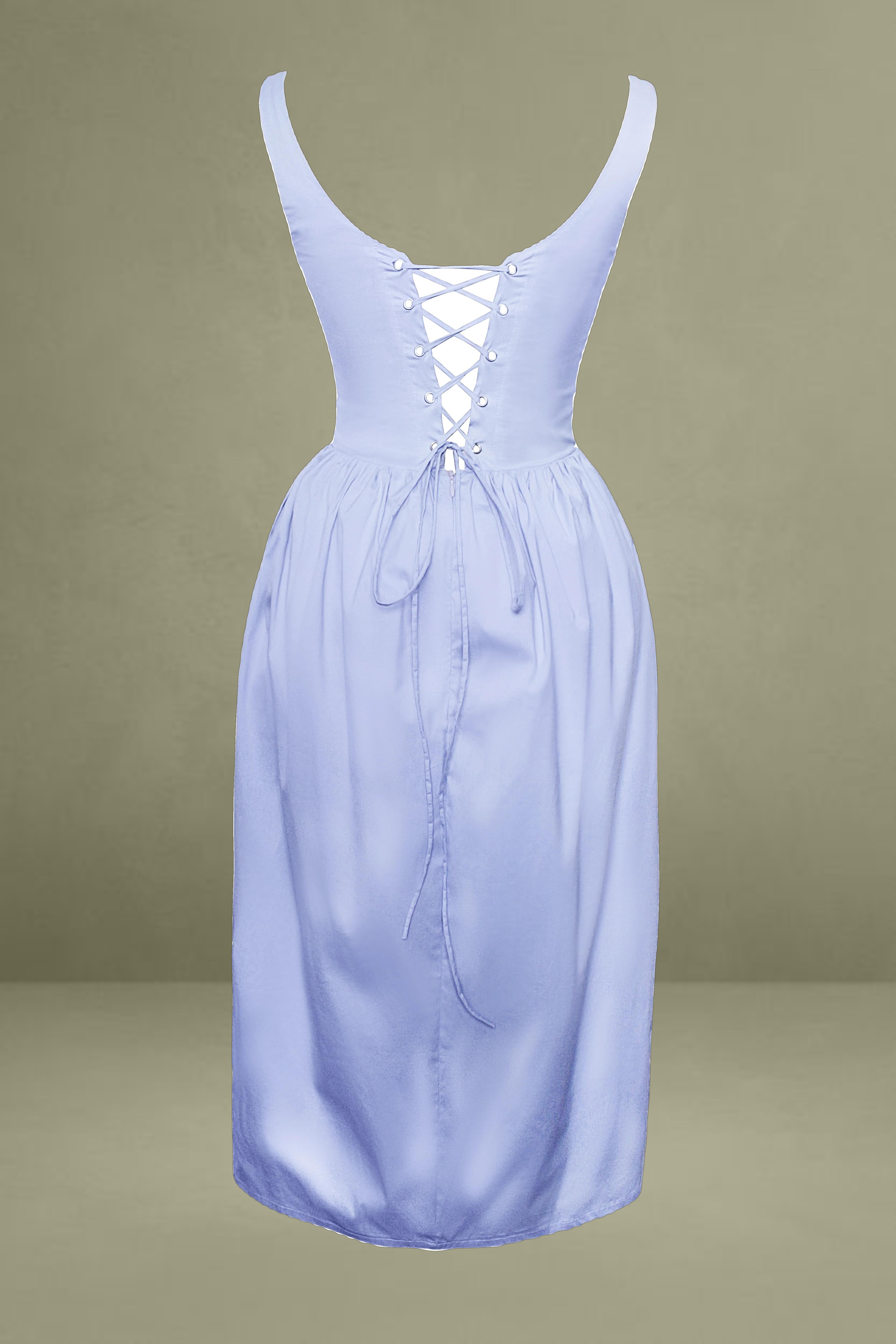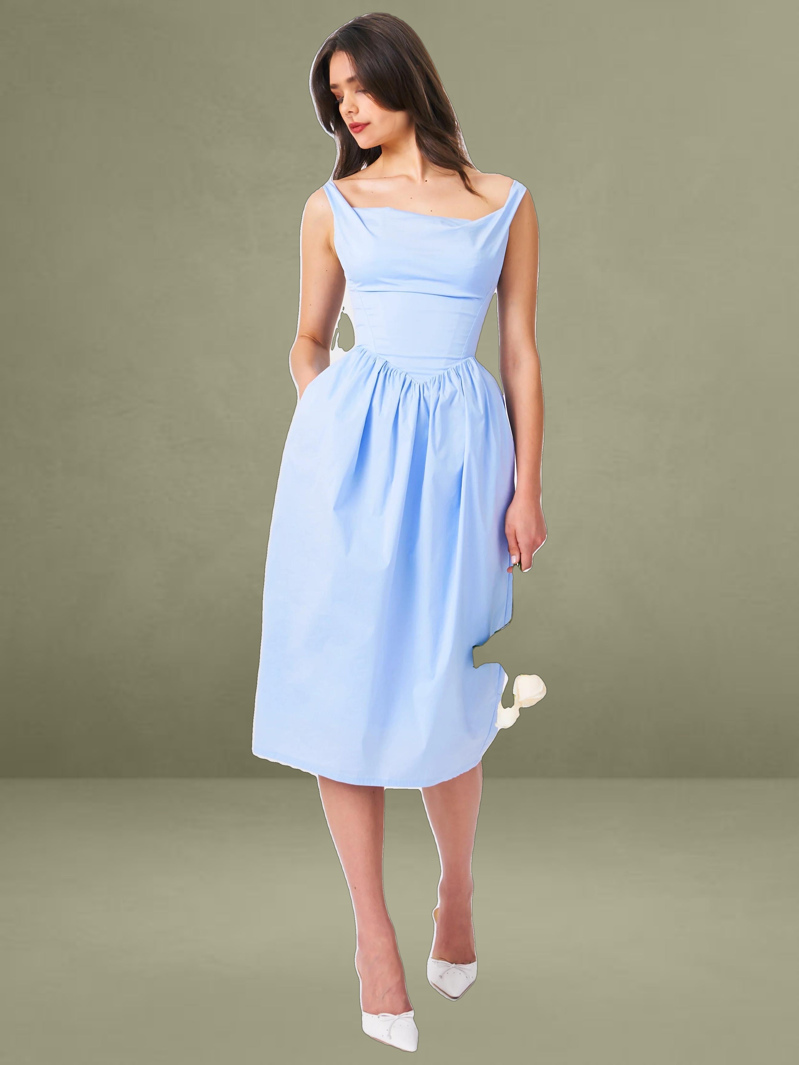 Introducing the Reina Blue Drop Waist Corset Midi Dress, a soft blue midi sundress featuring a draped cowl neckline, padded cups, and built-in bones for a flattering silhouette. With a V-shape waistline and drop waist design, it offers both elegance and ease. The lace-up back adds allure, while pockets provide practicality. Perfect for daytime events or evening soirees, this dress seamlessly blends style and comfort, ensuring you make a lasting impression with its timeless charm and understated elegance.