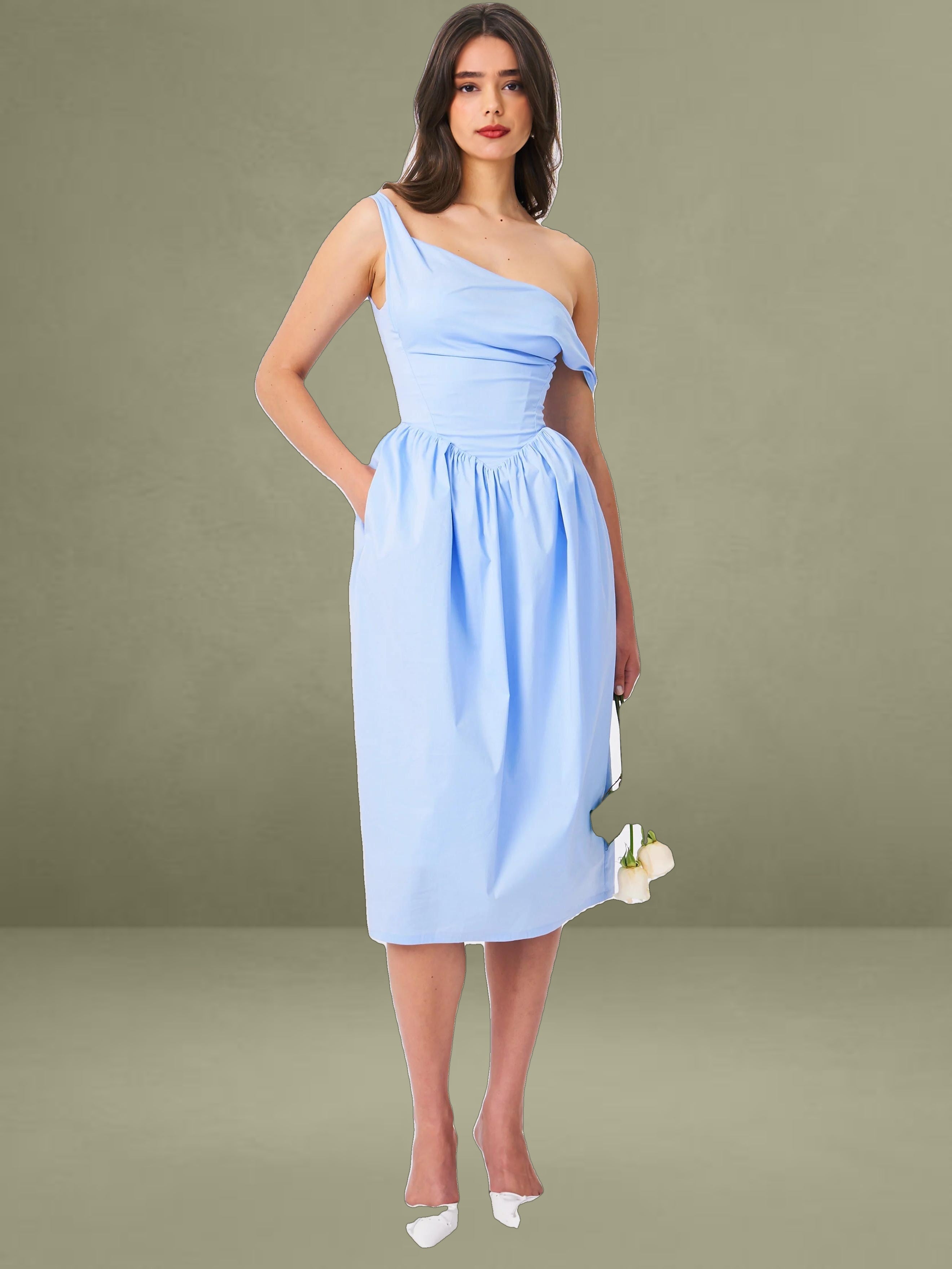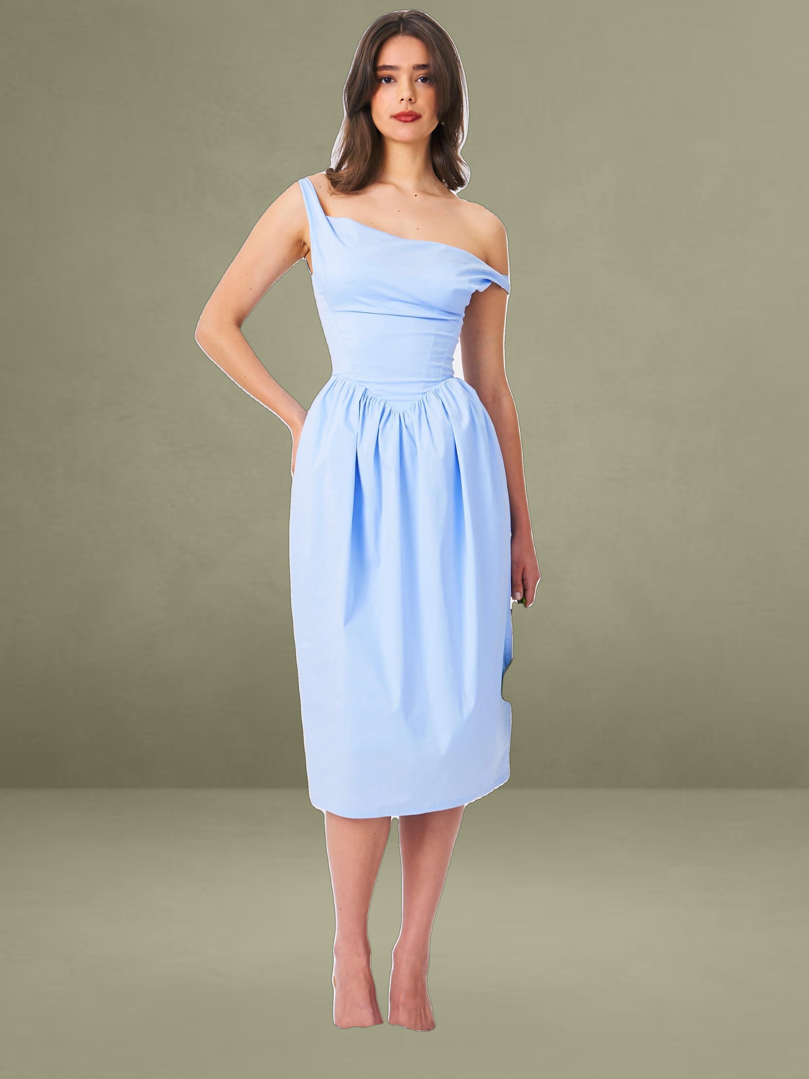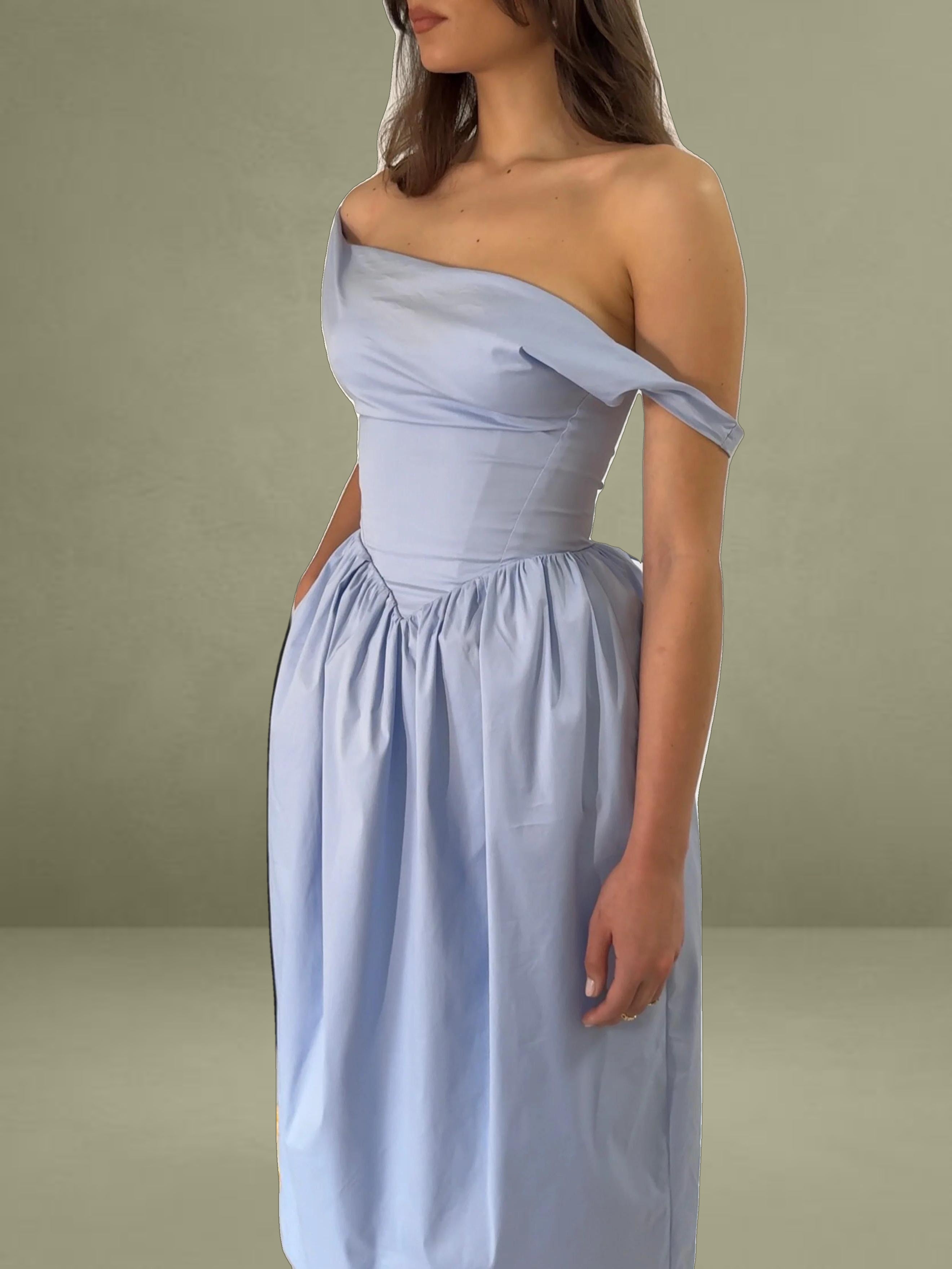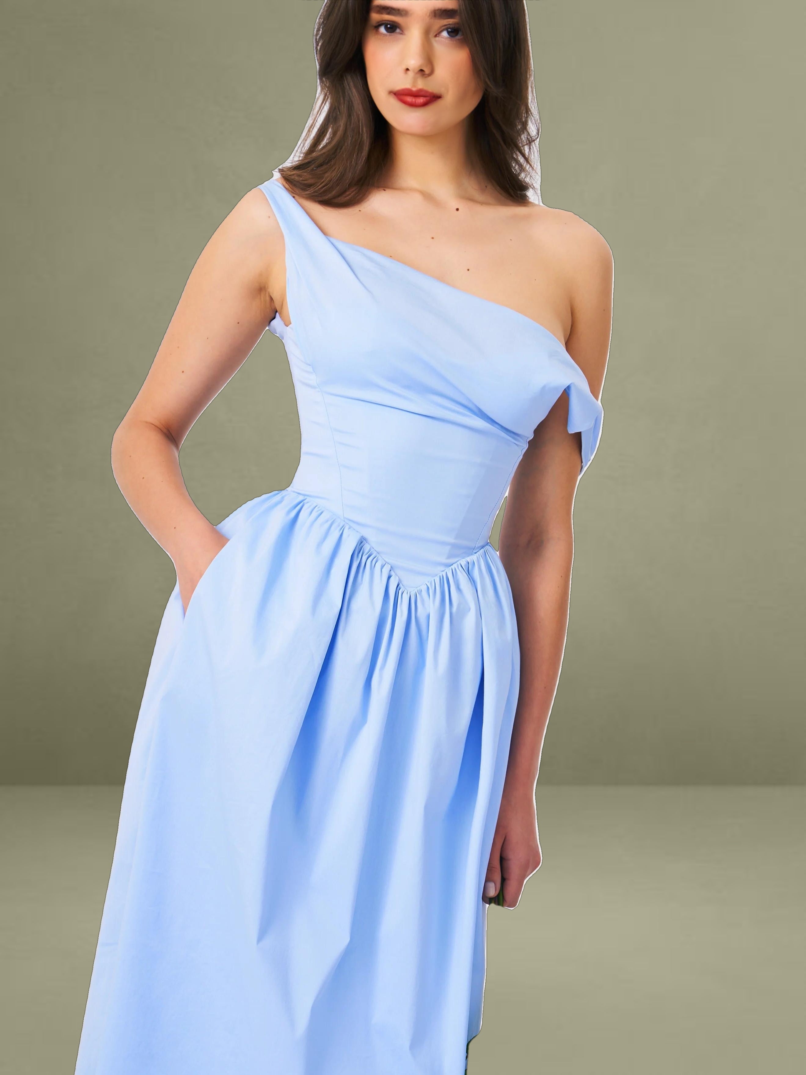 Introducing the Reina Blue Drop Waist Corset Midi Dress, a soft blue midi sundress featuring a draped cowl neckline, padded cups, and built-in bones for a flattering silhouette. With a V-shape waistline and drop waist design, it offers both elegance and ease. The lace-up back adds allure, while pockets provide practicality. Perfect for daytime events or evening soirees, this dress seamlessly blends style and comfort, ensuring you make a lasting impression with its timeless charm and understated elegance.