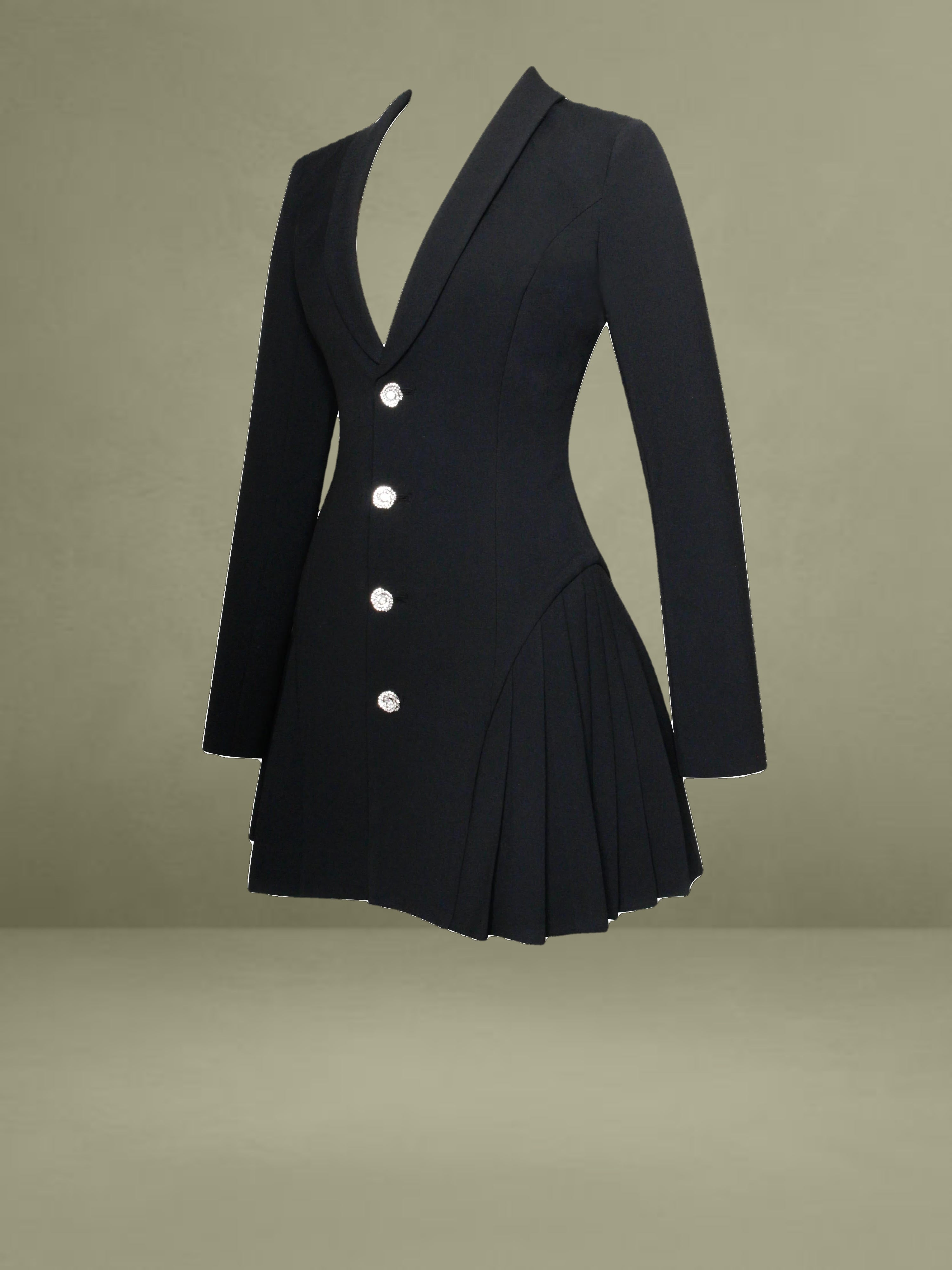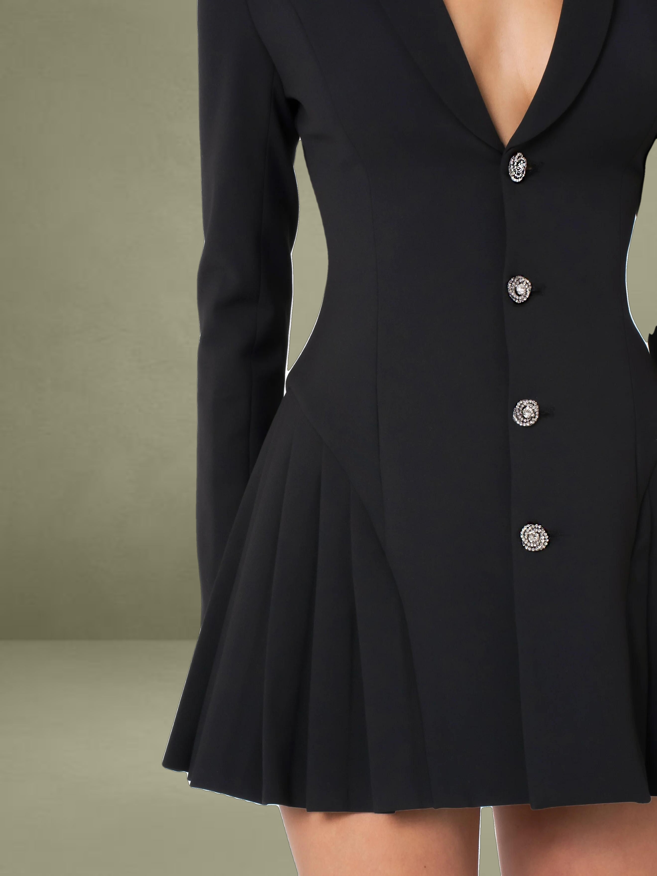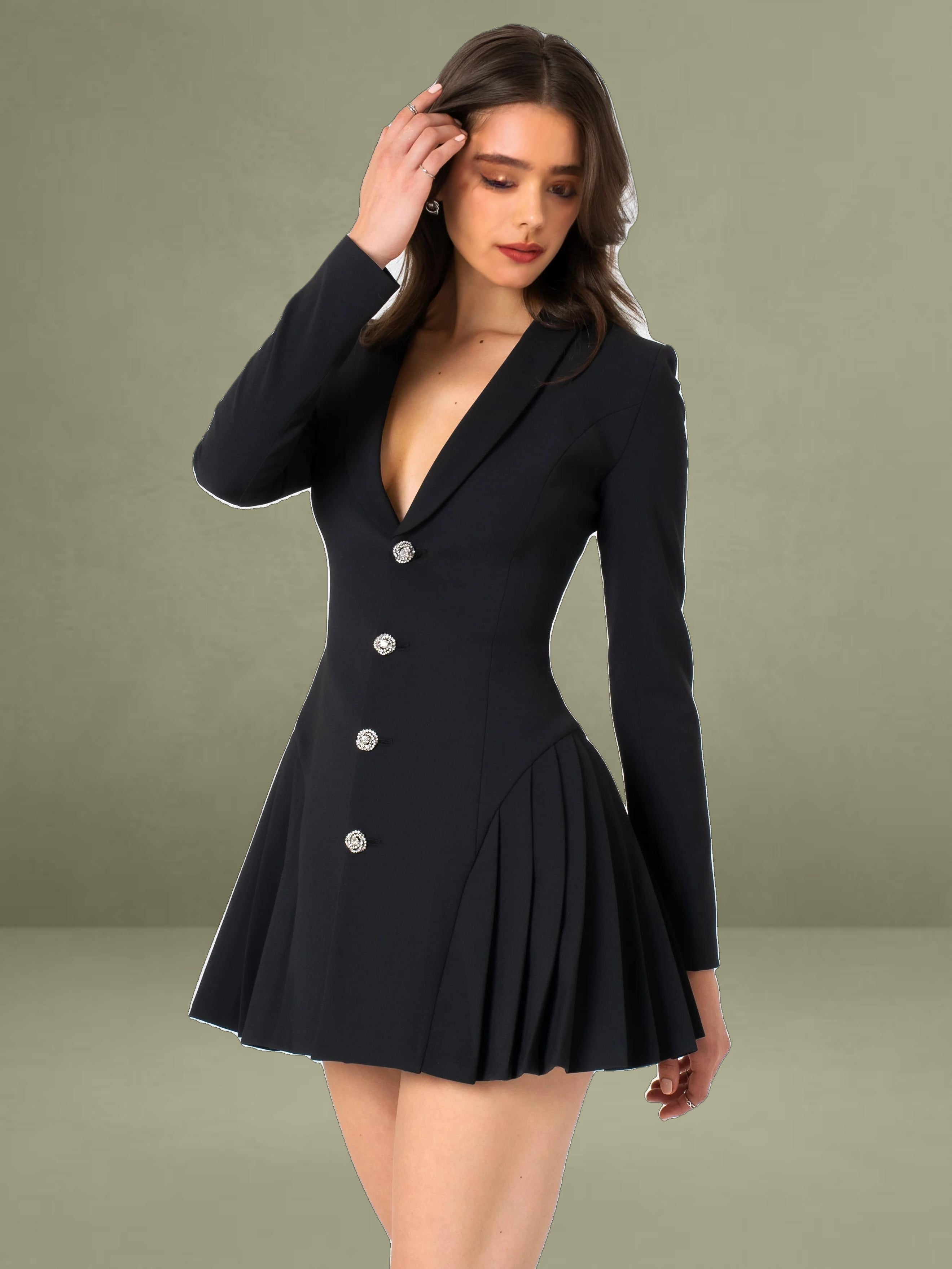 Welcome the upgrading version of our Delia blazer dress——Ria Black blazer dress with rine stone button and pleated detail. It meticulously crafted with luxurious lining for a flawless fit and feel. This sophisticated piece features shiny rine stone buttons that add a touch of elegance to the ensemble. The pleated bottom adds a feminine flair, creating movement and grace with every step. Perfect for any occasion, from cocktail parties to business meetings, whether you're dressing it up with heels or keeping it casual with flats, this black blazer dress is sure to make a statement wherever you go. And it makes a perfect match with our Pearl Handbag.