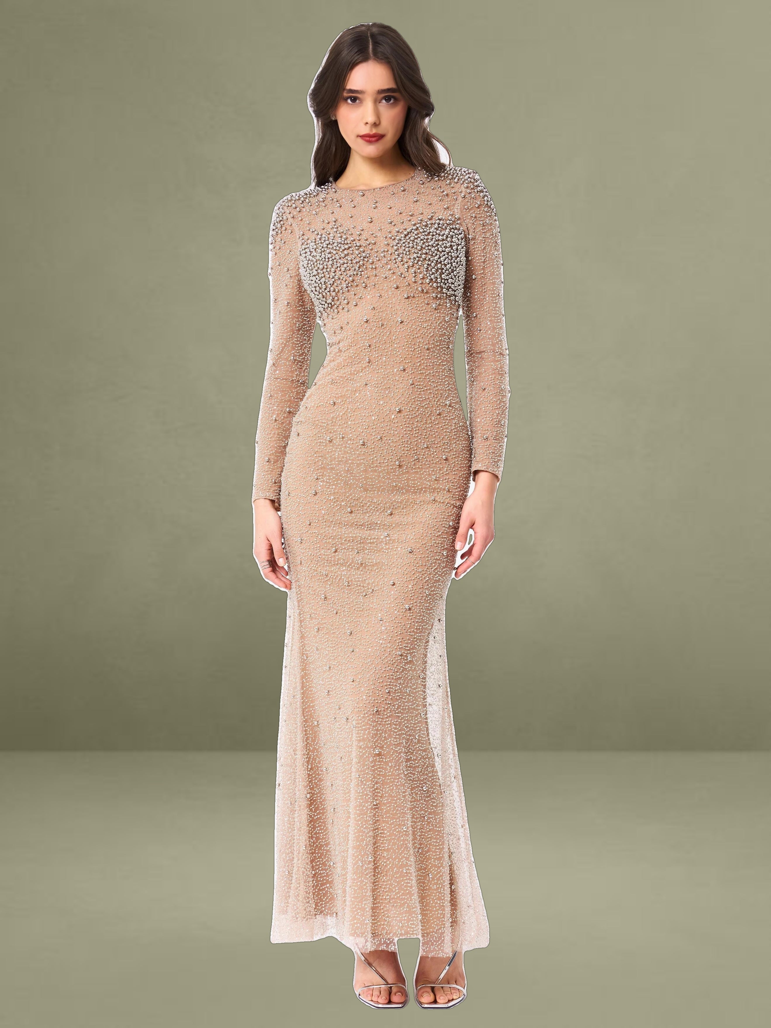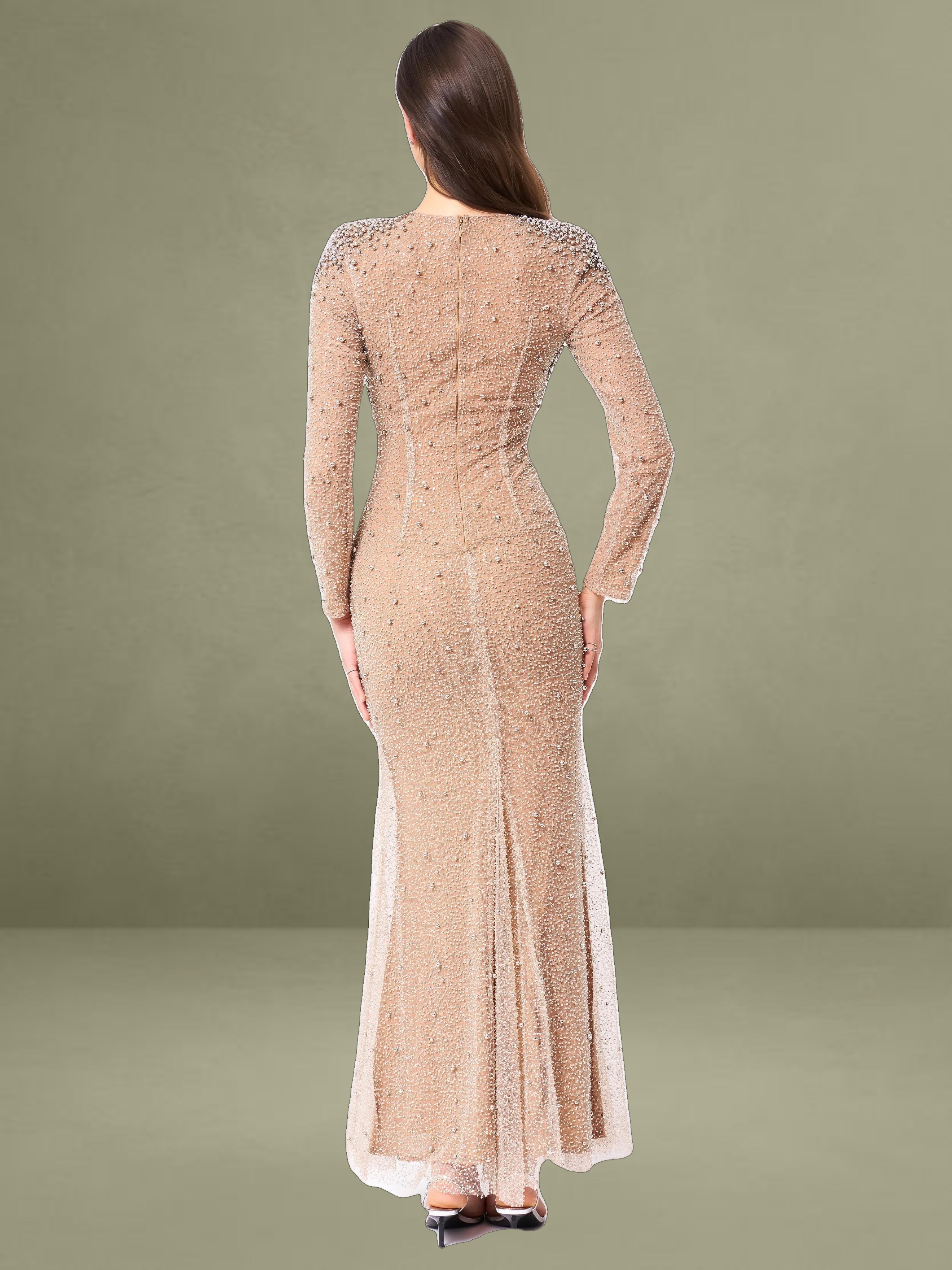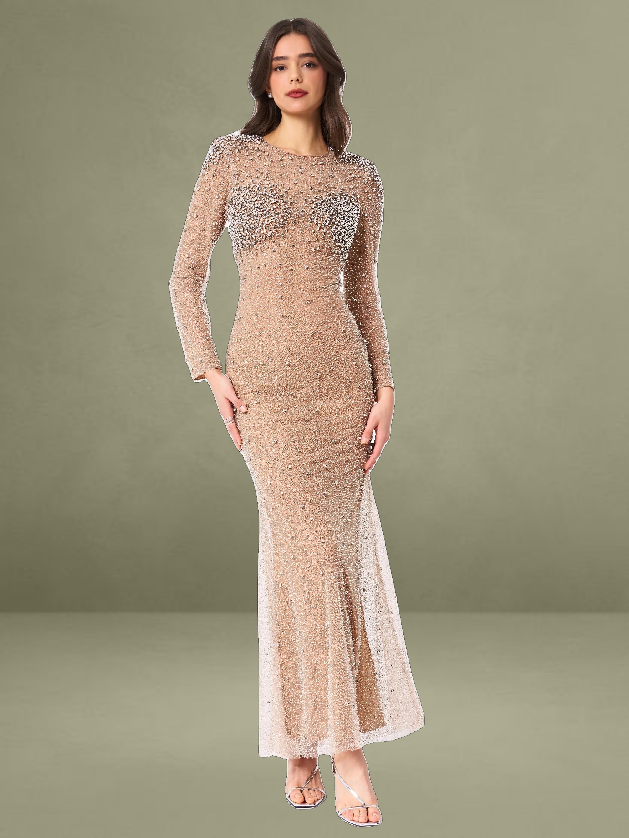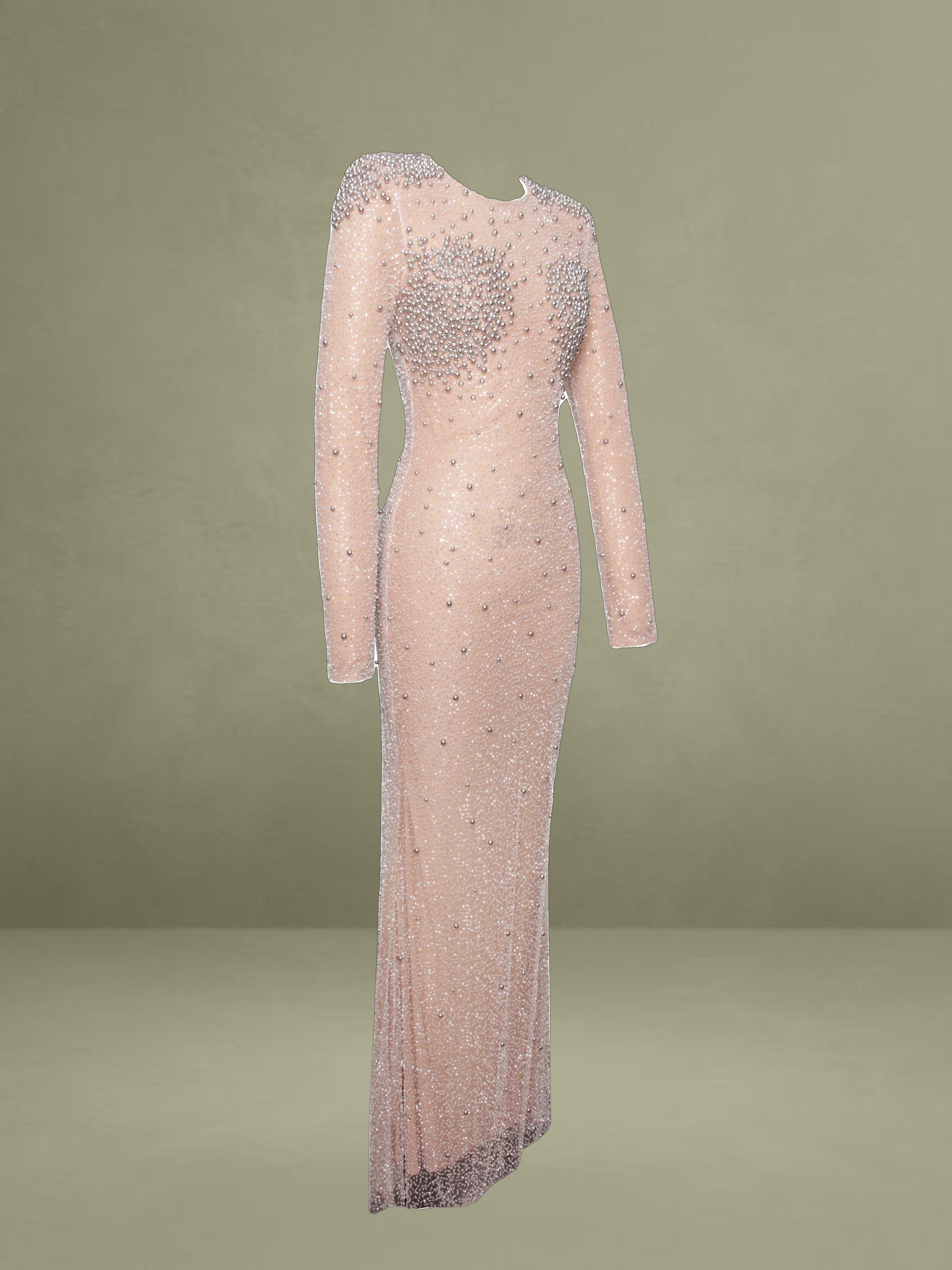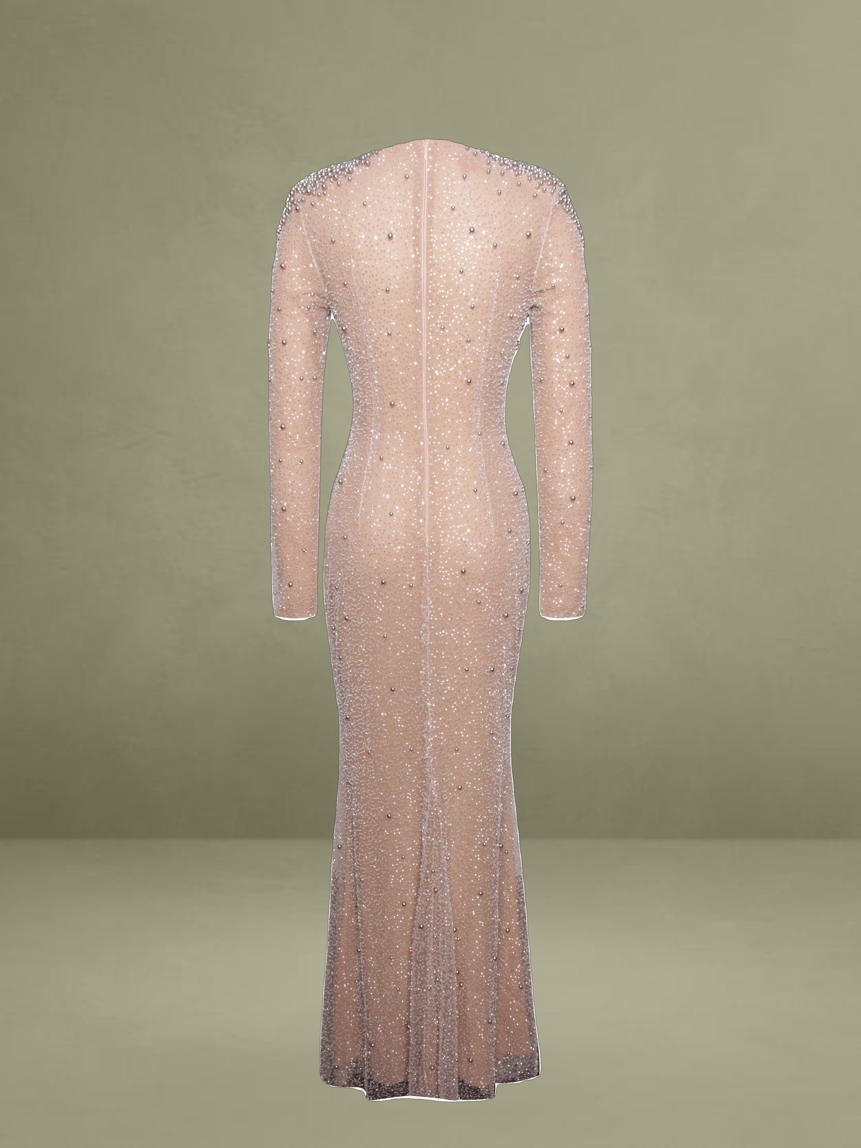 Introducing the Rita Dress, a masterpiece of elegance and glamour. This maxi bodycon dress features a sophisticated crew neck and long sleeves, perfectly balanced with a dramatic mermaid silhouette that exudes sophistication. Crafted from exquisite embroidered mesh, adorned with shimmering silver beads, the dress is designed to captivate from every angle. Padded shoulders lend a structured, regal touch, while the fully lined interior ensures comfort and a flawless fit. Finished with an invisible zipper, the Rita Dress is the ultimate choice for making a dazzling entrance at any event.