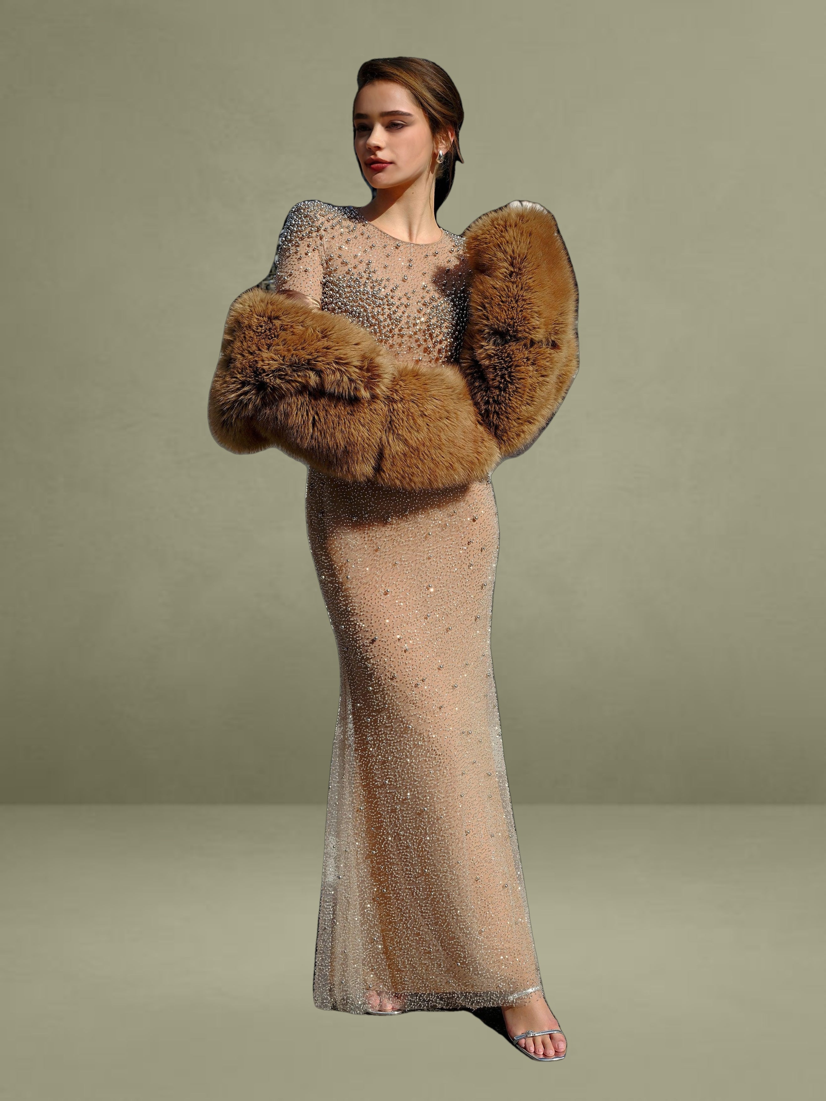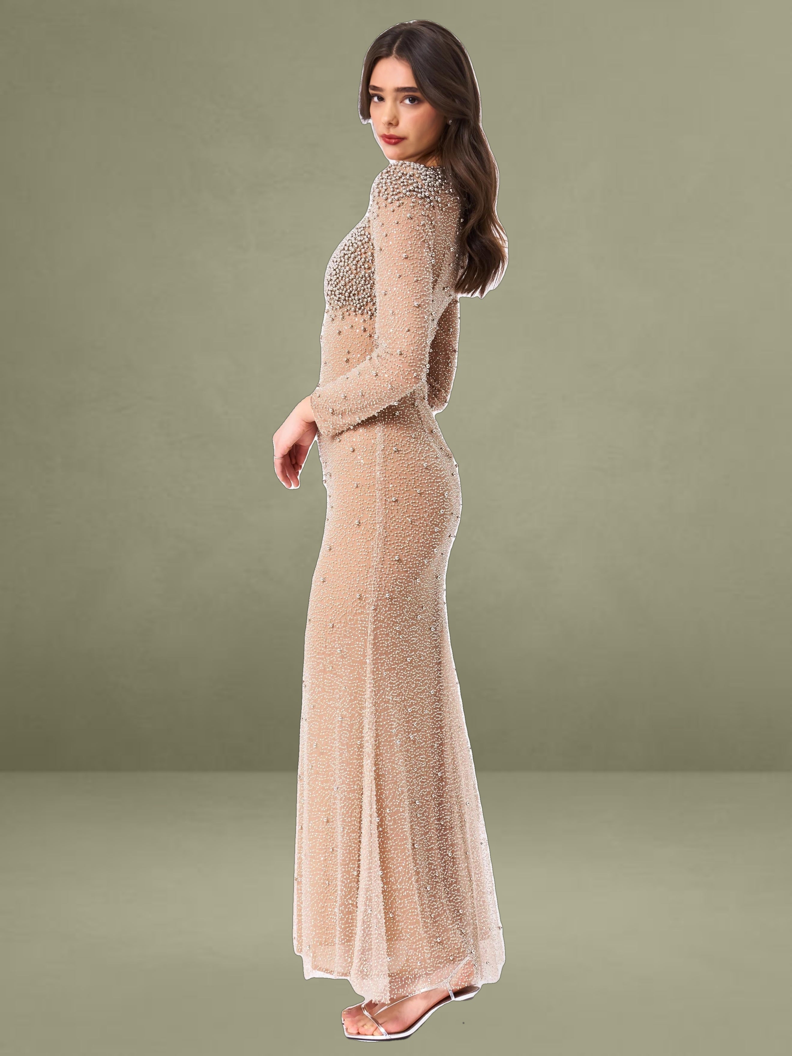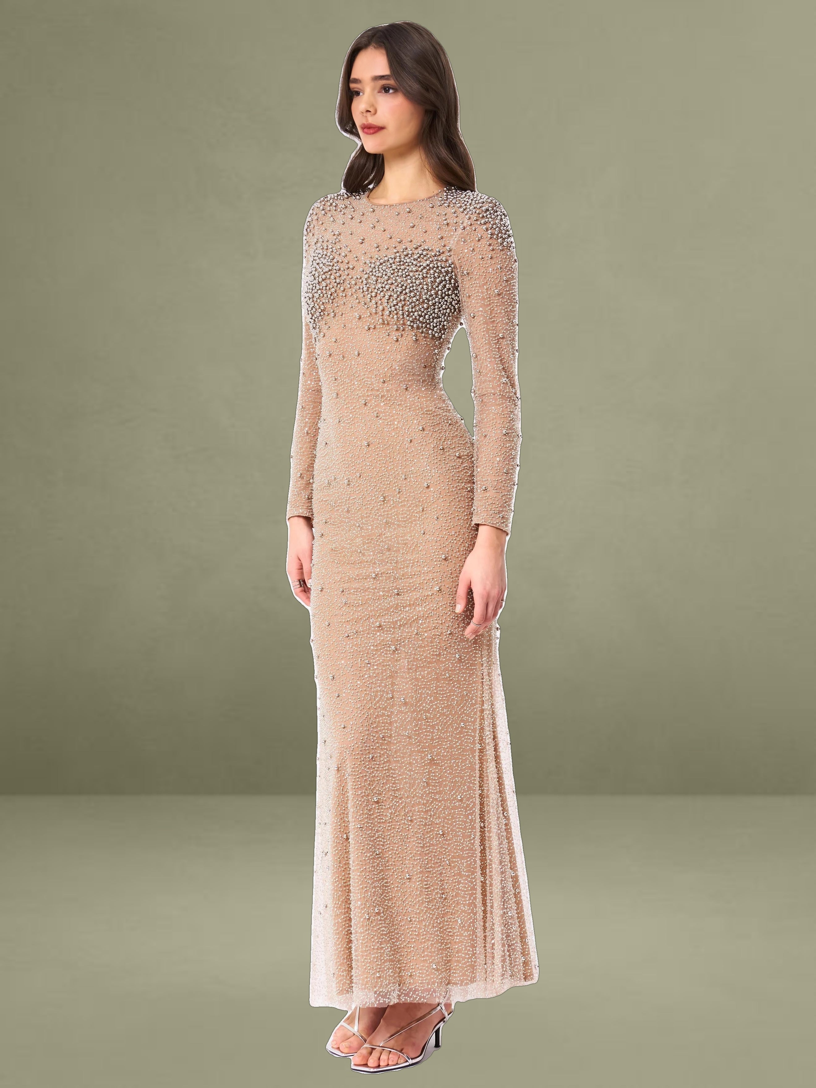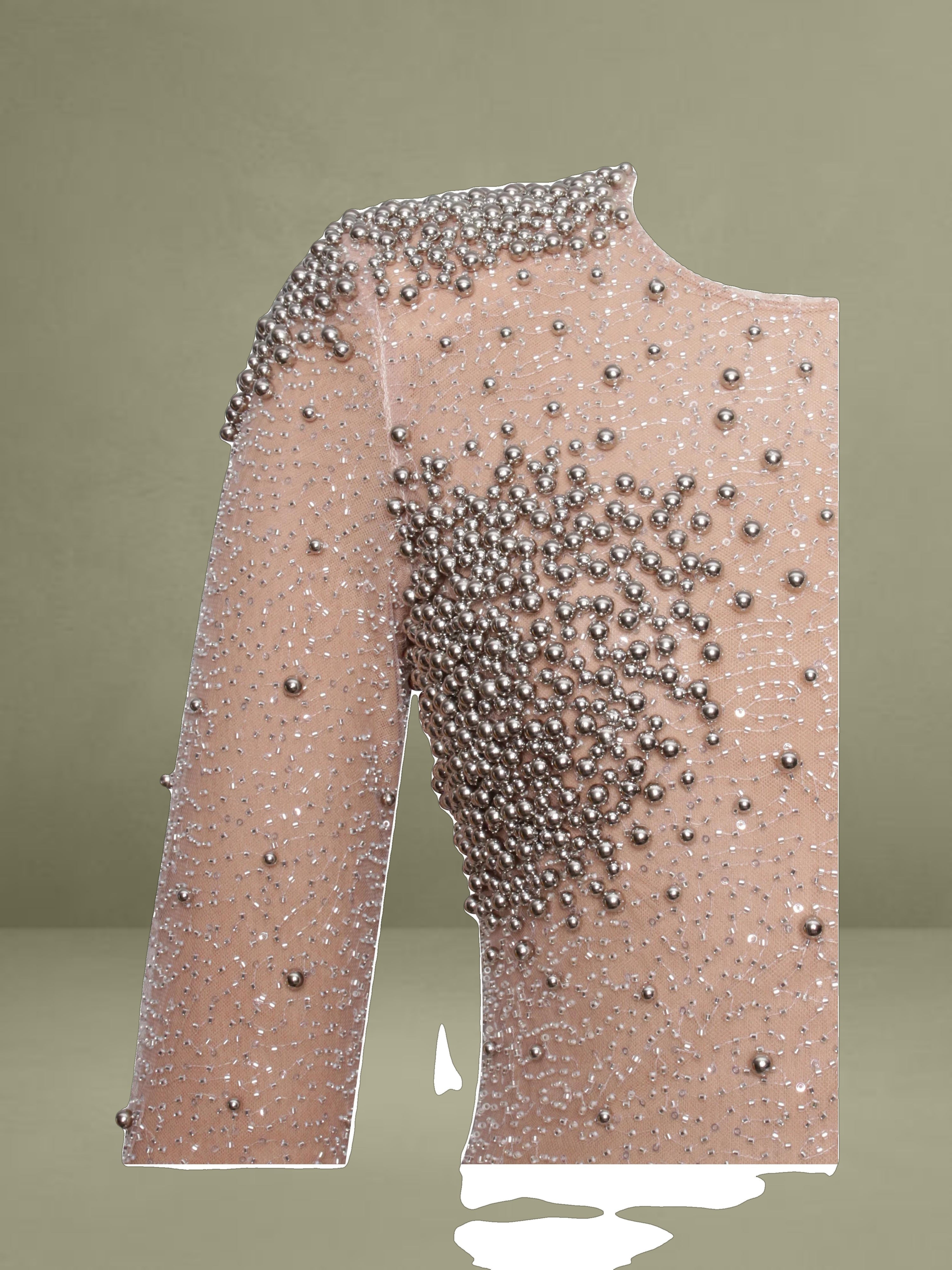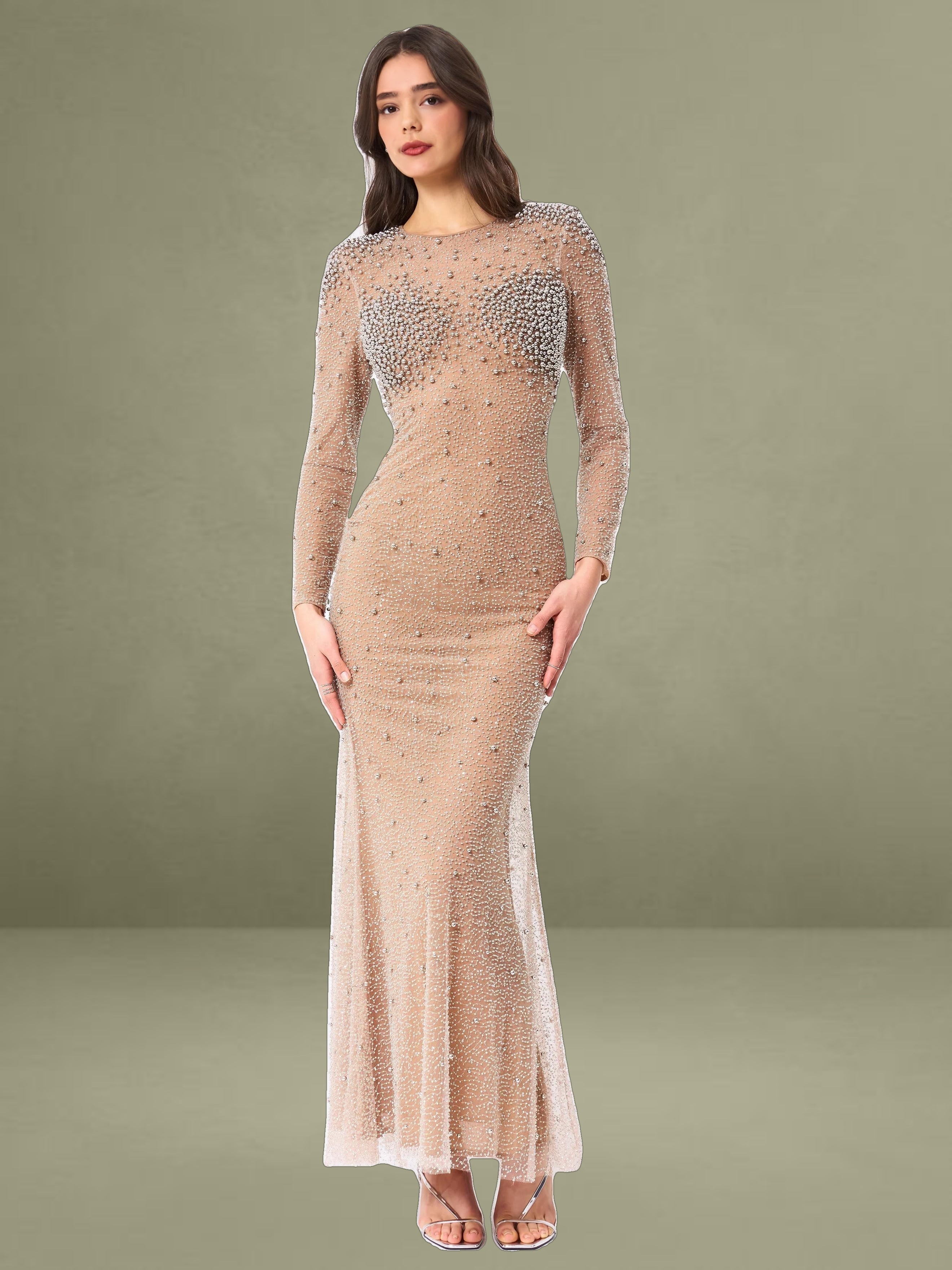 Introducing the Rita Dress, a masterpiece of elegance and glamour. This maxi bodycon dress features a sophisticated crew neck and long sleeves, perfectly balanced with a dramatic mermaid silhouette that exudes sophistication. Crafted from exquisite embroidered mesh, adorned with shimmering silver beads, the dress is designed to captivate from every angle. Padded shoulders lend a structured, regal touch, while the fully lined interior ensures comfort and a flawless fit. Finished with an invisible zipper, the Rita Dress is the ultimate choice for making a dazzling entrance at any event.