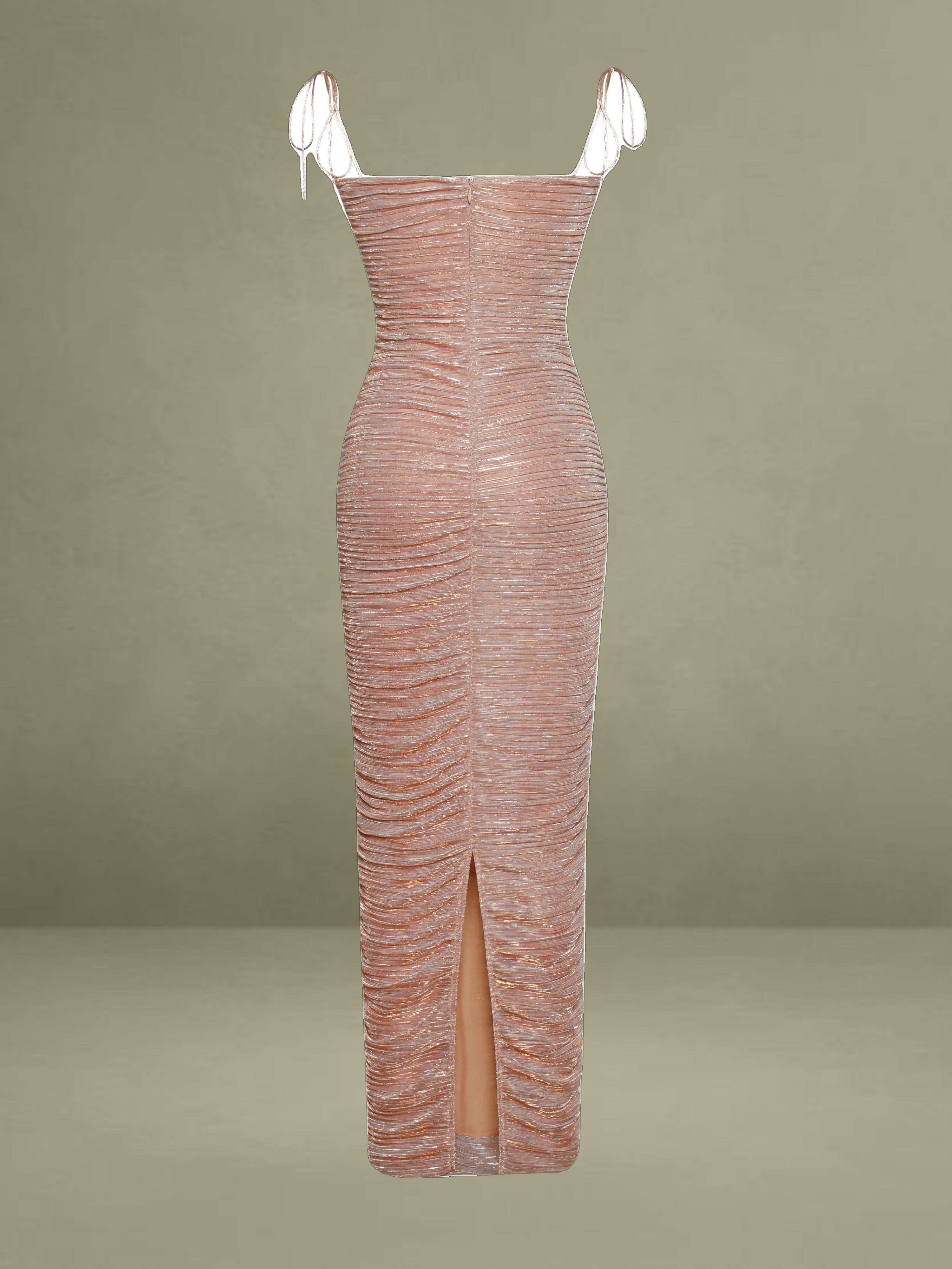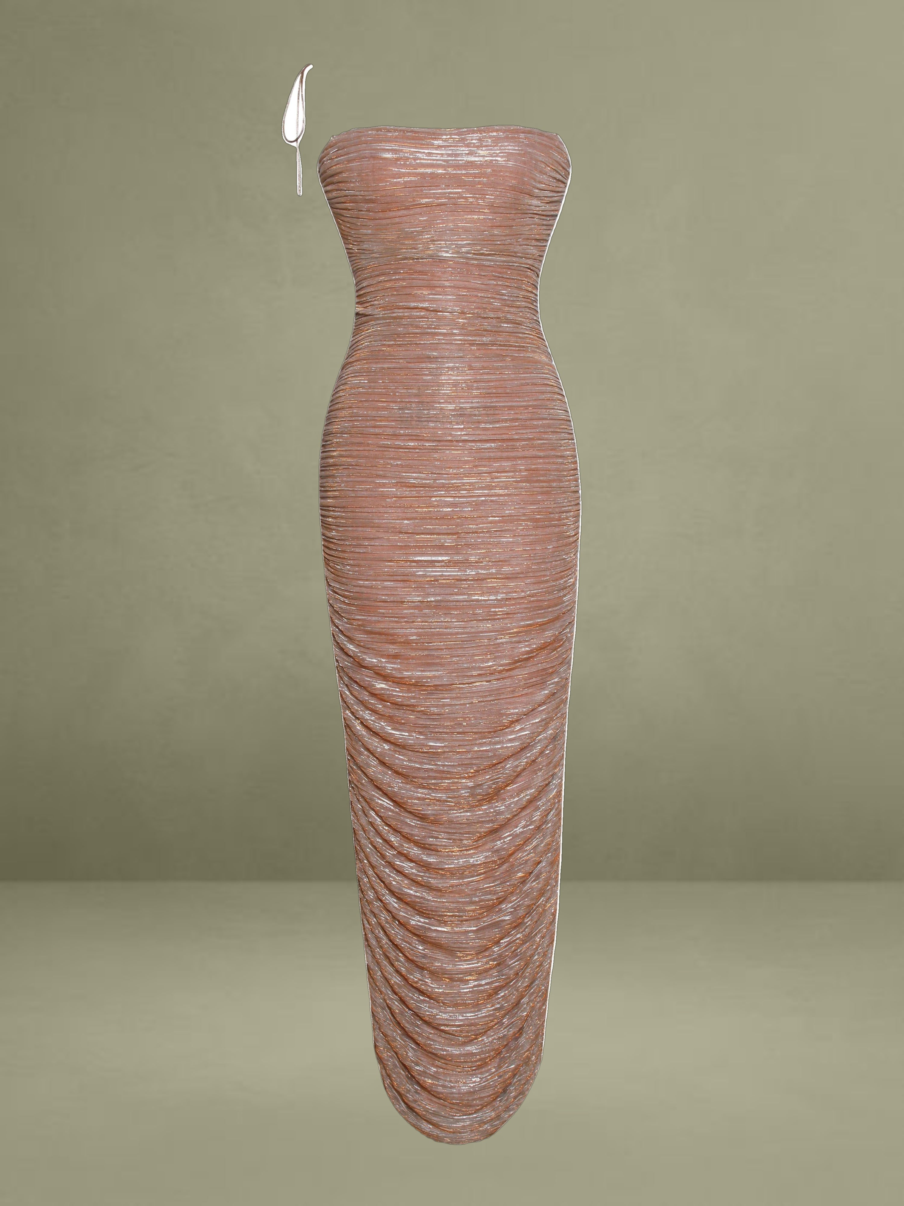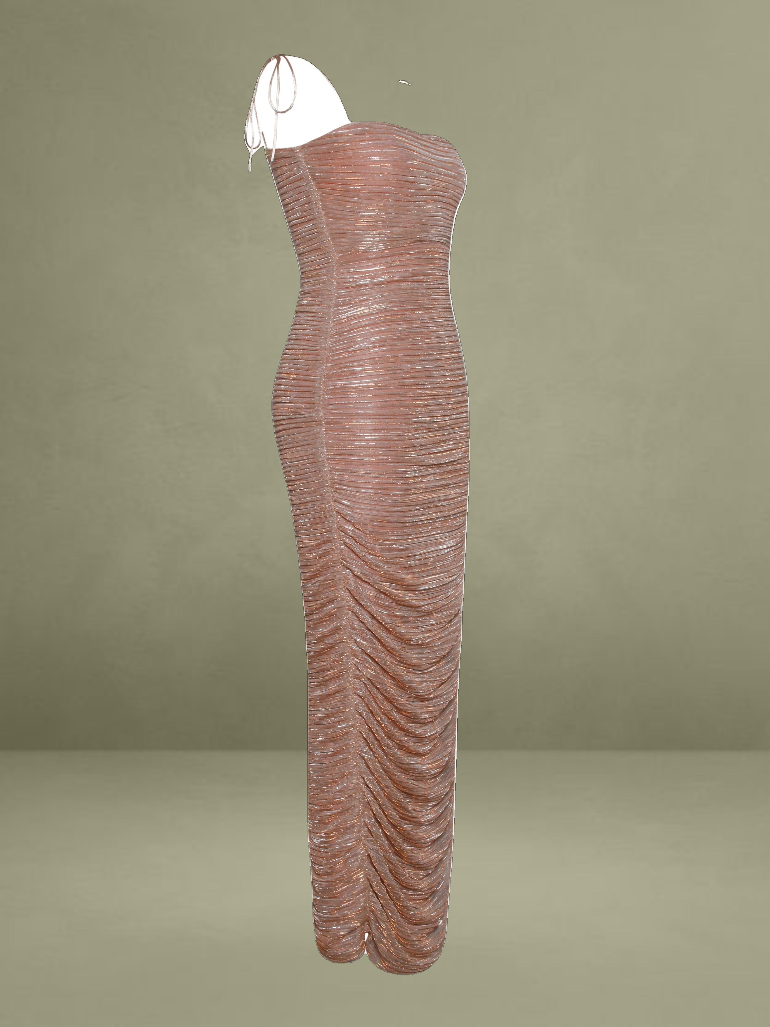 Make a stylish entrance! This beautiful dress is designed to accentuate your natural curves with ruched details all over. The adjustable thin elastic straps and lightly padded chest offer extra lift and support. The metallic pleated chiffon fabric adds a glamorous touch and makes you stand out. Pair it with a small bag and transparent heels for a luxurious party look! Available in rose gold, black, and gold, as well as long sleeve or off - the - shoulder styles.
