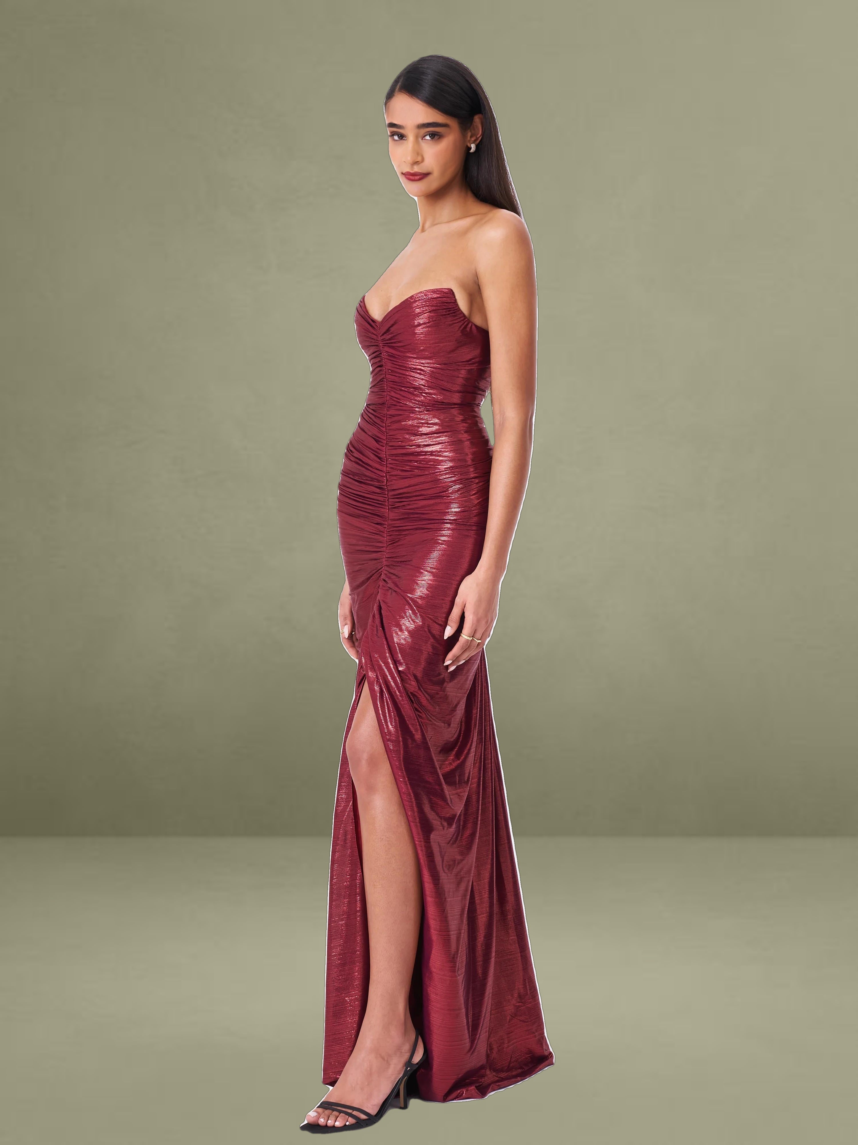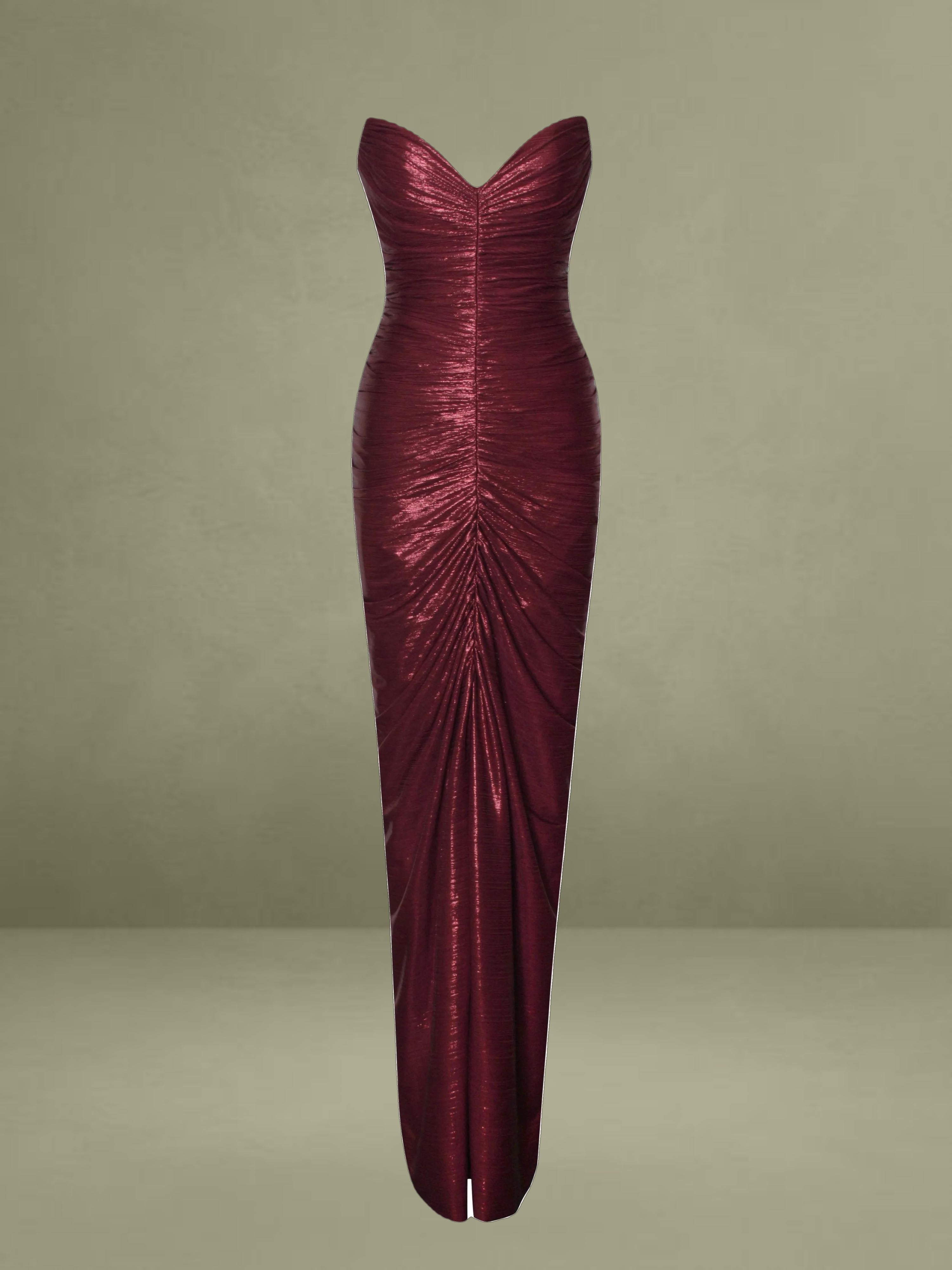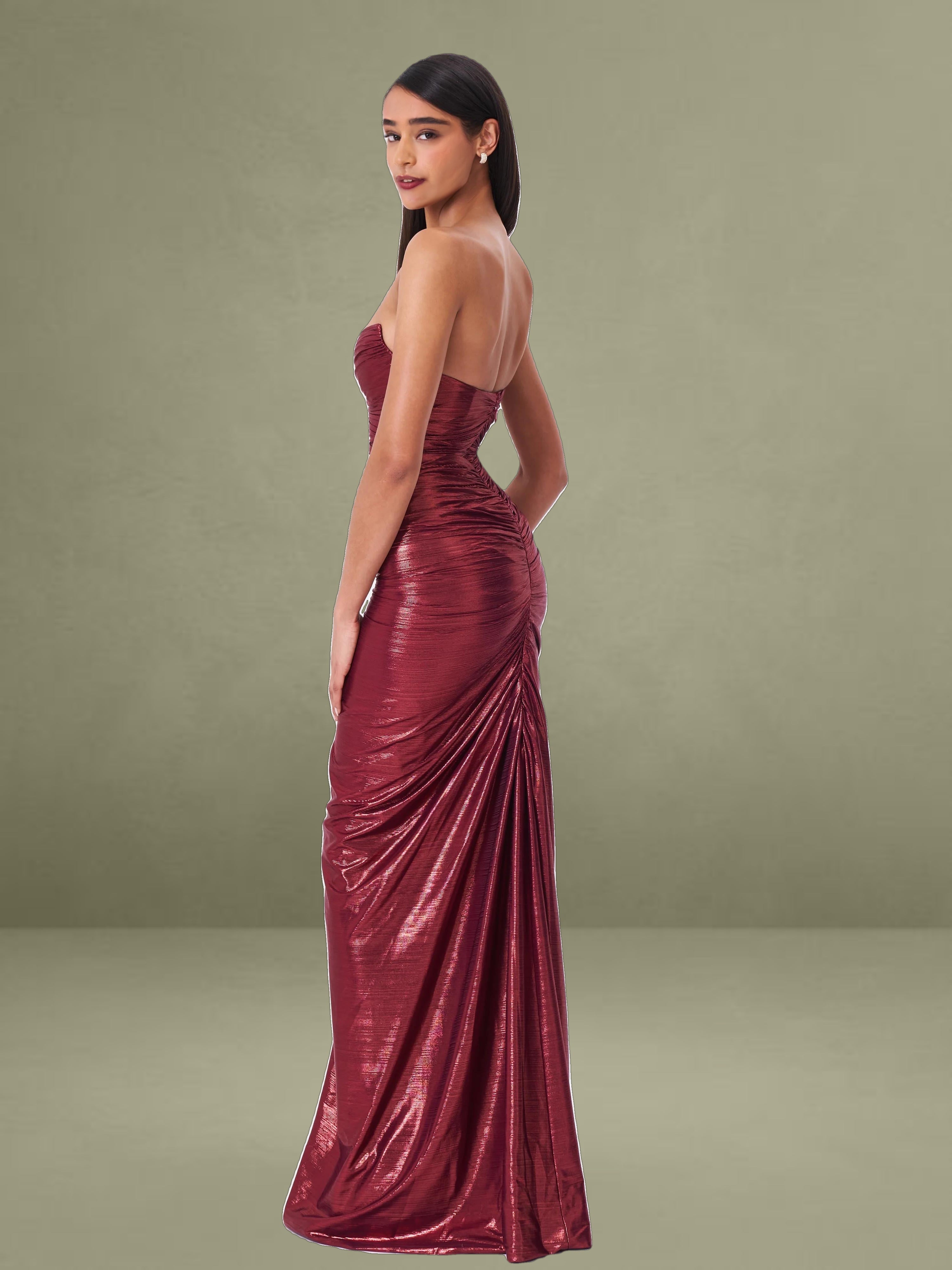 Exude sophistication and glamour with the Sable Gown, a show-stopping masterpiece in rich burgundy glitter fabric. This stunning design features a graceful sweetheart collar and elegant ruched detailing that accentuates your silhouette. The mermaid silhouette flows beautifully, with a dramatic middle front slit adding a sultry edge. Designed for secure wear, the gown includes non-slip straps, while an invisible zipper ensures a flawless fit. Fully lined for comfort, the Sable Gown is the epitome of elegance, perfect for making a dazzling entrance at any formal event.