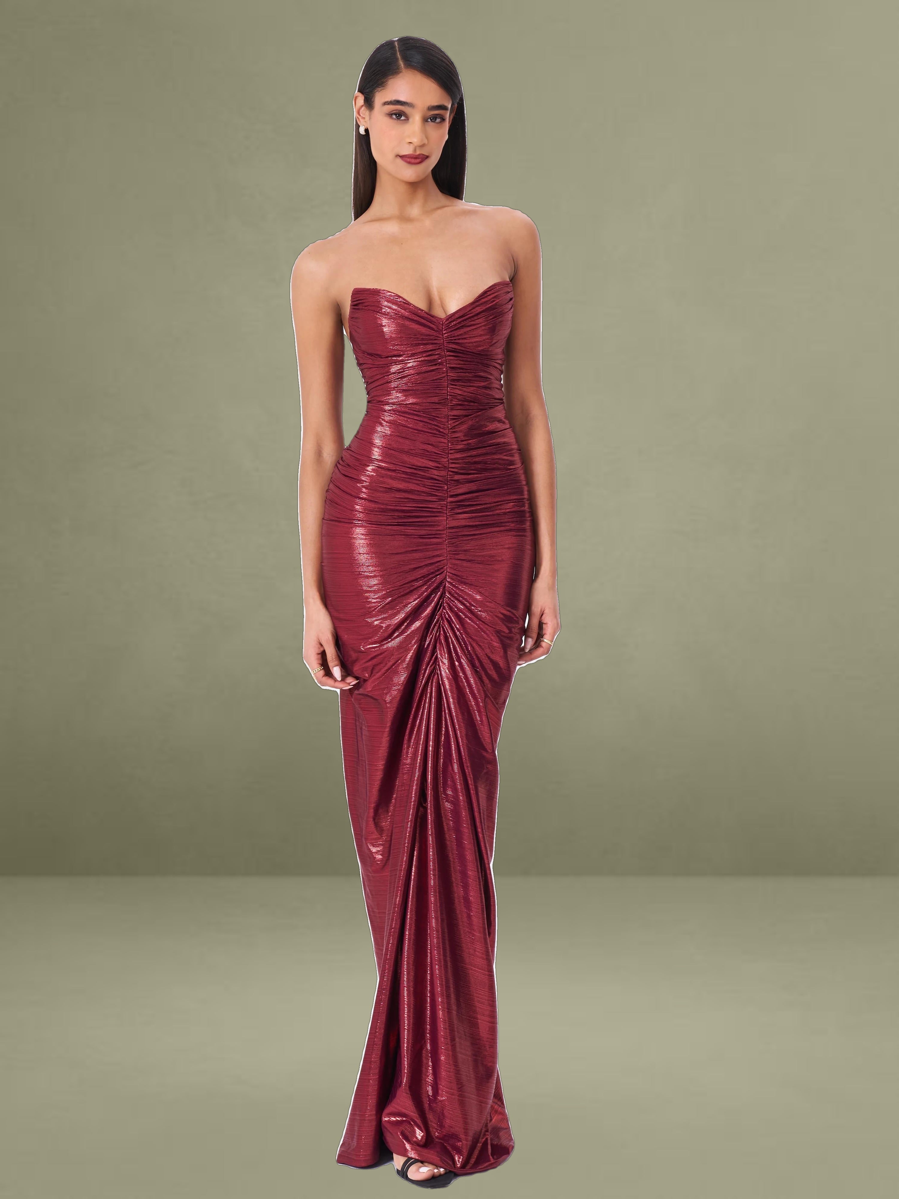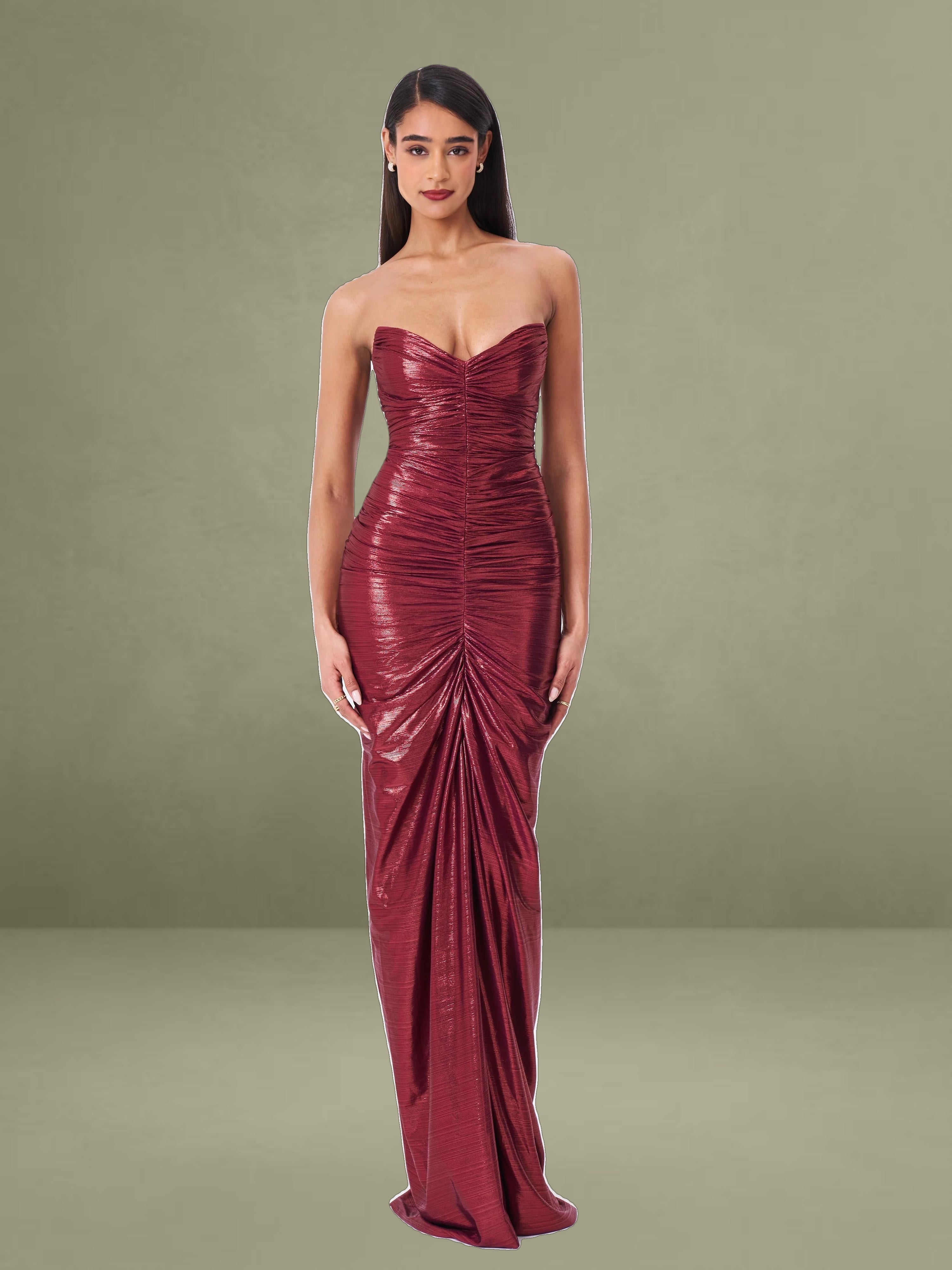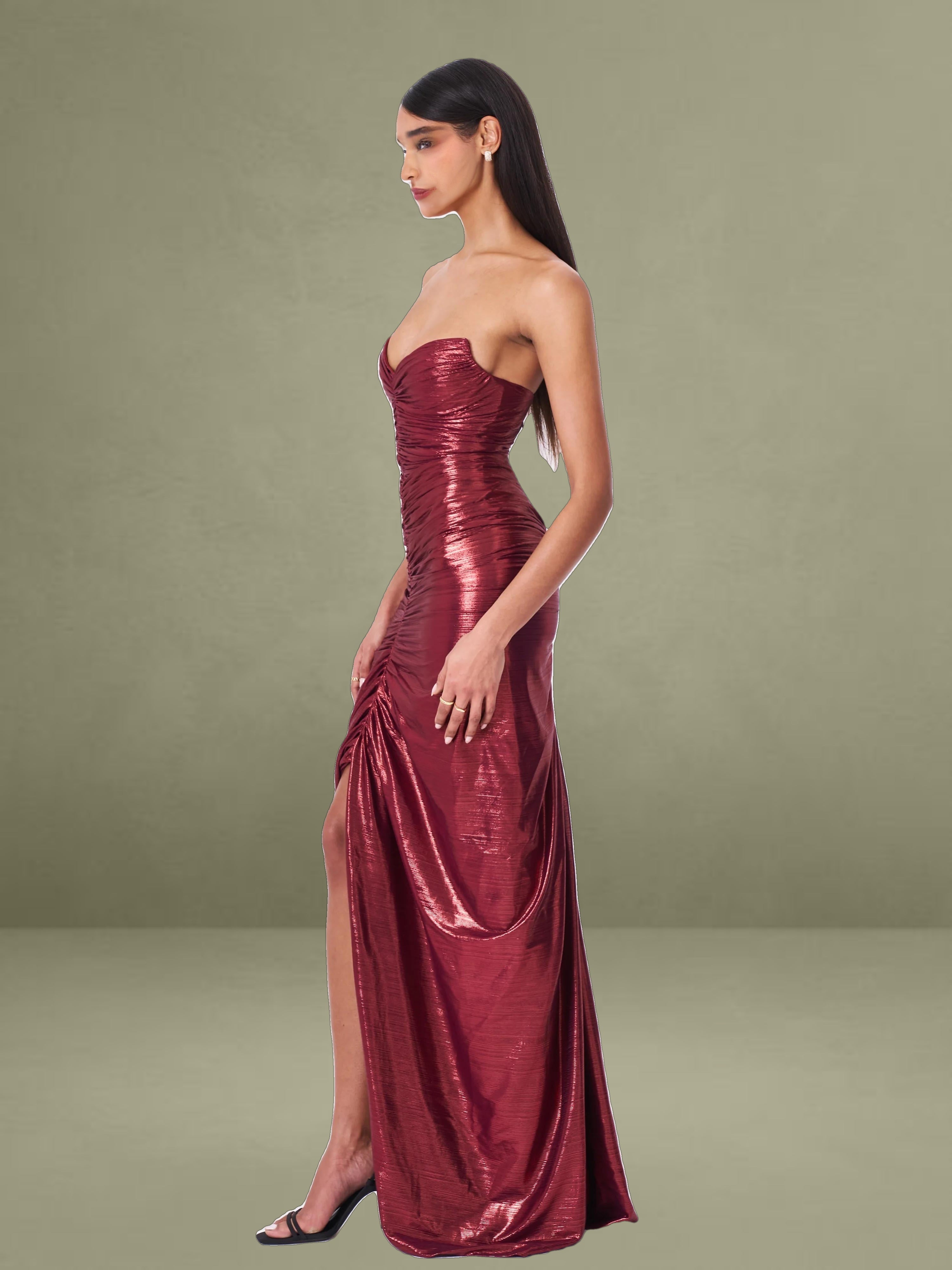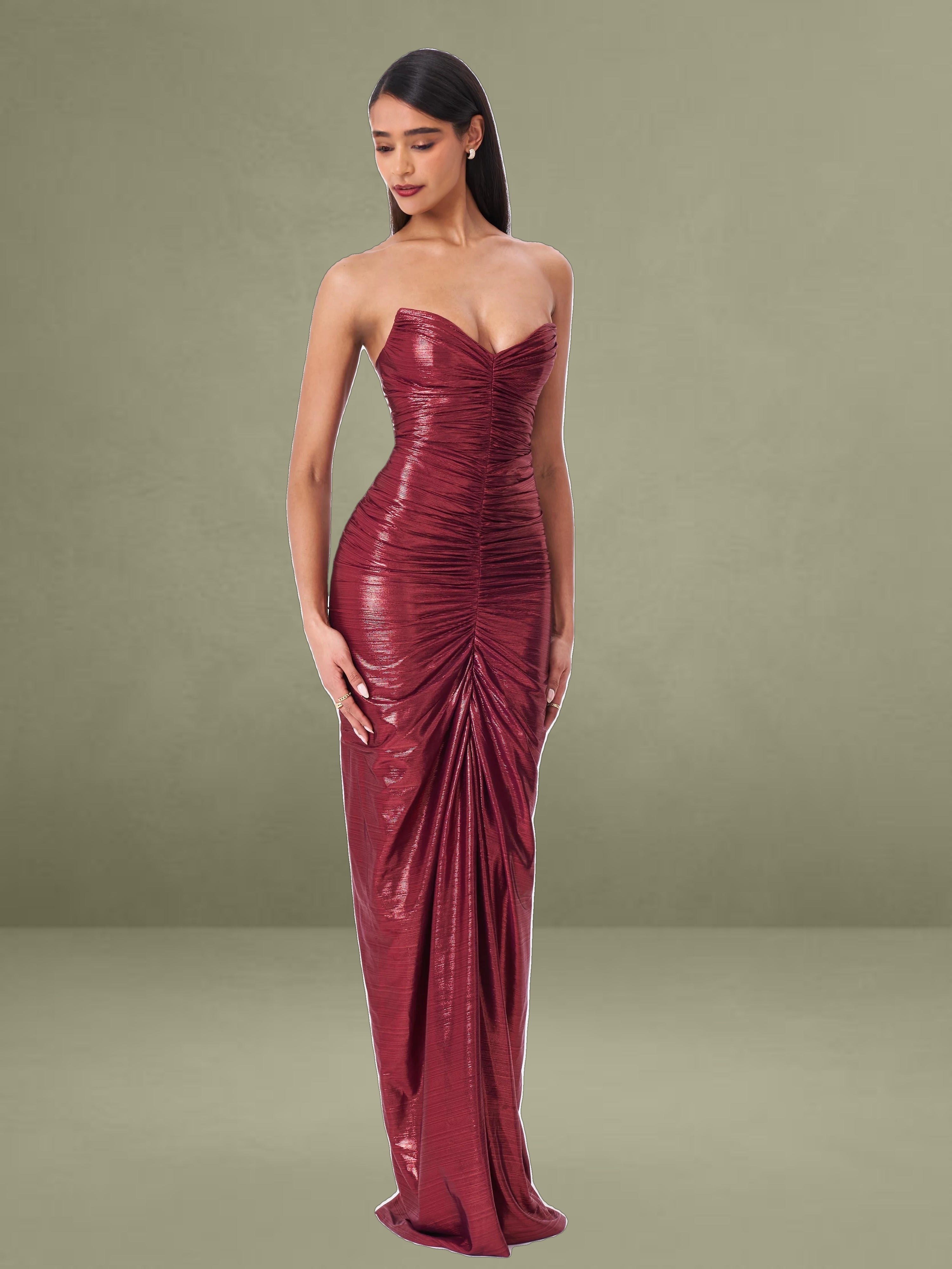 Exude sophistication and glamour with the Sable Gown, a show-stopping masterpiece in rich burgundy glitter fabric. This stunning design features a graceful sweetheart collar and elegant ruched detailing that accentuates your silhouette. The mermaid silhouette flows beautifully, with a dramatic middle front slit adding a sultry edge. Designed for secure wear, the gown includes non-slip straps, while an invisible zipper ensures a flawless fit. Fully lined for comfort, the Sable Gown is the epitome of elegance, perfect for making a dazzling entrance at any formal event.