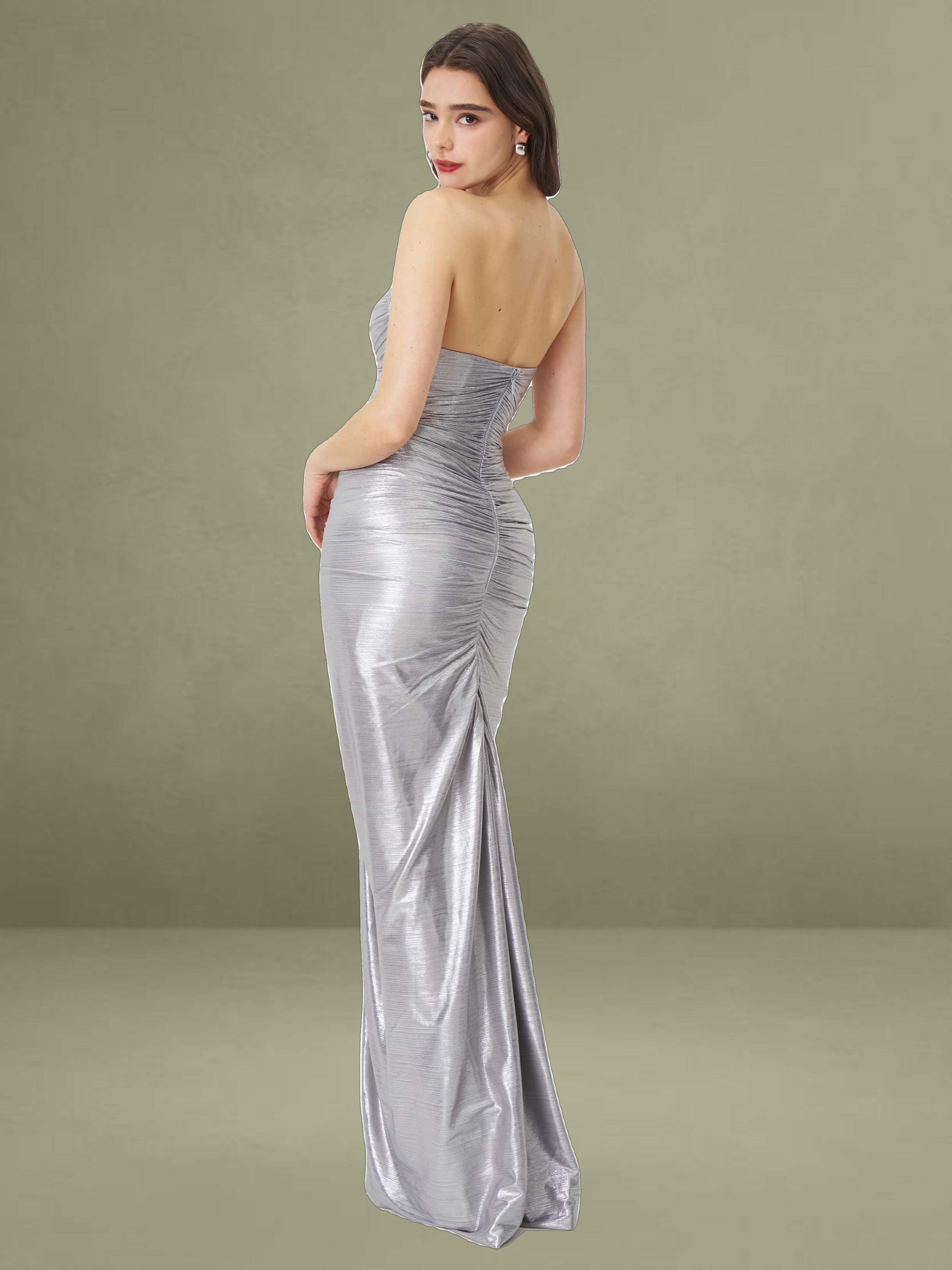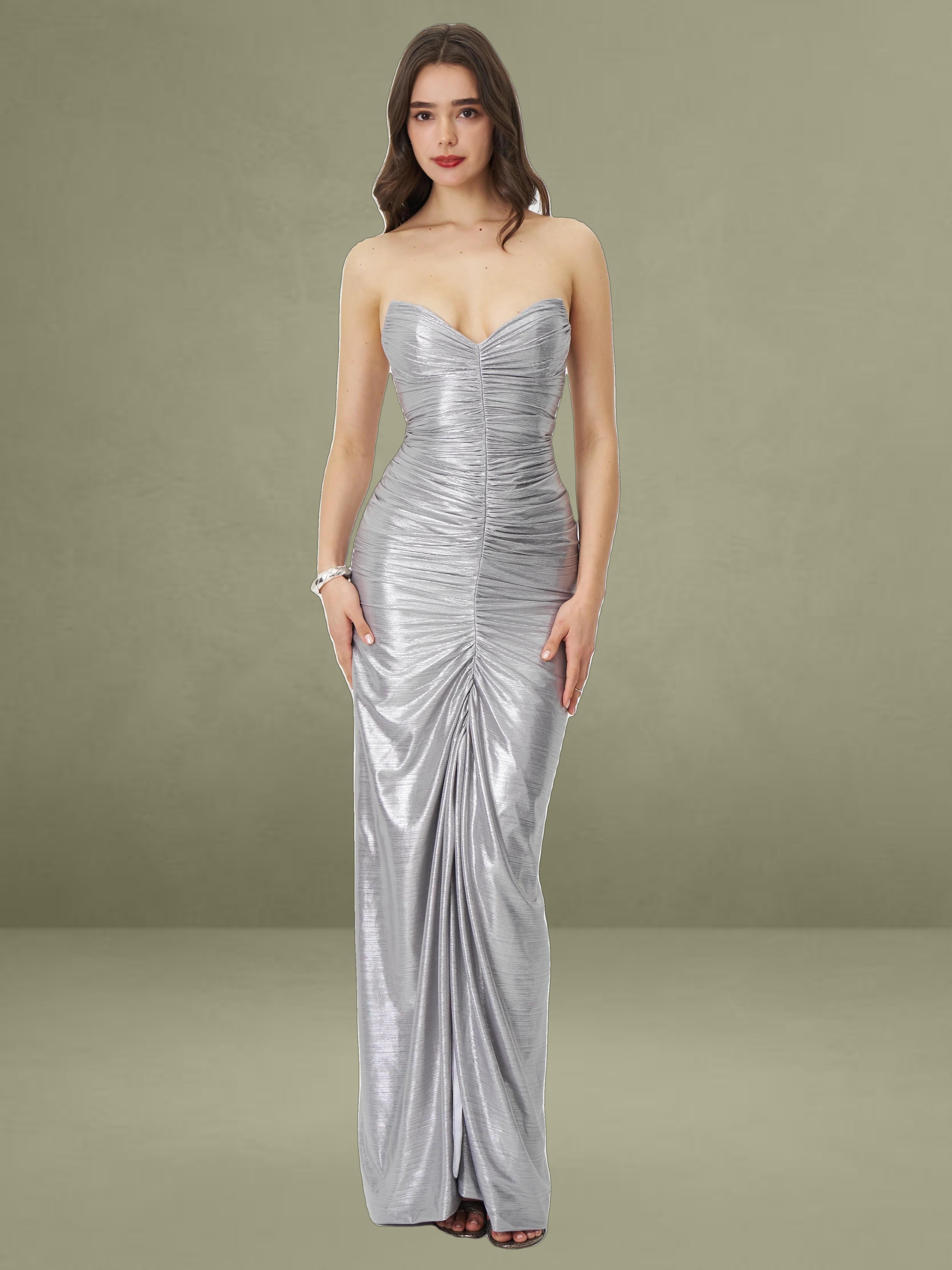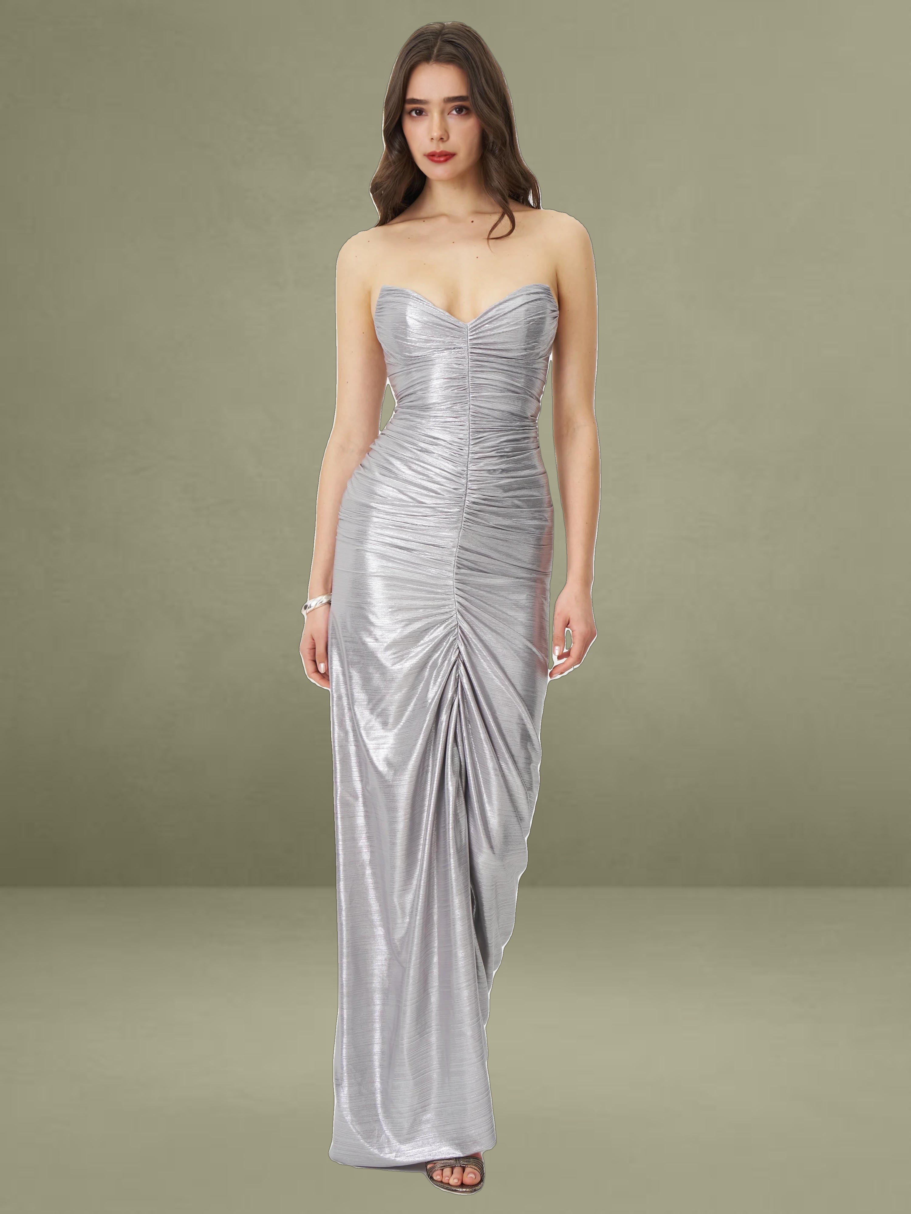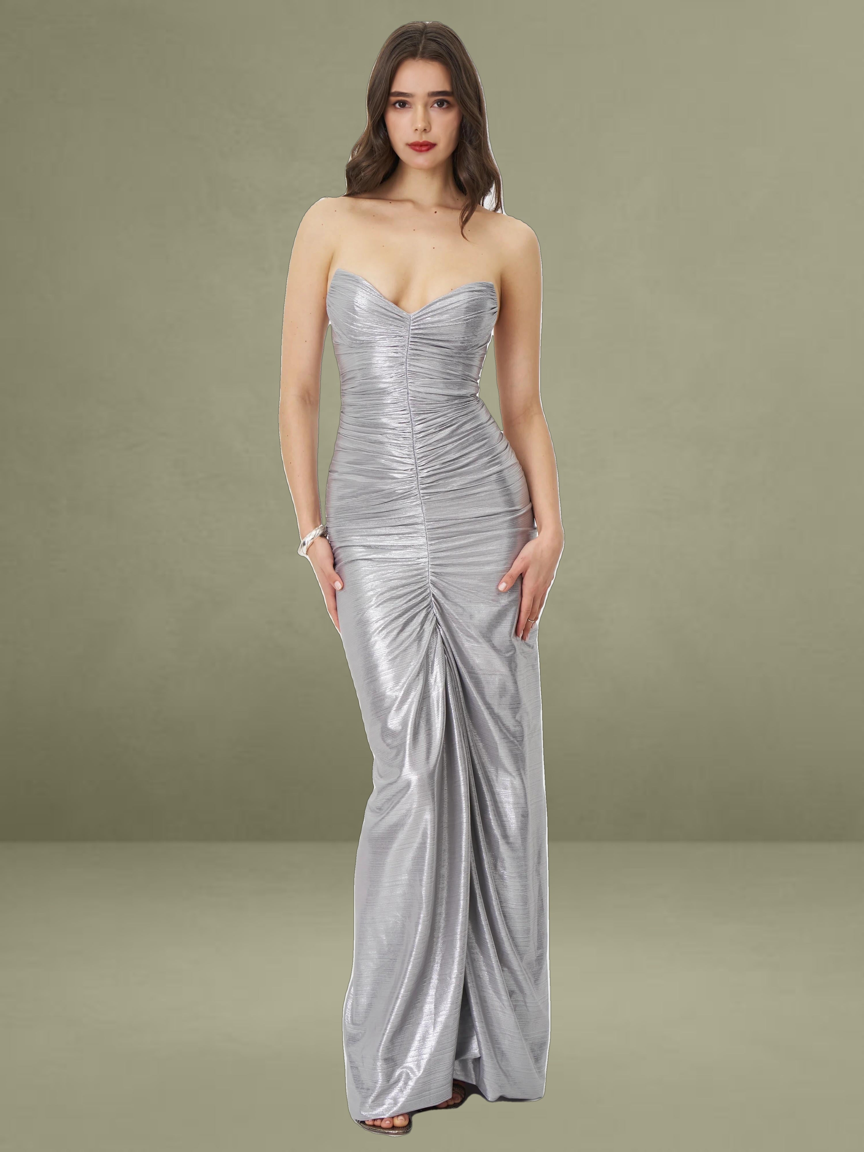 Exude sophistication and glamour with the Sable Gown, a show-stopping masterpiece in rich silver glitter fabric. This stunning design features a graceful sweetheart collar and elegant ruched detailing that accentuates your silhouette. The mermaid silhouette flows beautifully, with a dramatic middle front slit adding a sultry edge. Designed for secure wear, the gown includes non-slip straps, while an invisible zipper ensures a flawless fit. Fully lined for comfort, the Sable Gown is the epitome of elegance, perfect for making a dazzling entrance at any formal event. And it is also available in Burgundy.