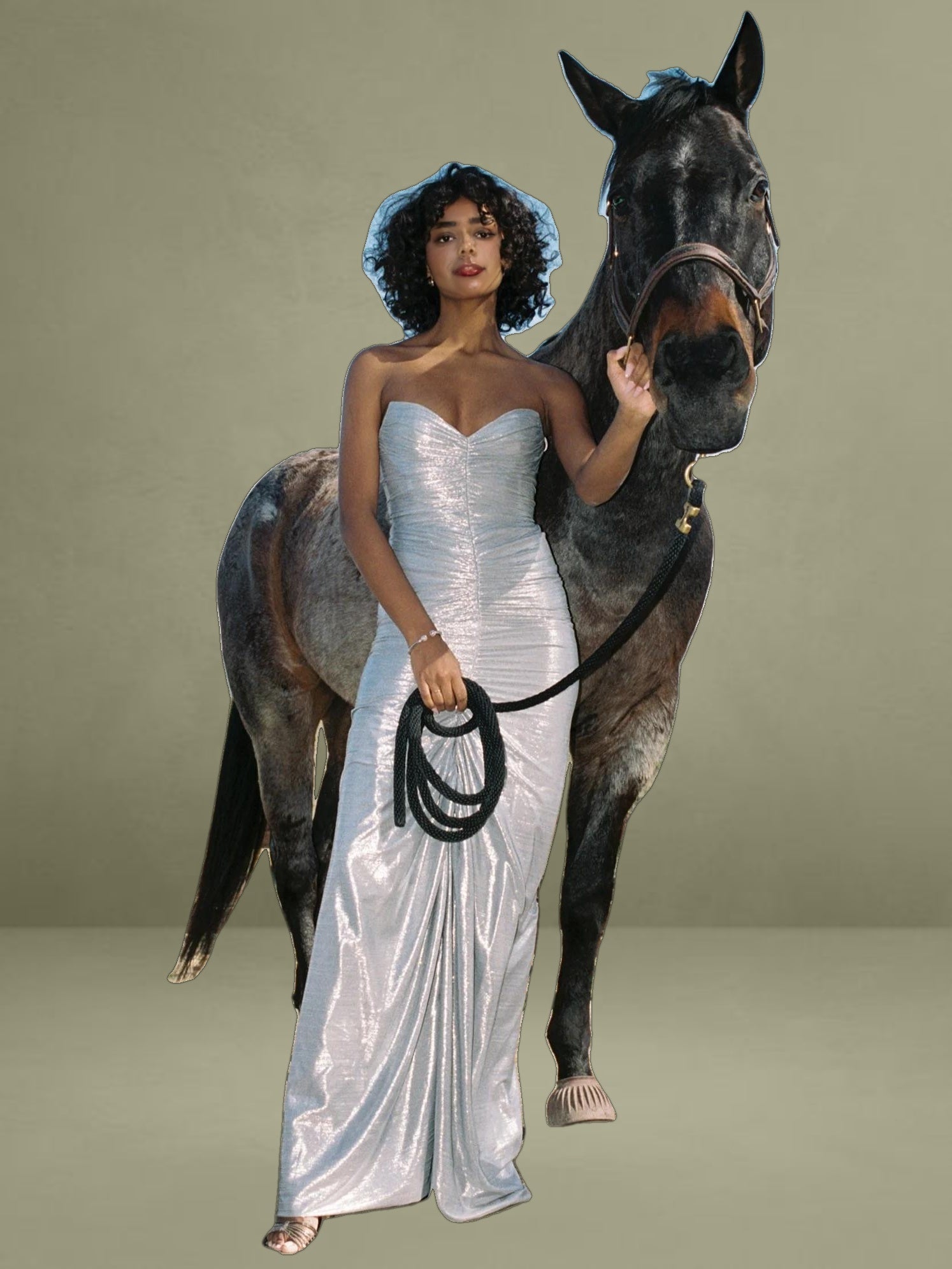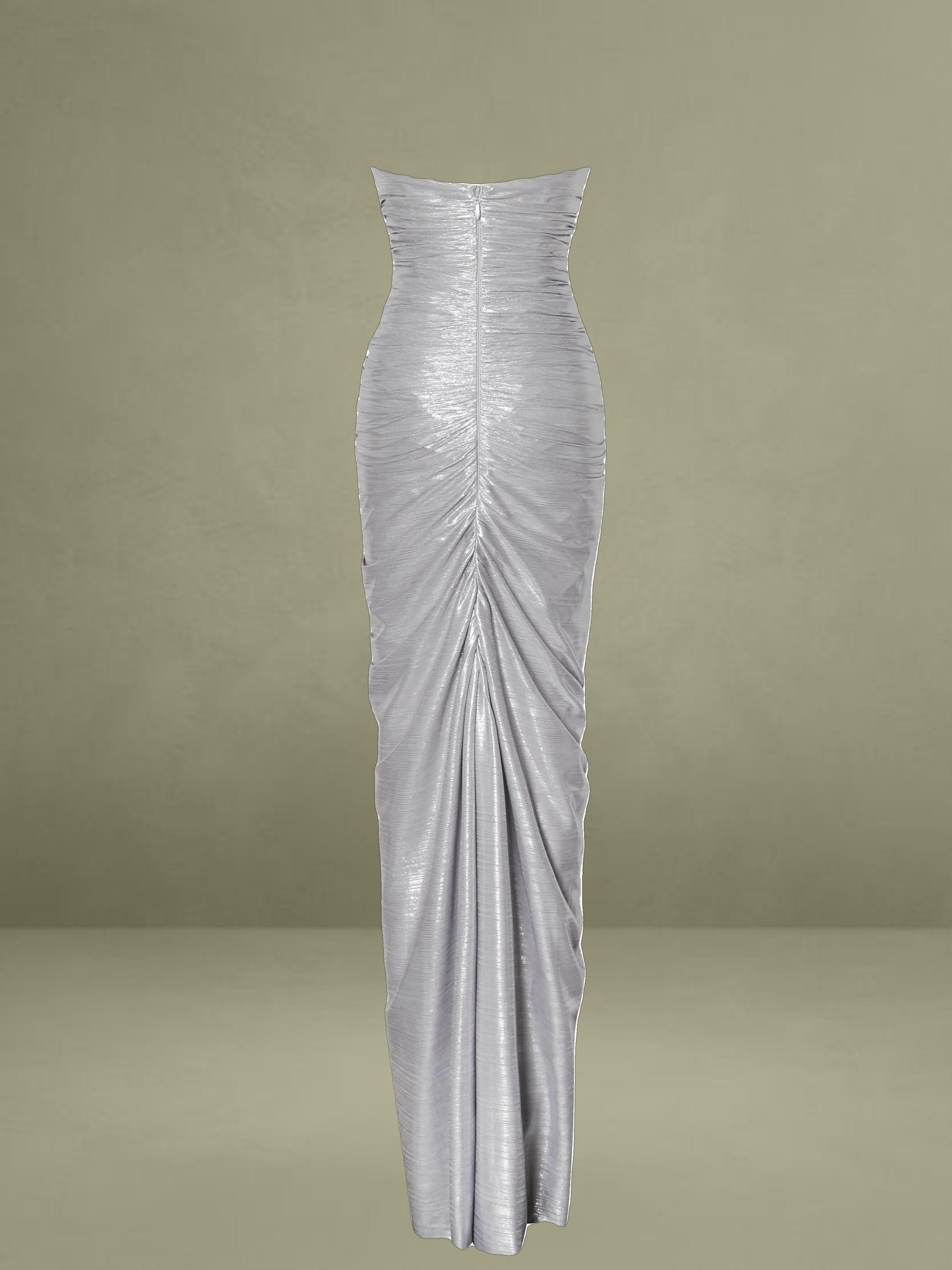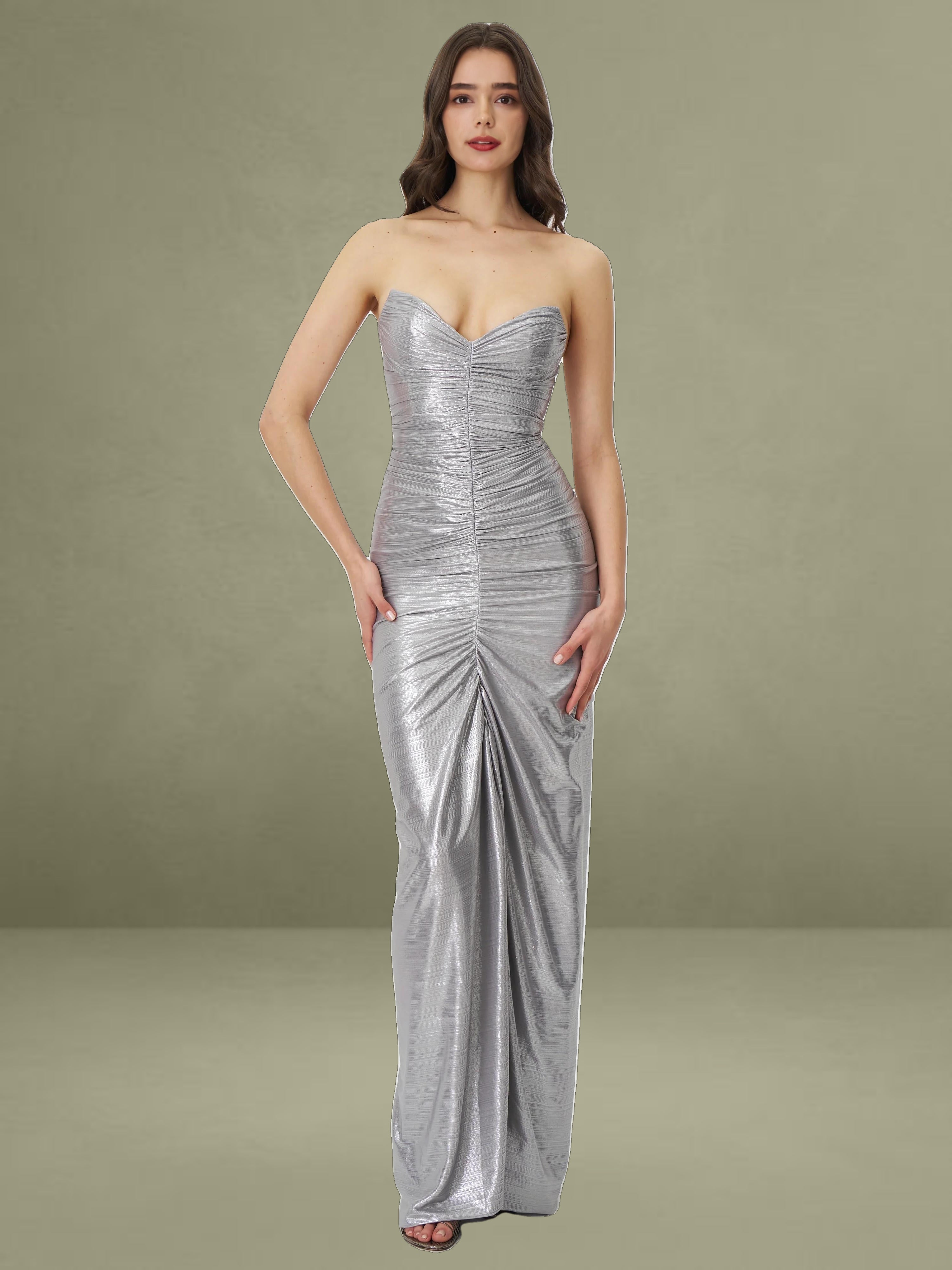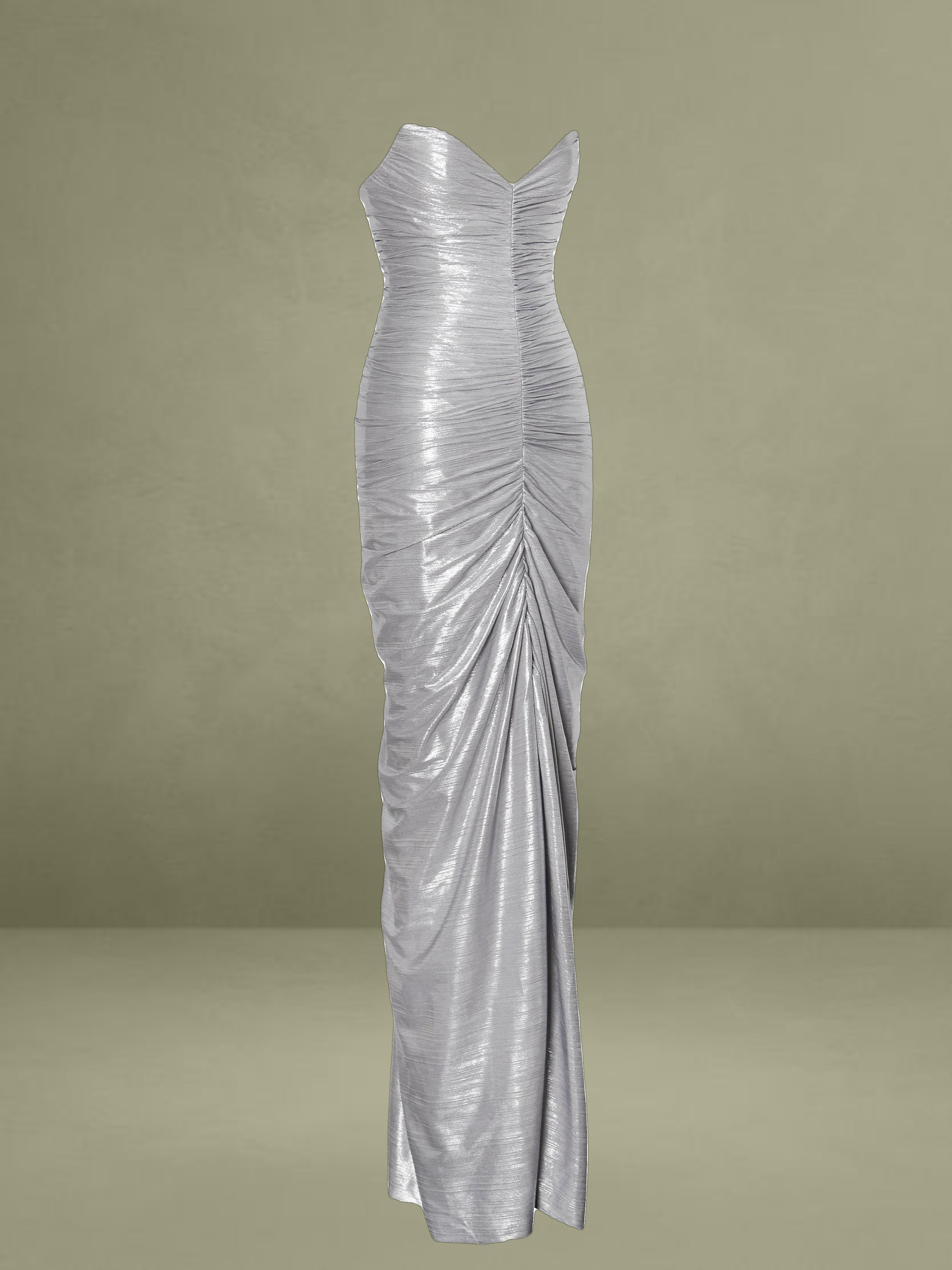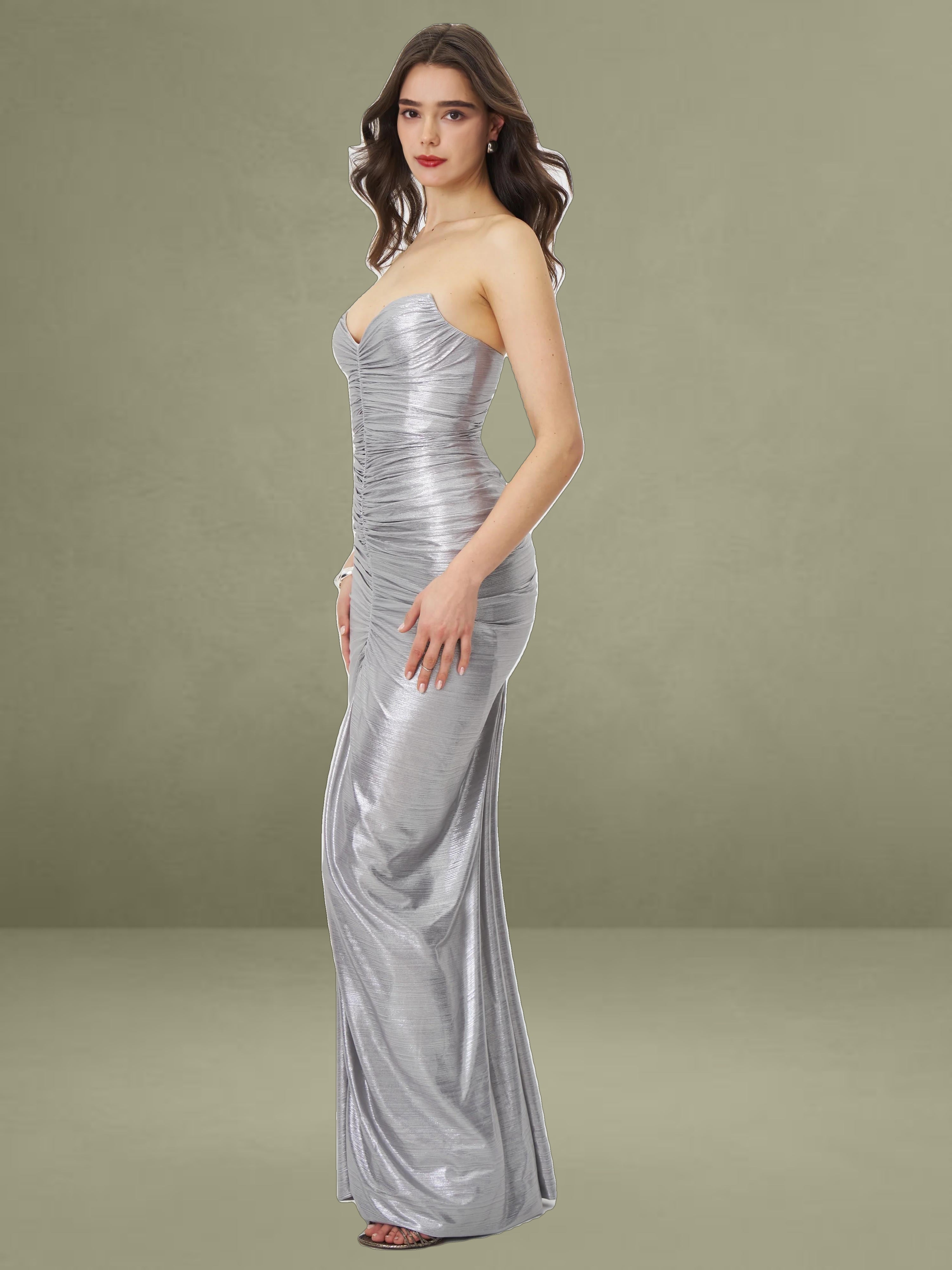 Exude sophistication and glamour with the Sable Gown, a show-stopping masterpiece in rich silver glitter fabric. This stunning design features a graceful sweetheart collar and elegant ruched detailing that accentuates your silhouette. The mermaid silhouette flows beautifully, with a dramatic middle front slit adding a sultry edge. Designed for secure wear, the gown includes non-slip straps, while an invisible zipper ensures a flawless fit. Fully lined for comfort, the Sable Gown is the epitome of elegance, perfect for making a dazzling entrance at any formal event. And it is also available in Burgundy.