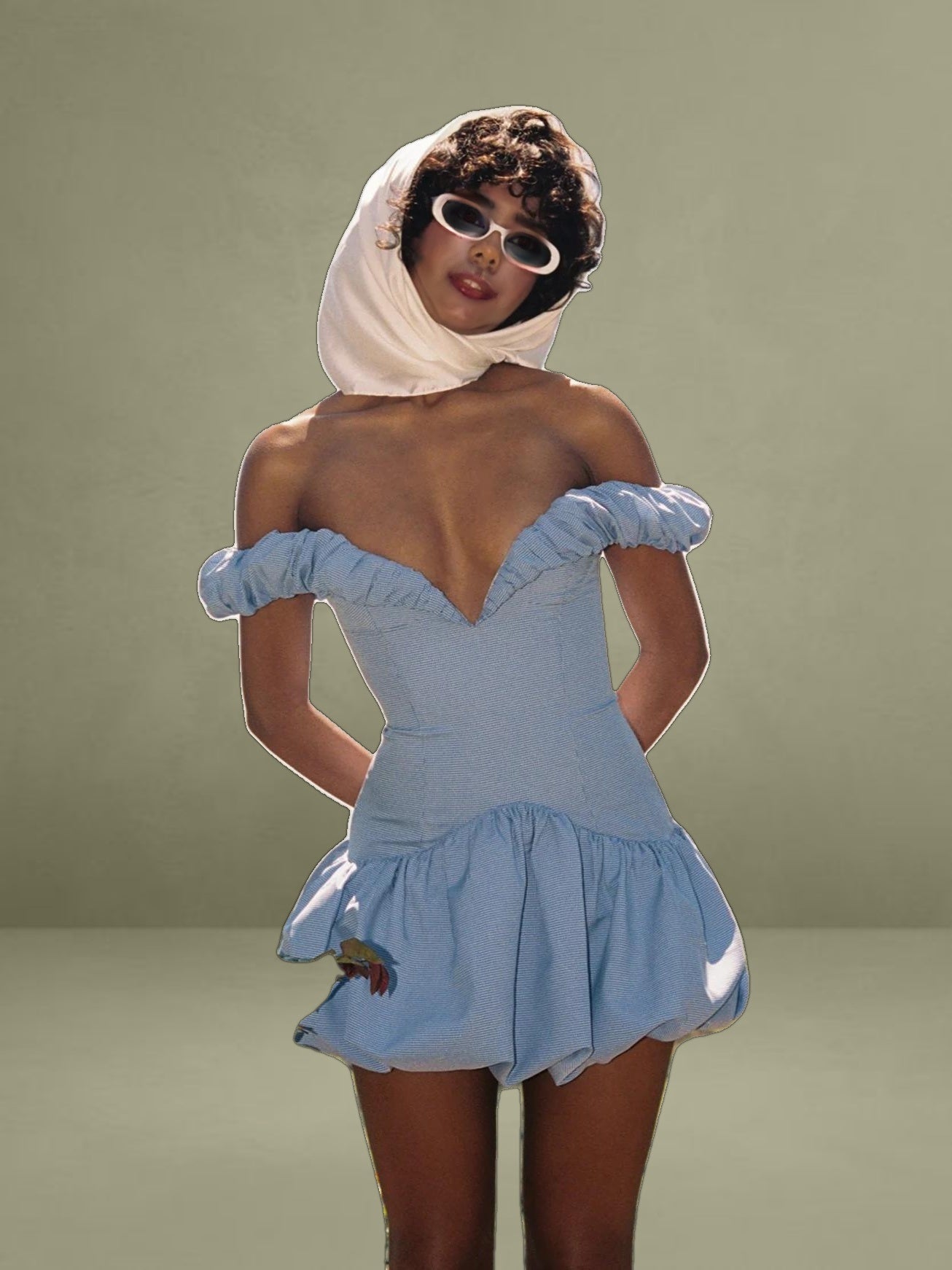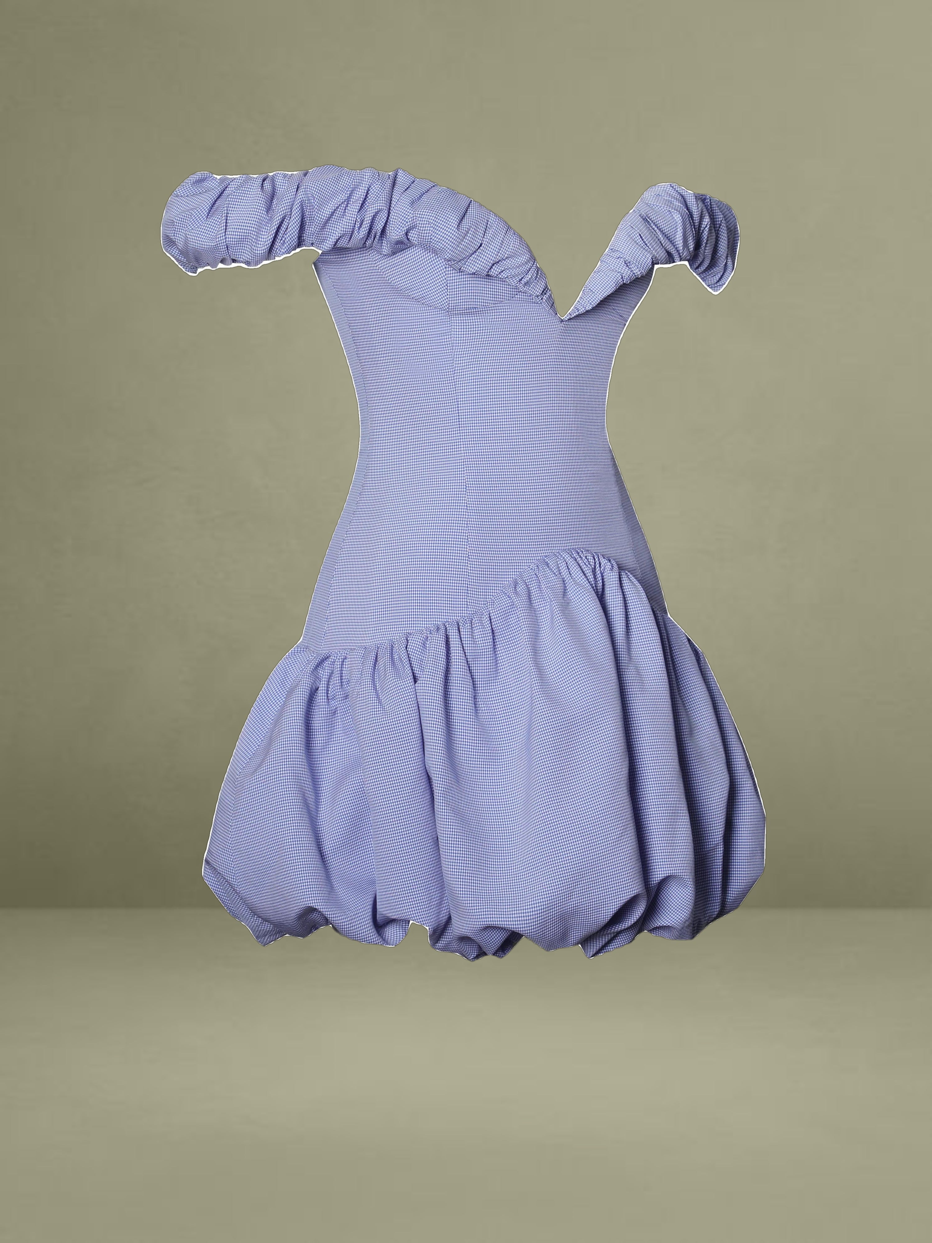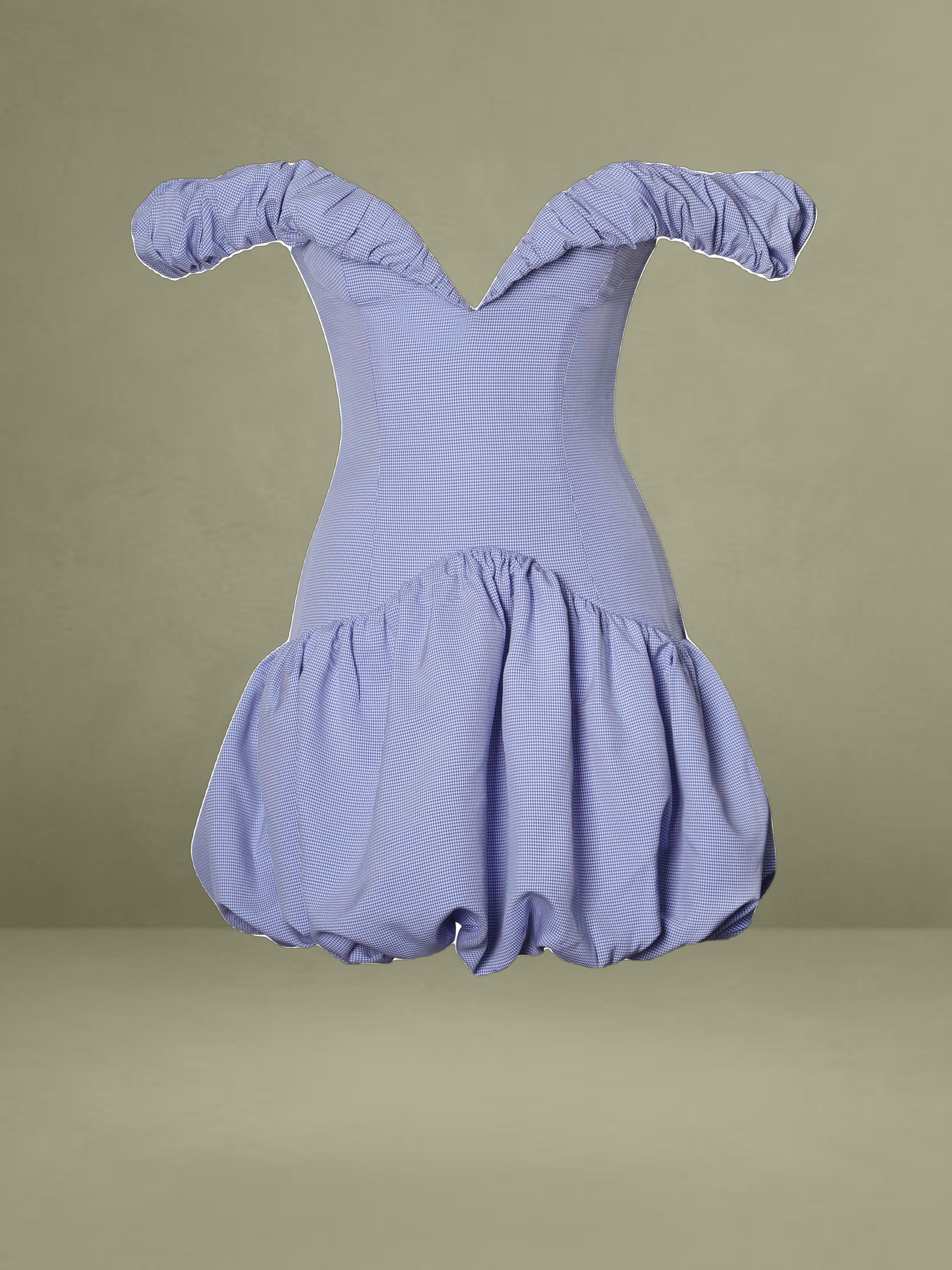 Playful charm meets structured elegance in the Sablee Dress. Featuring a timeless checkered pattern, this statement piece is designed with a voluminous bubble off-shoulder trim and a flattering V-shaped neckline. The drop waist leads into a dramatic bubble hem, giving the silhouette a modern, sculptural twist. Built-in bones and padded cups provide support and shape, while the fully lined interior and invisible zipper ensure a seamless fit. Equal parts flirty and refined, the Sablee Dress is perfect for special occasions or anytime you want to turn heads with style.