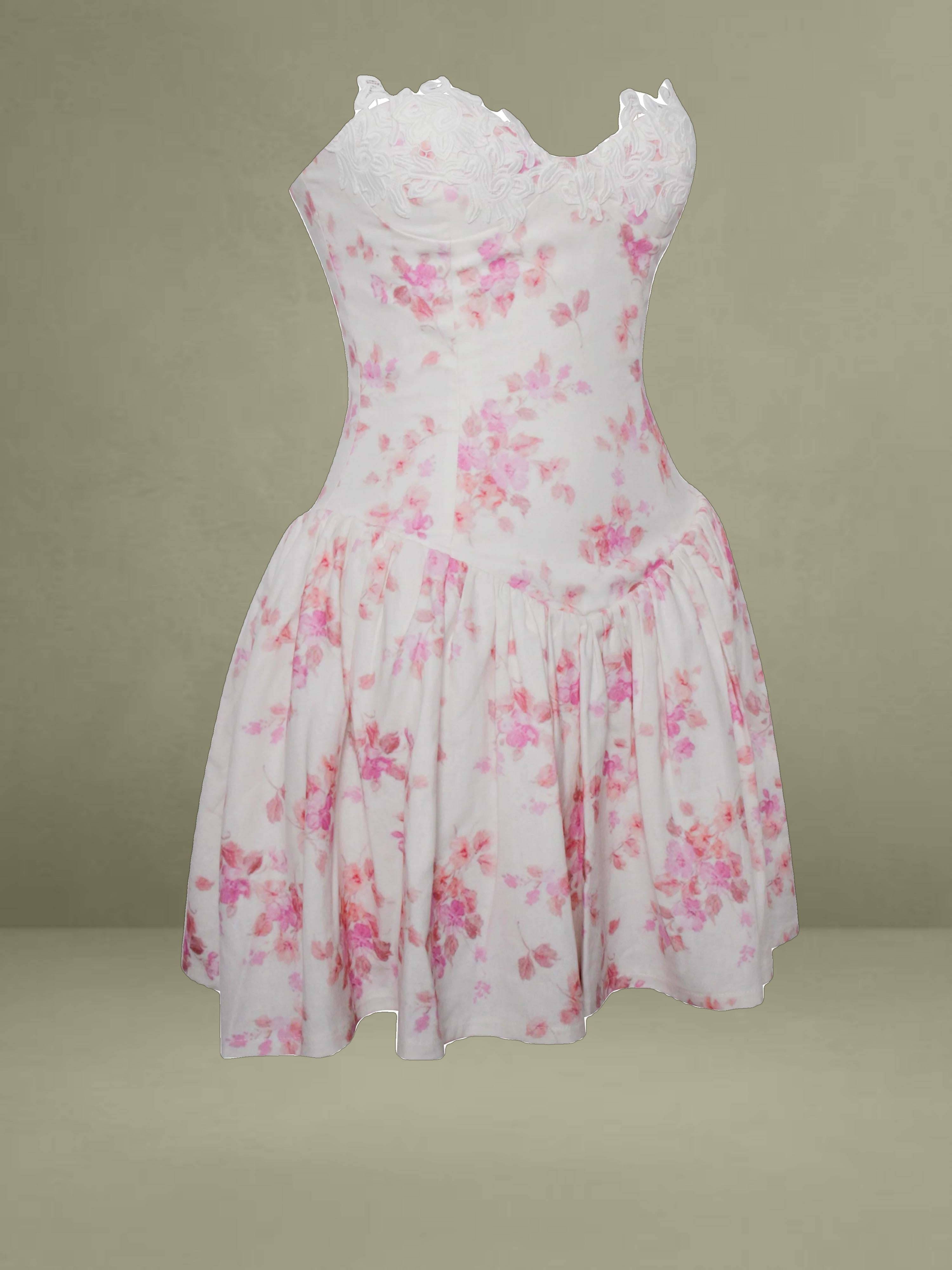 Introducing our Samara dress, a fusion of contemporary allure and classic elegance. Adorned in a captivating print eco-luxe fabric, it exudes vibrancy and charm. The padded cups ensure a flattering silhouette, while the V-shape drop waist adds modern sophistication. Delicate lace decorations embellish the design, infusing it with timeless grace. Fully lined and equipped with built-in bones, this dress offers both comfort and structure for a polished look. Slip into effortless elegance with the discreet invisible zipper at the middle back, ensuring a seamless and refined finish that captivates at every turn.