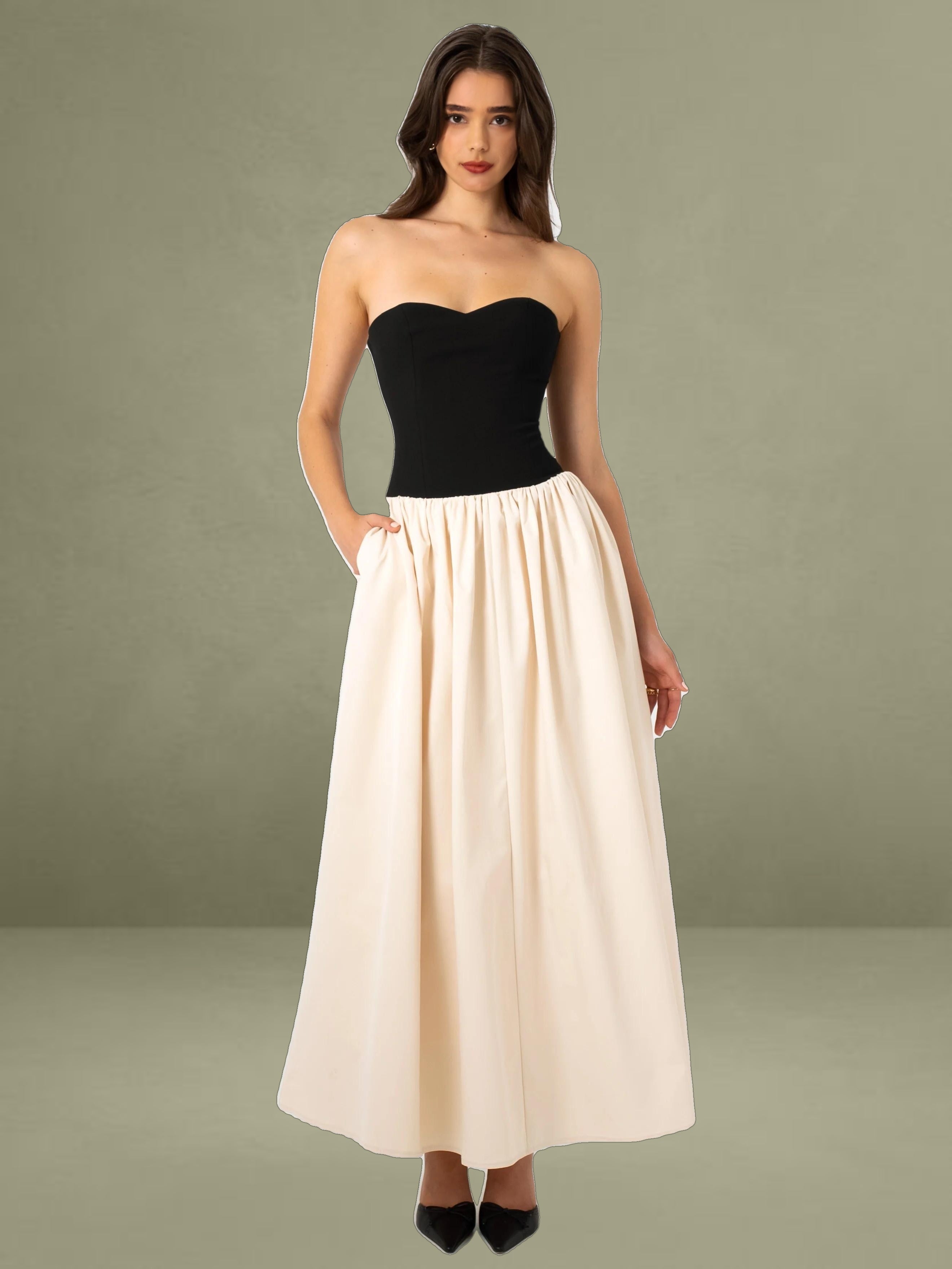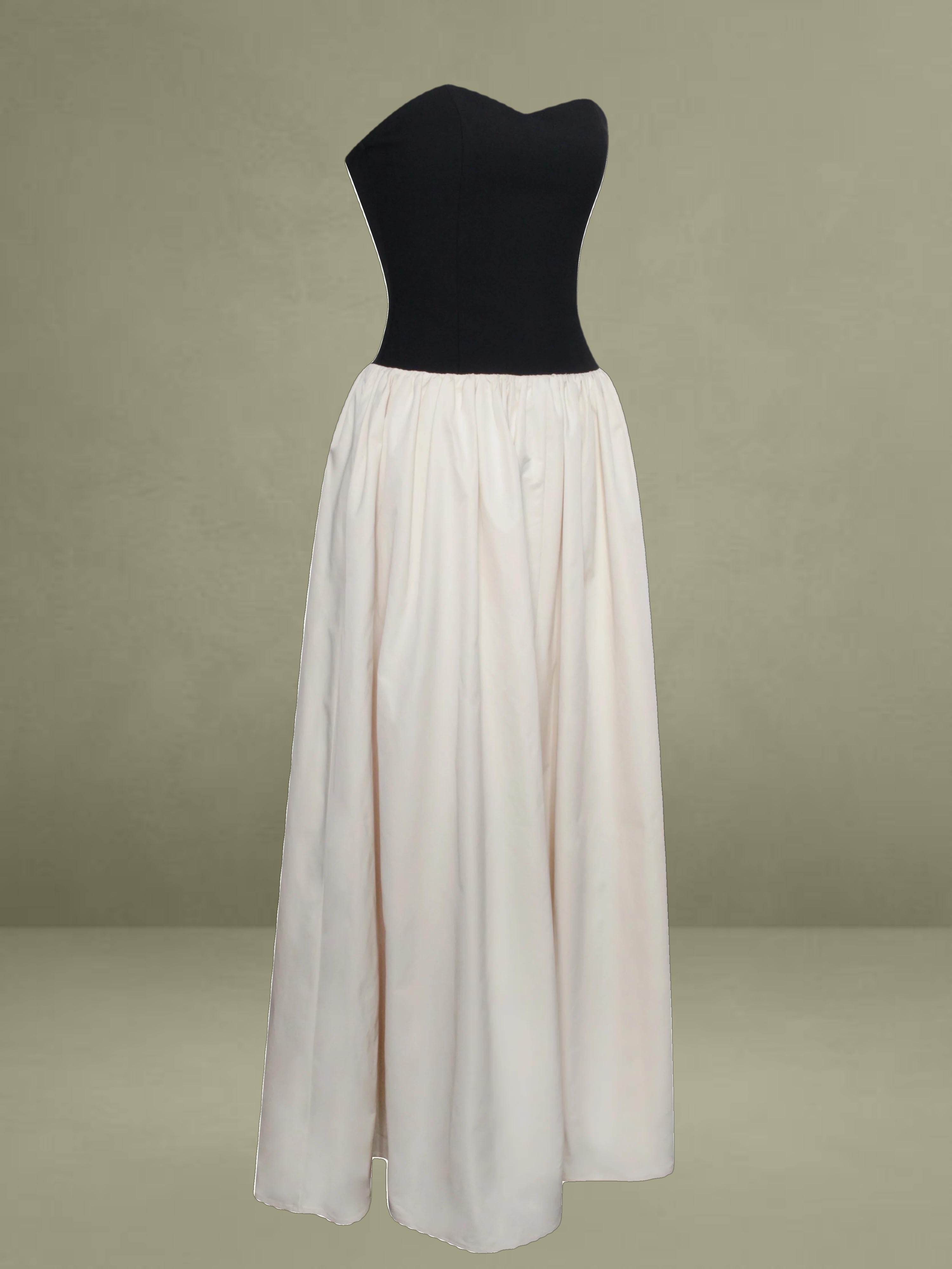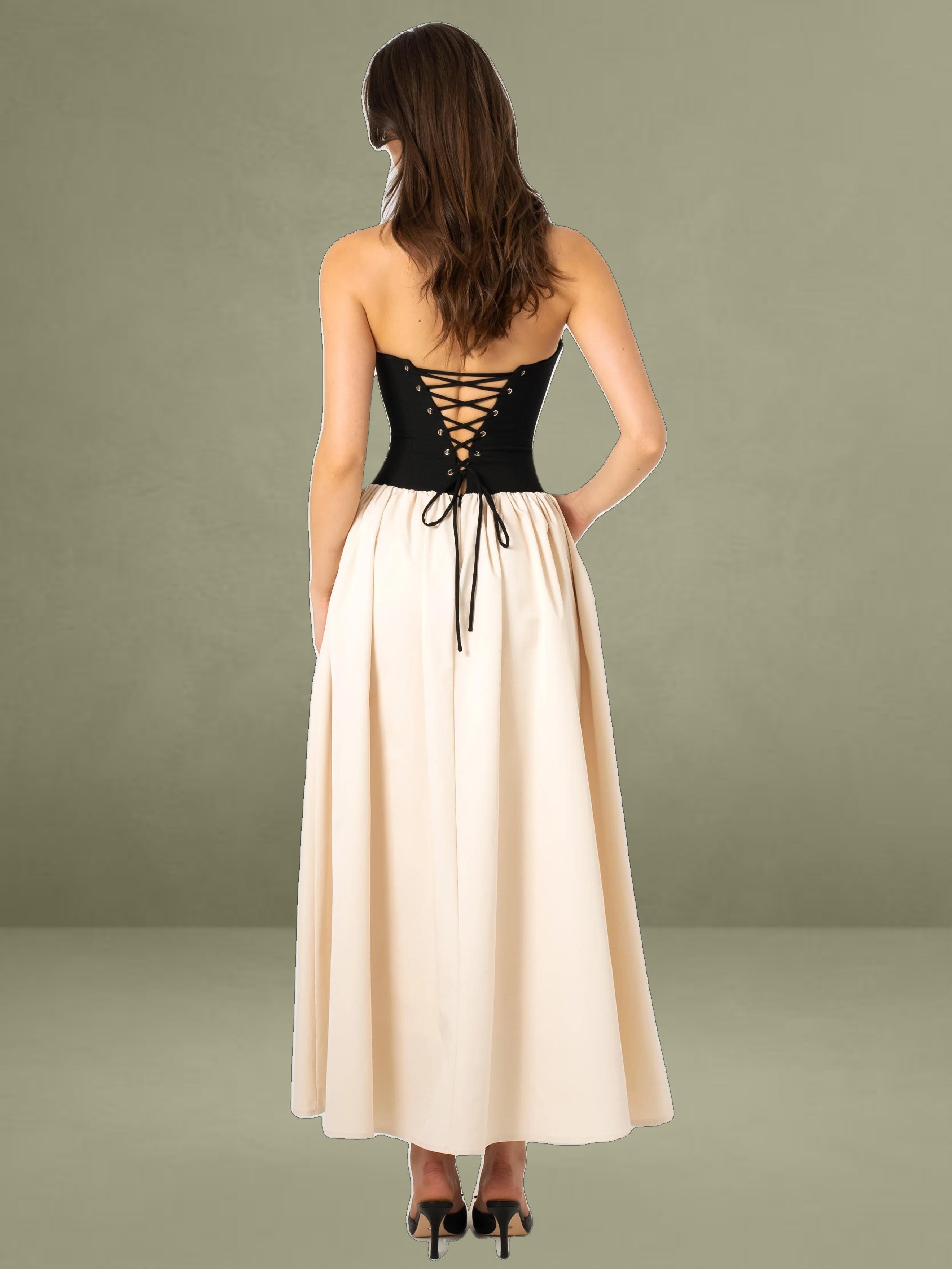 Introducing the Sana dress, a perfect blend of elegance and edge. Featuring a romantic sweetheart collar and a sleek sleeveless design, this dress combines classic charm with modern sophistication. The contrasting beige satin and black stretch crepe create a striking visual appeal. The lace-up back adds a touch of daring allure, while the inner support ensures a structured and flattering fit. A discreet invisible pocket adds practicality without compromising style. Ideal for any special occasion, this dress seamlessly merges refined details with contemporary flair.