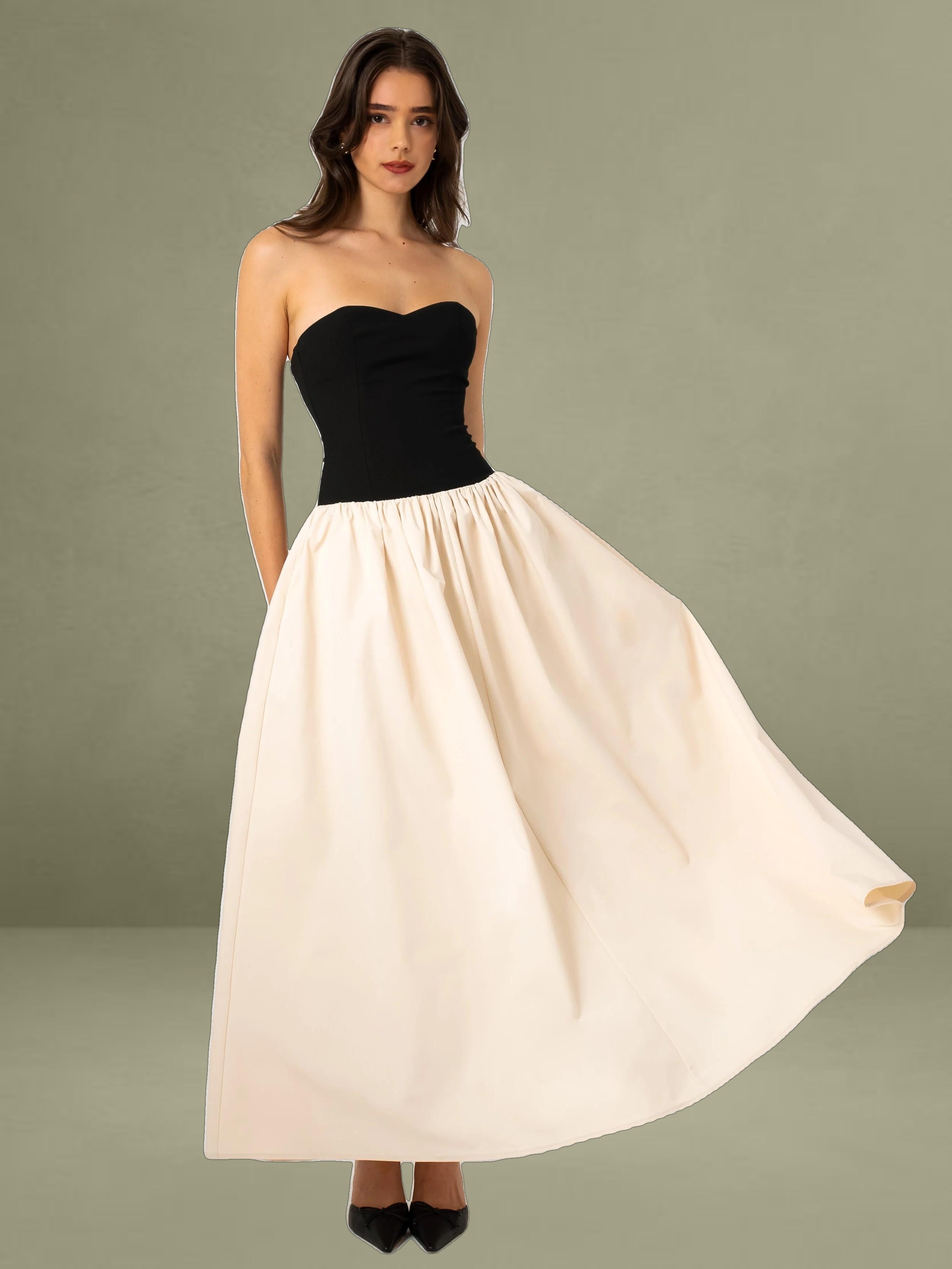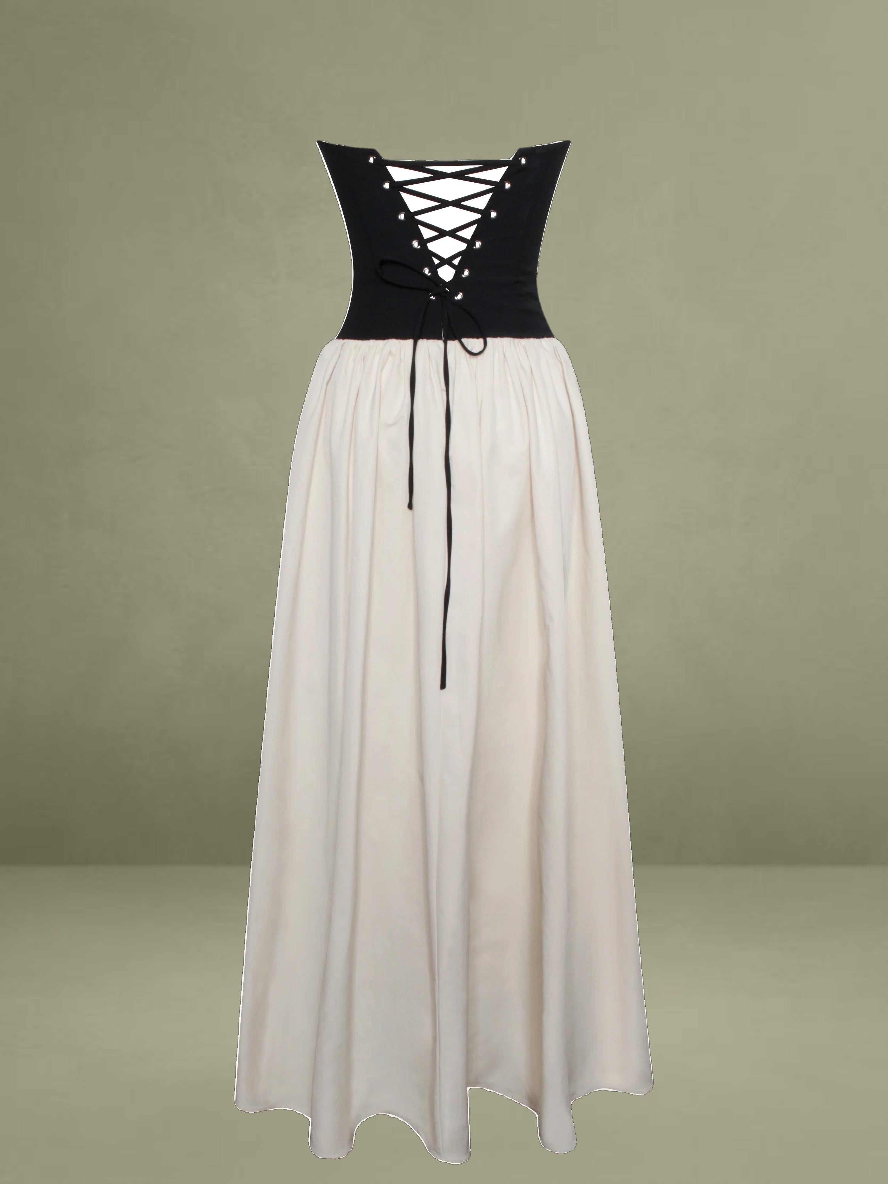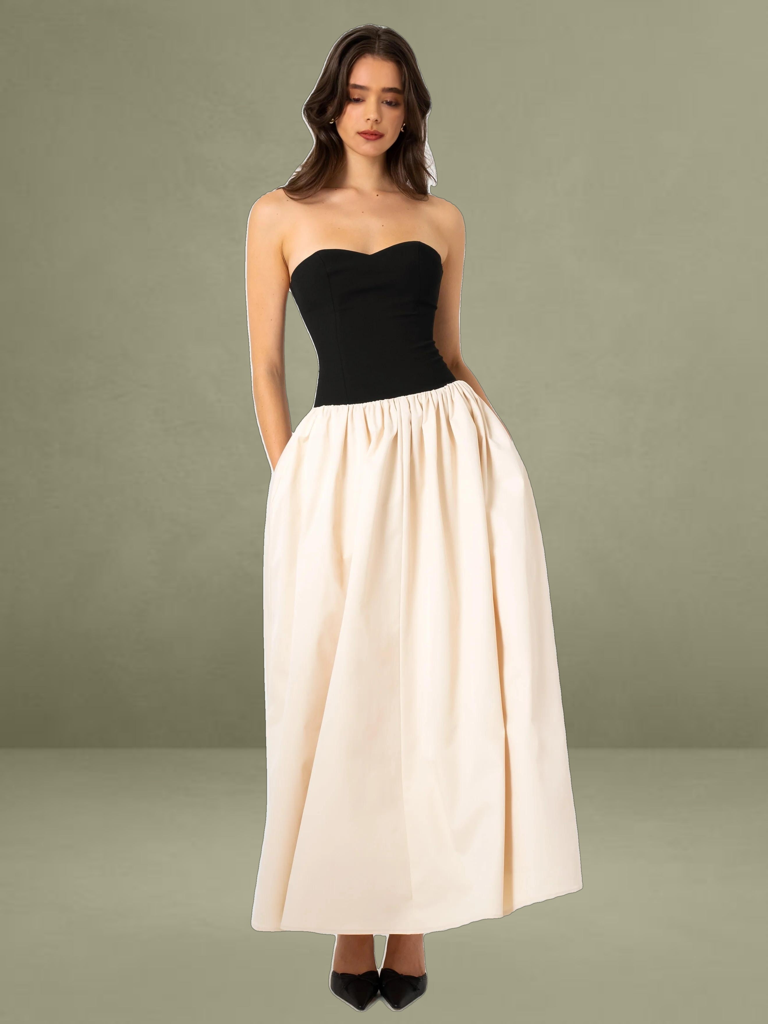 Introducing the Sana dress, a perfect blend of elegance and edge. Featuring a romantic sweetheart collar and a sleek sleeveless design, this dress combines classic charm with modern sophistication. The contrasting beige satin and black stretch crepe create a striking visual appeal. The lace-up back adds a touch of daring allure, while the inner support ensures a structured and flattering fit. A discreet invisible pocket adds practicality without compromising style. Ideal for any special occasion, this dress seamlessly merges refined details with contemporary flair.