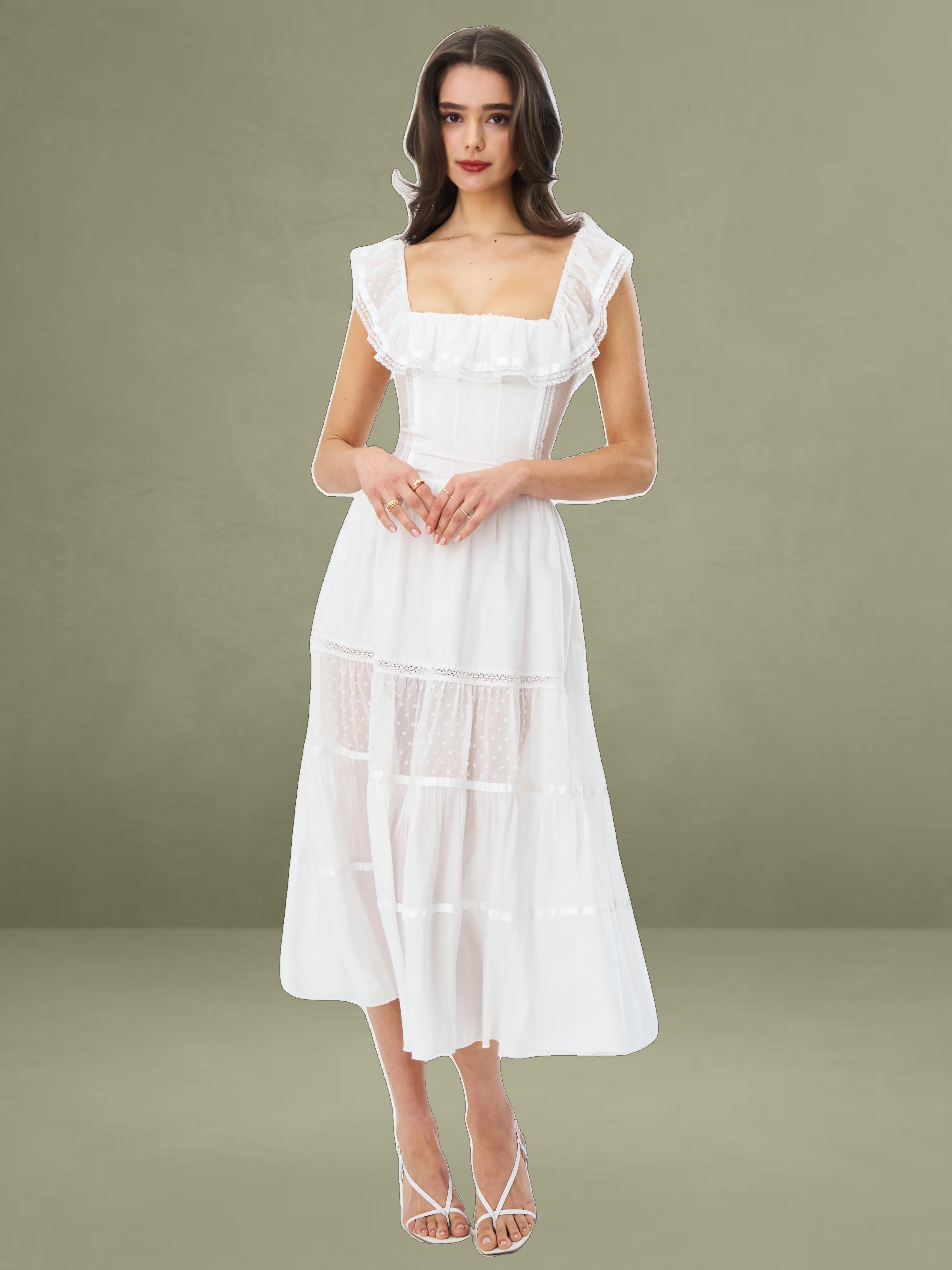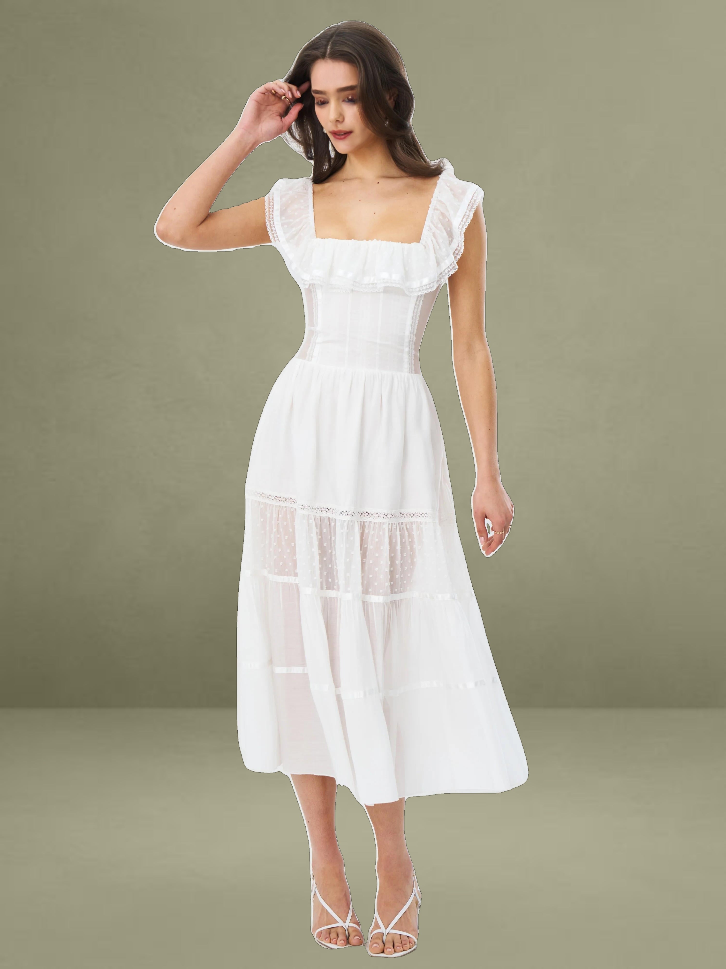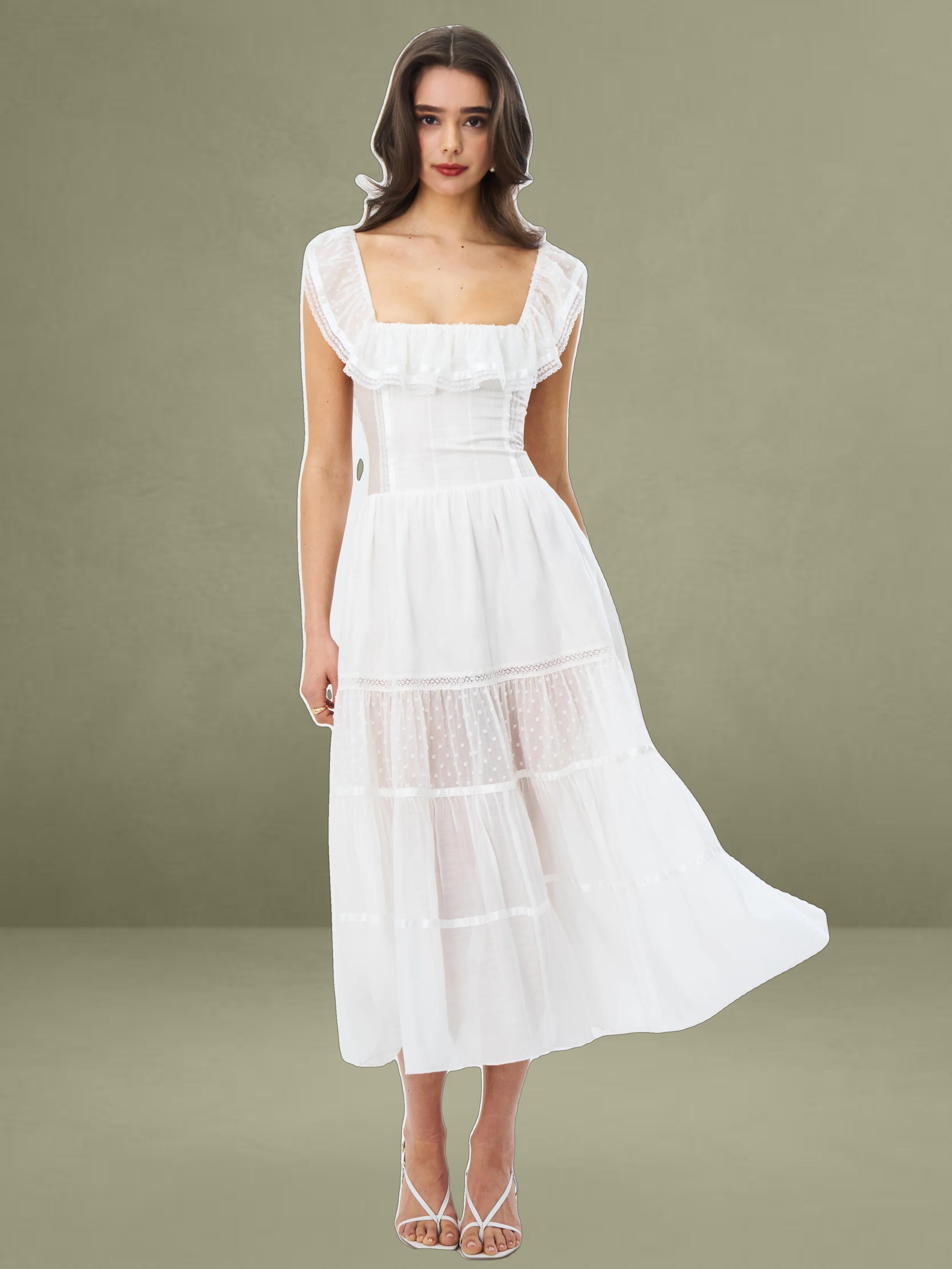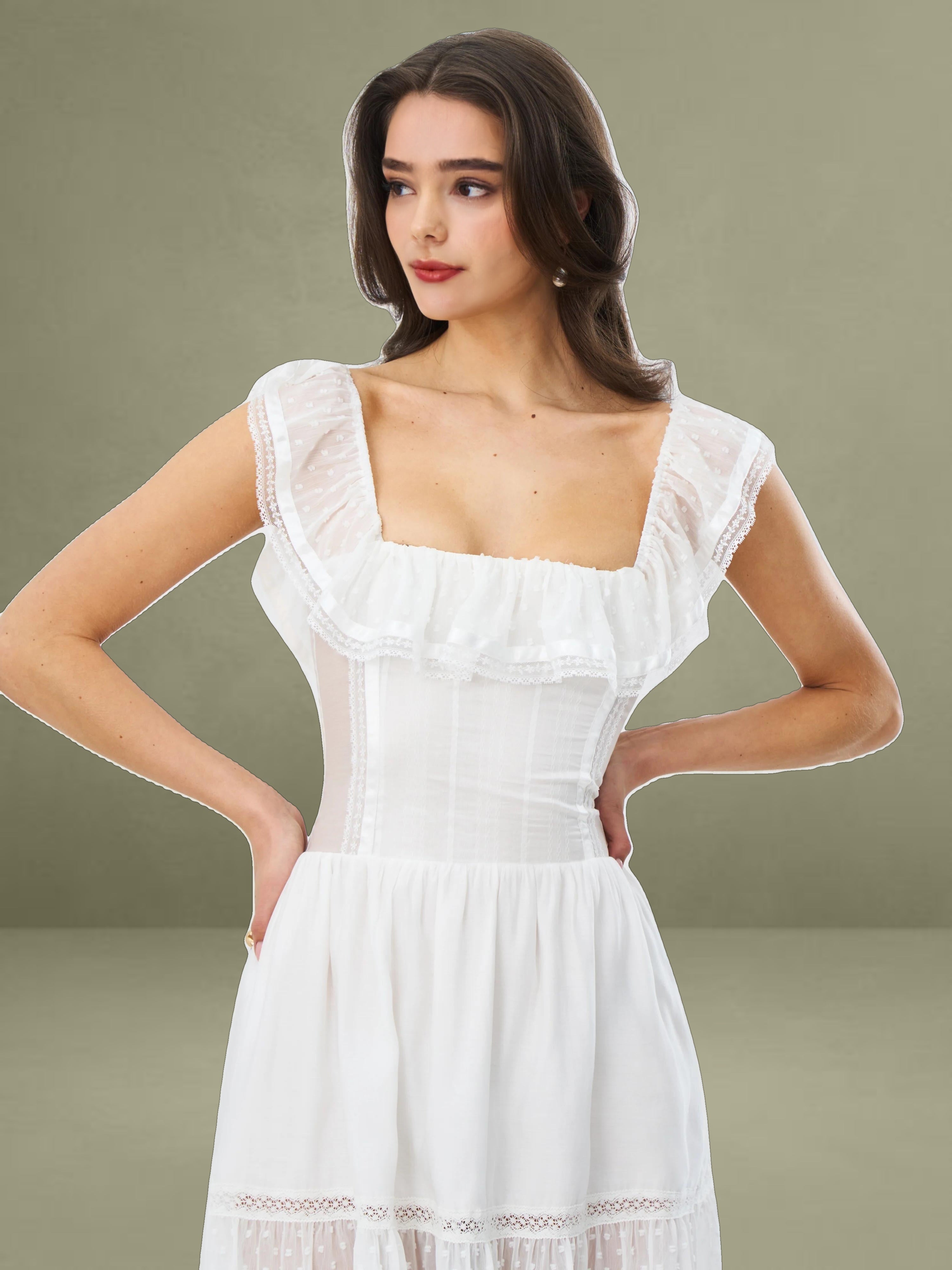Embrace classic elegance with this romantic white midi dress. It's made from delicate fabrics with dotted textures and lace trims. The square neckline has a charming ruffled edge, adding femininity to the structured top. With a well - fitting waist and a full, tiered skirt, it combines grace and comfort. Fully lined for easy wearing, it's perfect for picnics, garden parties, or warm - weather outings.