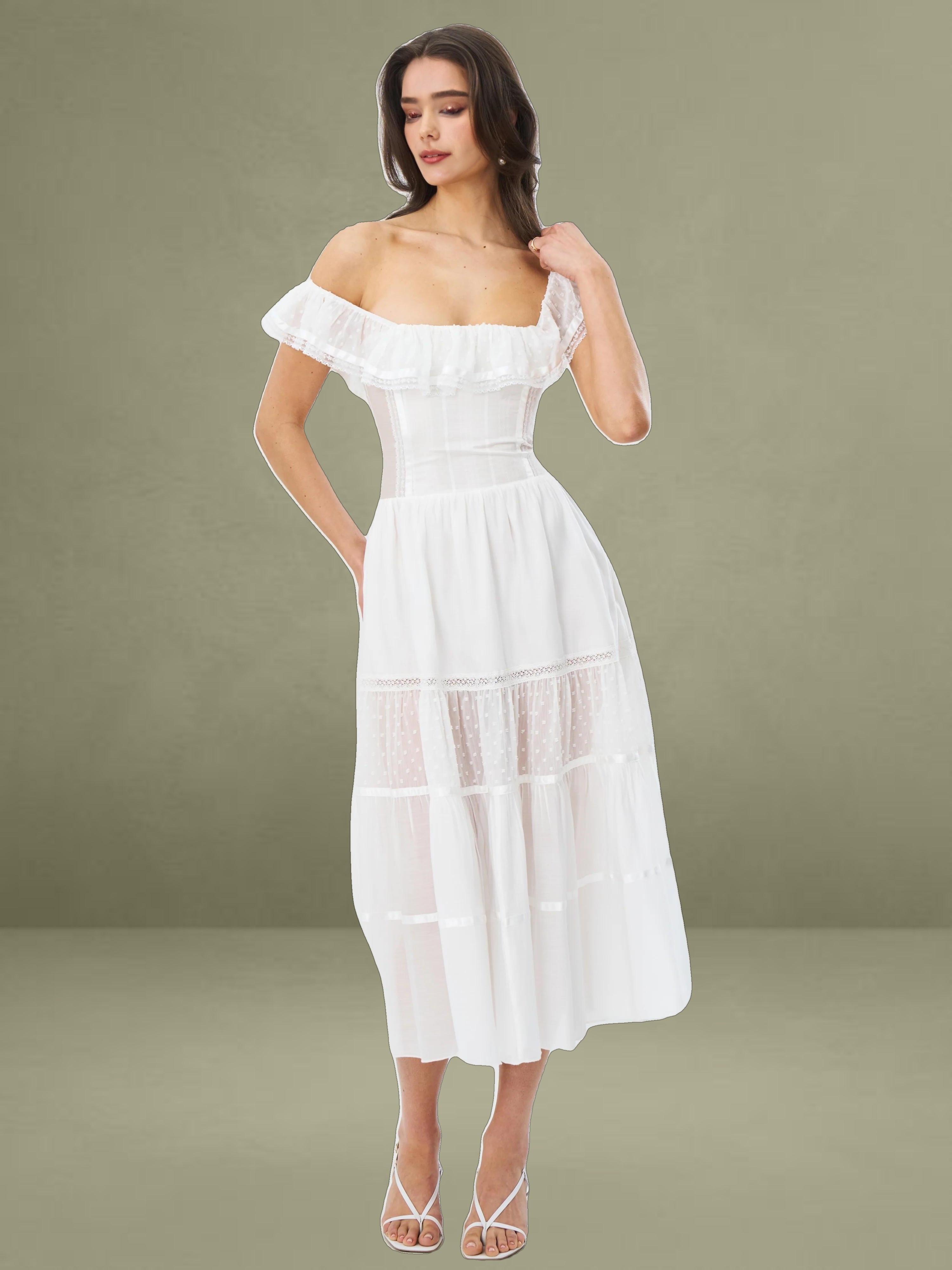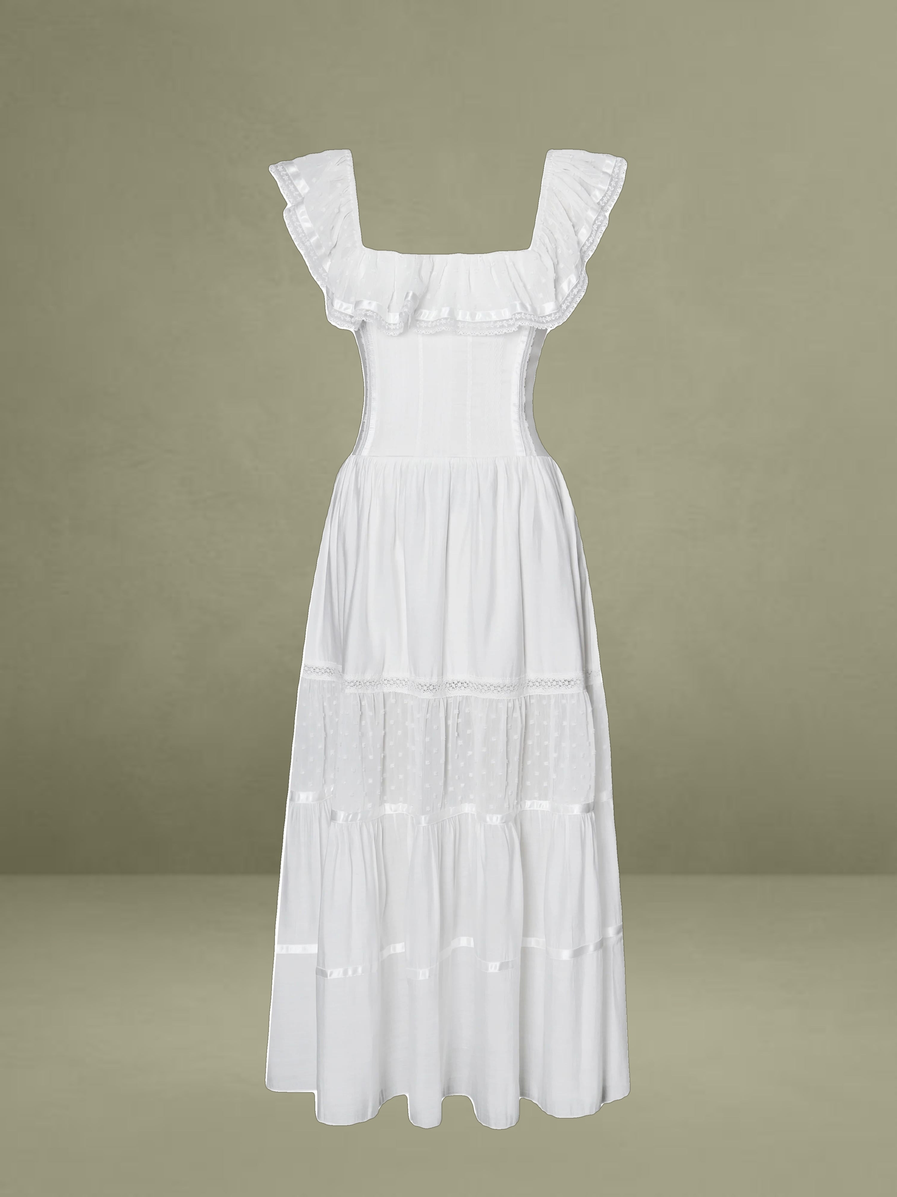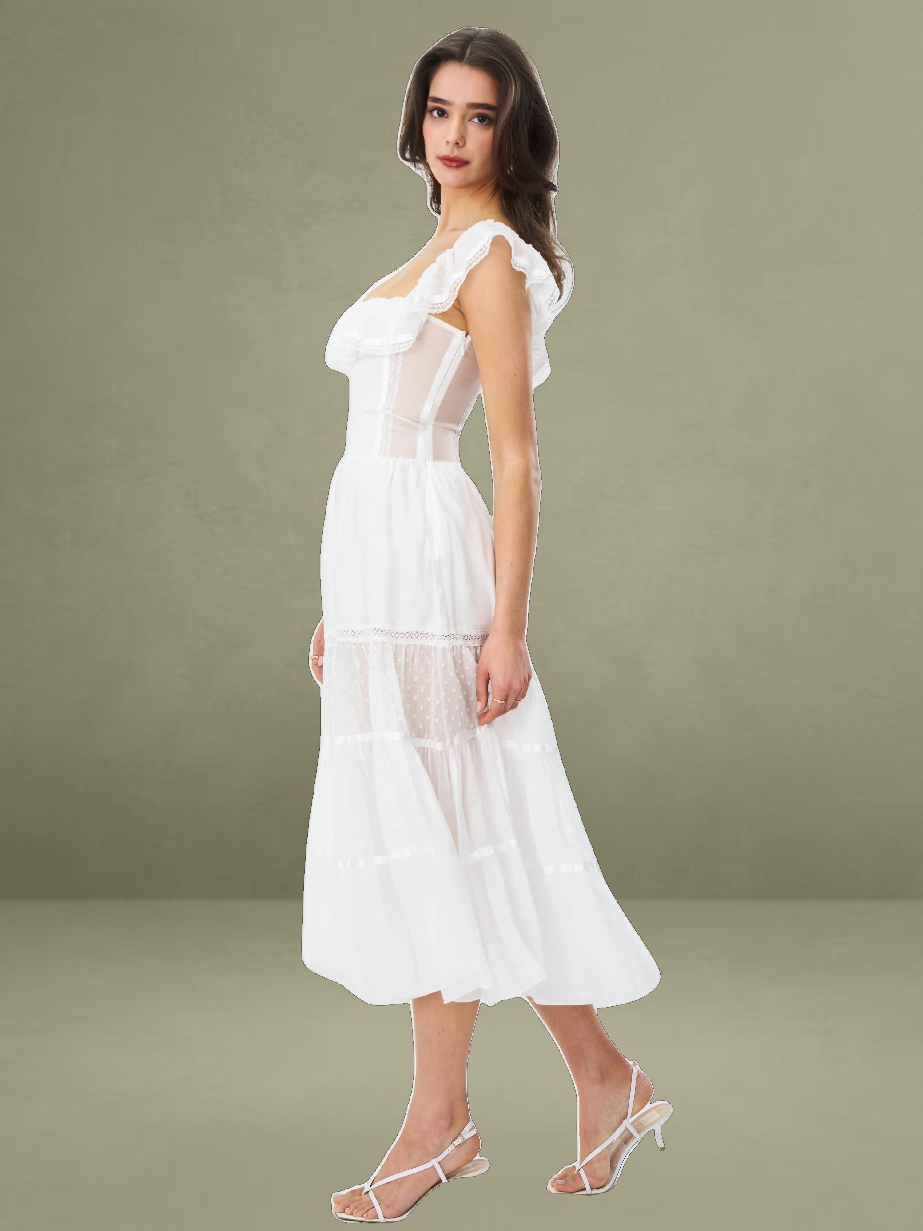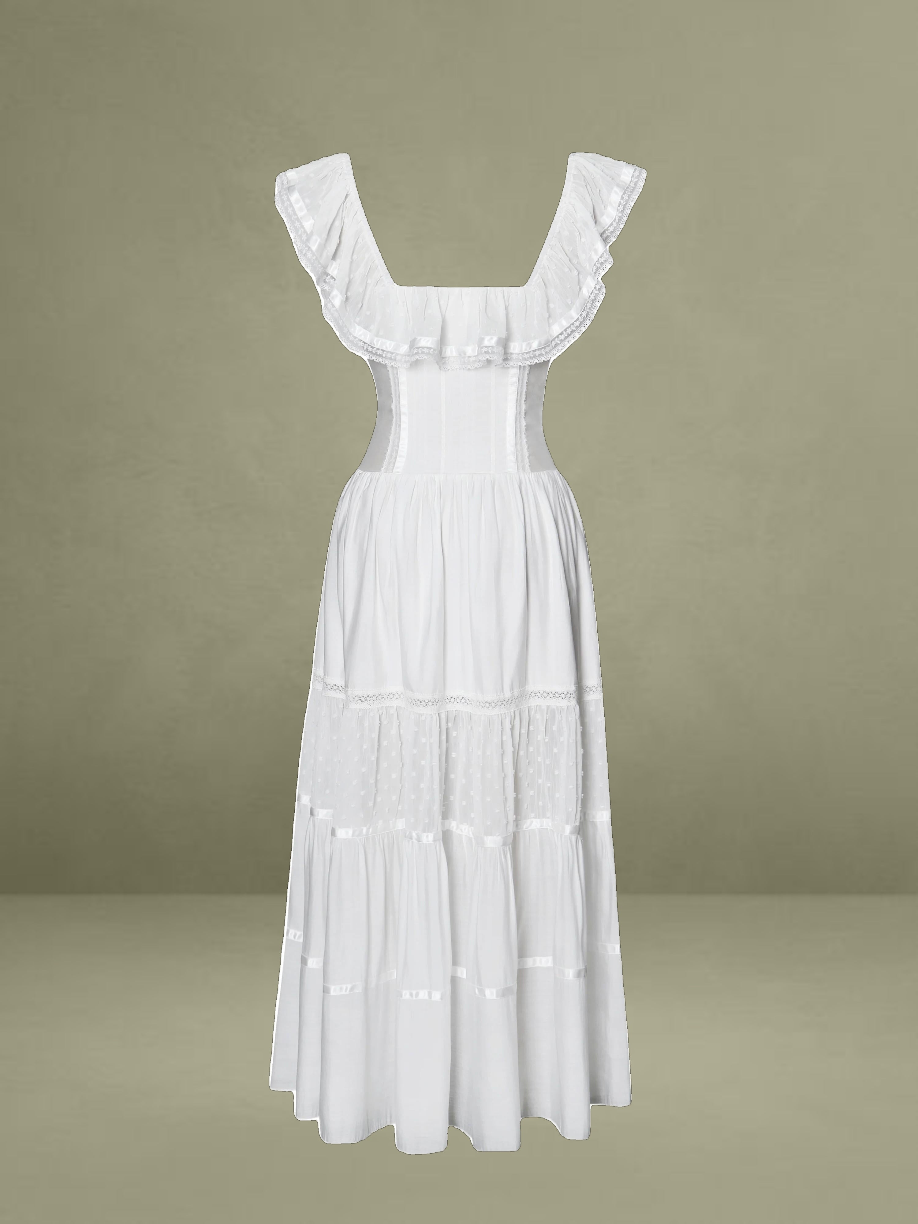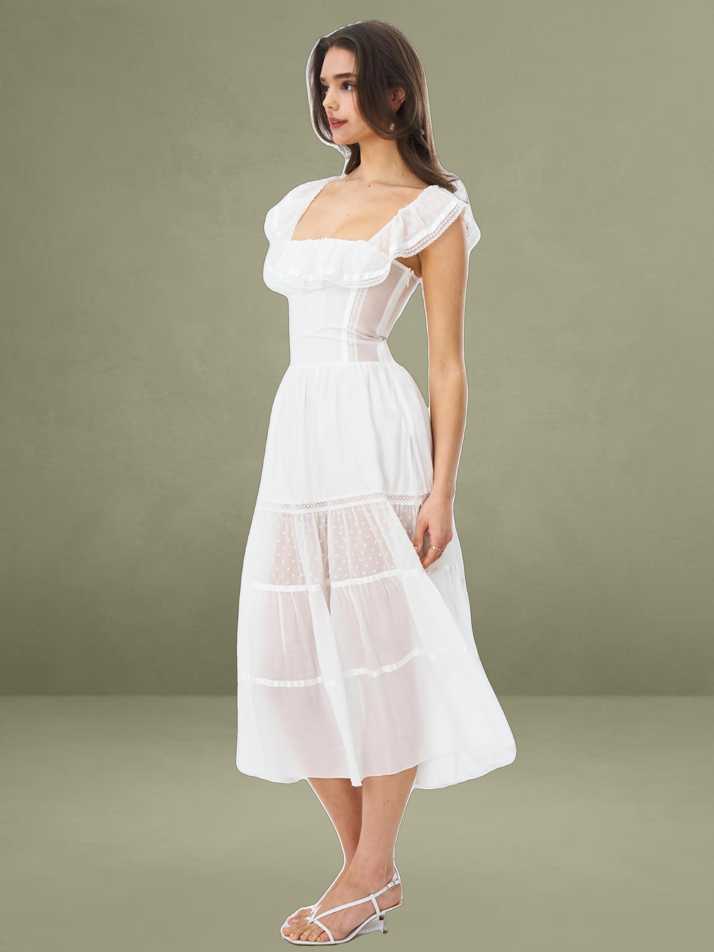 Embrace classic elegance with this romantic white midi dress. It's made from delicate fabrics with dotted textures and lace trims. The square neckline has a charming ruffled edge, adding femininity to the structured top. With a well - fitting waist and a full, tiered skirt, it combines grace and comfort. Fully lined for easy wearing, it's perfect for picnics, garden parties, or warm - weather outings.