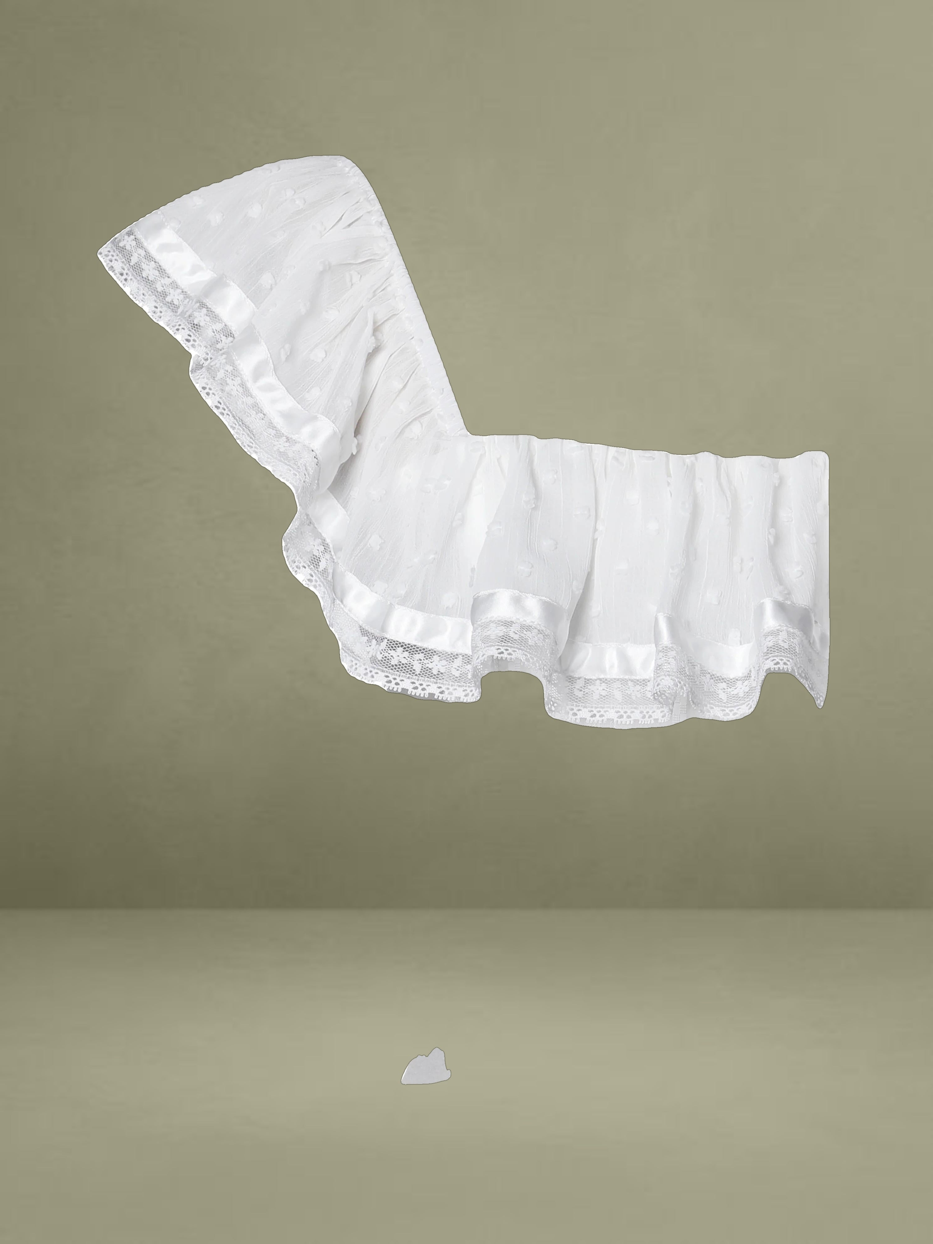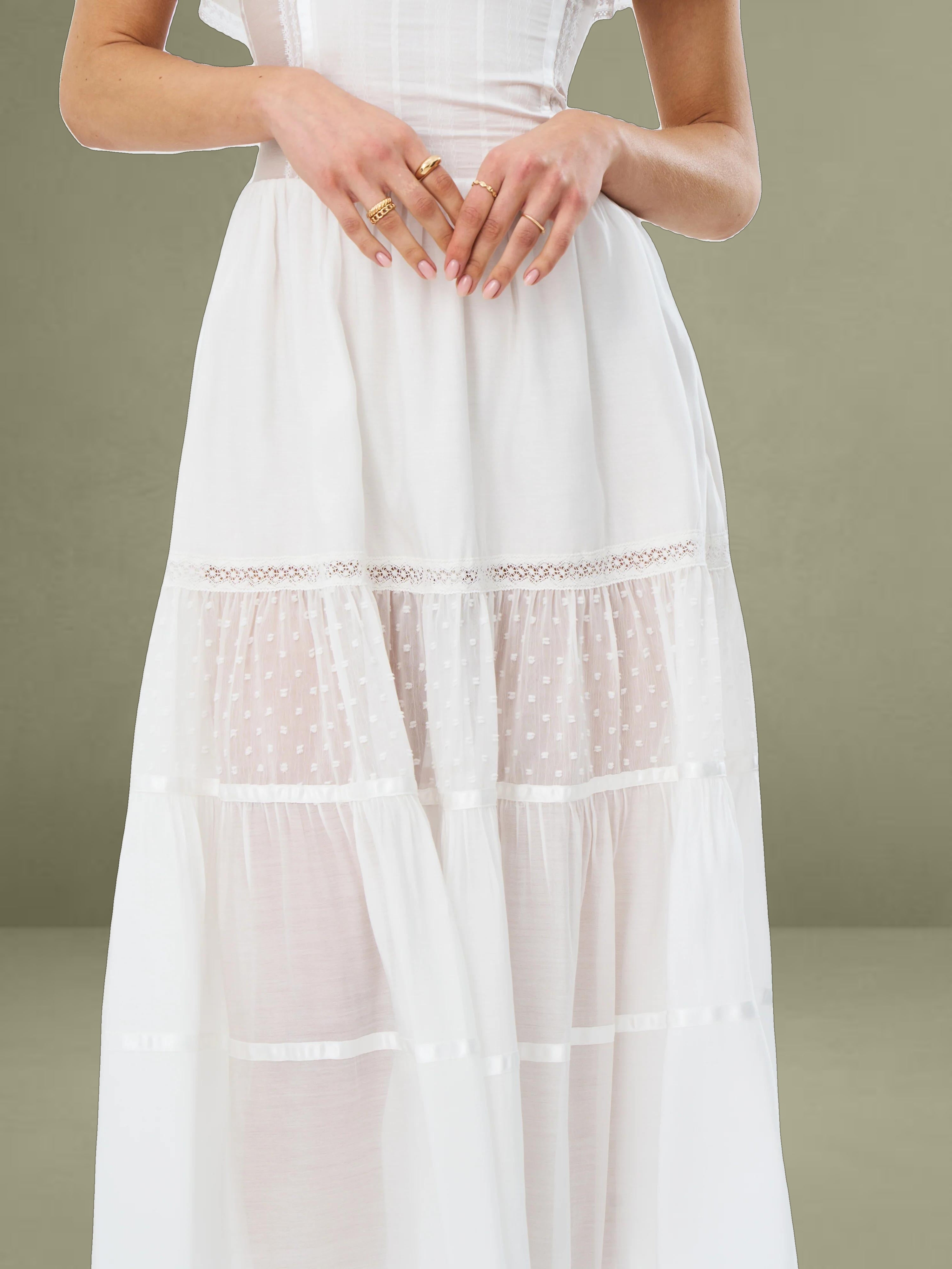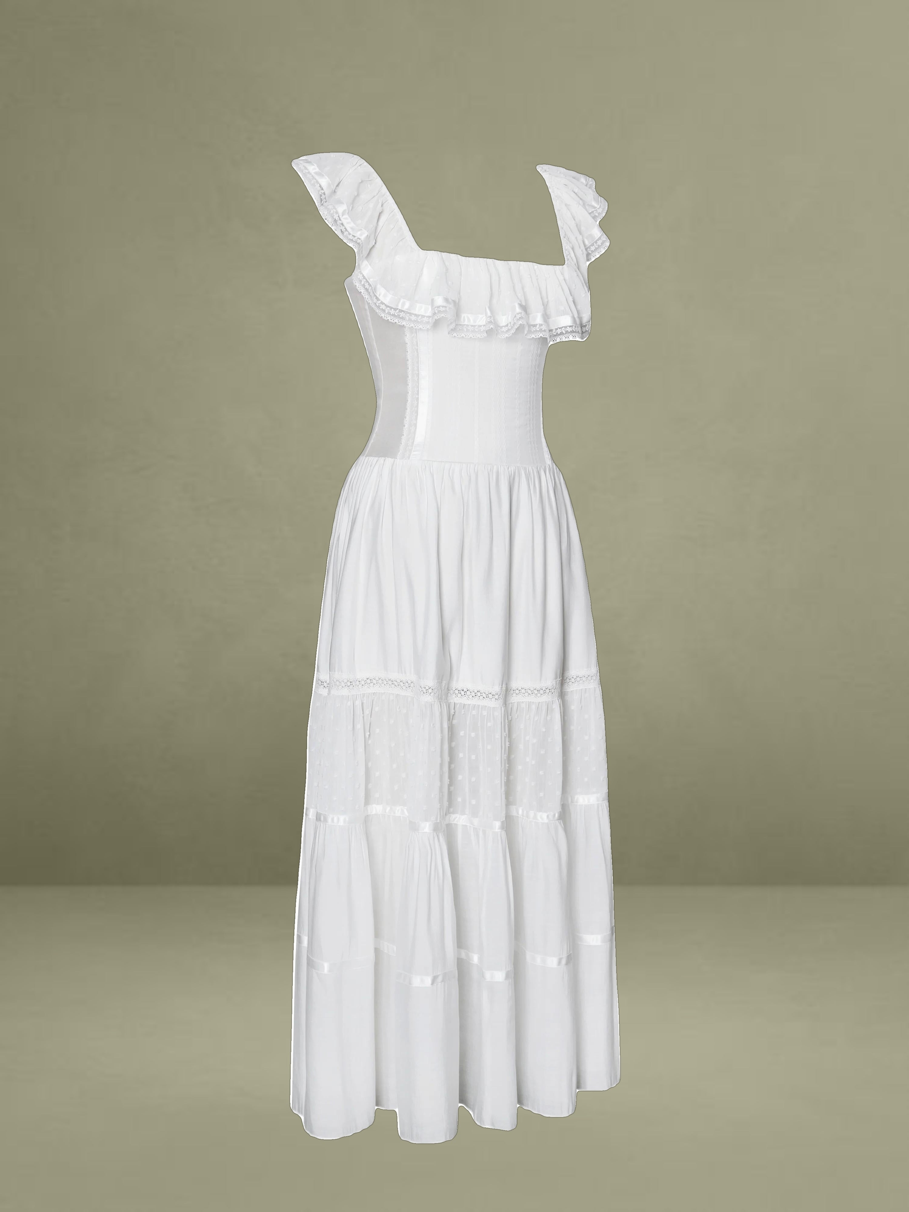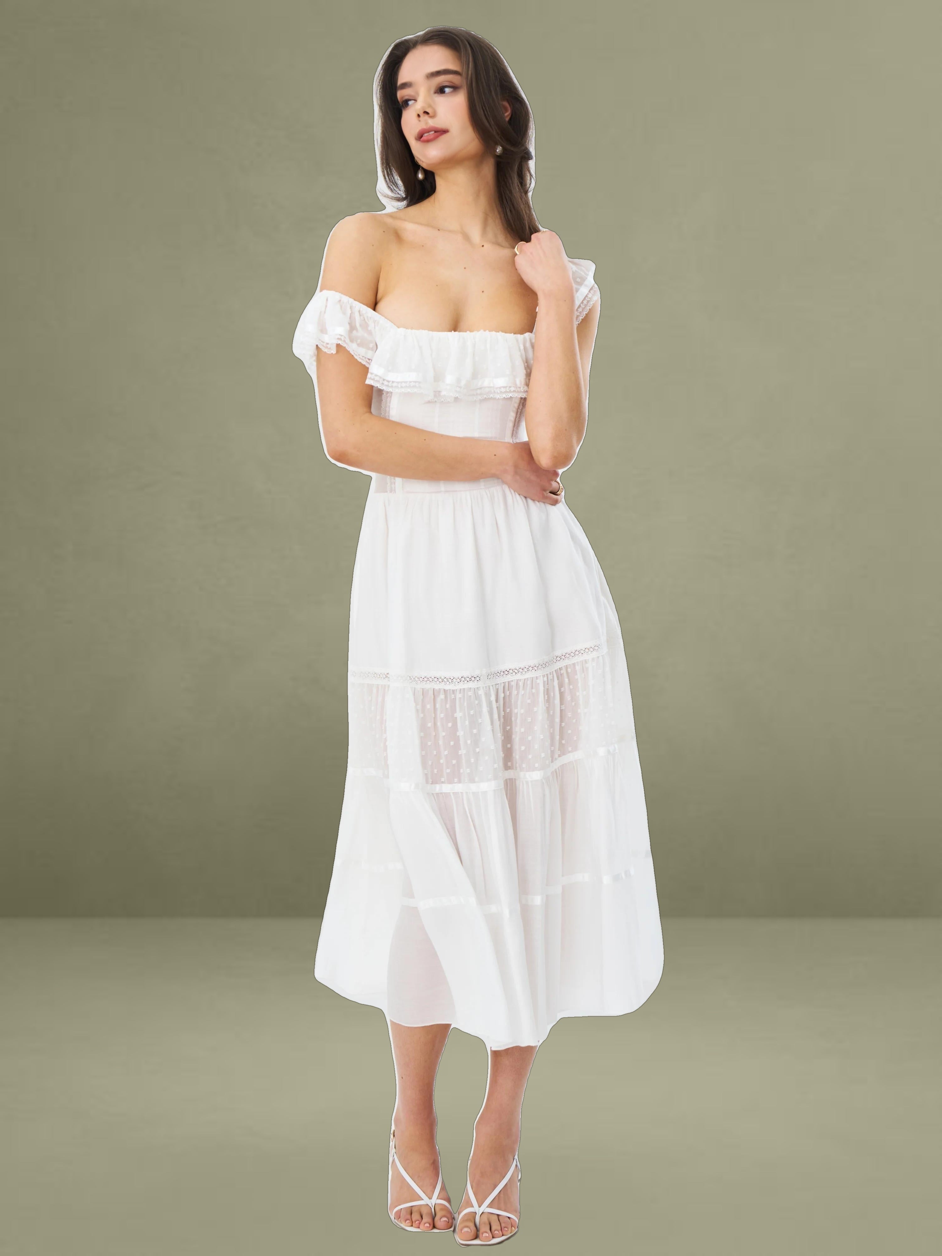 Embrace classic elegance with this romantic white midi dress. It's made from delicate fabrics with dotted textures and lace trims. The square neckline has a charming ruffled edge, adding femininity to the structured top. With a well - fitting waist and a full, tiered skirt, it combines grace and comfort. Fully lined for easy wearing, it's perfect for picnics, garden parties, or warm - weather outings.