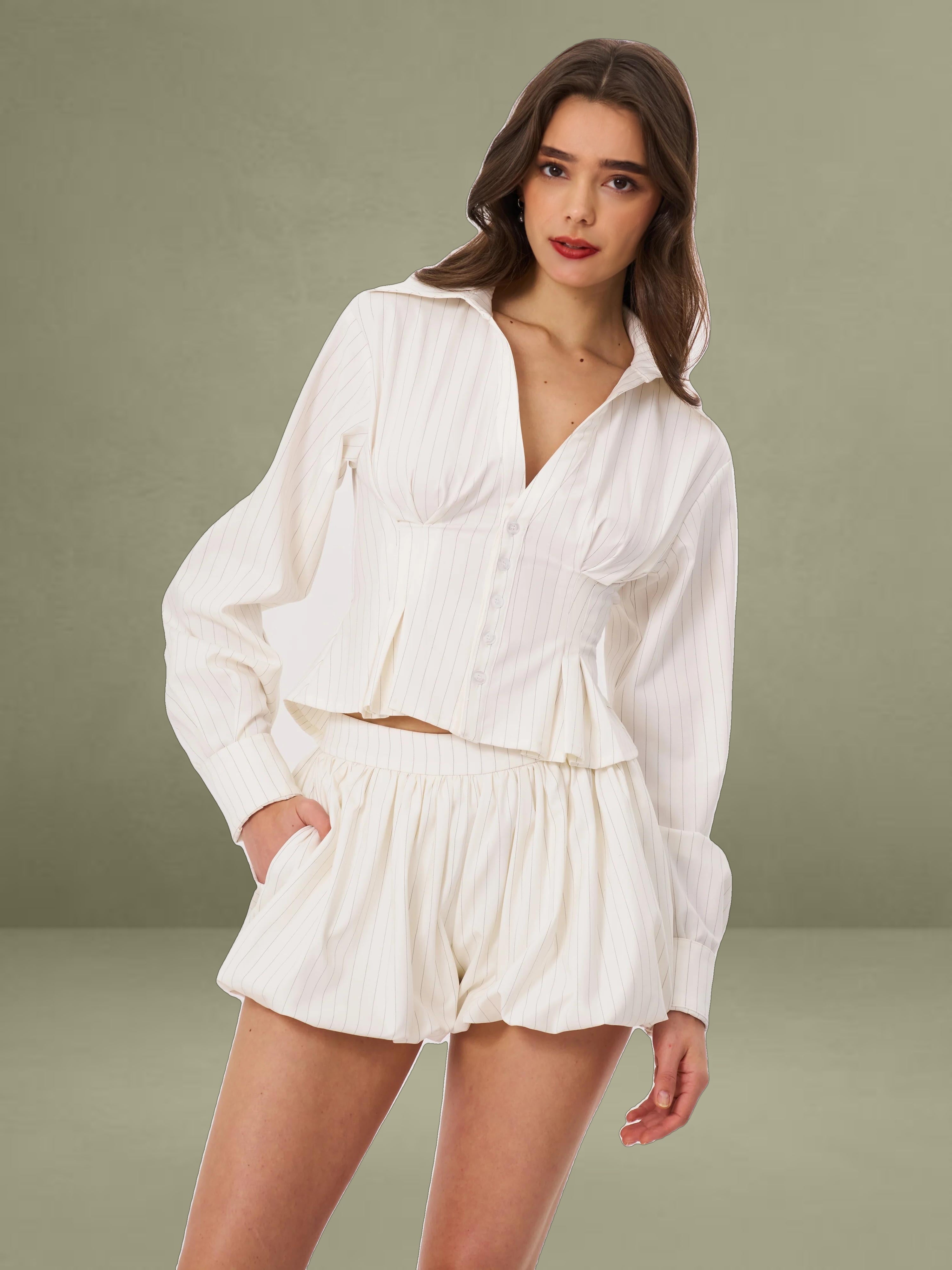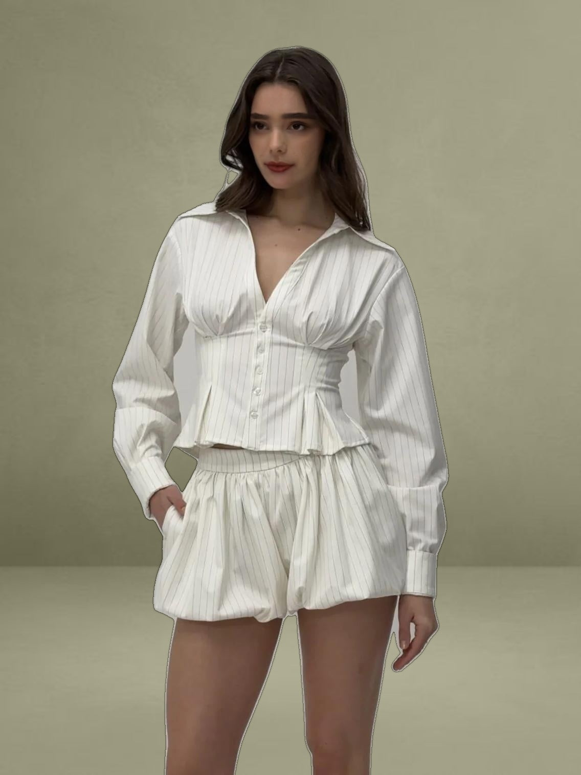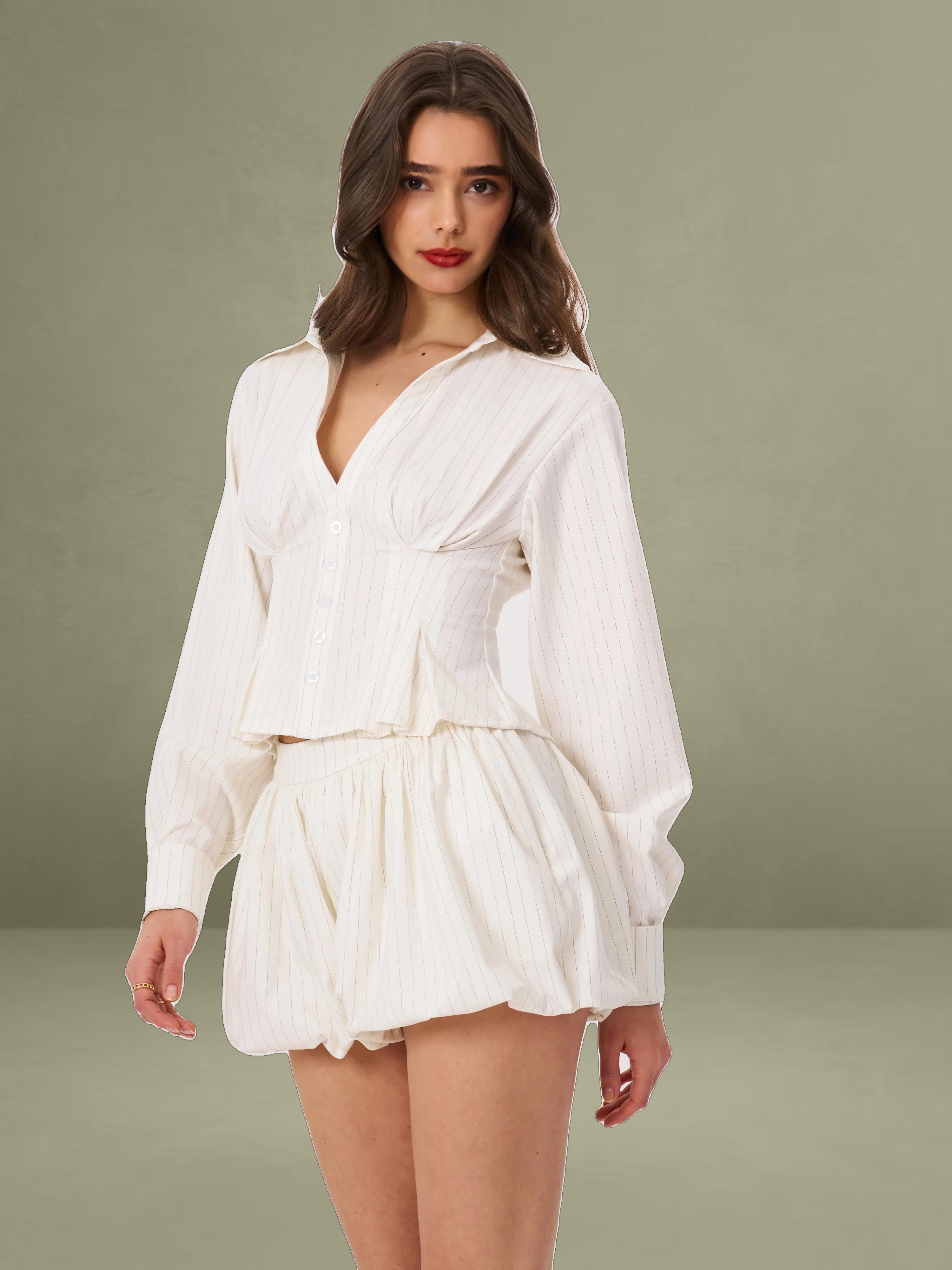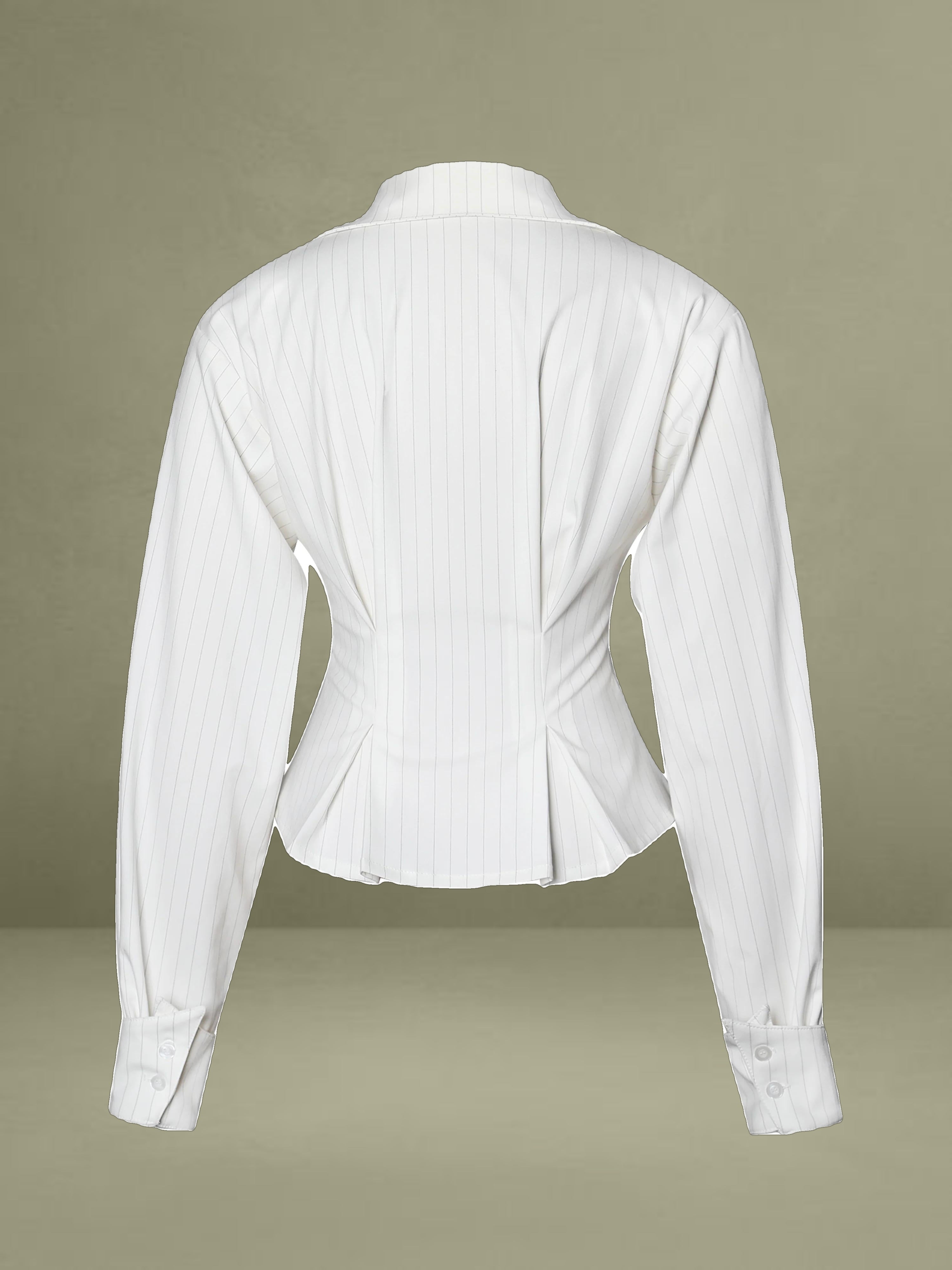 The Sylvia Top brings a refined touch to business casual attire with its crisp pinstriped design. Crafted in classic white, this pleated top features elegant long sleeves and a structured fit, making it perfect for both daily wear and formal occasions. The timeless silhouette pairs effortlessly with matching bottoms for a polished ensemble.