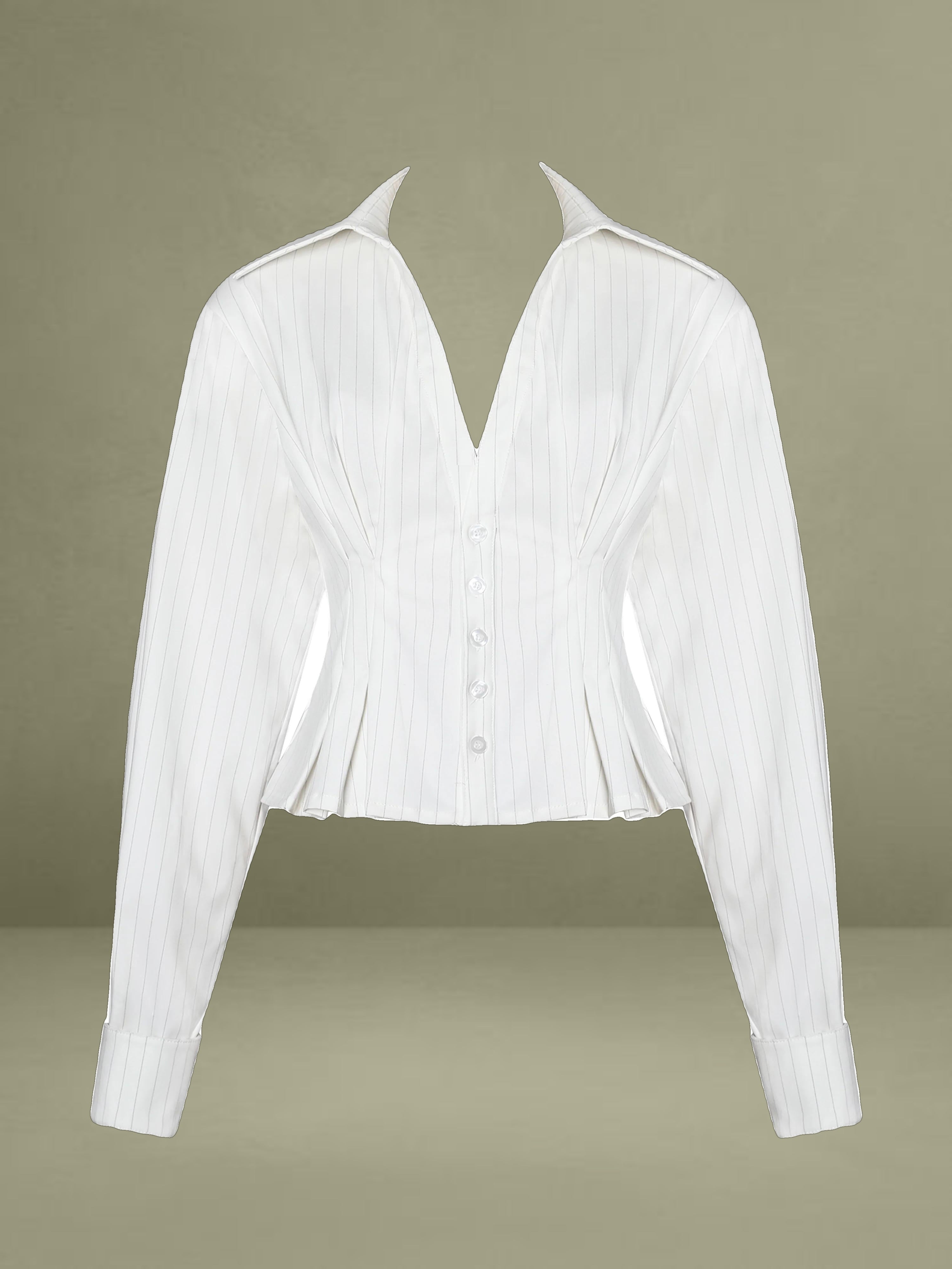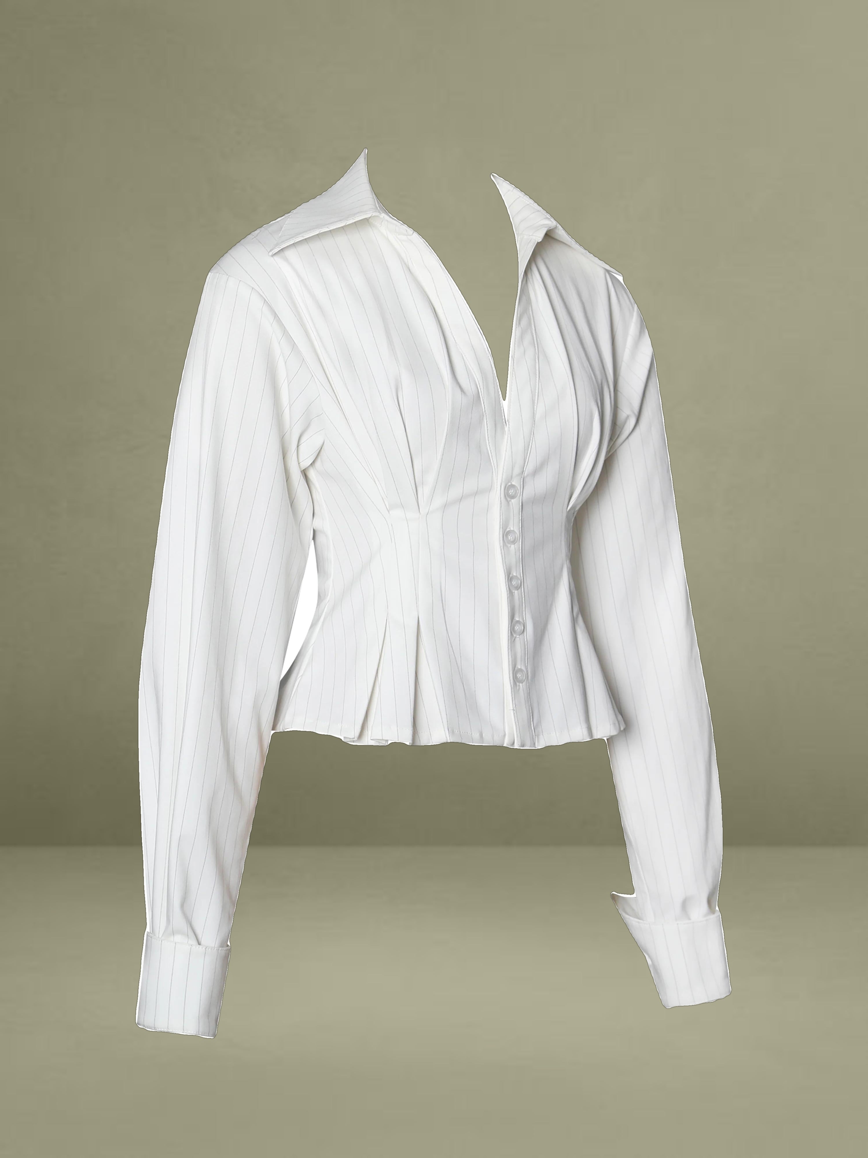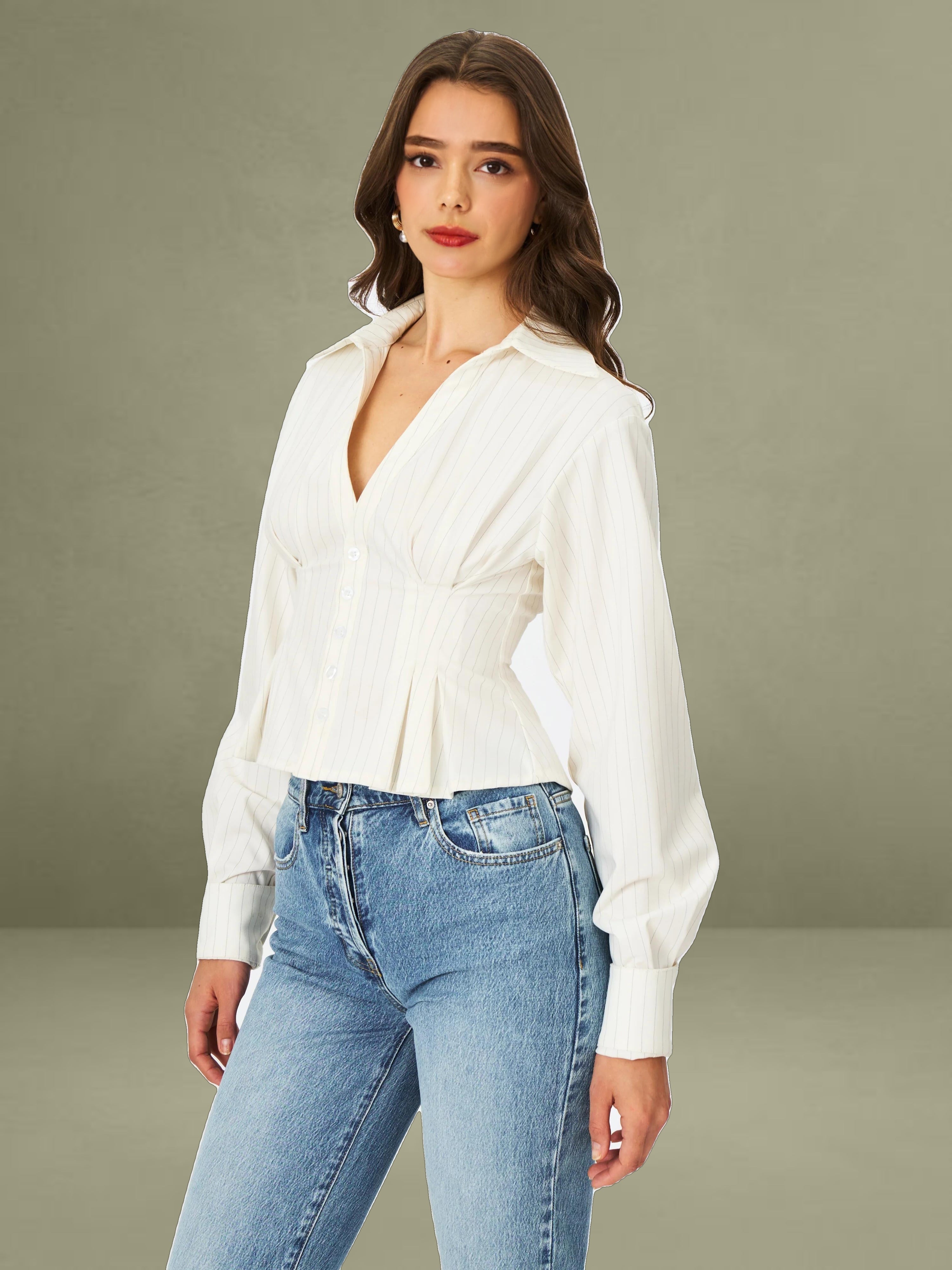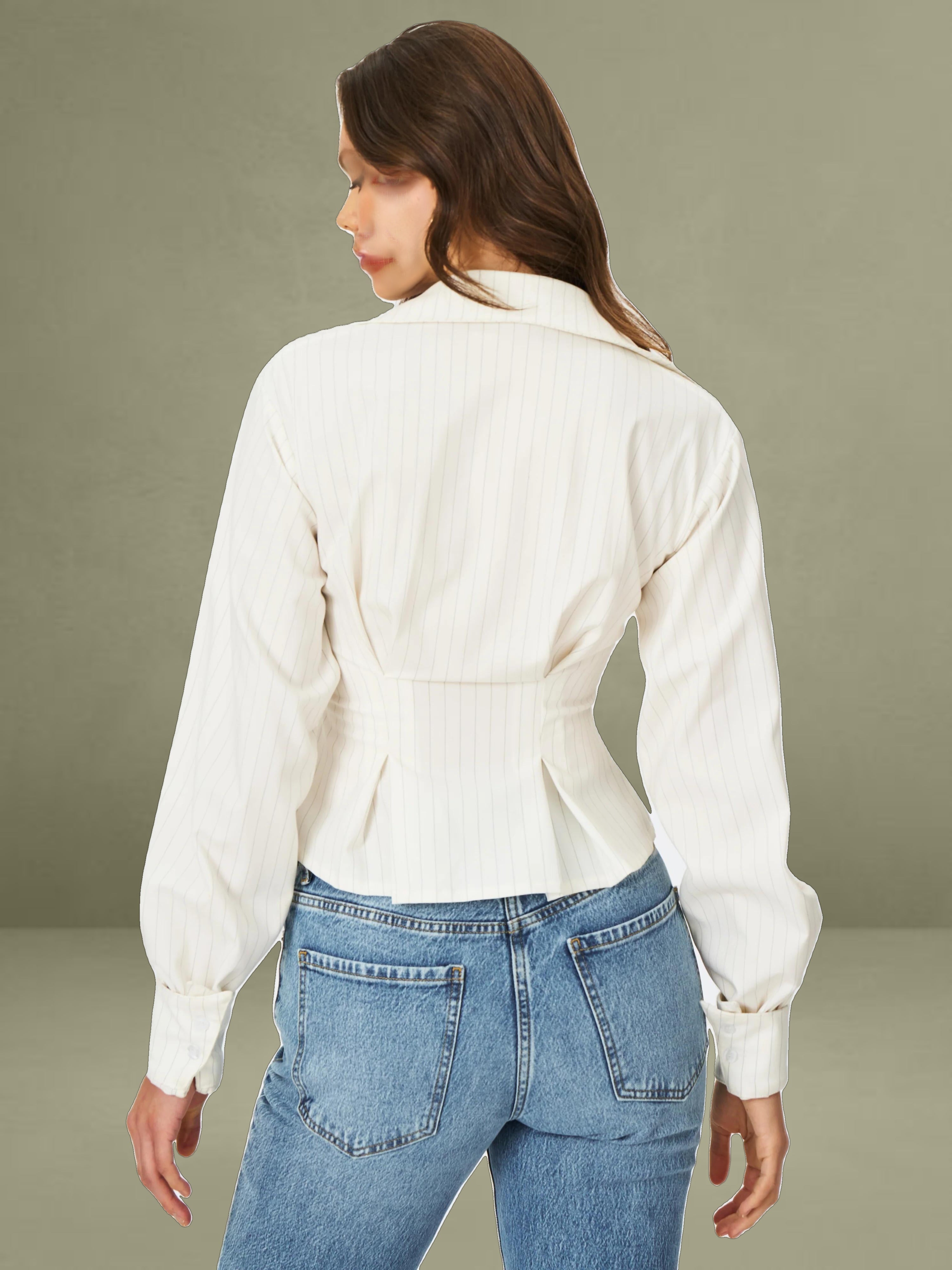 The Sylvia Top brings a refined touch to business casual attire with its crisp pinstriped design. Crafted in classic white, this pleated top features elegant long sleeves and a structured fit, making it perfect for both daily wear and formal occasions. The timeless silhouette pairs effortlessly with matching bottoms for a polished ensemble.