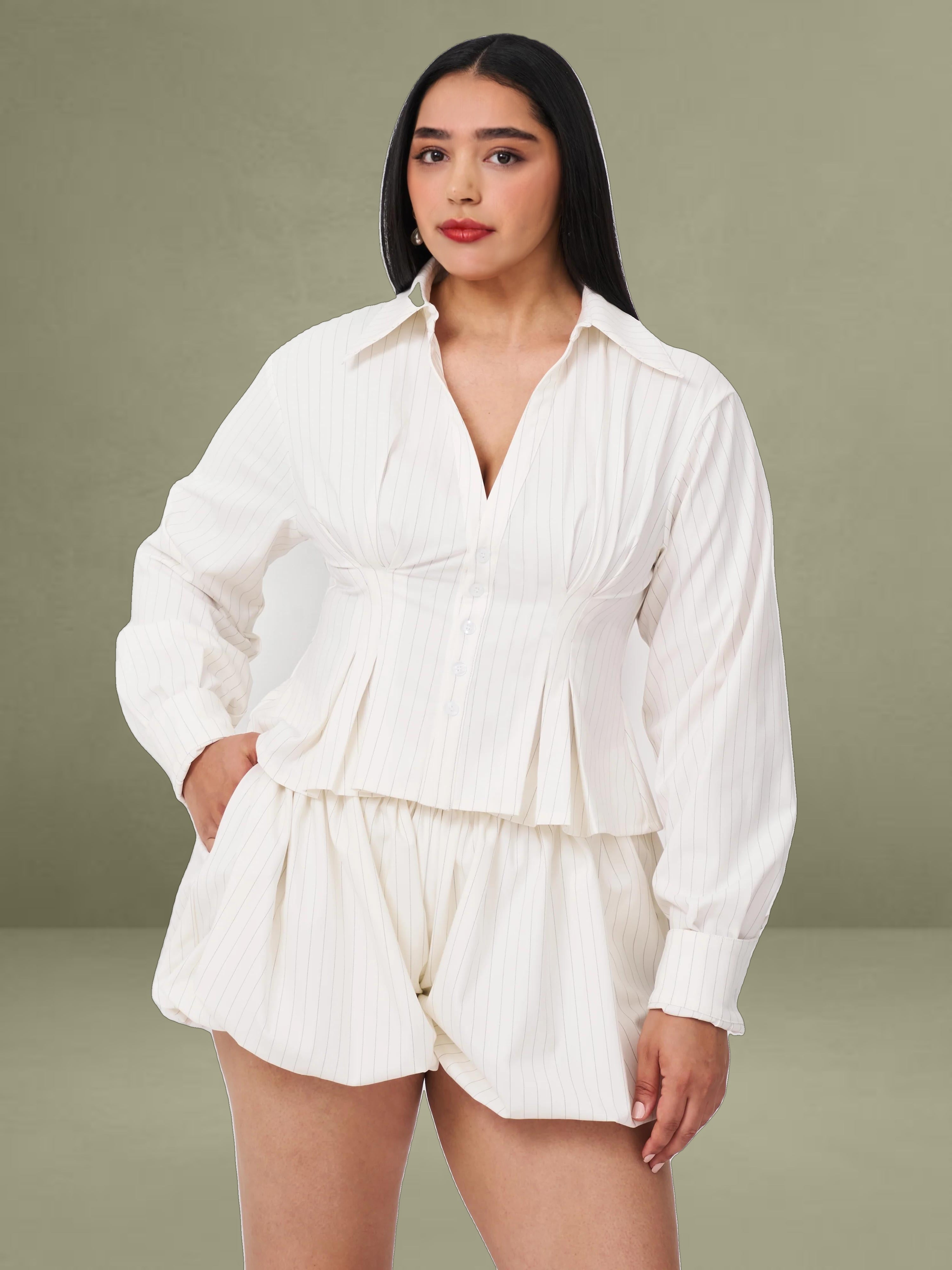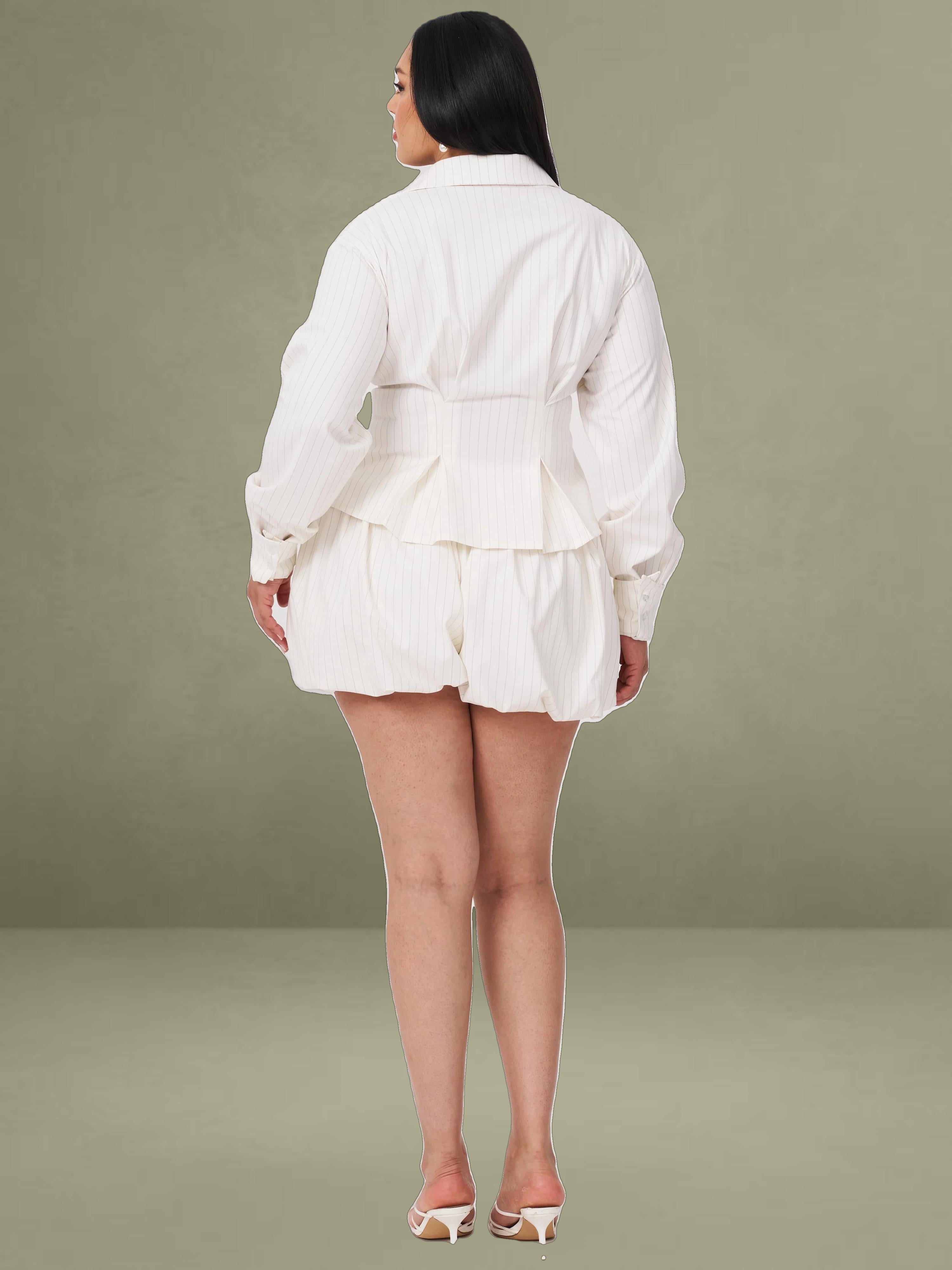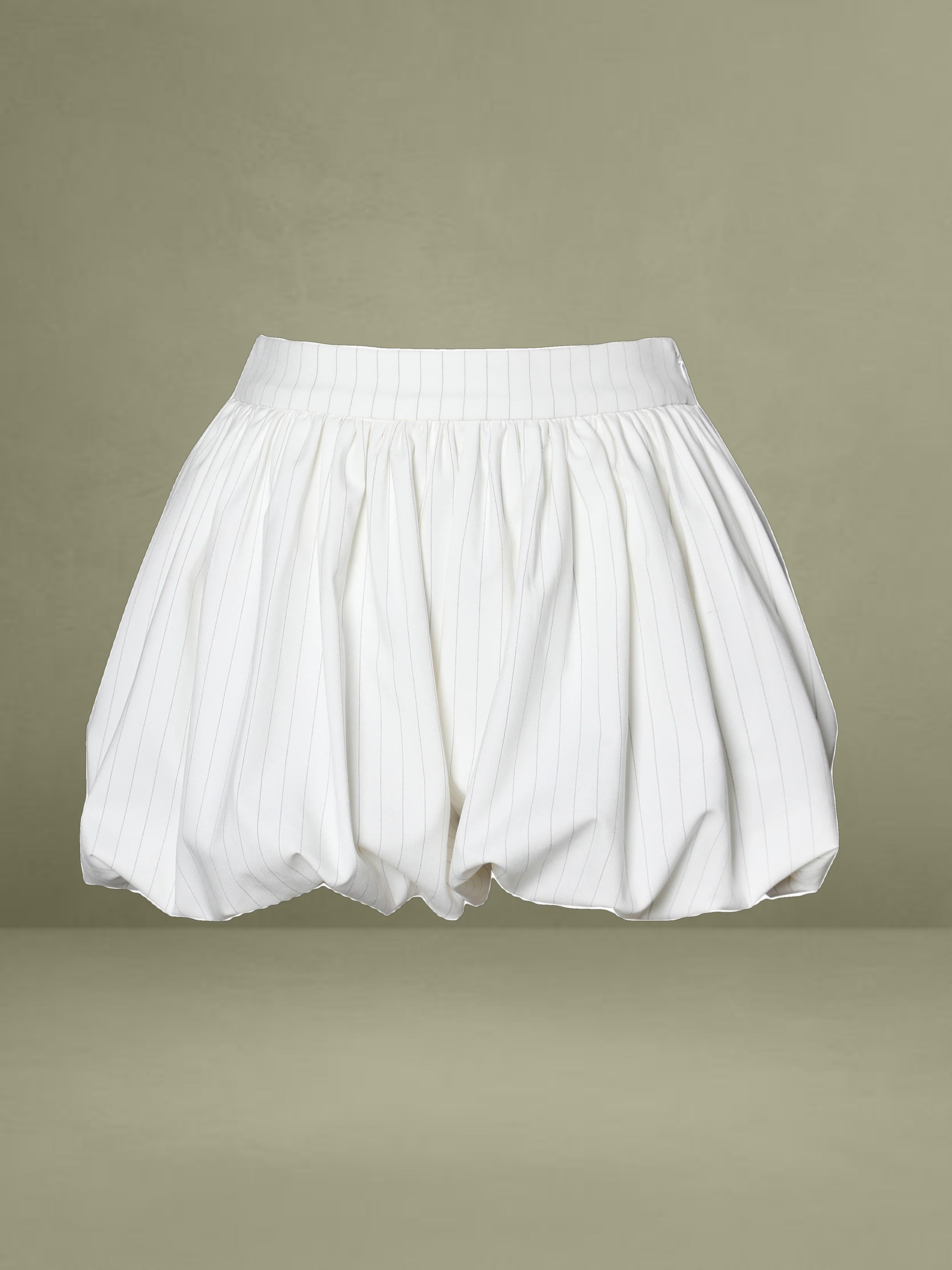 The Sylvie Pants redefine tailored elegance with a playful twist. Designed with a bubble hem silhouette, these pinstriped shorts offer a modern take on business casual style. Fully lined with invisible pockets, they are perfect for daily wear while maintaining a sophisticated edge. Pair them with the Sylvia Top for a coordinated look.