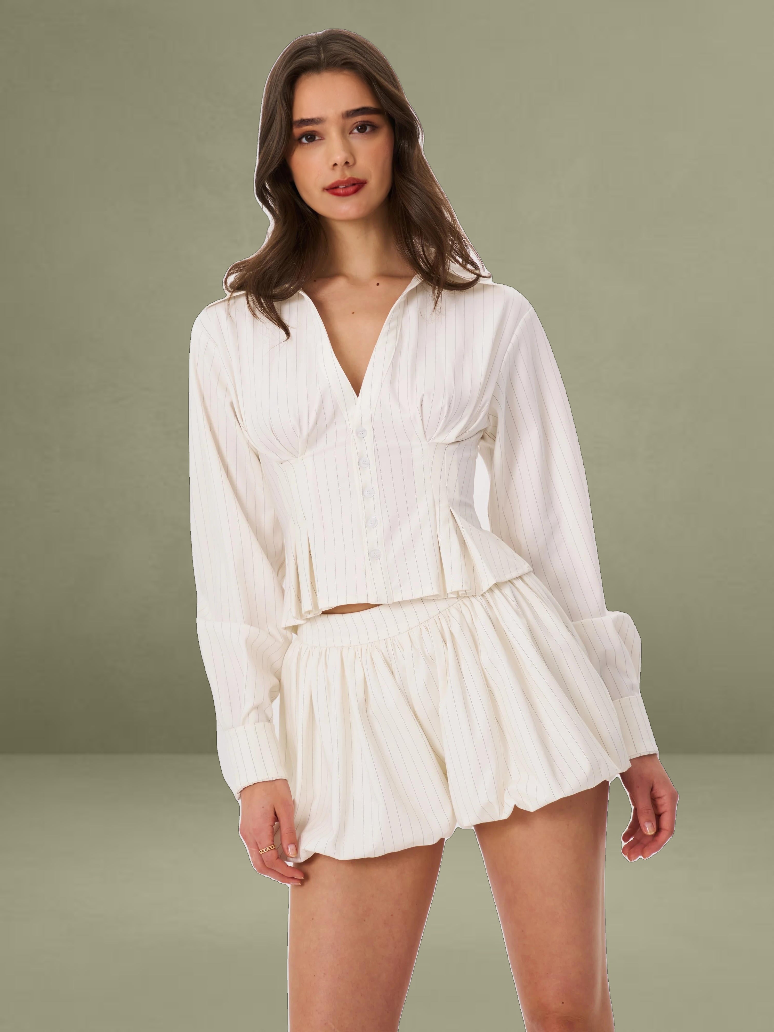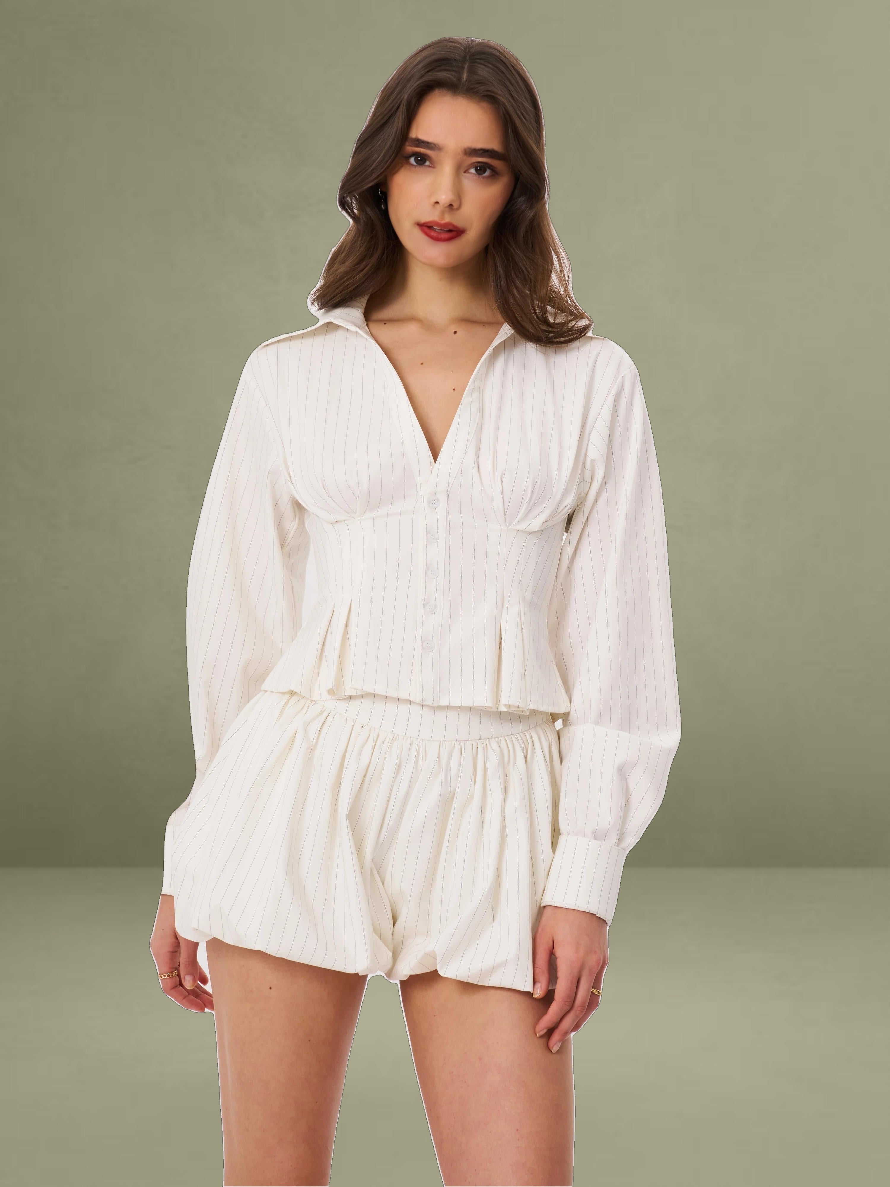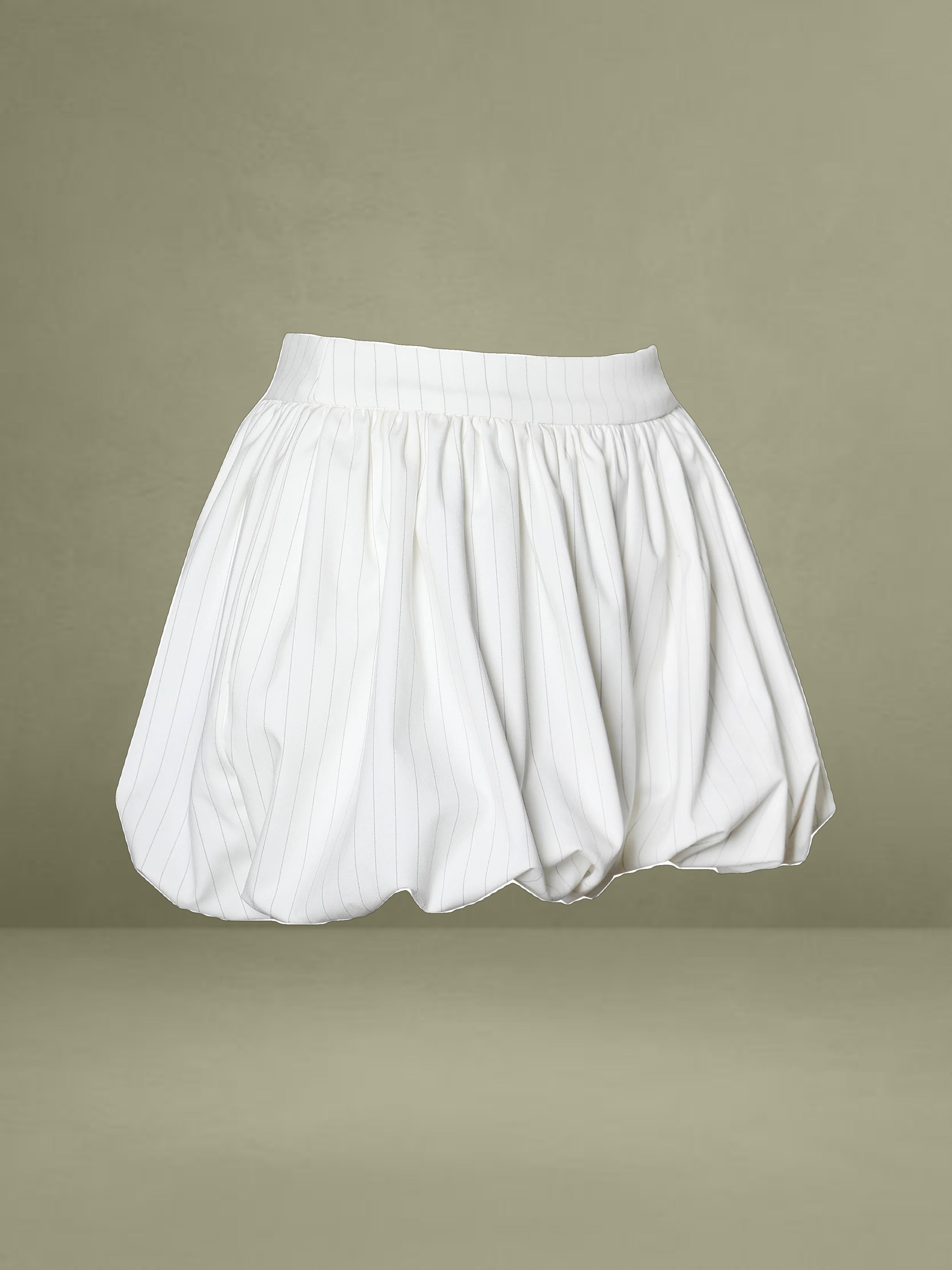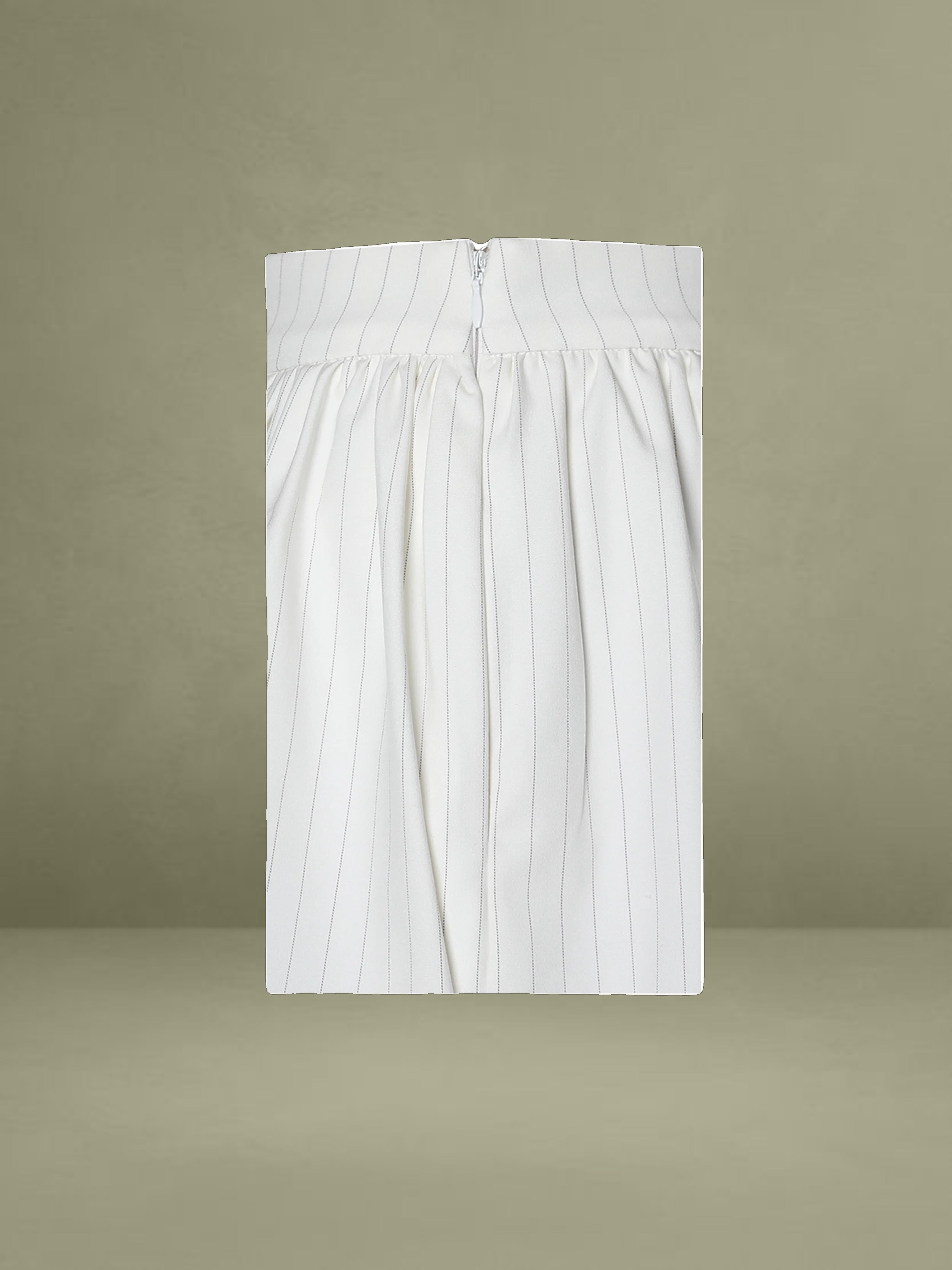 The Sylvie Pants redefine tailored elegance with a playful twist. Designed with a bubble hem silhouette, these pinstriped shorts offer a modern take on business casual style. Fully lined with invisible pockets, they are perfect for daily wear while maintaining a sophisticated edge. Pair them with the Sylvia Top for a coordinated look.