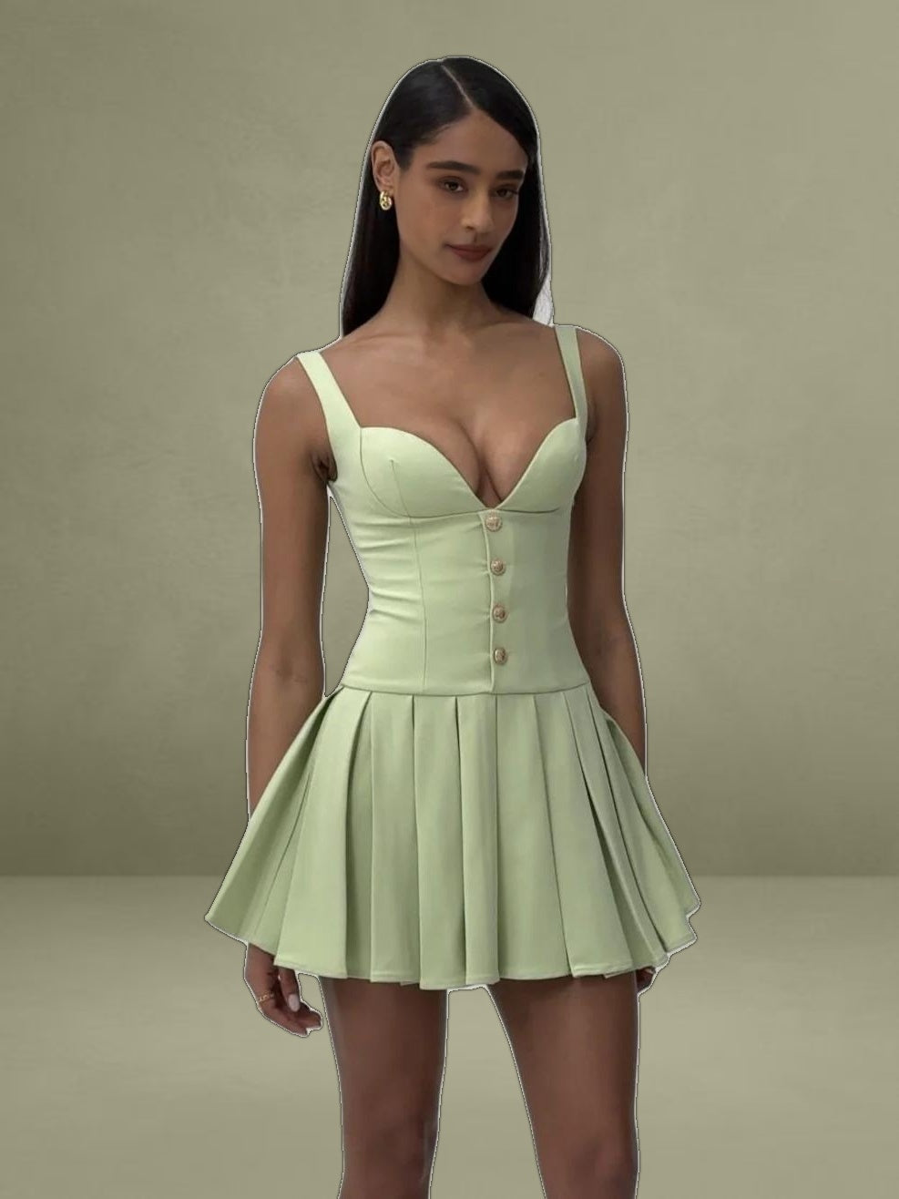 The Tala Dress exudes timeless elegance with a preppy style perfect for business casual, spring picnics, daily wear, or formal events. Crafted from luxurious white crepe, this sleeveless design features a classic crew neck and delicate gold buttons along the front. The drop waist silhouette flows into a pleated skirt, creating graceful movement, while the padded cup enhances structure and support. Finished with an invisible zipper for a seamless fit, the Tala Dress is your go-to choice for polished sophistication. And it's also available in White.