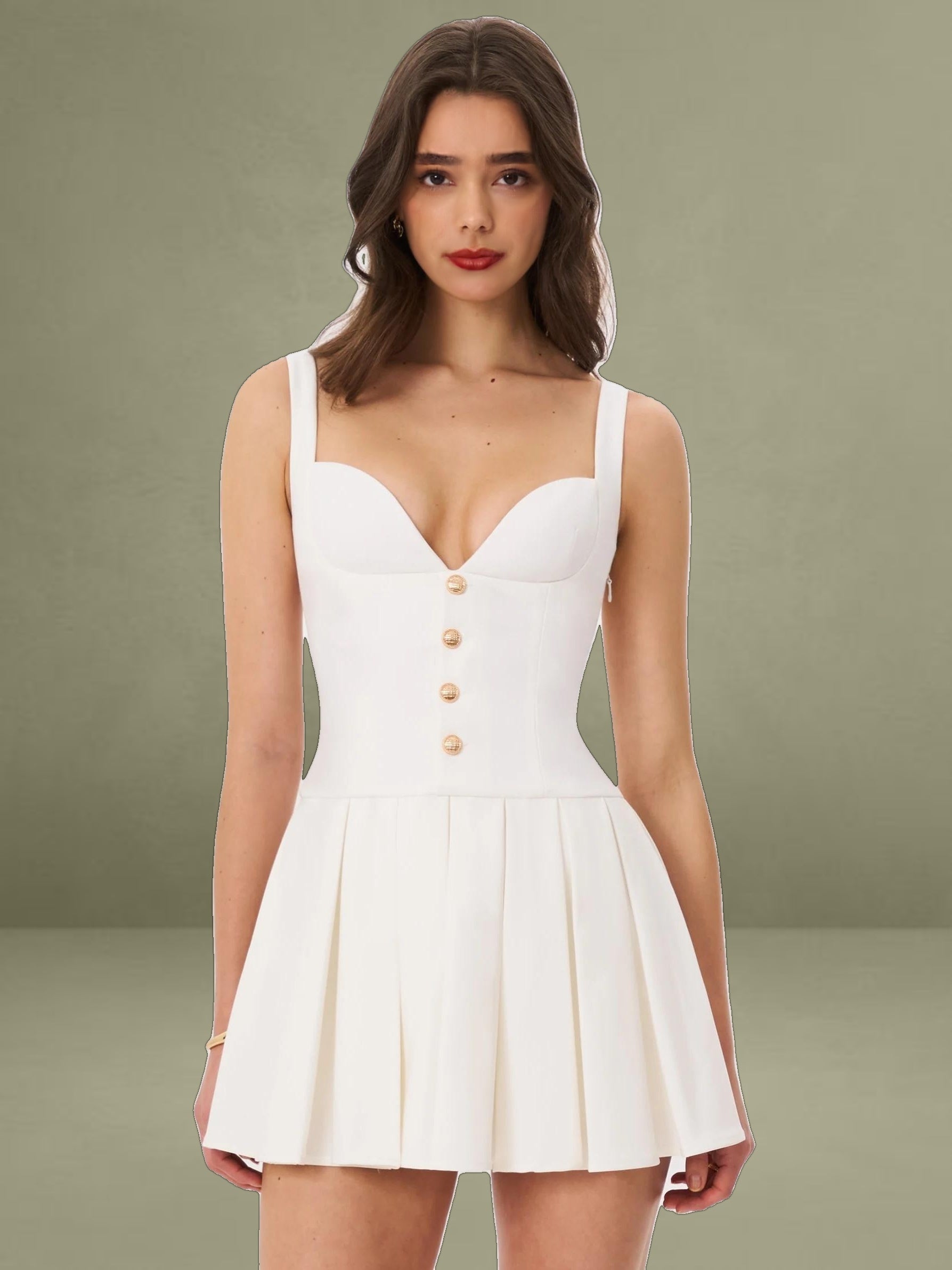 The Tala Dress exudes timeless elegance with a preppy style perfect for business casual, spring picnics, daily wear, or formal events. Crafted from luxurious white crepe, this sleeveless design features a classic crew neck and delicate gold buttons along the front. The drop waist silhouette flows into a pleated skirt, creating graceful movement, while the padded cup enhances structure and support. Finished with an invisible zipper for a seamless fit, the Tala Dress is your go-to choice for polished sophistication.