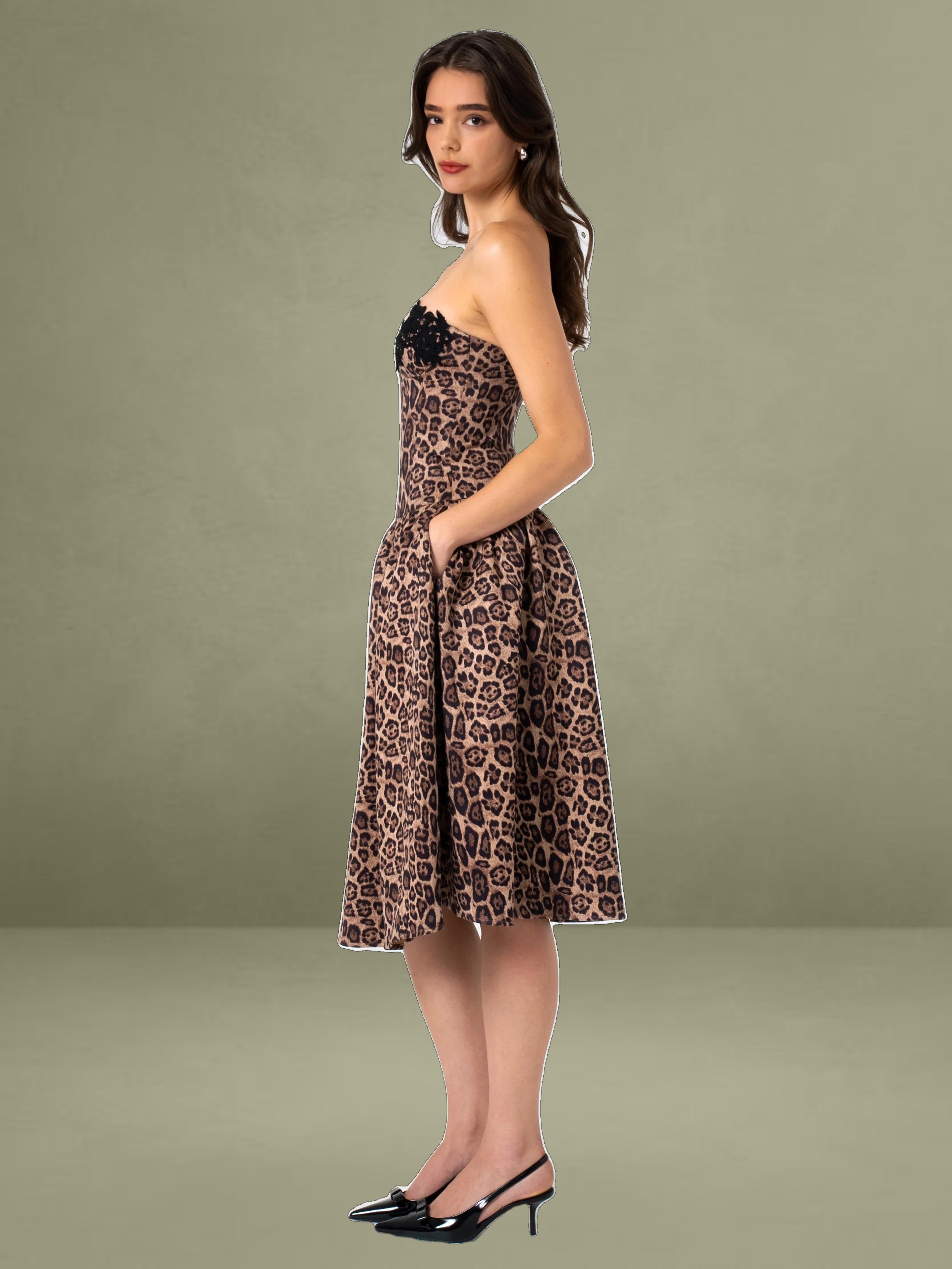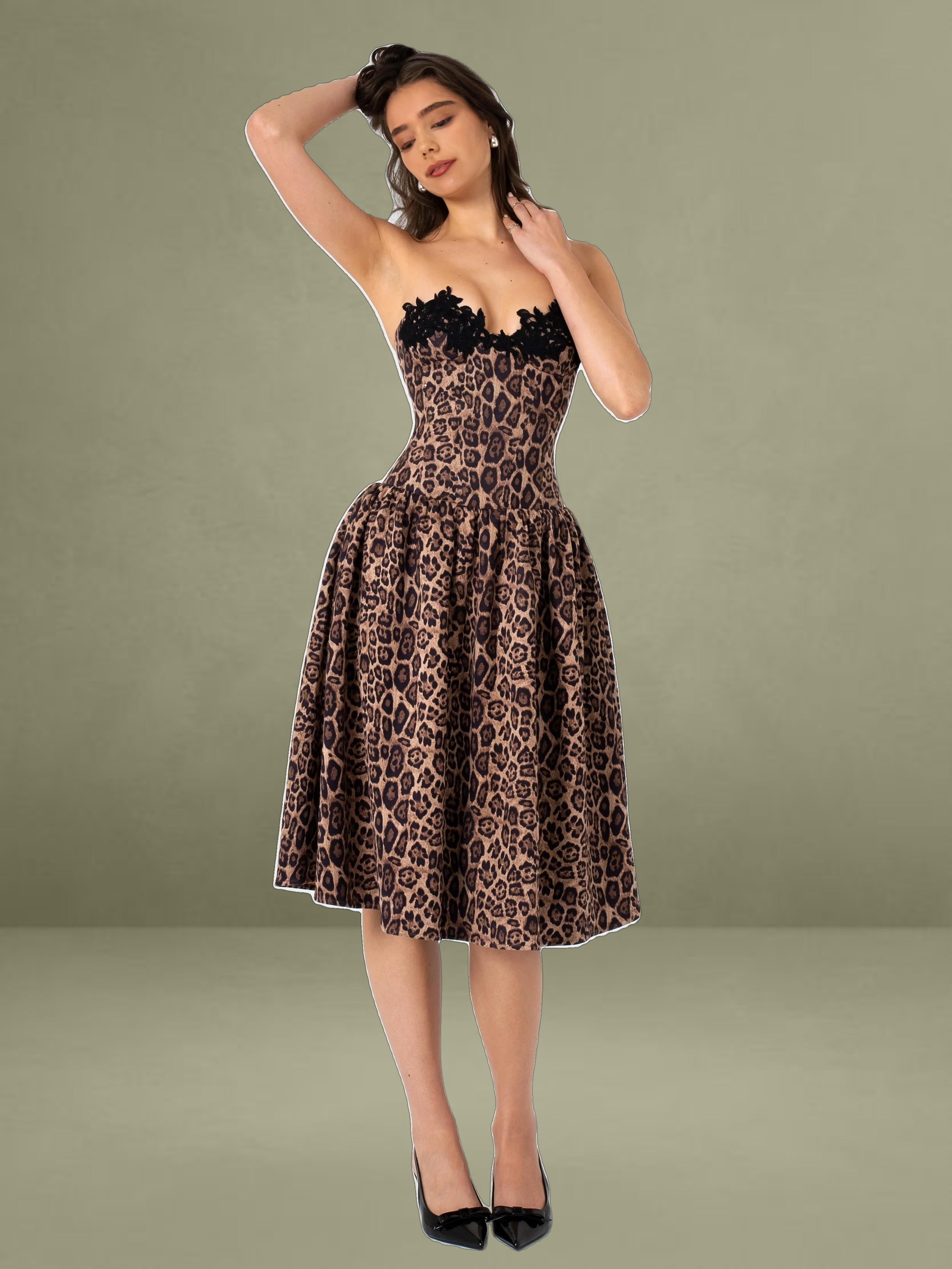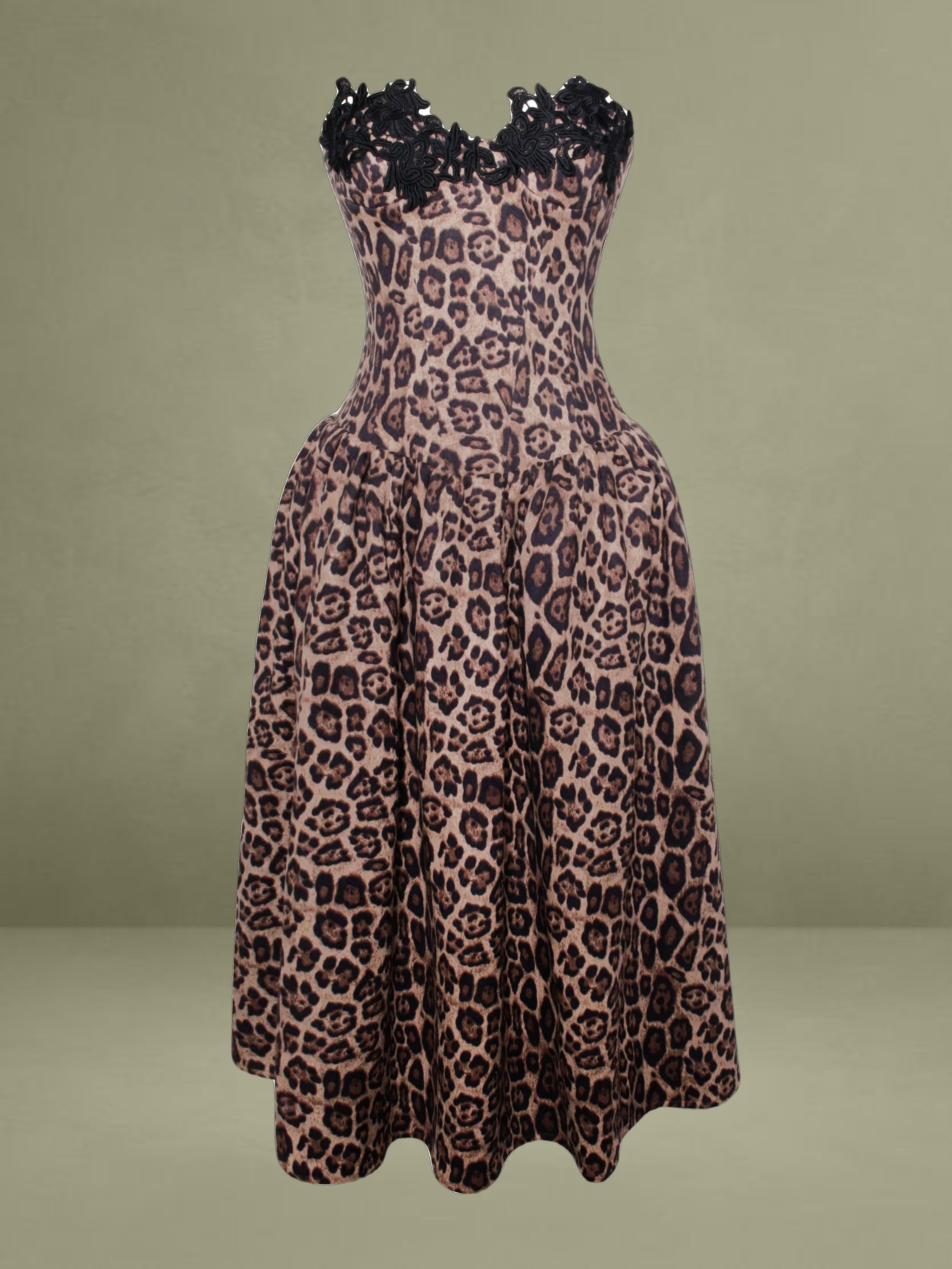 Behold our Uchenna dress, a striking blend of elegance and bold design. Crafted from high-stretch suede adorned with a captivating cheetah print, it exudes confidence and sophistication. The lace trim adds a delicate touch, while the drop waist design creates a flattering, modern silhouette. Padded cups ensure a comfortable and supportive fit, and the dress is fully lined for extra comfort. Finished with an invisible zipper for a seamless look, this dress is perfect for making a memorable impression at any special occasion, combining daring prints with refined details.