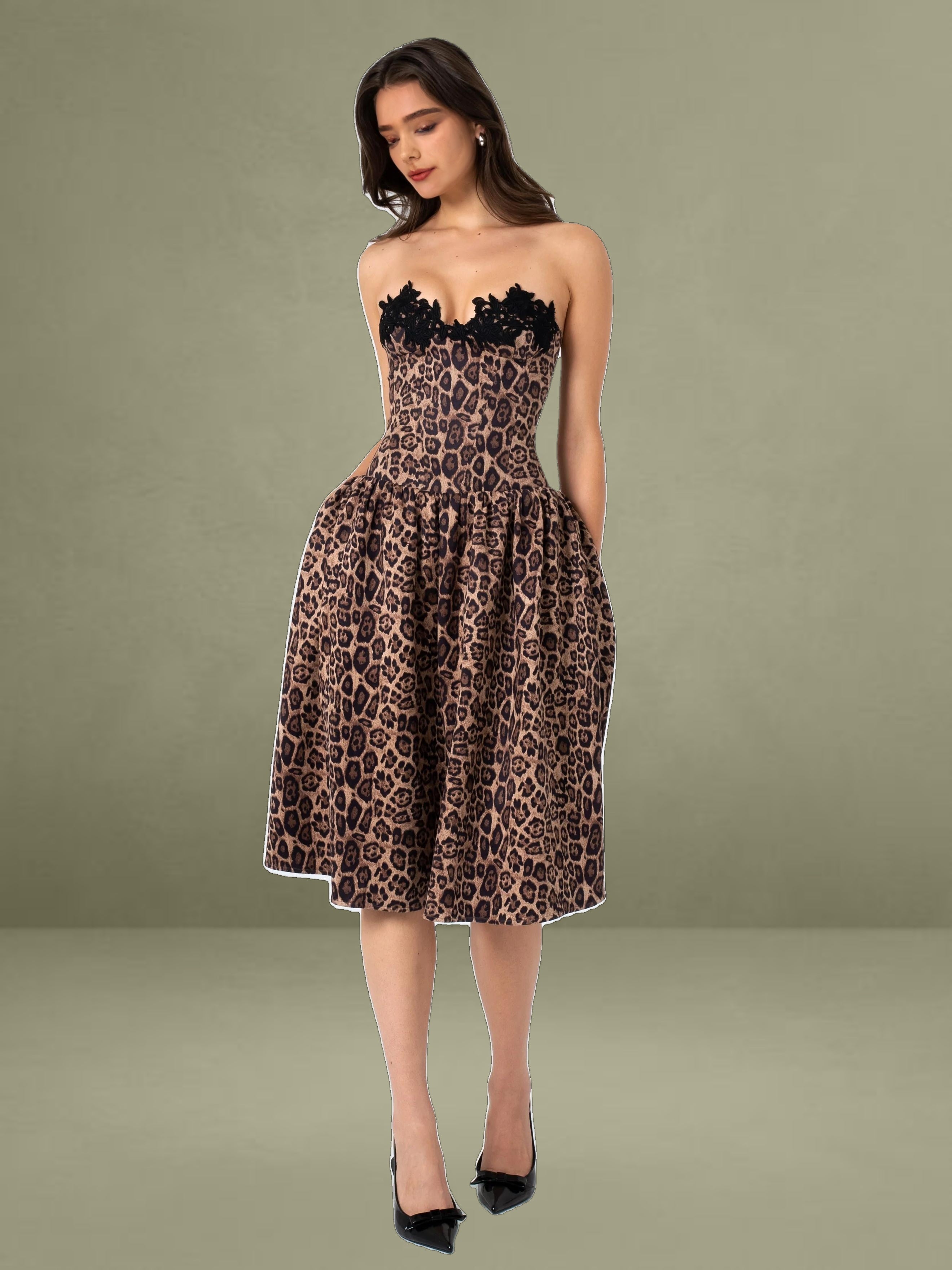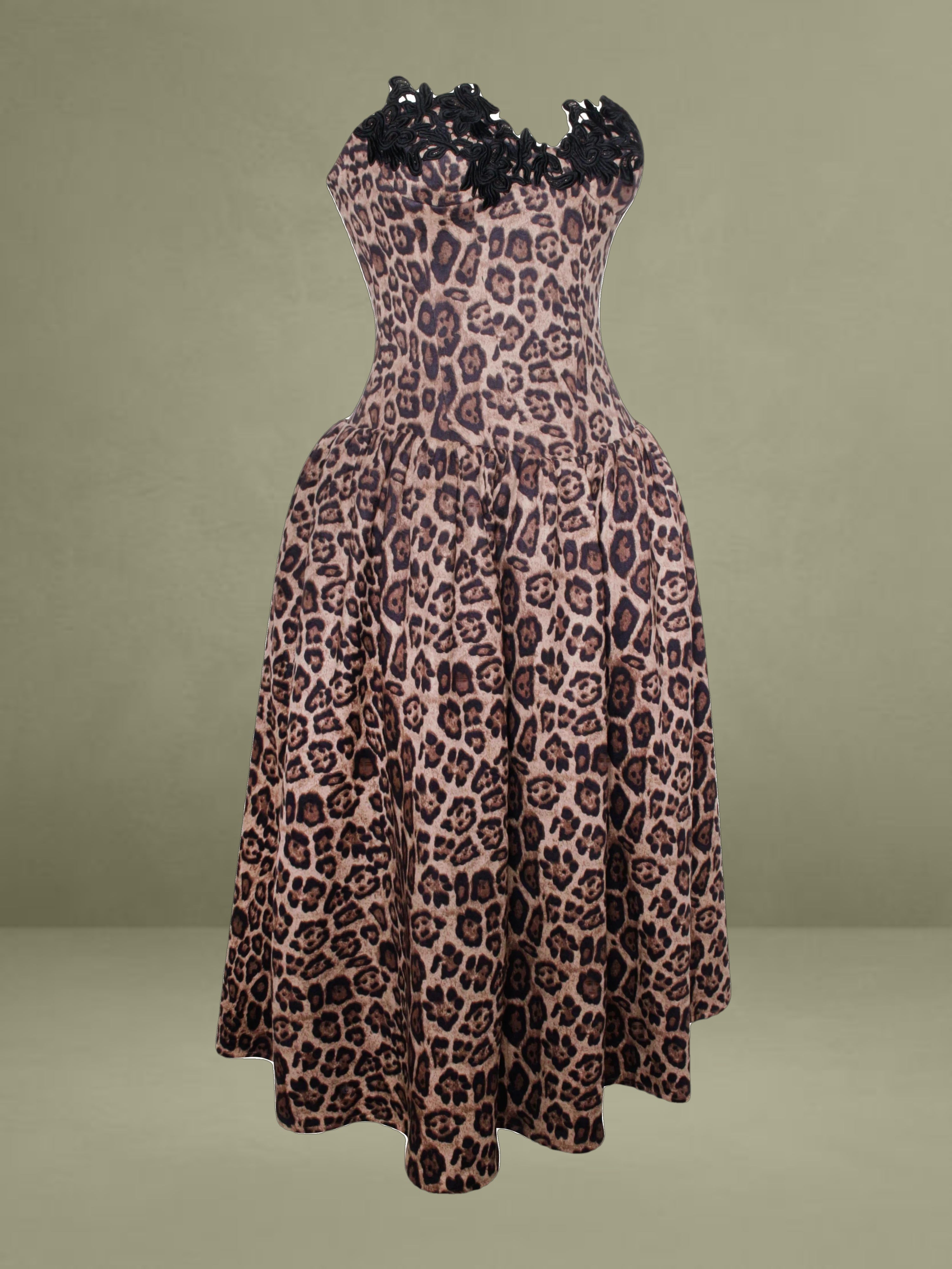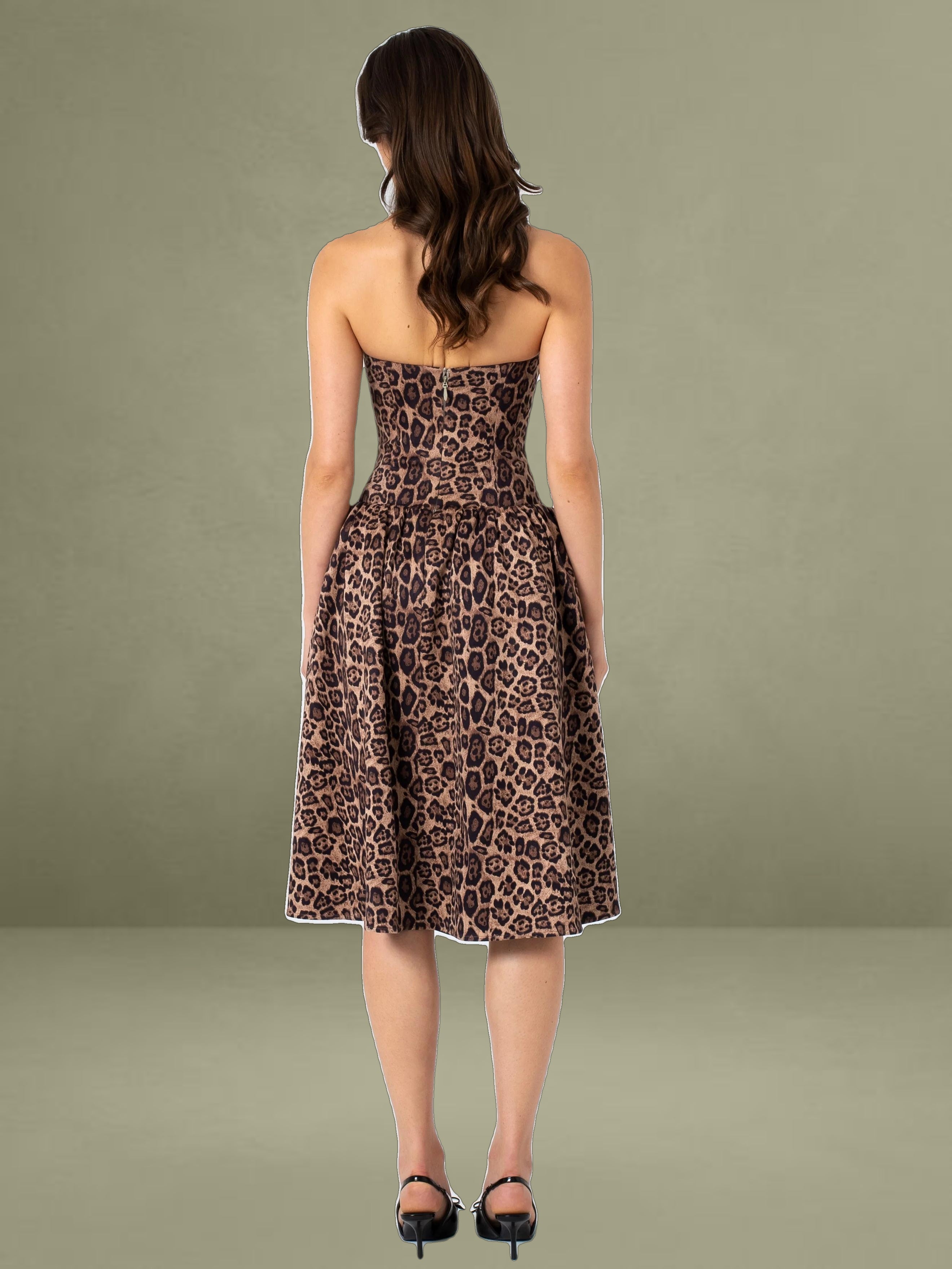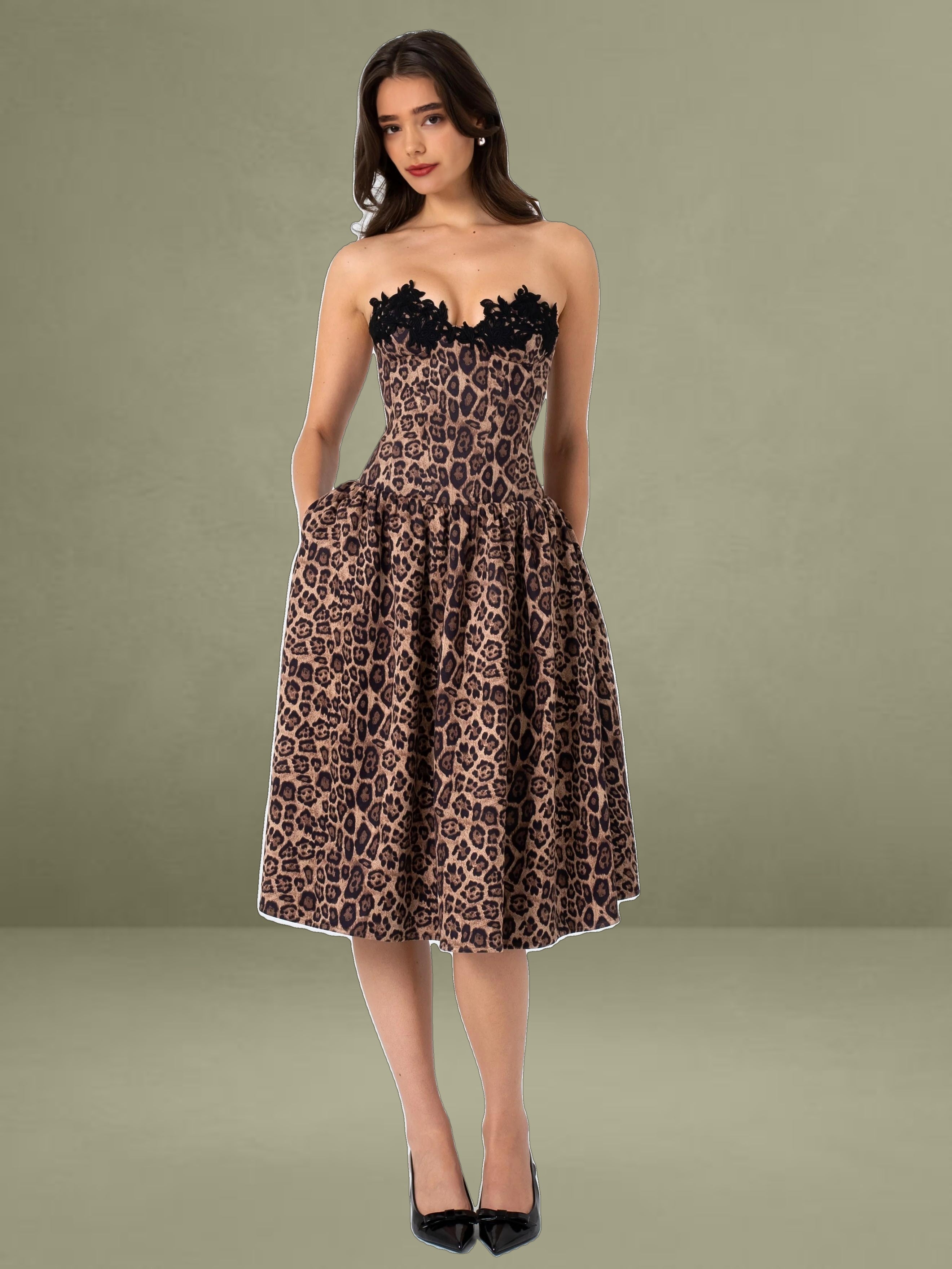 Behold our Uchenna dress, a striking blend of elegance and bold design. Crafted from high-stretch suede adorned with a captivating cheetah print, it exudes confidence and sophistication. The lace trim adds a delicate touch, while the drop waist design creates a flattering, modern silhouette. Padded cups ensure a comfortable and supportive fit, and the dress is fully lined for extra comfort. Finished with an invisible zipper for a seamless look, this dress is perfect for making a memorable impression at any special occasion, combining daring prints with refined details.