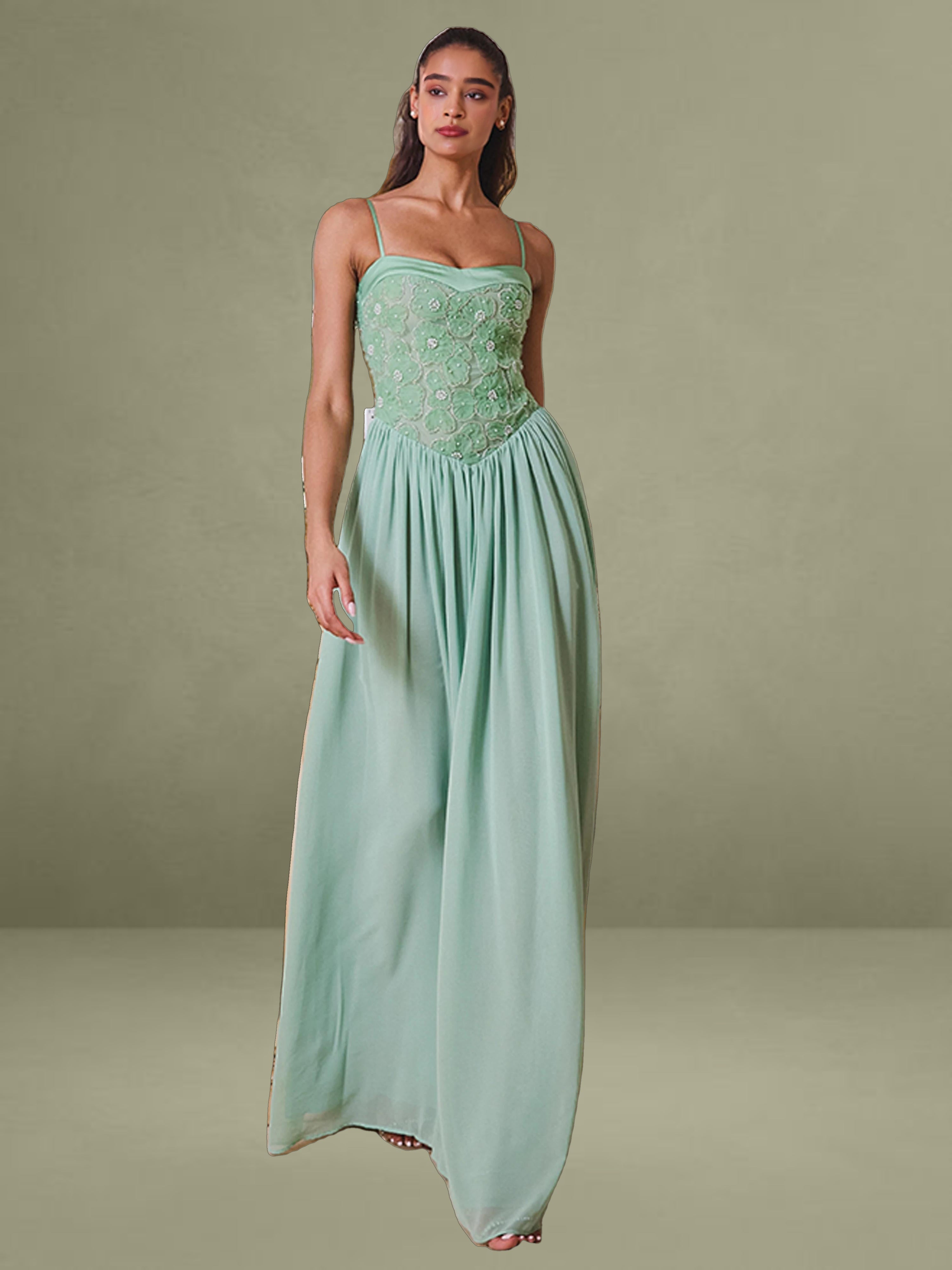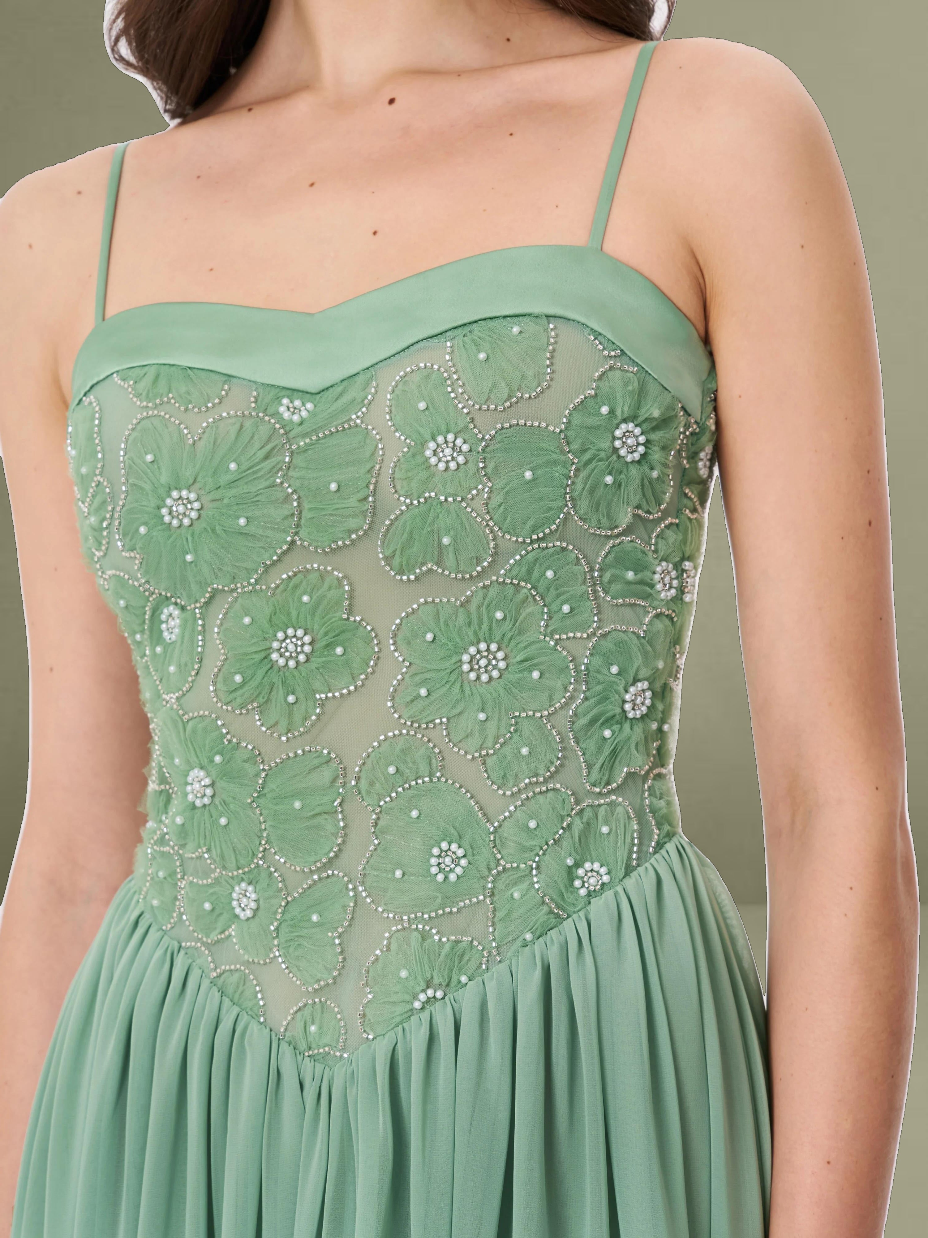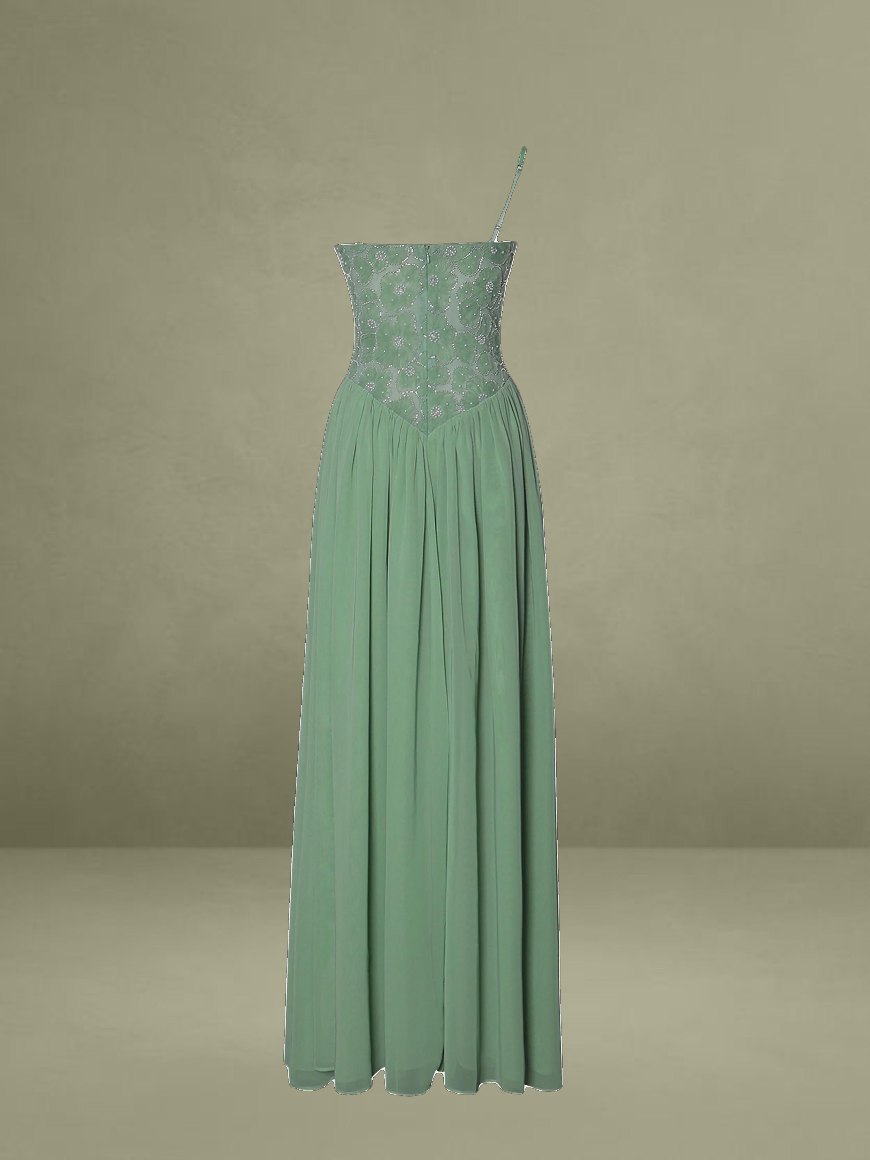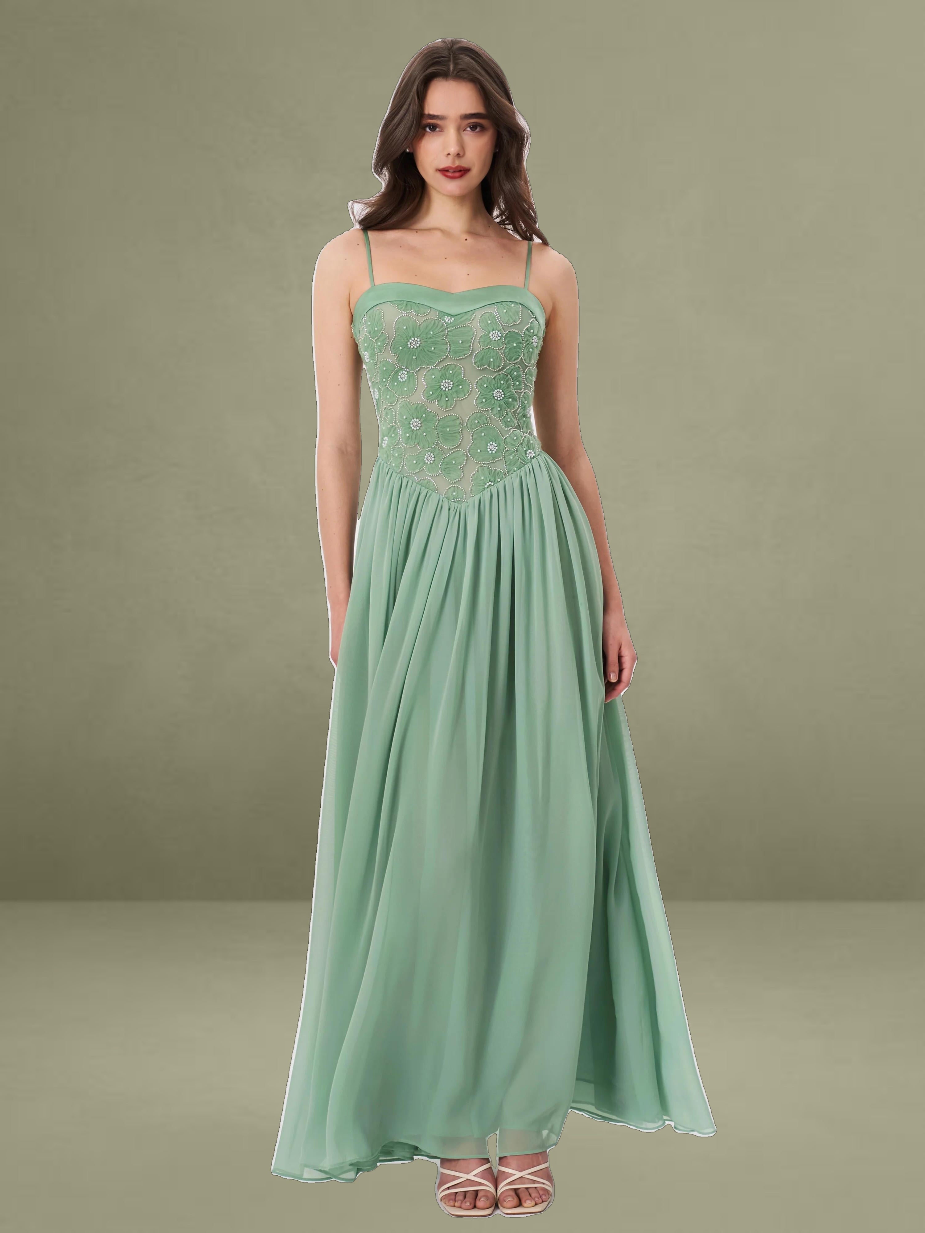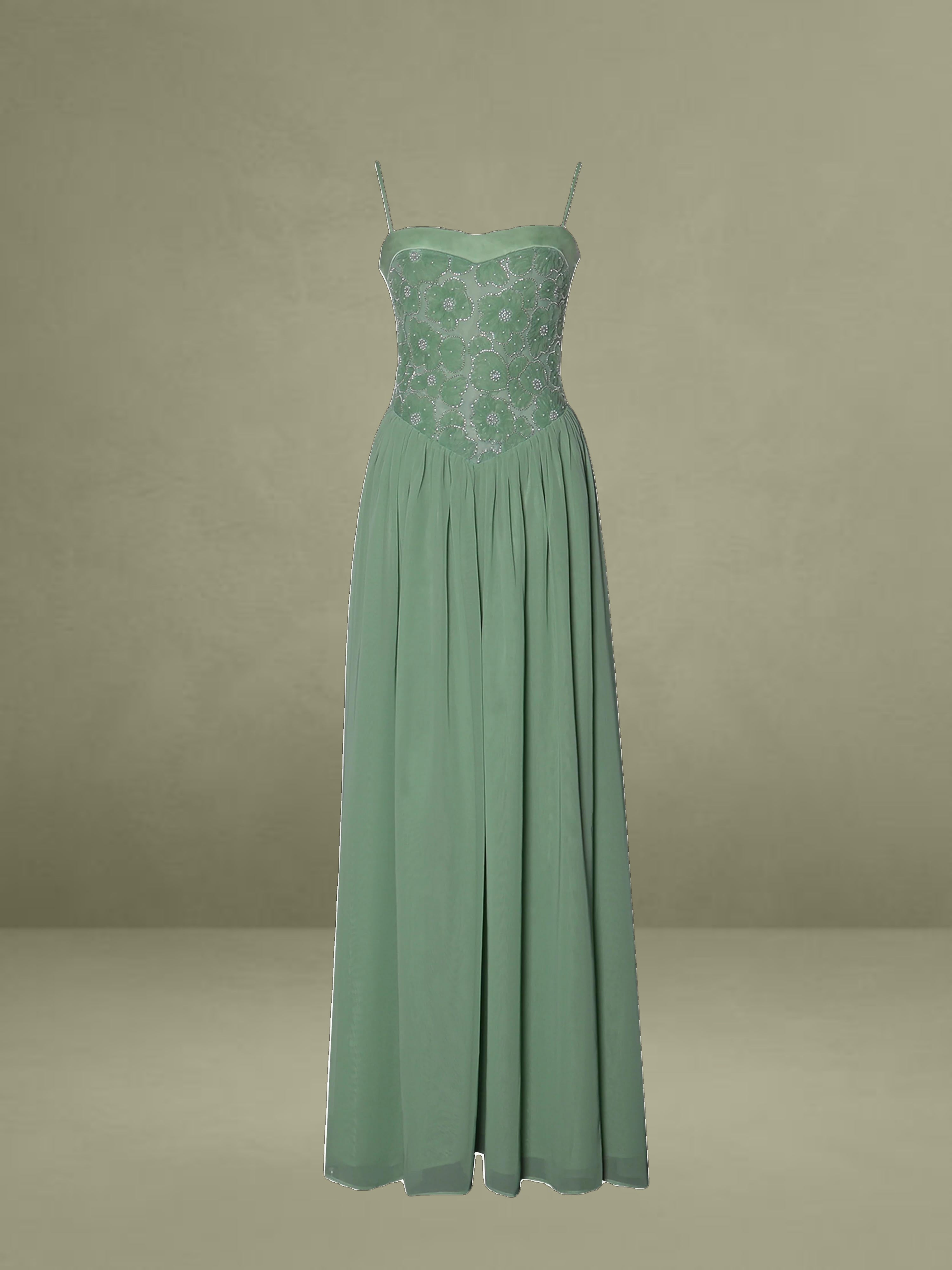 A vision of timeless elegance, the Ucille Dress is the perfect choice for weddings, engagements, formal events, summer celebrations, and birthday parties. Crafted with embroidered beaded floral mesh, this dress exudes romance and sophistication. The delicate satin trim adds a refined touch, while the double-layer chiffon skirt creates an ethereal, flowing silhouette. Designed for both beauty and comfort, it features adjustable straps for a customizable fit, an invisible zipper for a seamless finish, and is fully lined for effortless wear. Whether you're dancing the night away or making a grand entrance, the Ucille Dress is a stunning statement piece for any special occasion.