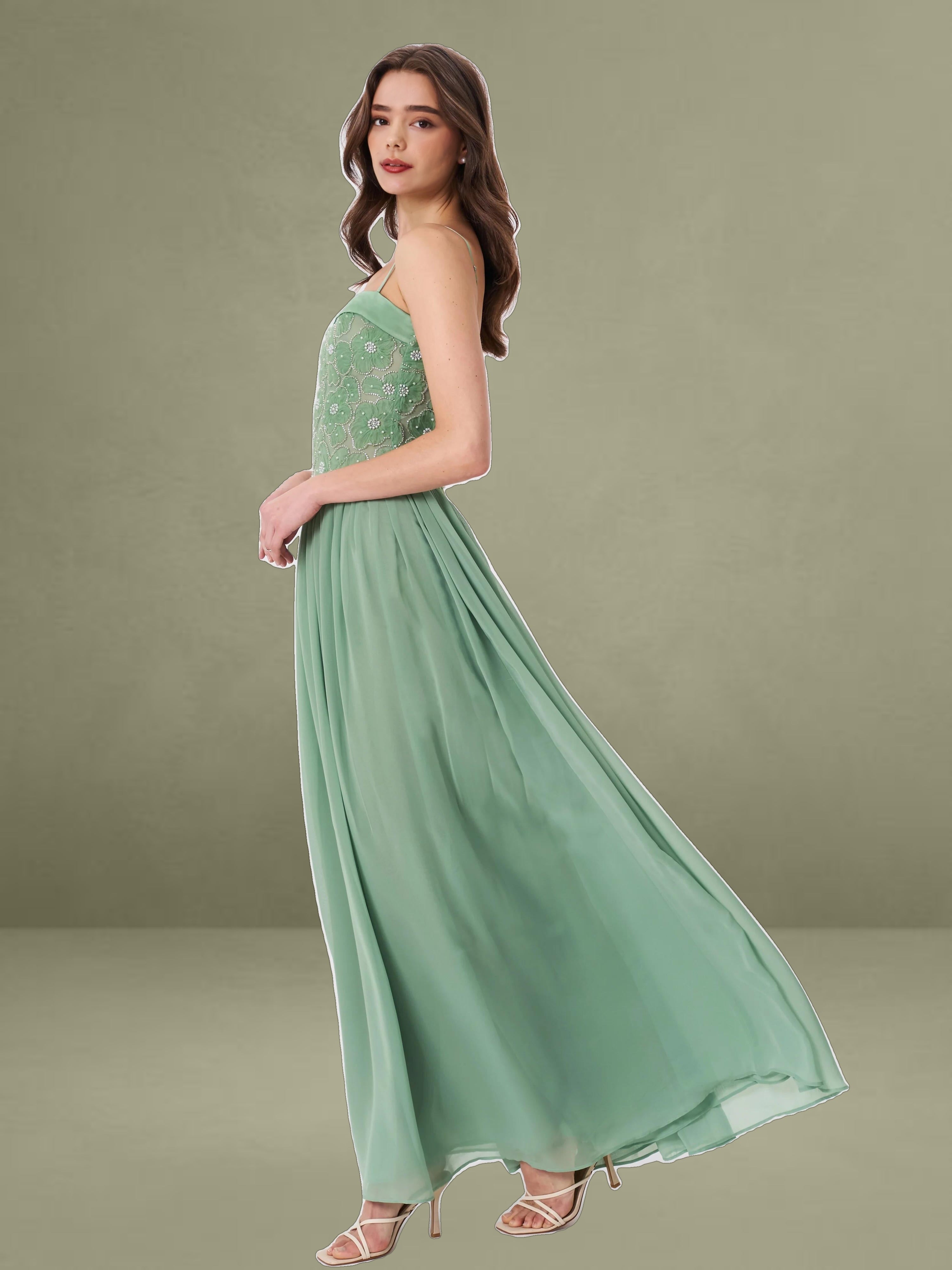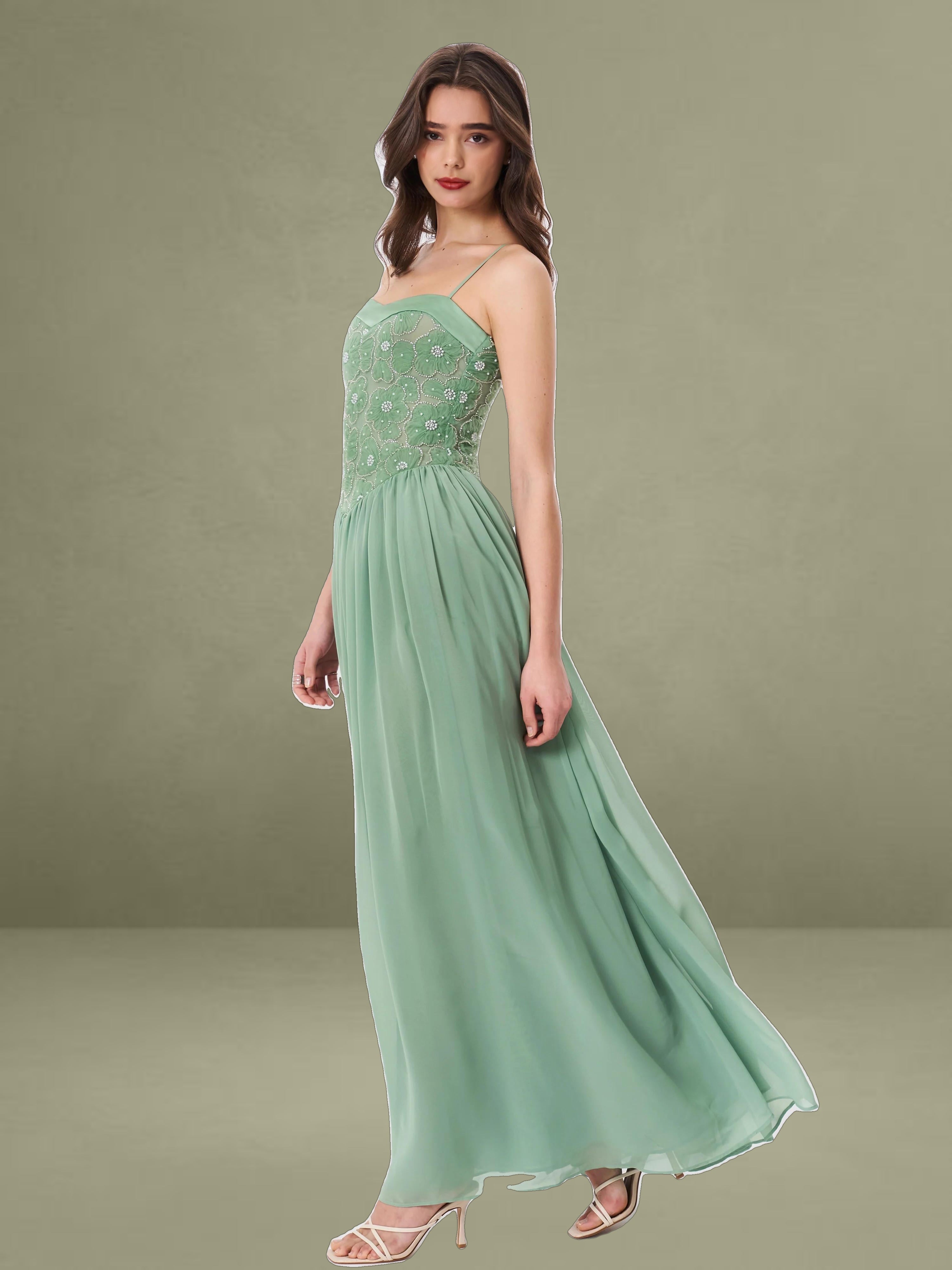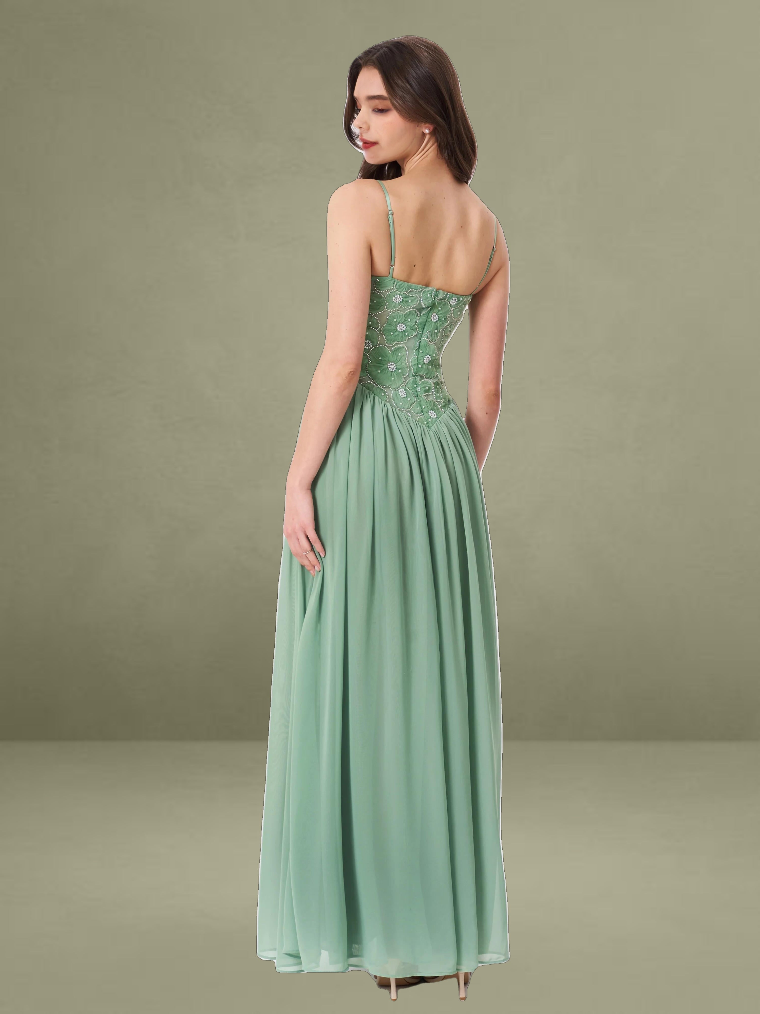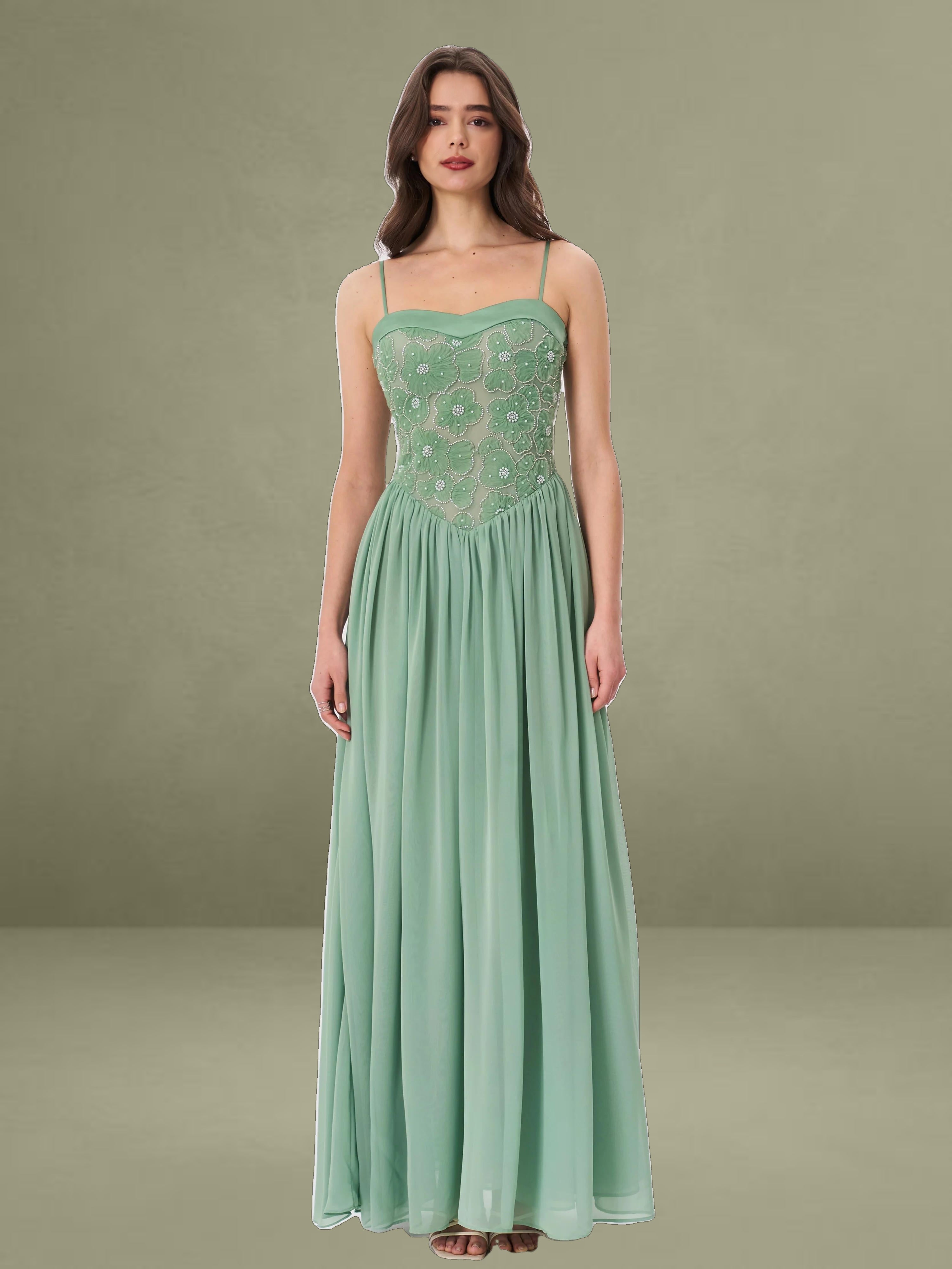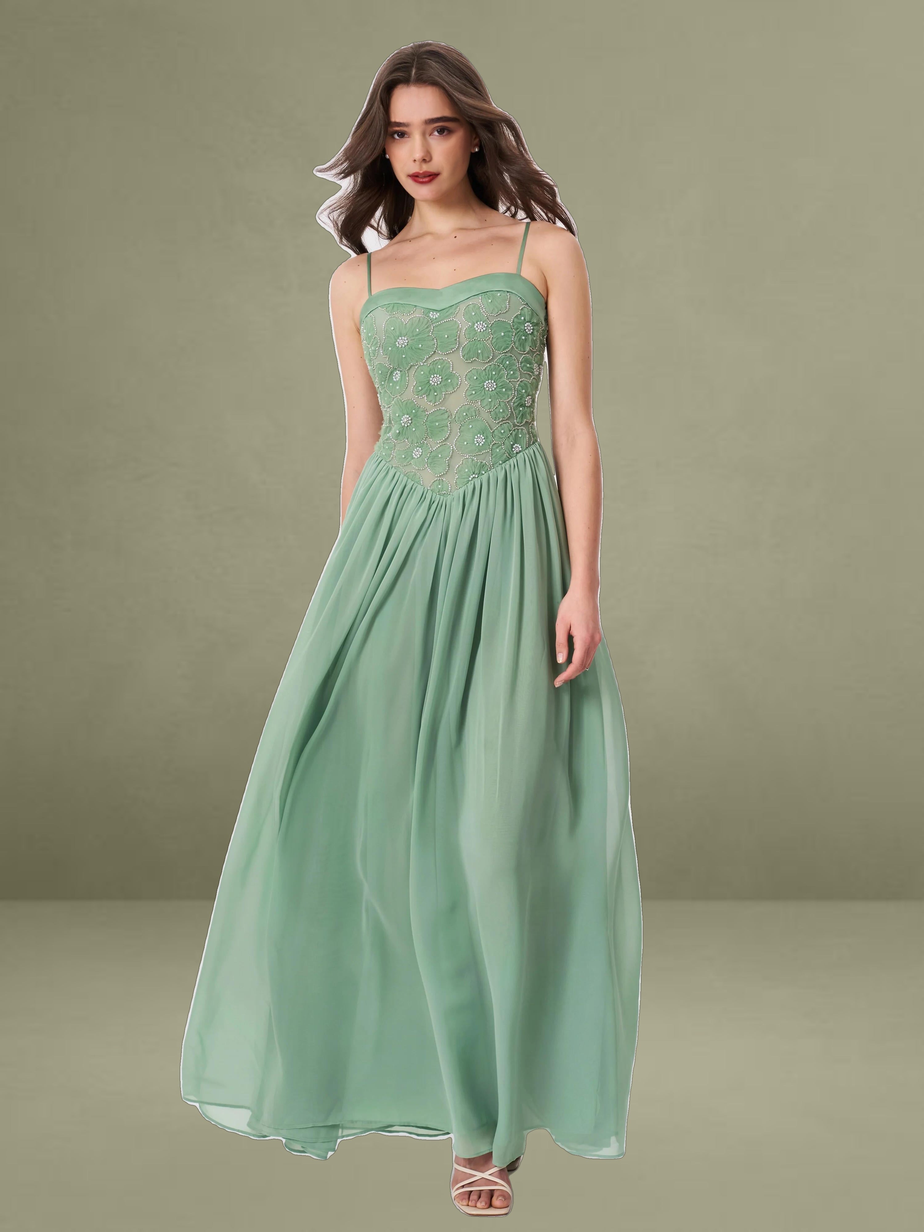 A vision of timeless elegance, the Ucille Dress is the perfect choice for weddings, engagements, formal events, summer celebrations, and birthday parties. Crafted with embroidered beaded floral mesh, this dress exudes romance and sophistication. The delicate satin trim adds a refined touch, while the double-layer chiffon skirt creates an ethereal, flowing silhouette. Designed for both beauty and comfort, it features adjustable straps for a customizable fit, an invisible zipper for a seamless finish, and is fully lined for effortless wear. Whether you're dancing the night away or making a grand entrance, the Ucille Dress is a stunning statement piece for any special occasion.
