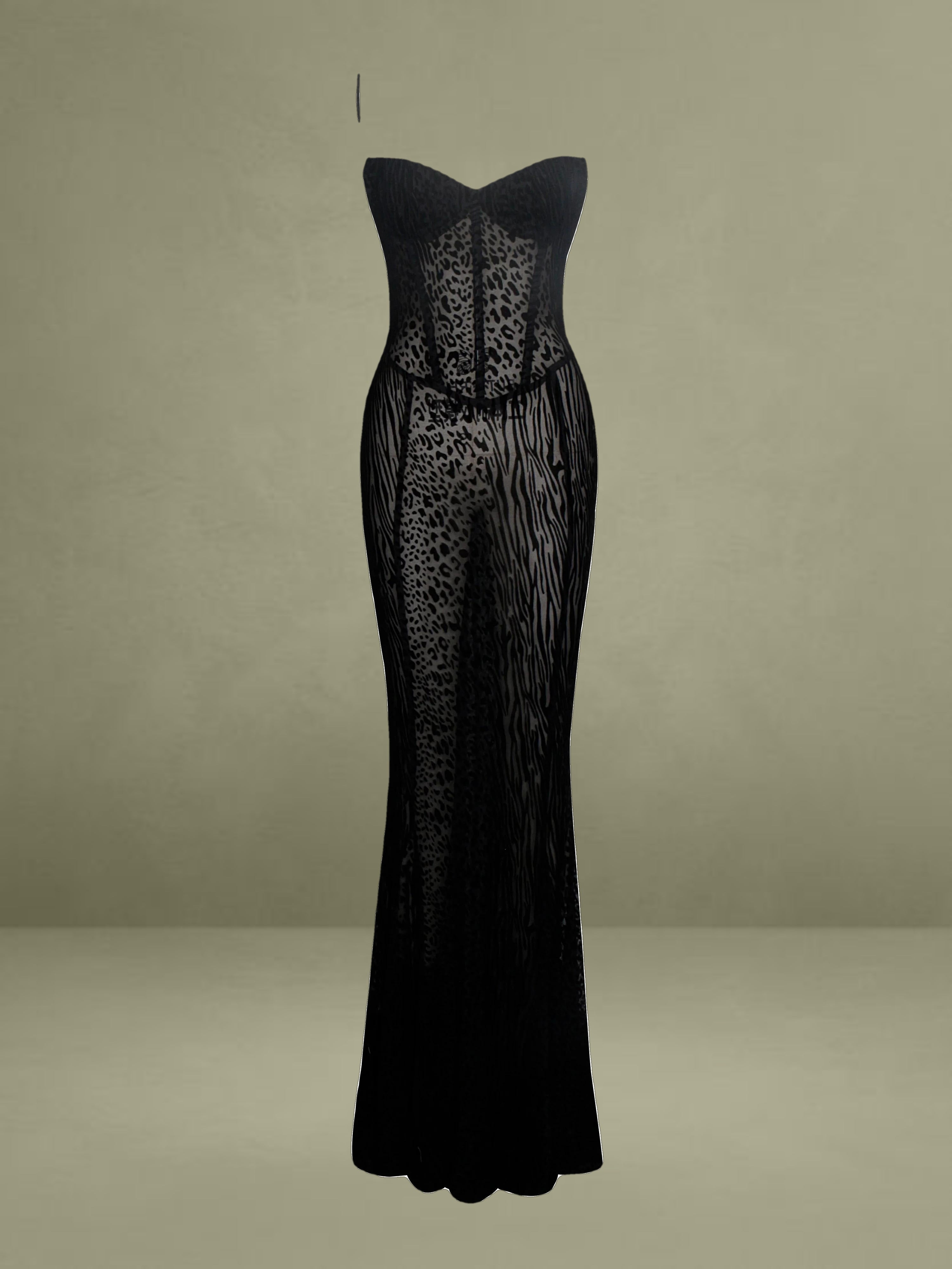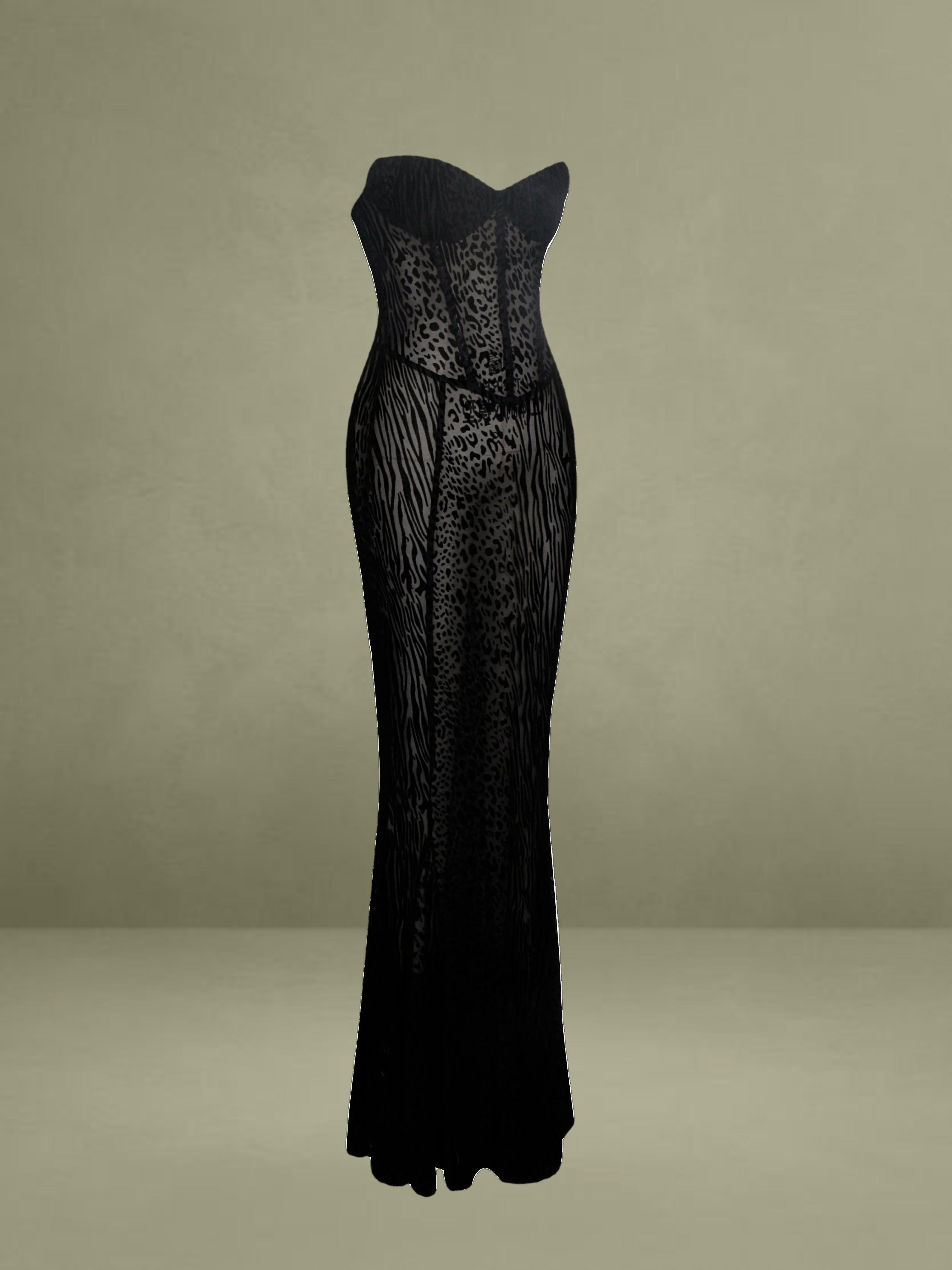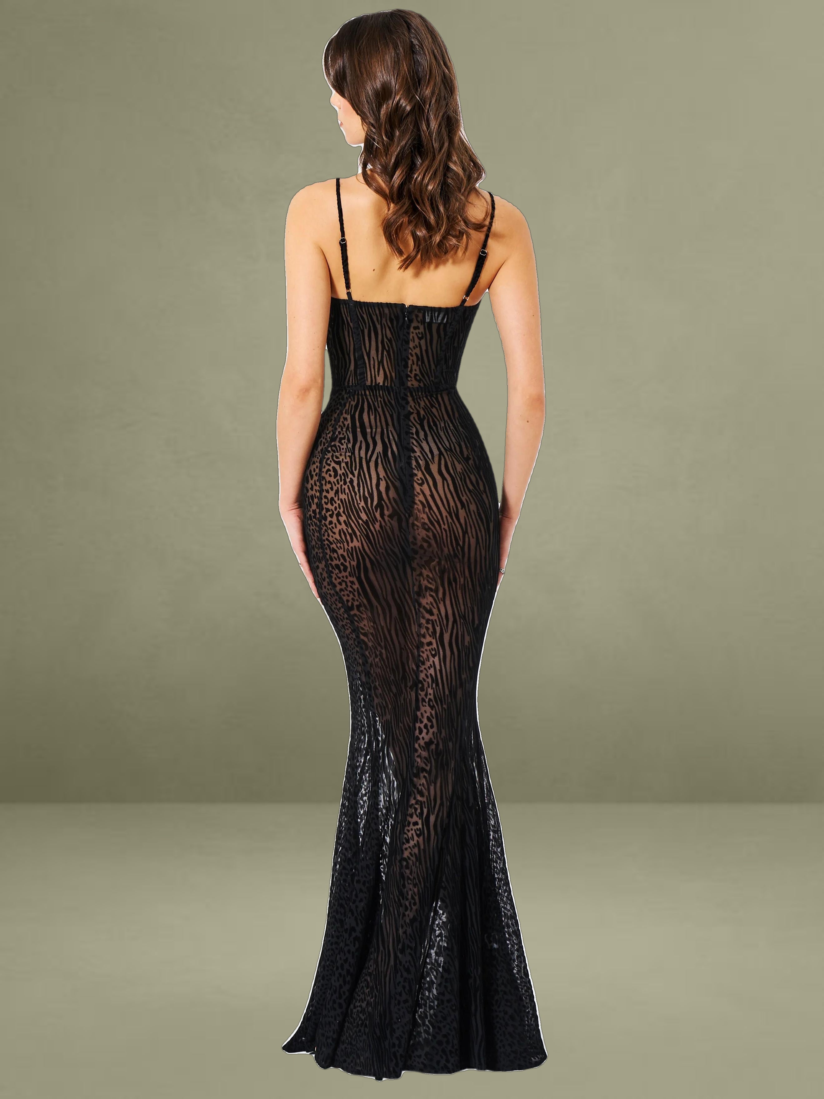Say hello to our newest favorite, Ulani, a velvet burnout cheetah print maxi dress that combines allure with sophistication. The fully boned corset at the bodice accentuates your curves with its “V” shaped waistline. This design also features ruched cups with a mesh lining on the inside and adjustable thin straps for a perfect fit. Crafted from high-stretch velvet burnout mesh, its semi-sheer allure is perfect for a night out, birthday party, vacation, or any special occasion. The invisible zipper down the center back ensures a seamless look. Choose between classic black or luxurious gold to make a bold statement. Elevate your style with this extra-flared mermaid silhouette masterpiece!