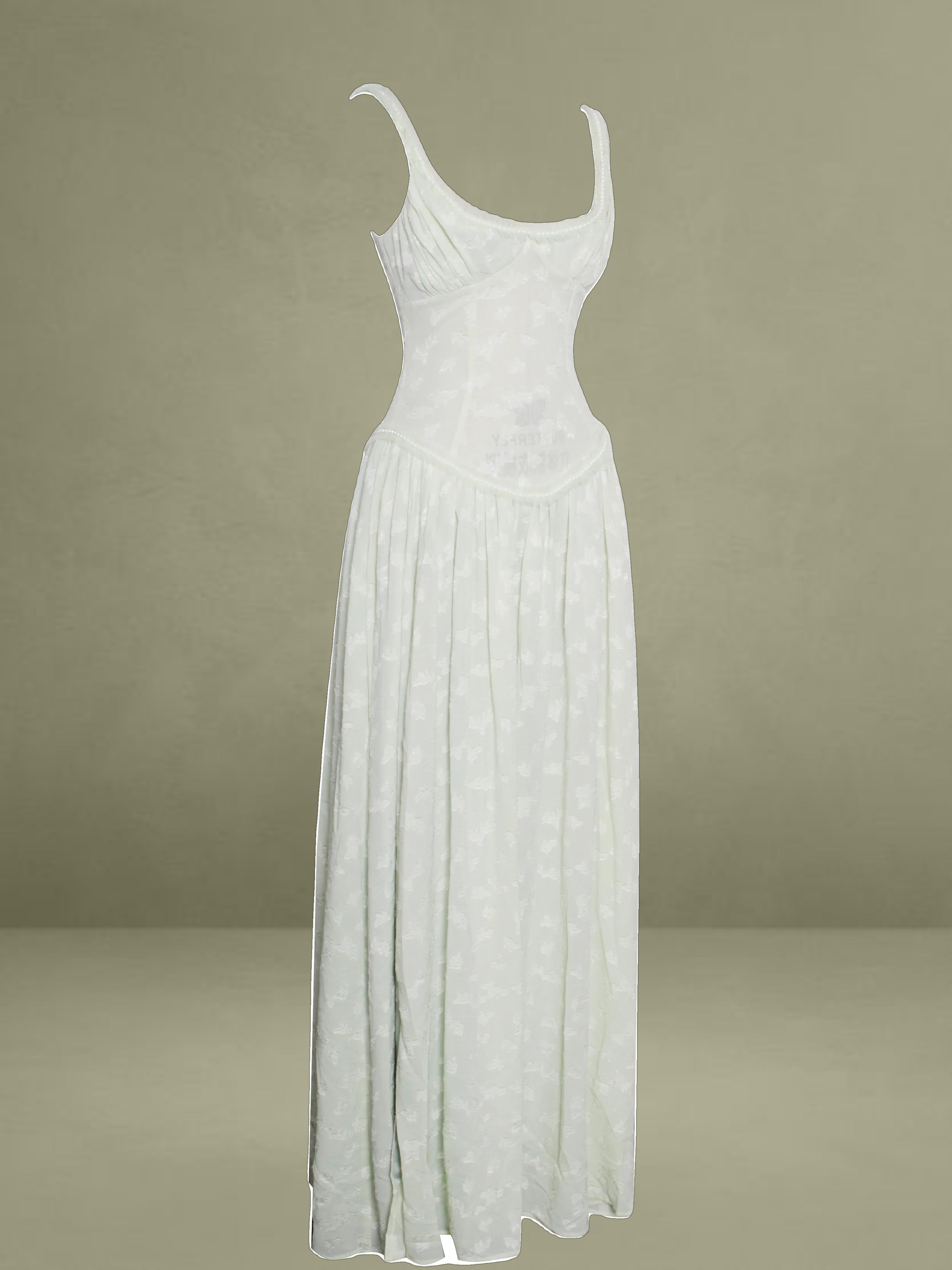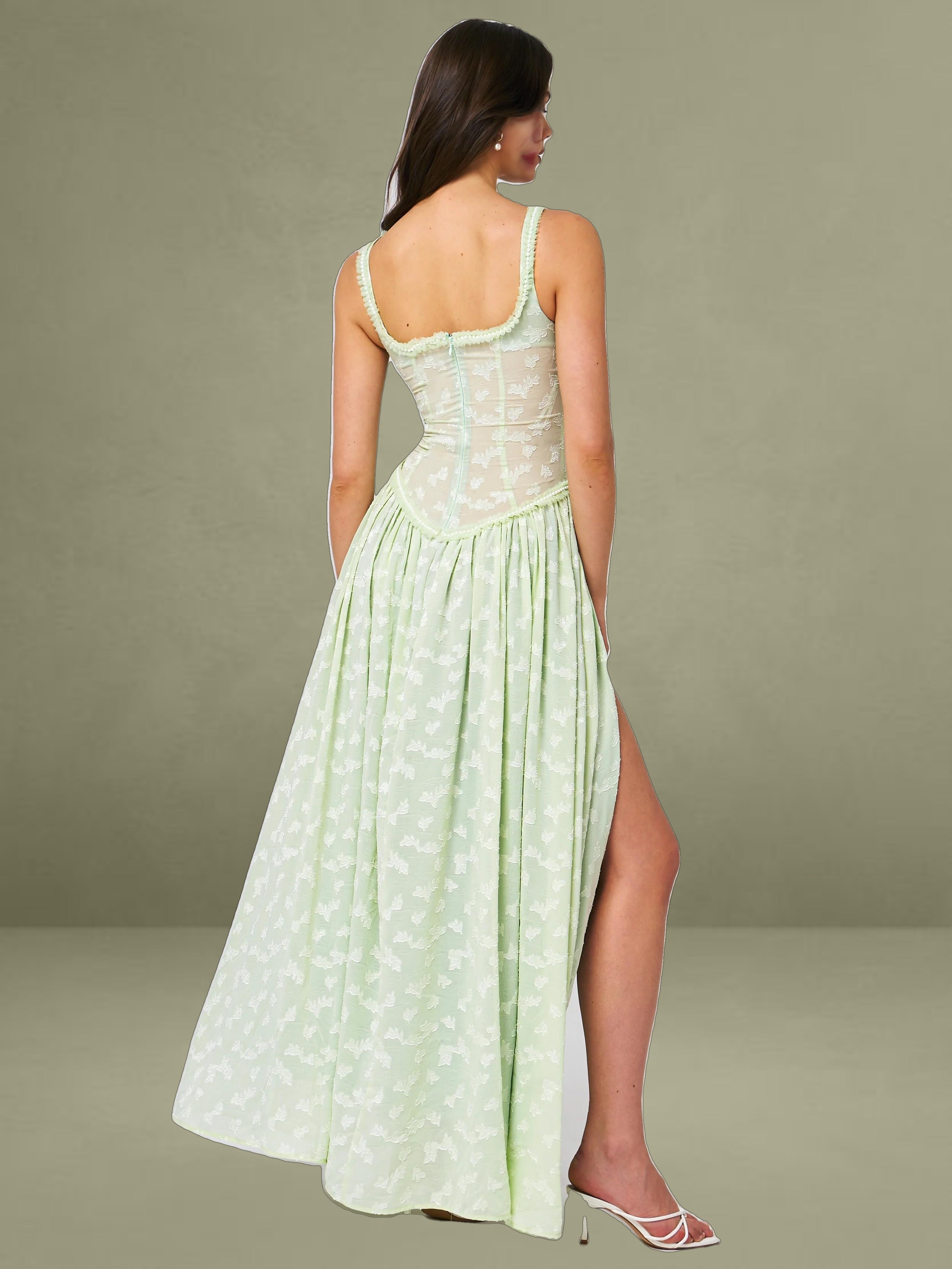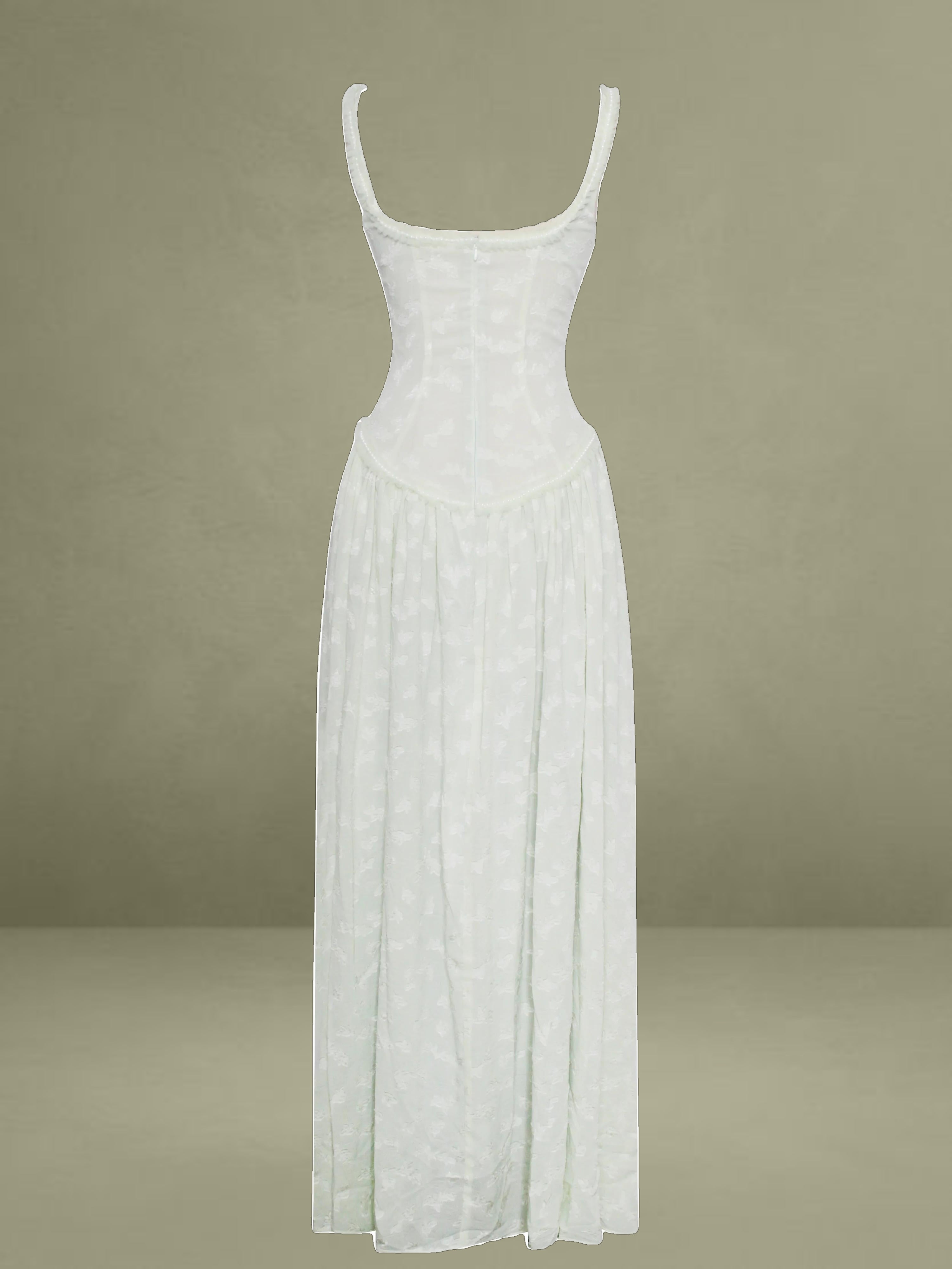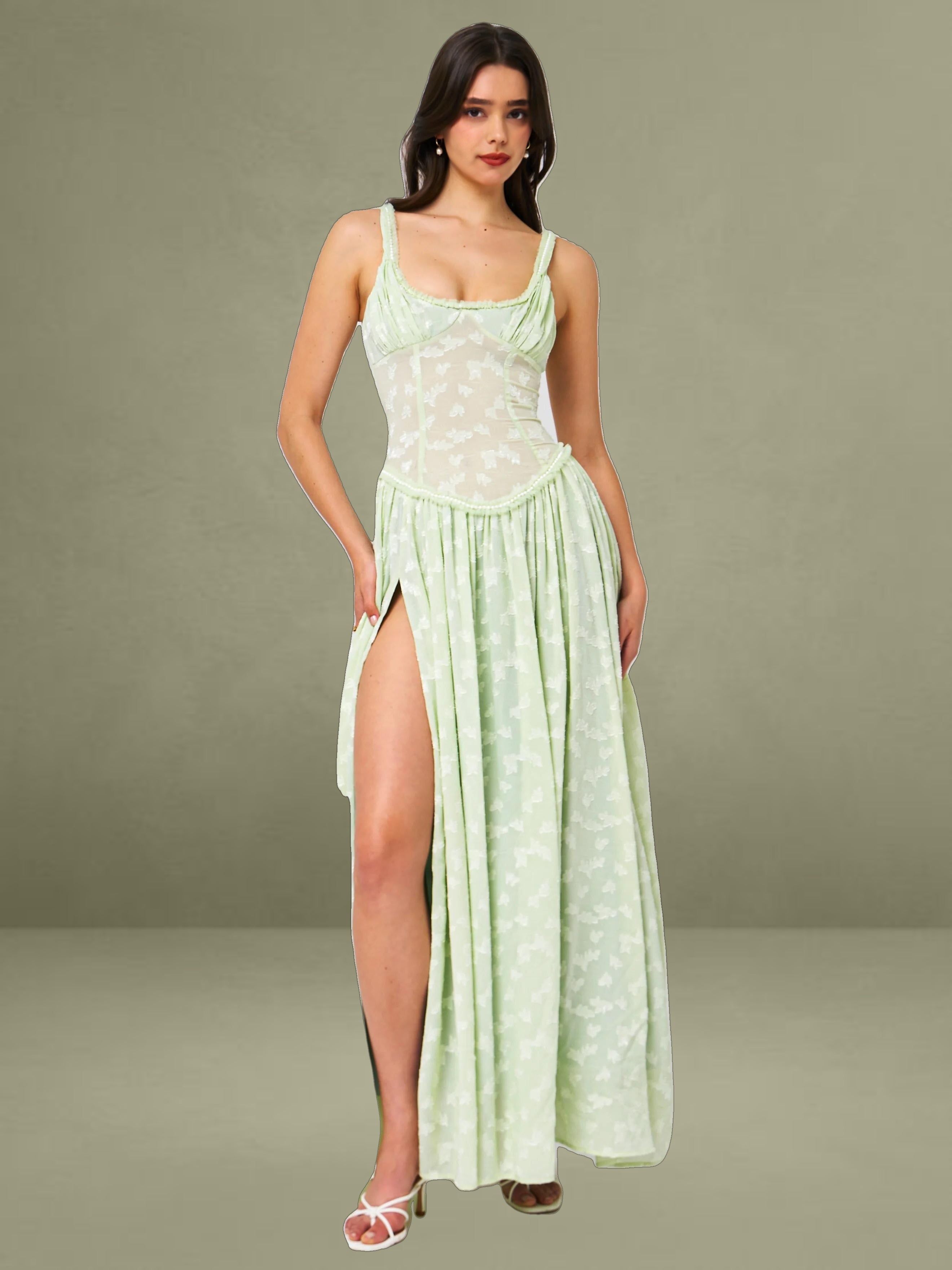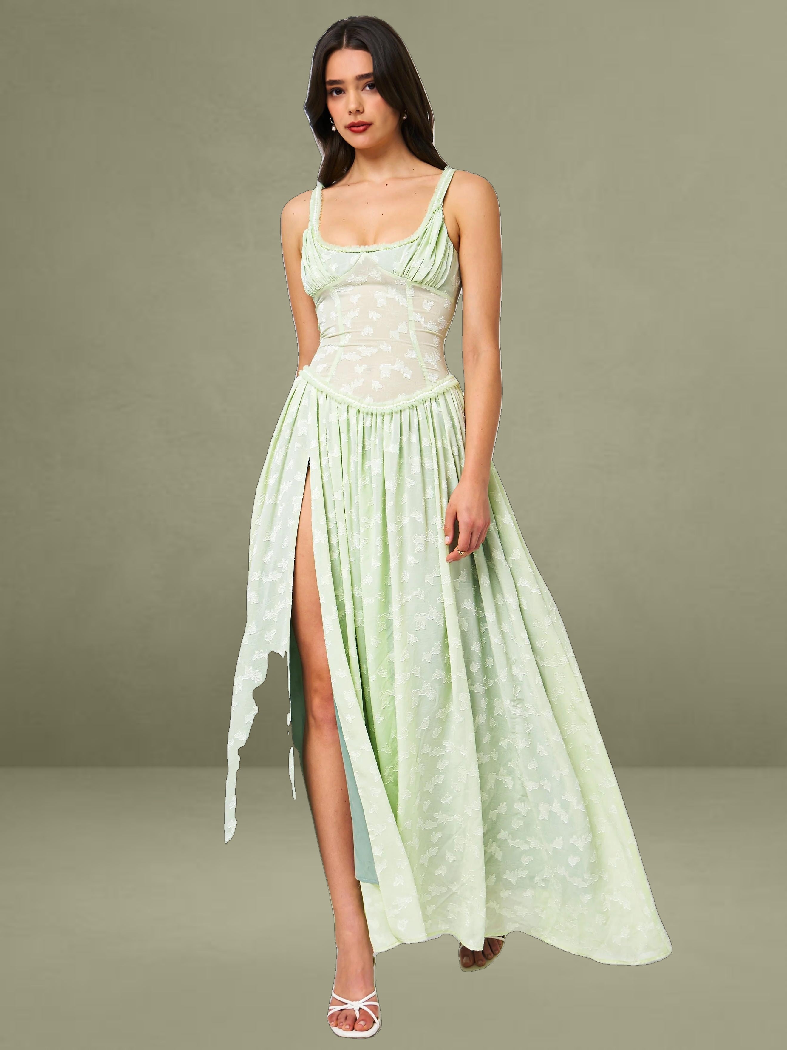 Meet the Ulissa dress, a fusion of elegance and modern sophistication. Fully lined for ultimate comfort, this jacquard textured maxi dress boasts a striking square neckline embellished with pearl decorations. The drop waist seamlessly transitions into a high-slit skirt, lending a dramatic flair to the silhouette. Delicate pleated mesh trim adds a touch of femininity, while an invisible zipper at the center back ensures a flawless finish. Suitable for any formal occasion, this dress effortlessly blends timeless charm with contemporary style, making it a standout piece in any wardrobe.
