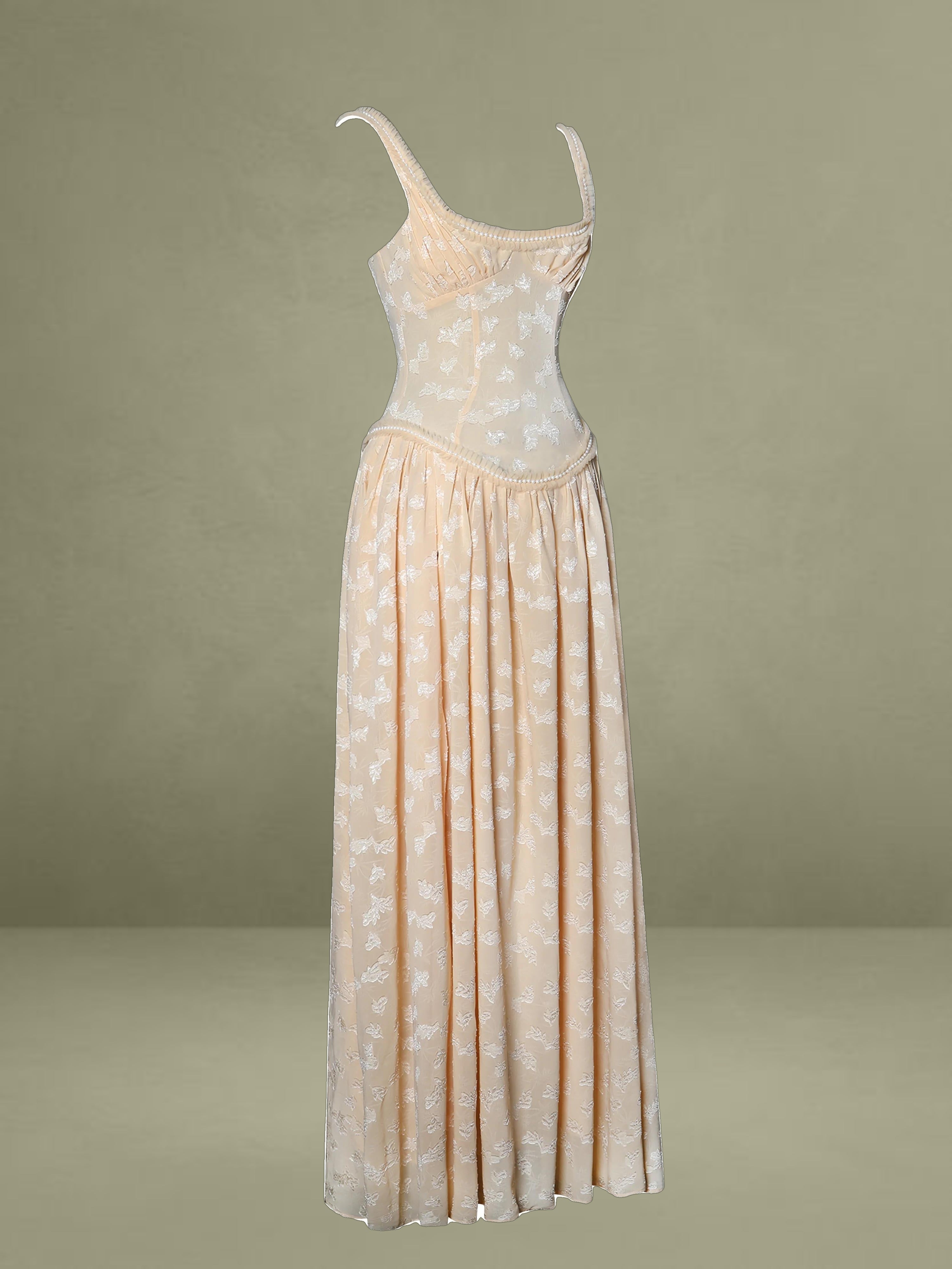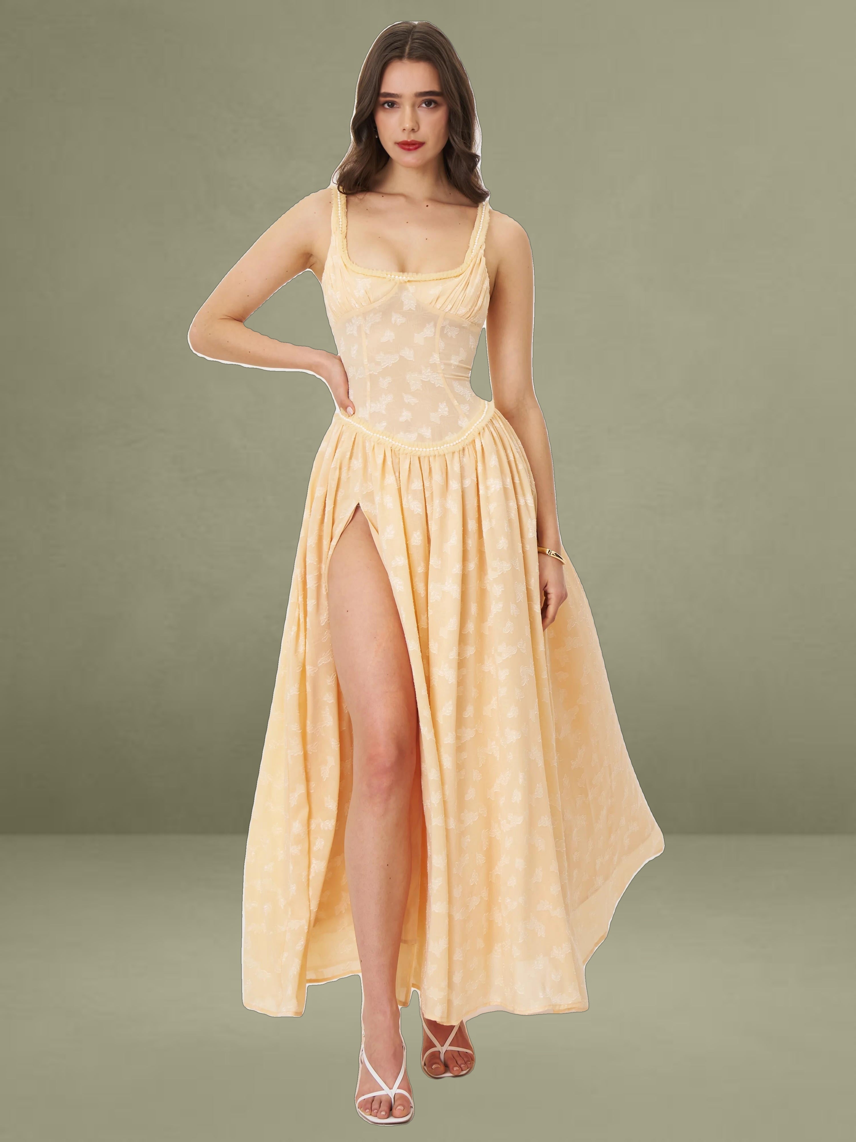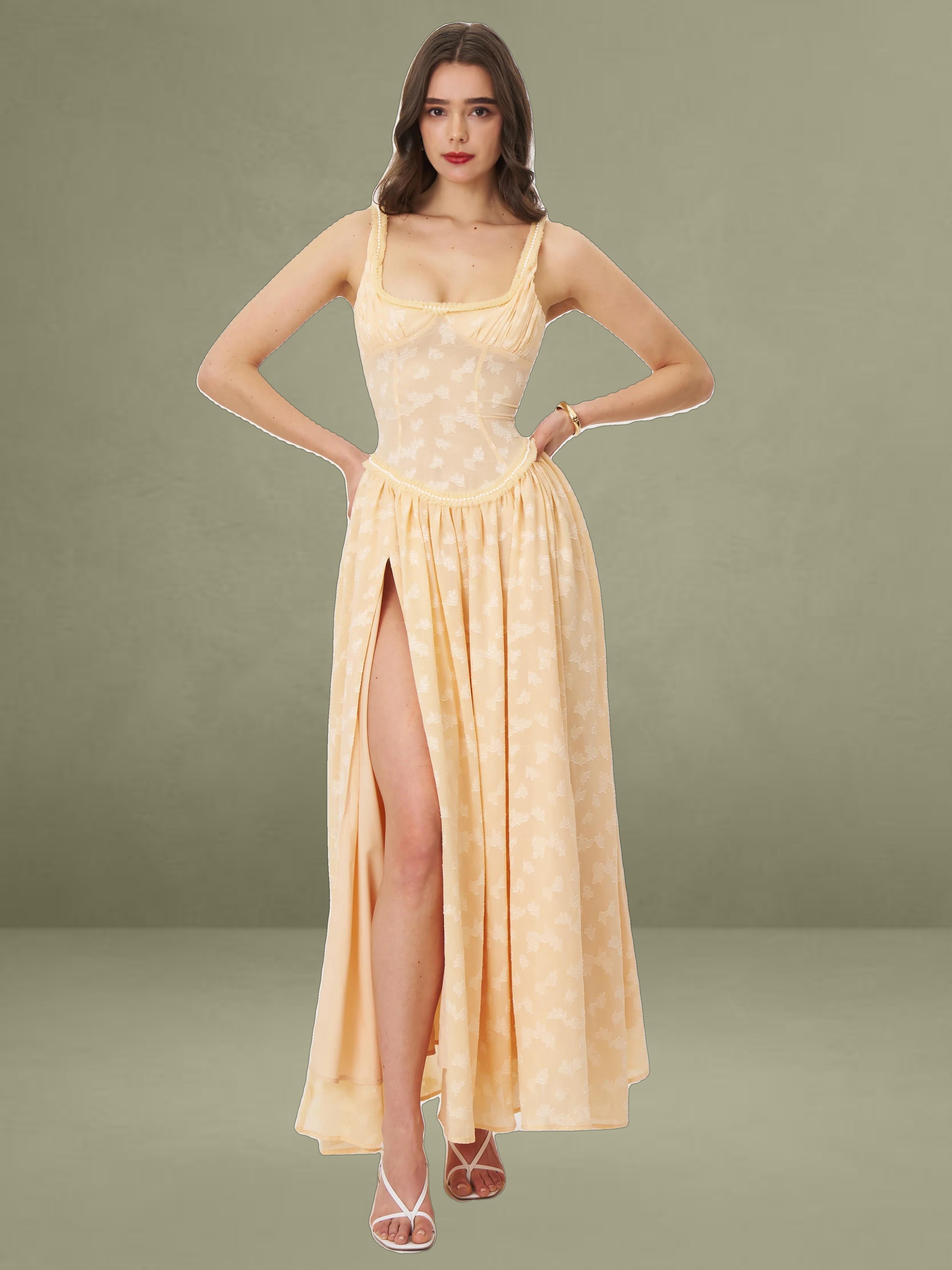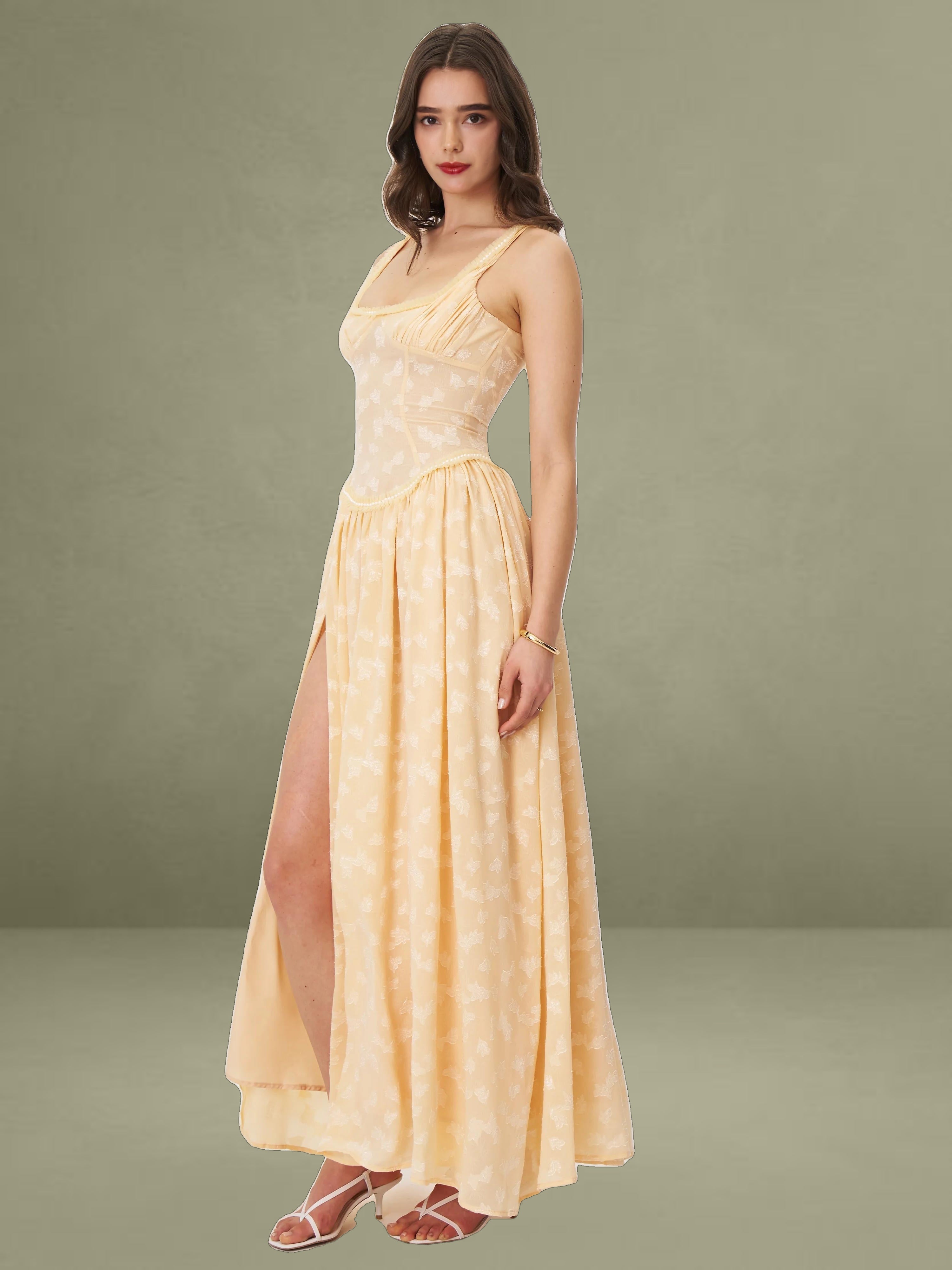 Meet the Ulissa dress, a fusion of elegance and modern sophistication. Fully lined for ultimate comfort, this jacquard textured maxi dress boasts a striking square neckline embellished with pearl decorations. The drop waist seamlessly transitions into a high-slit skirt, lending a dramatic flair to the silhouette. Delicate pleated mesh trim adds a touch of femininity, while an invisible zipper at the center back ensures a flawless finish. Suitable for any formal occasion, this dress effortlessly blends timeless charm with contemporary style, making it a standout piece in any wardrobe. It is also available in Light Green and White.