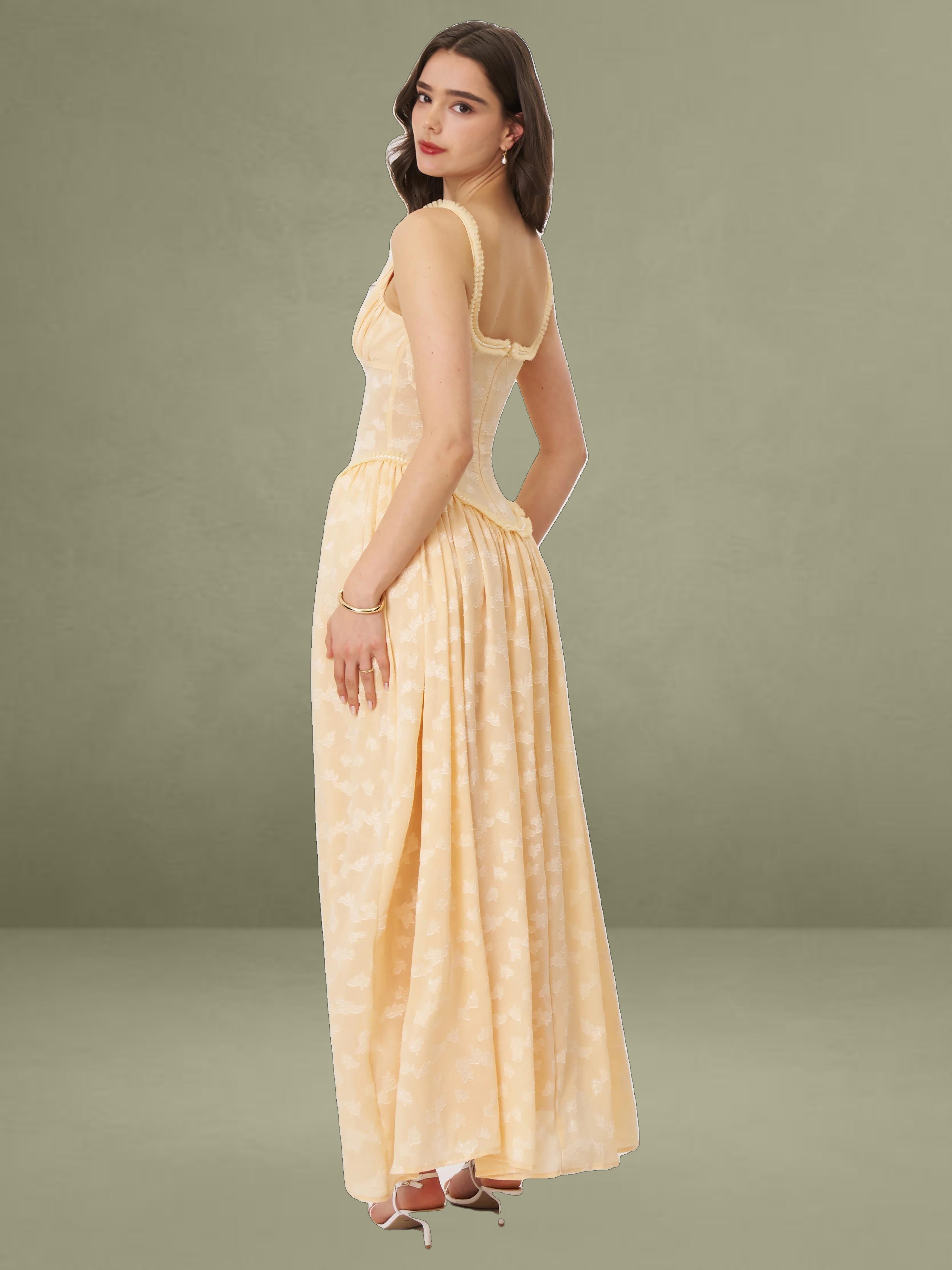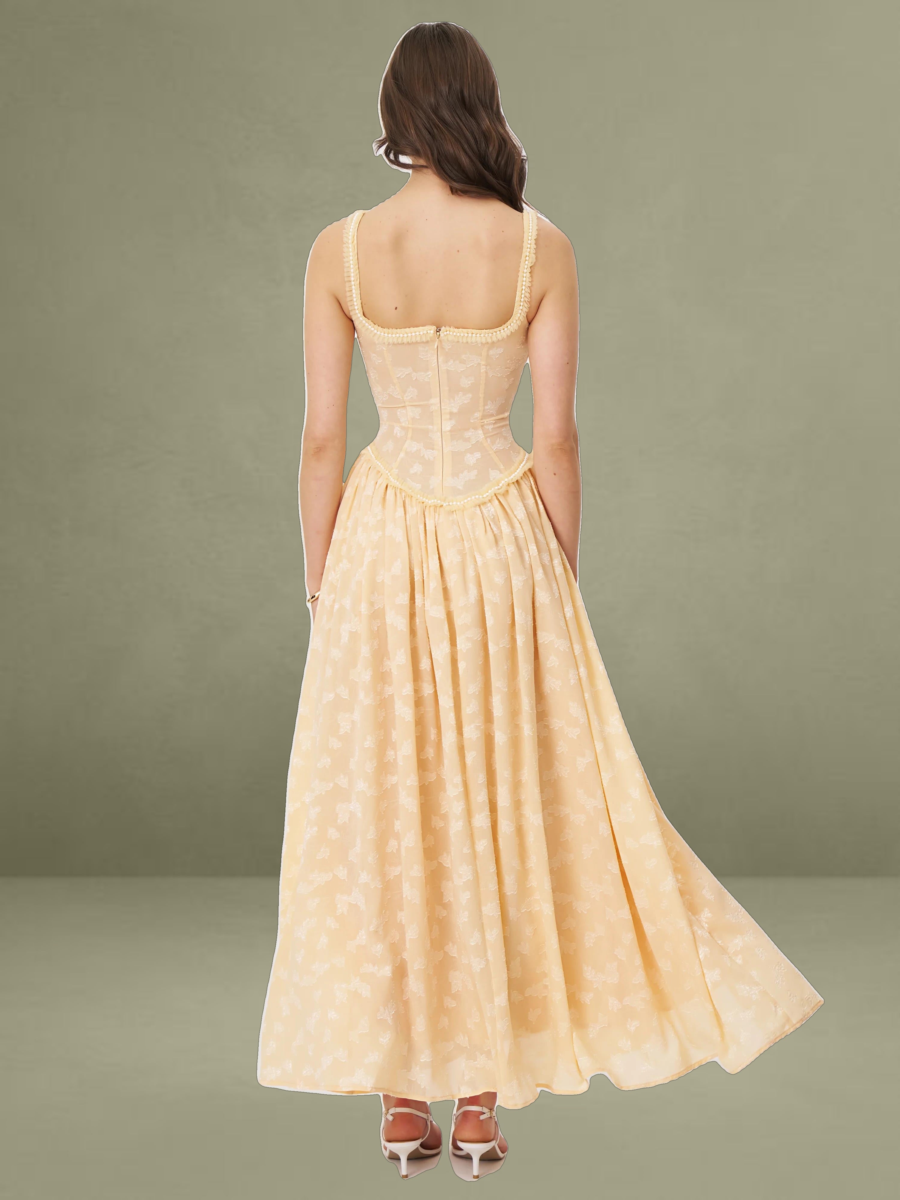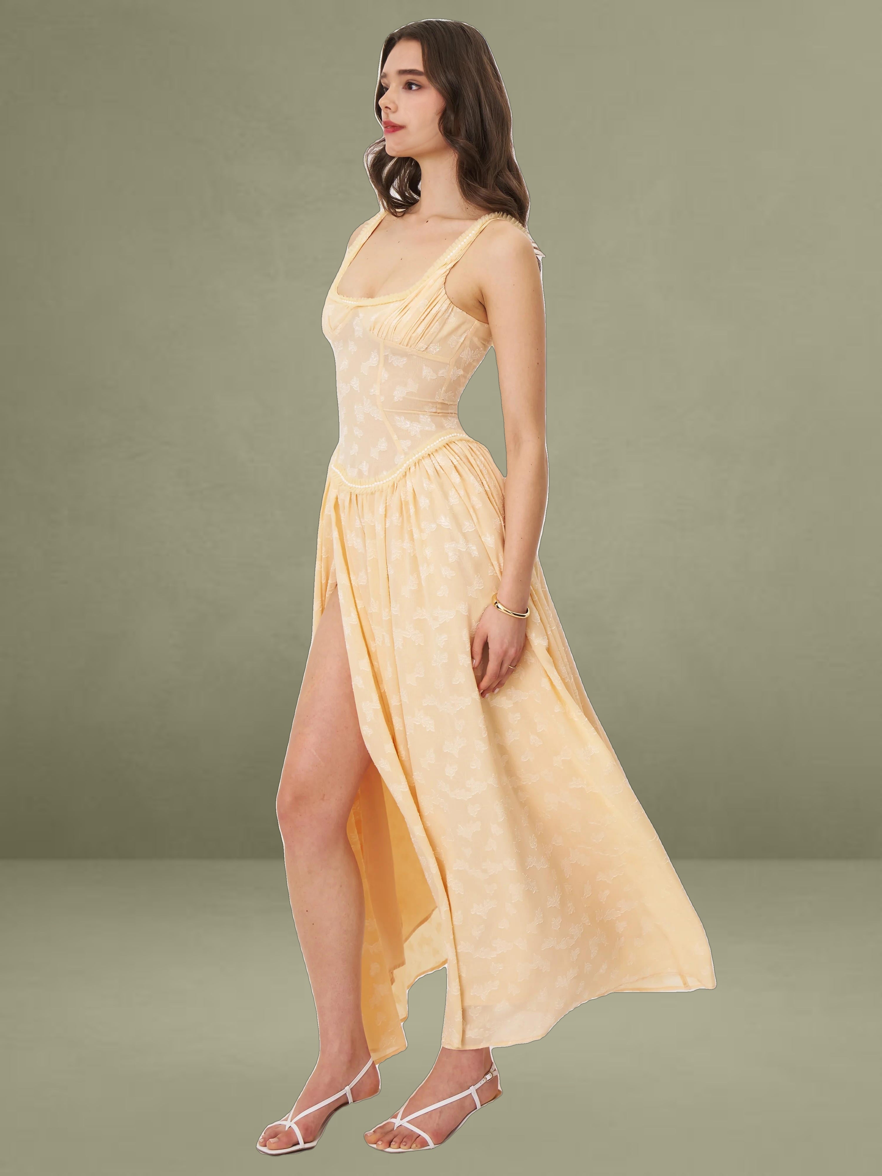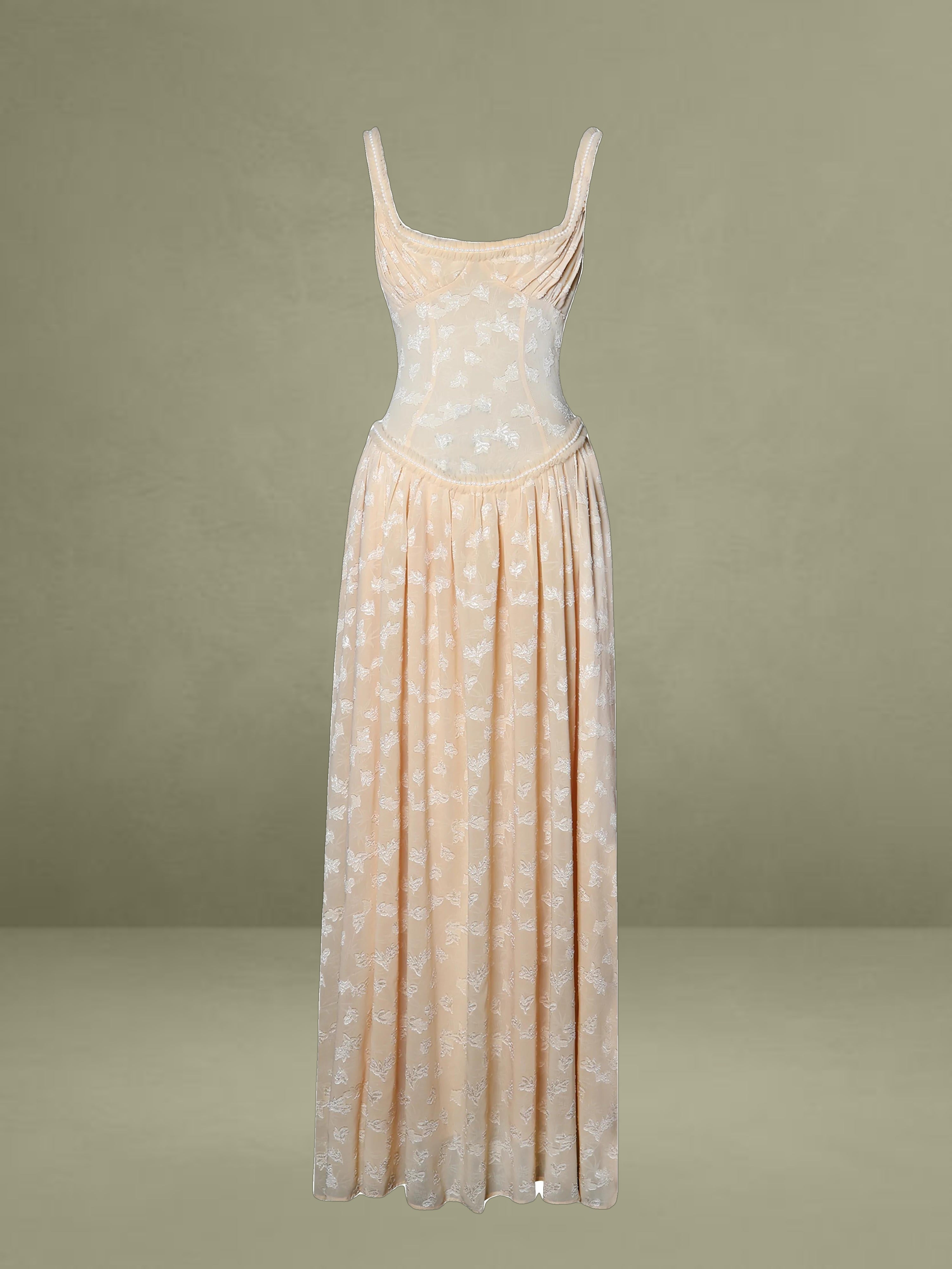 Meet the Ulissa dress, a fusion of elegance and modern sophistication. Fully lined for ultimate comfort, this jacquard textured maxi dress boasts a striking square neckline embellished with pearl decorations. The drop waist seamlessly transitions into a high-slit skirt, lending a dramatic flair to the silhouette. Delicate pleated mesh trim adds a touch of femininity, while an invisible zipper at the center back ensures a flawless finish. Suitable for any formal occasion, this dress effortlessly blends timeless charm with contemporary style, making it a standout piece in any wardrobe. It is also available in Light Green and White.