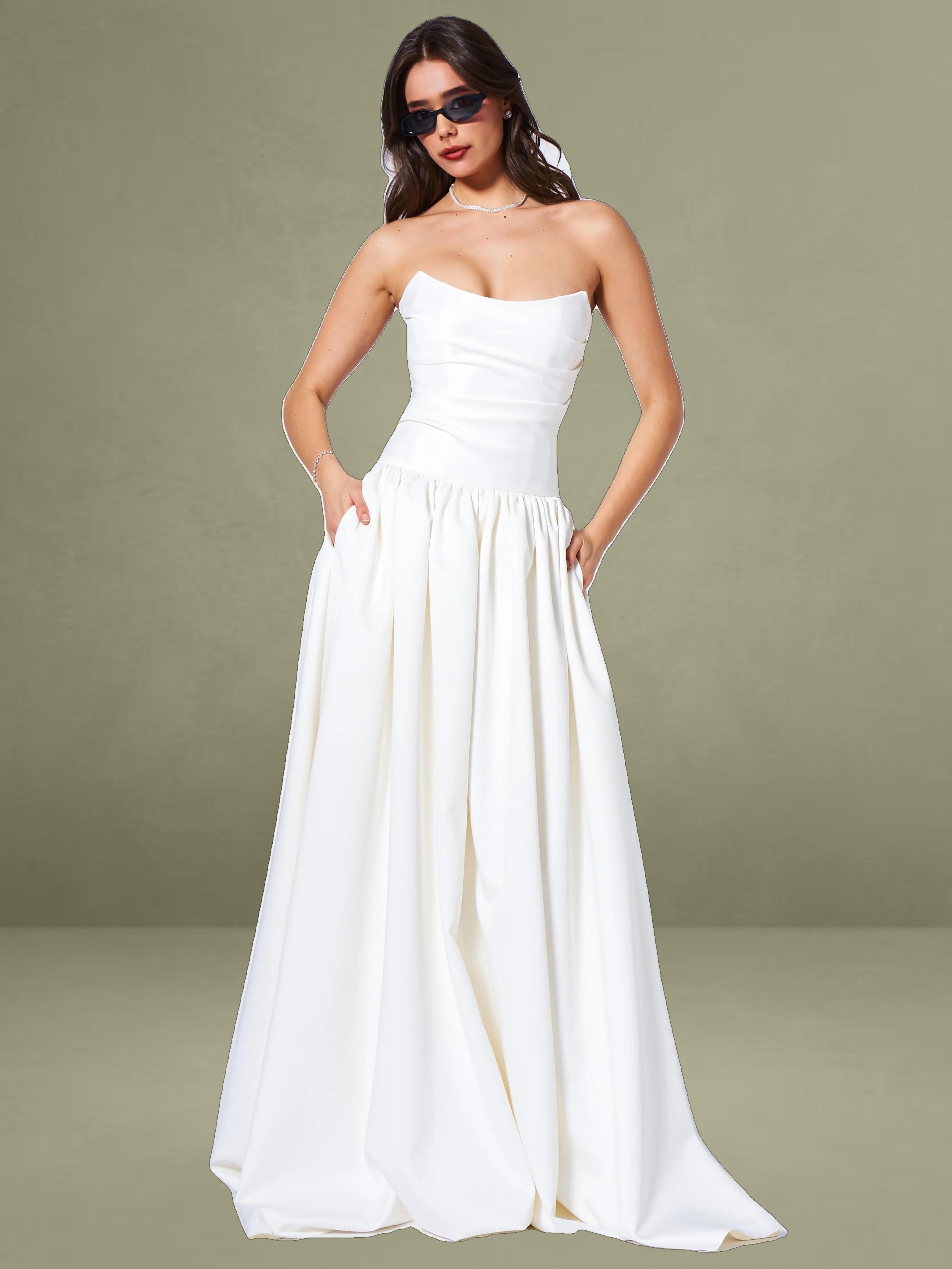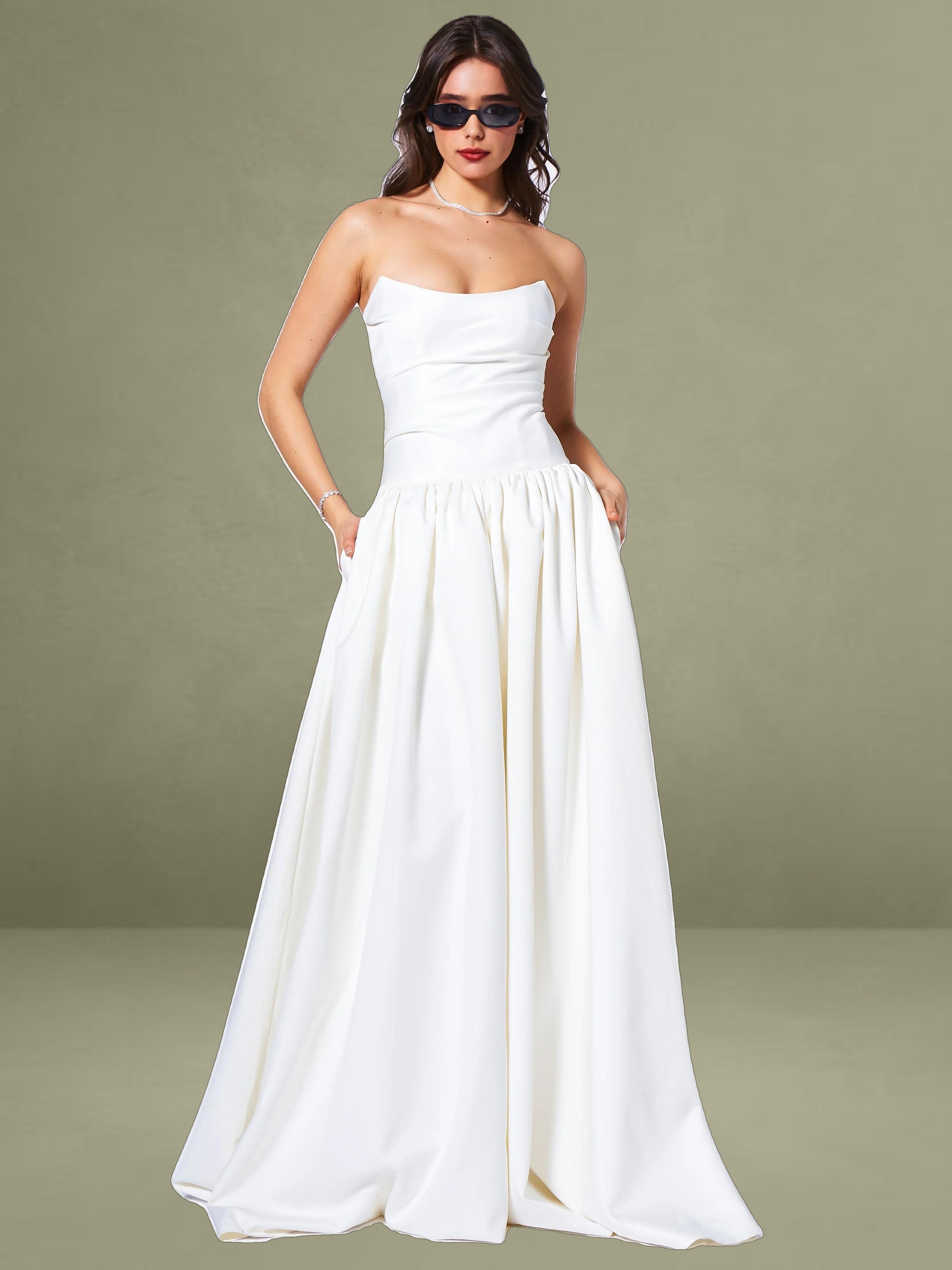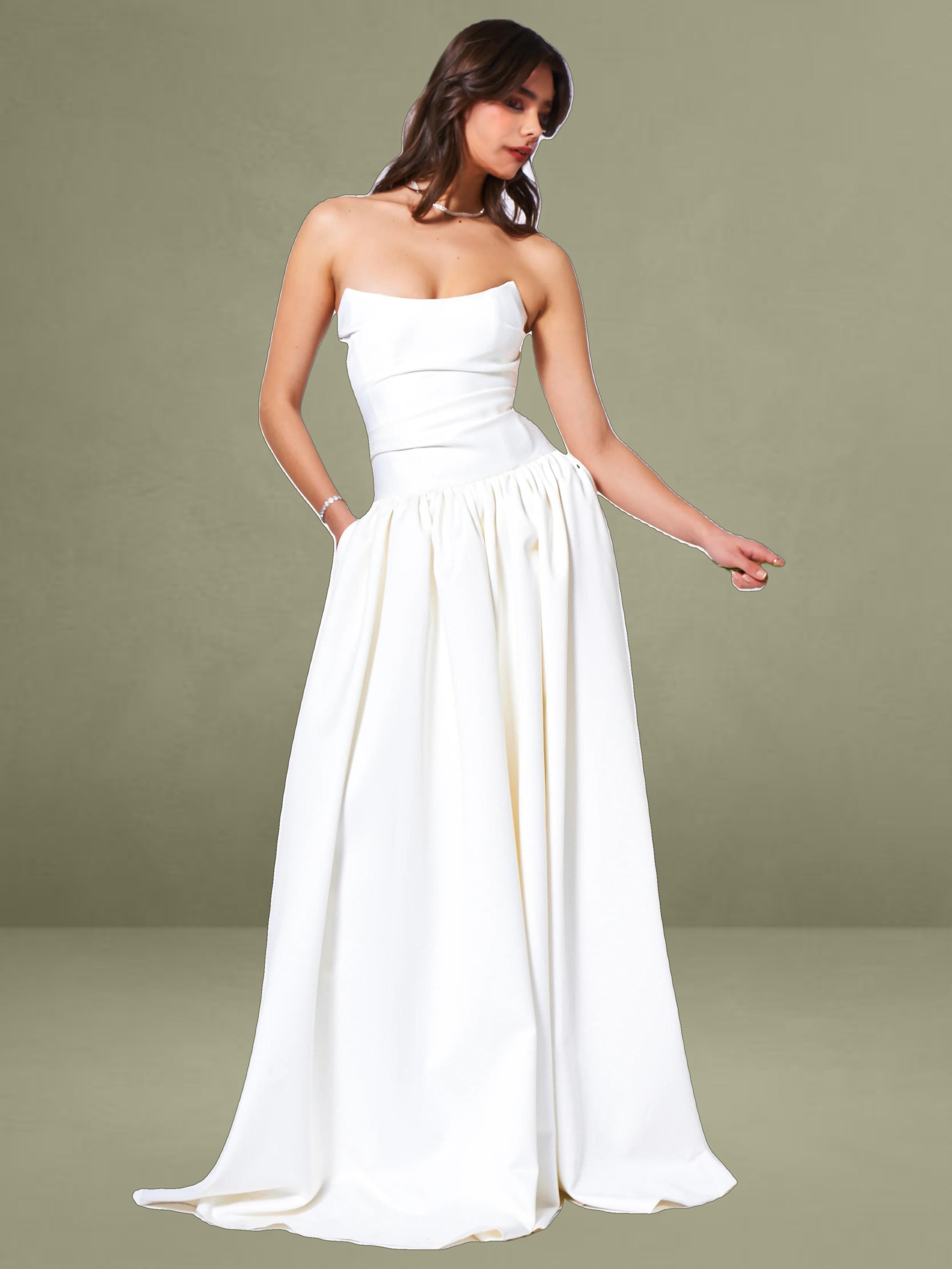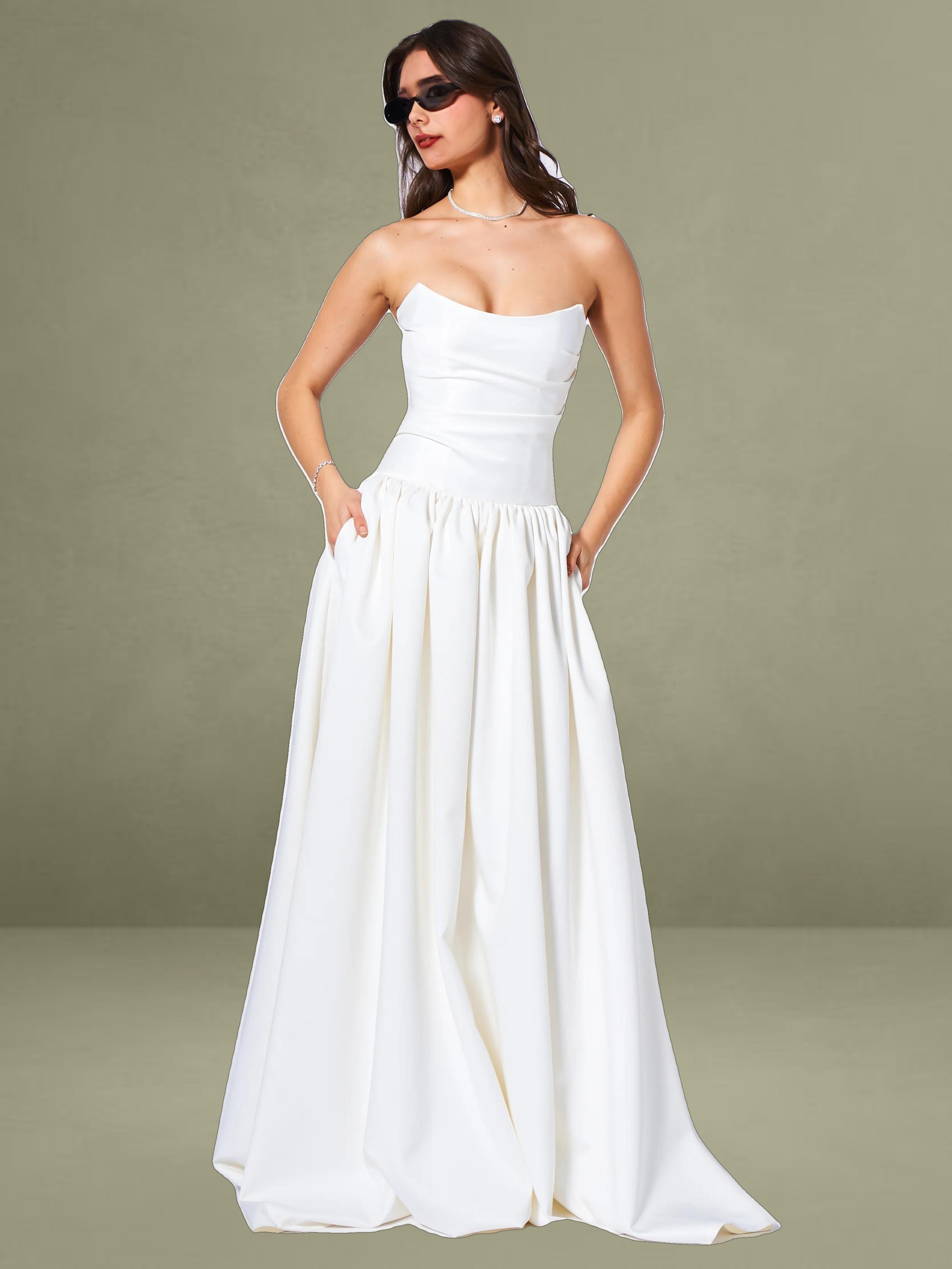 Experience the epitome of timeless elegance with our latest drop waist dress, a stunning creation designed for the most memorable moments in life. Crafted from luxurious white satin, this dress radiates sophistication and is the perfect choice for weddings or other special occasions. The full-length skirt cascades with graceful volume, creating a silhouette that is both romantic and captivating, while discreet side pockets offer a practical touch without compromising the dress's refined aesthetic.