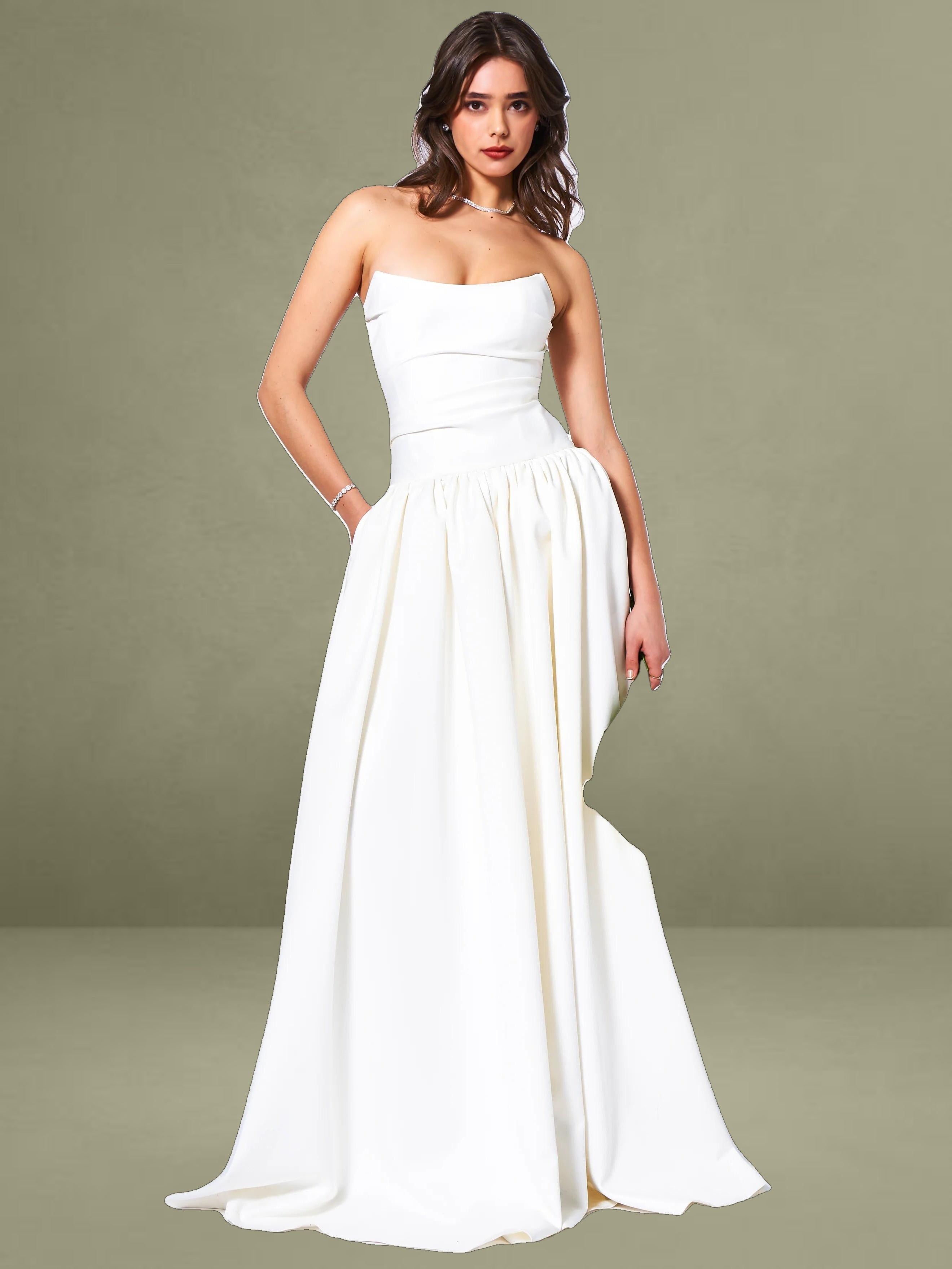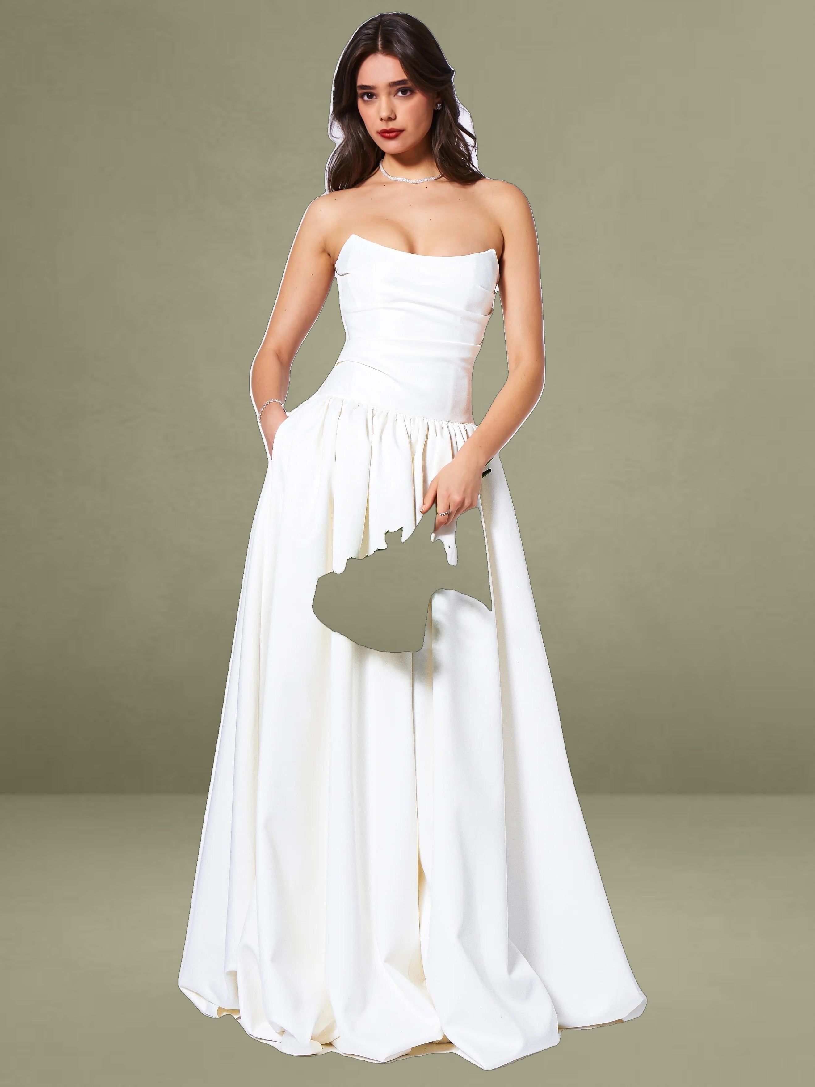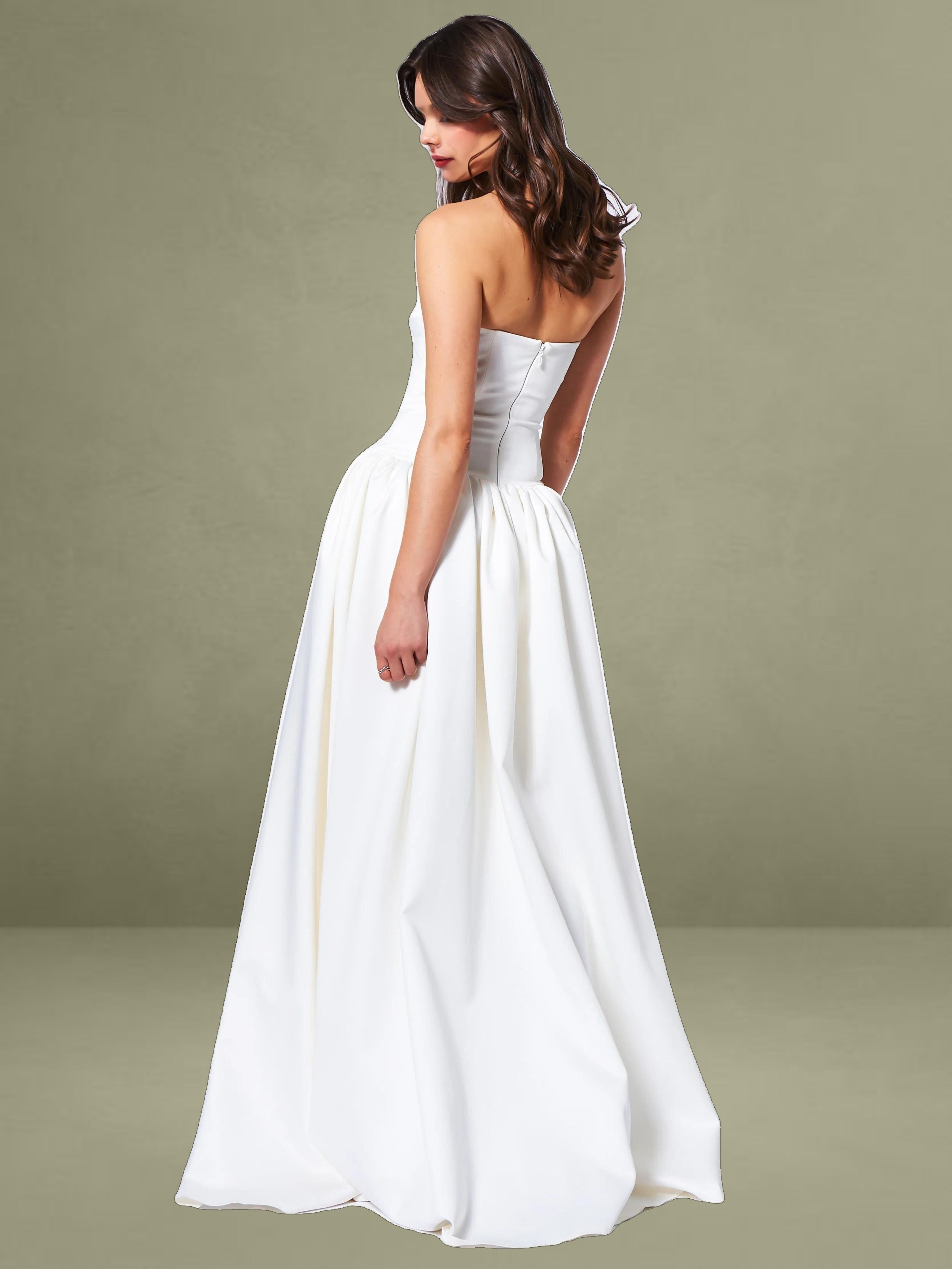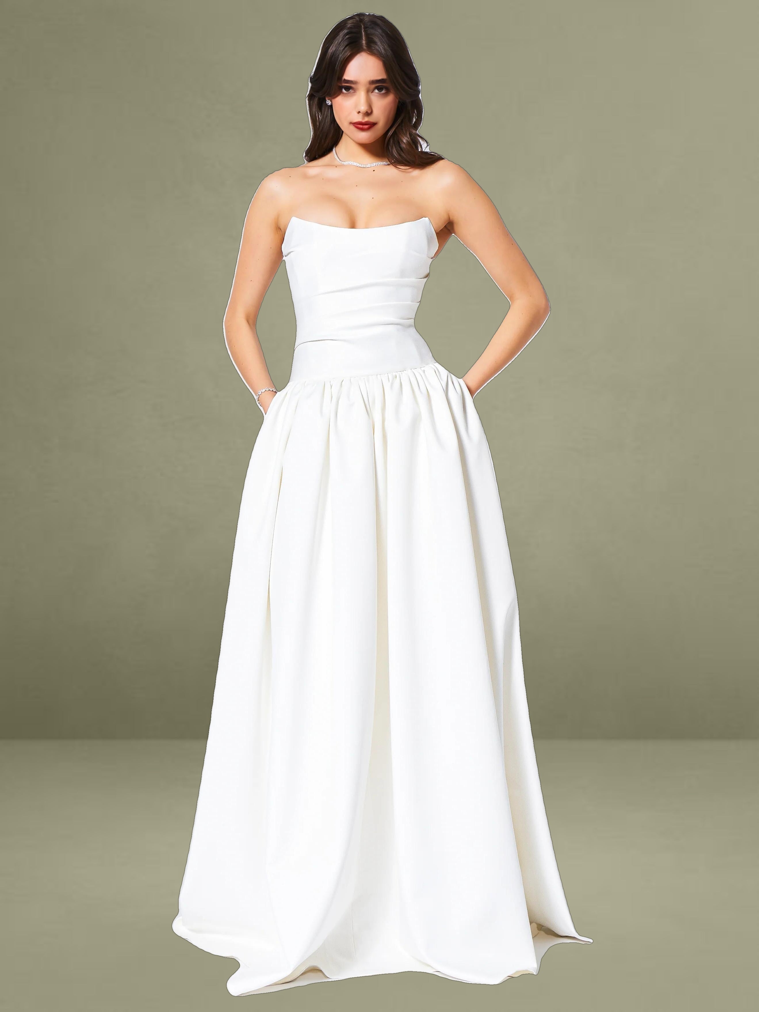 Experience the epitome of timeless elegance with our latest drop waist dress, a stunning creation designed for the most memorable moments in life. Crafted from luxurious white satin, this dress radiates sophistication and is the perfect choice for weddings or other special occasions. The full-length skirt cascades with graceful volume, creating a silhouette that is both romantic and captivating, while discreet side pockets offer a practical touch without compromising the dress's refined aesthetic.