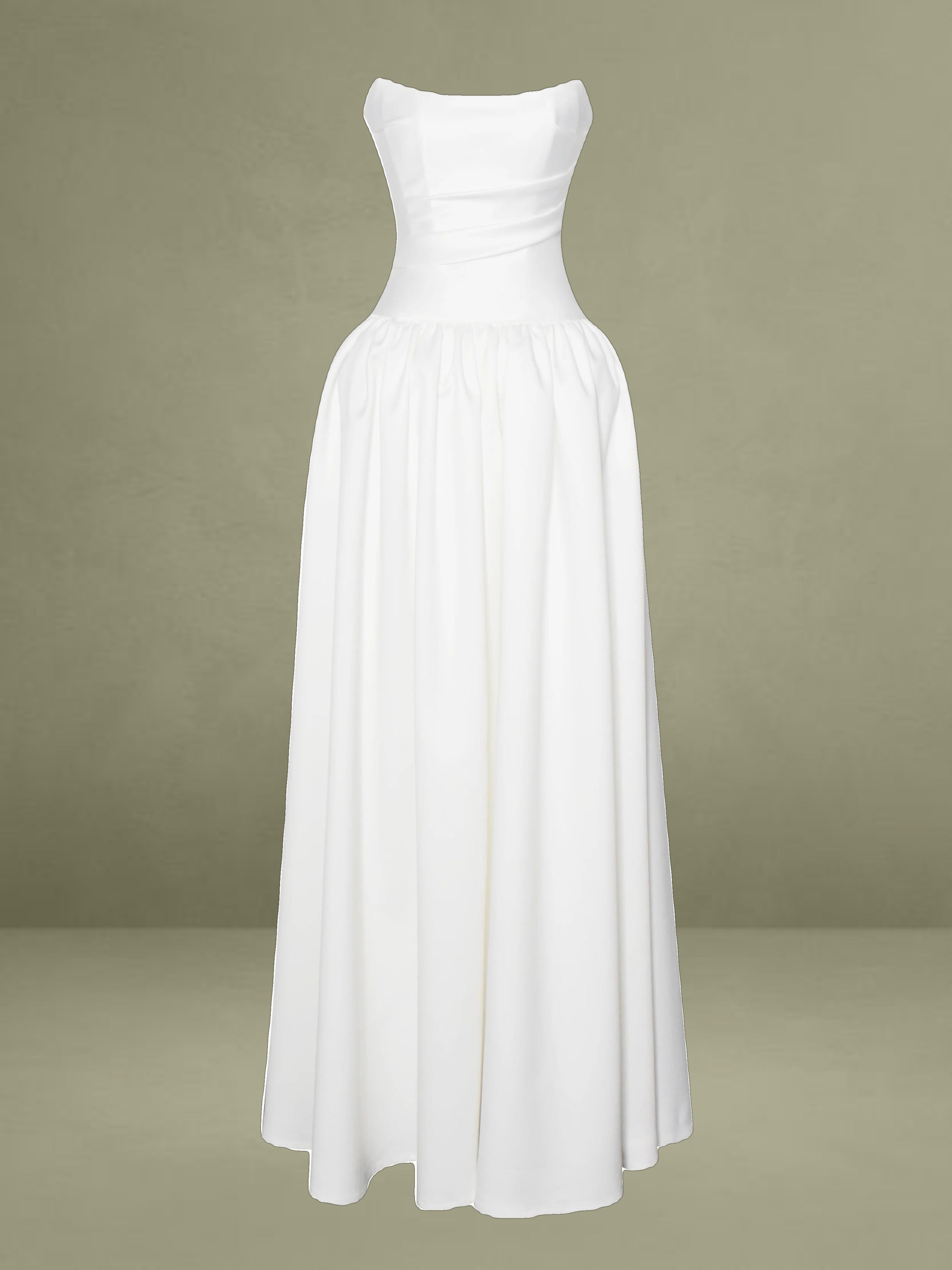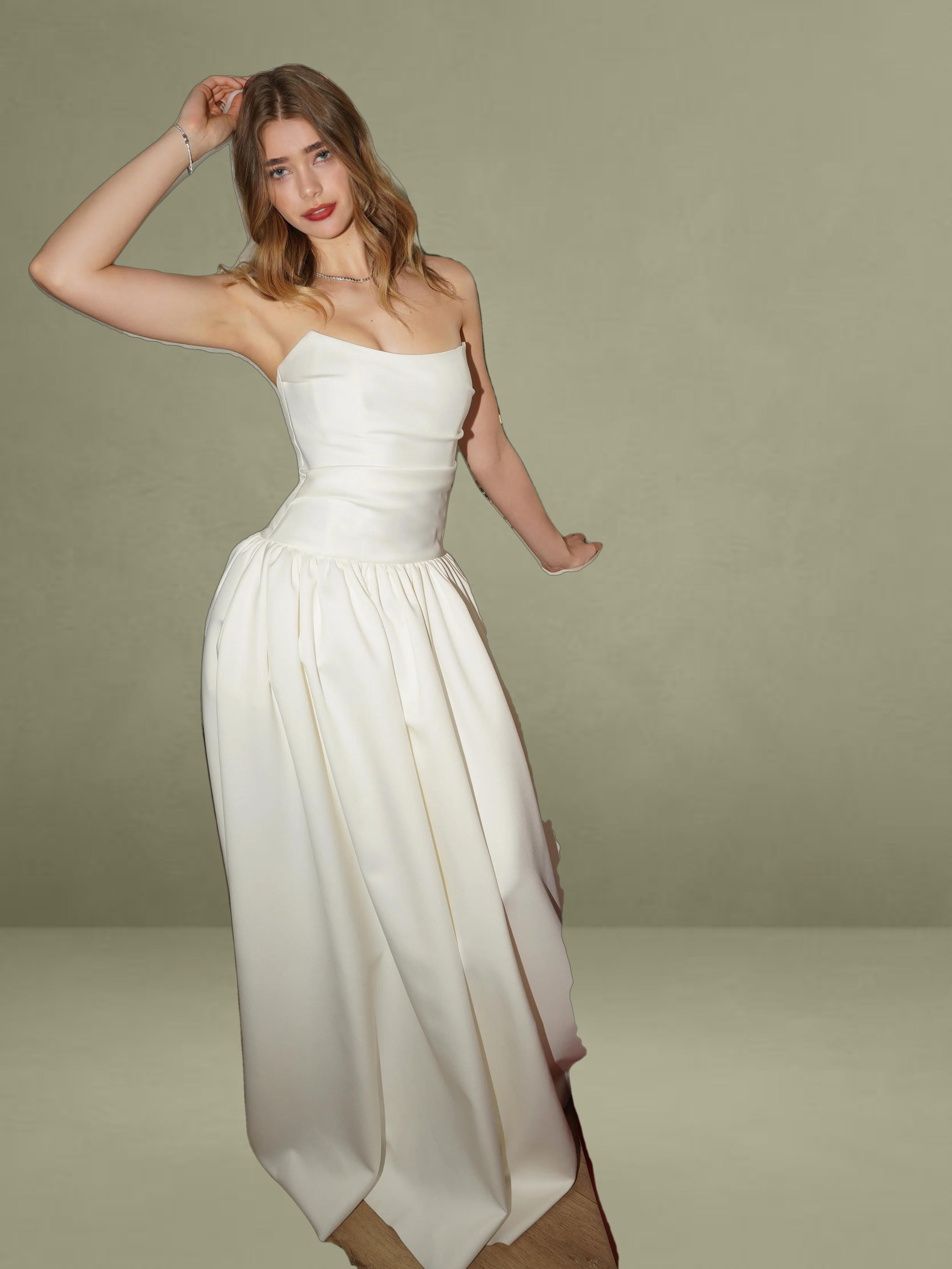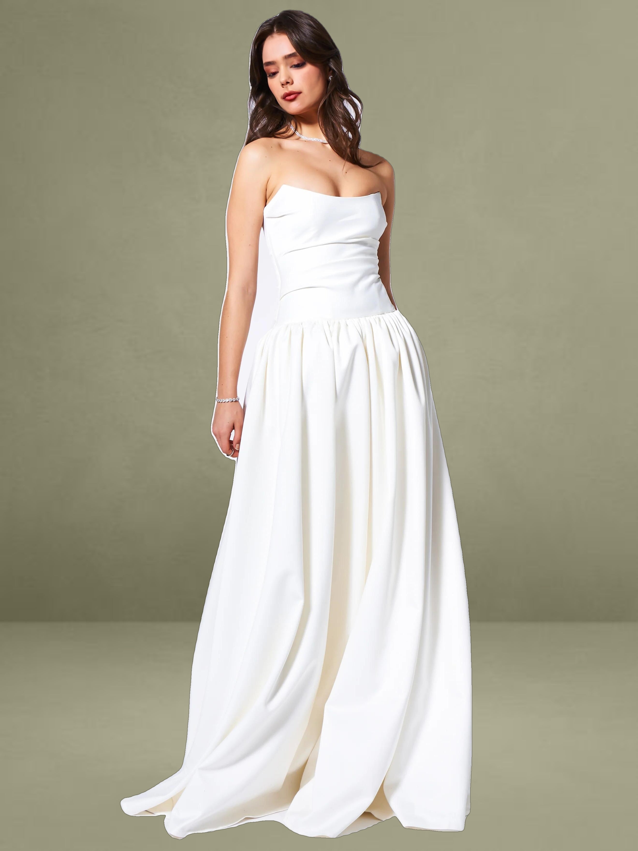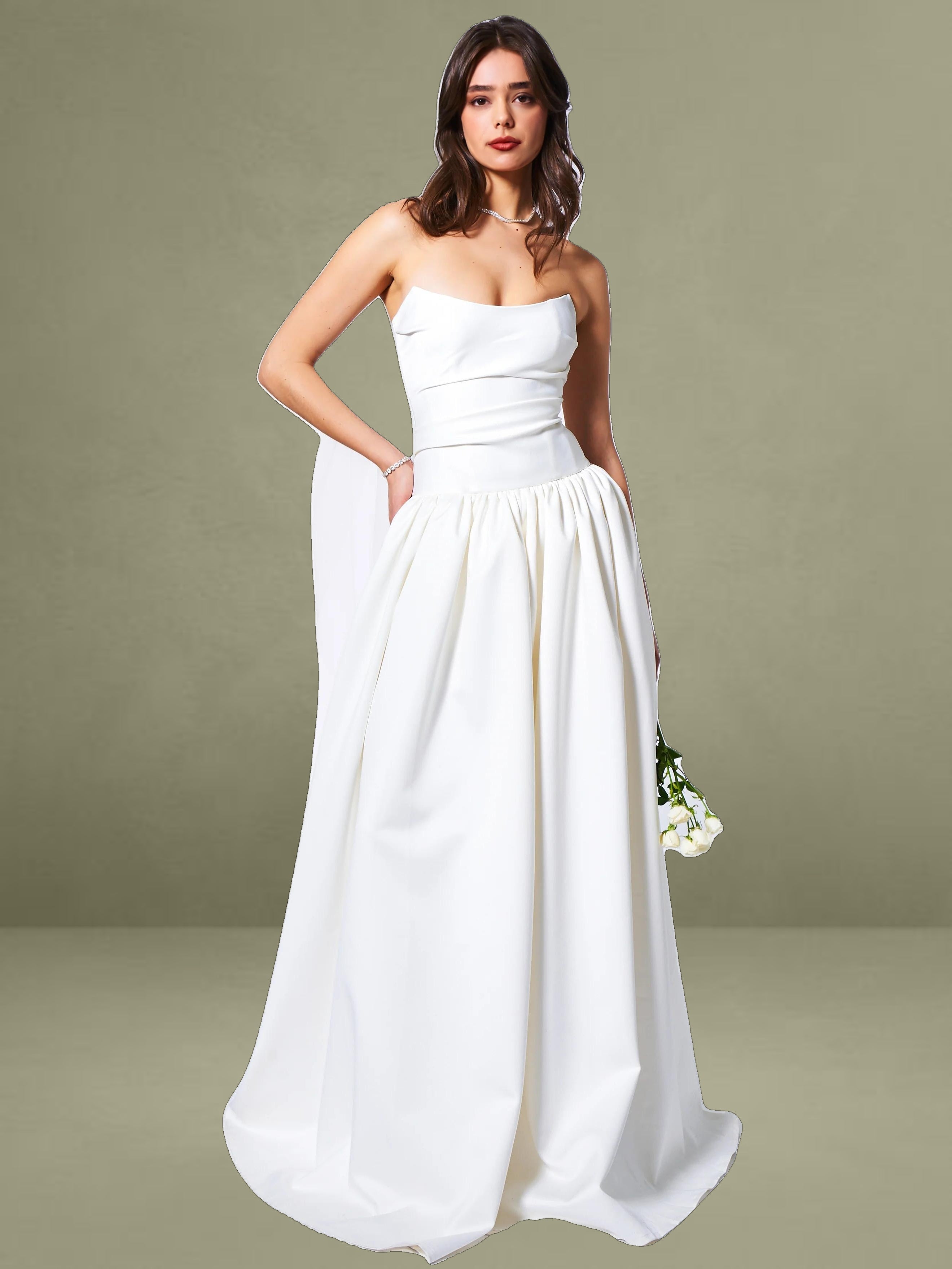 Experience the epitome of timeless elegance with our latest drop waist dress, a stunning creation designed for the most memorable moments in life. Crafted from luxurious white satin, this dress radiates sophistication and is the perfect choice for weddings or other special occasions. The full-length skirt cascades with graceful volume, creating a silhouette that is both romantic and captivating, while discreet side pockets offer a practical touch without compromising the dress's refined aesthetic.