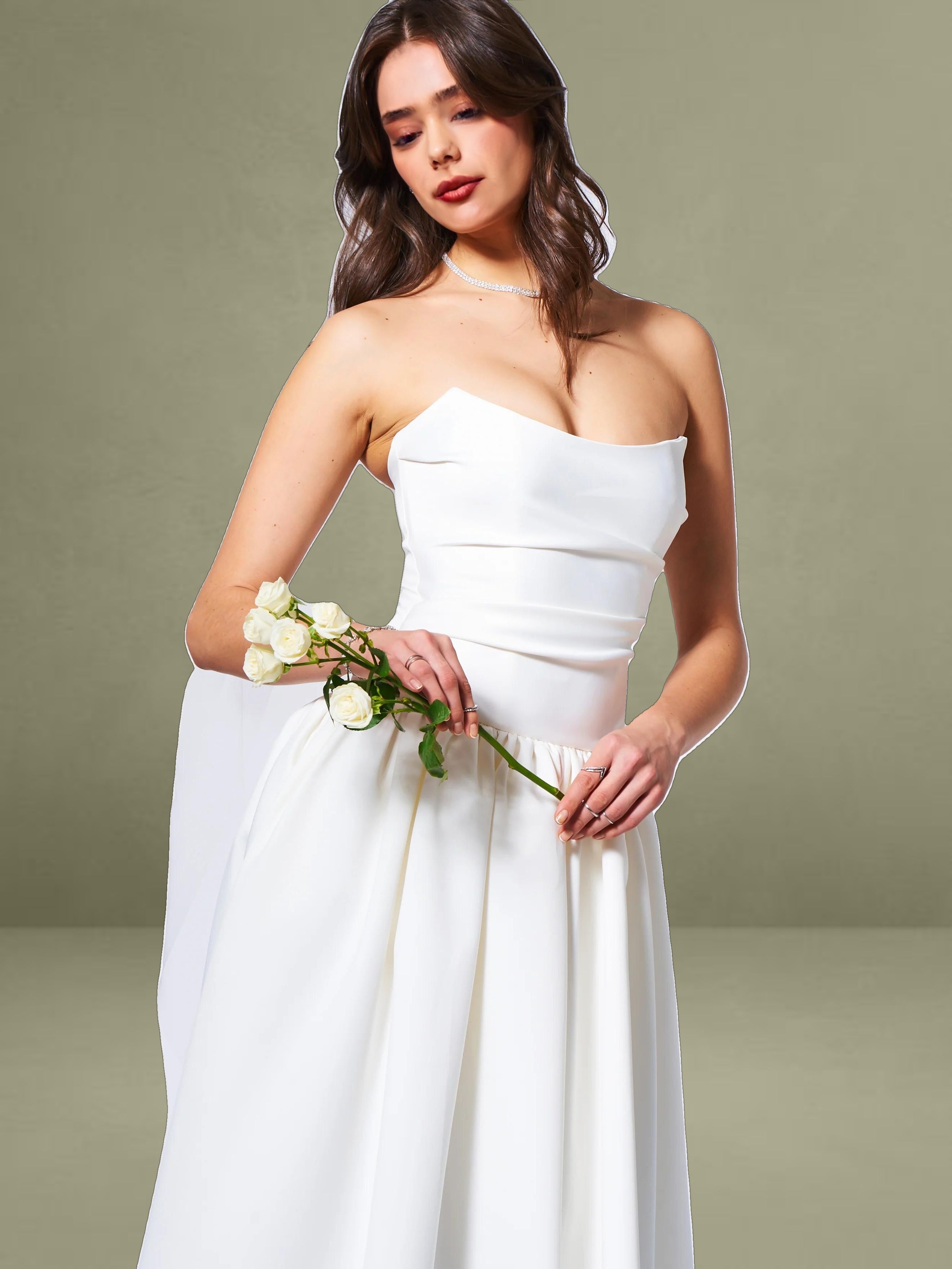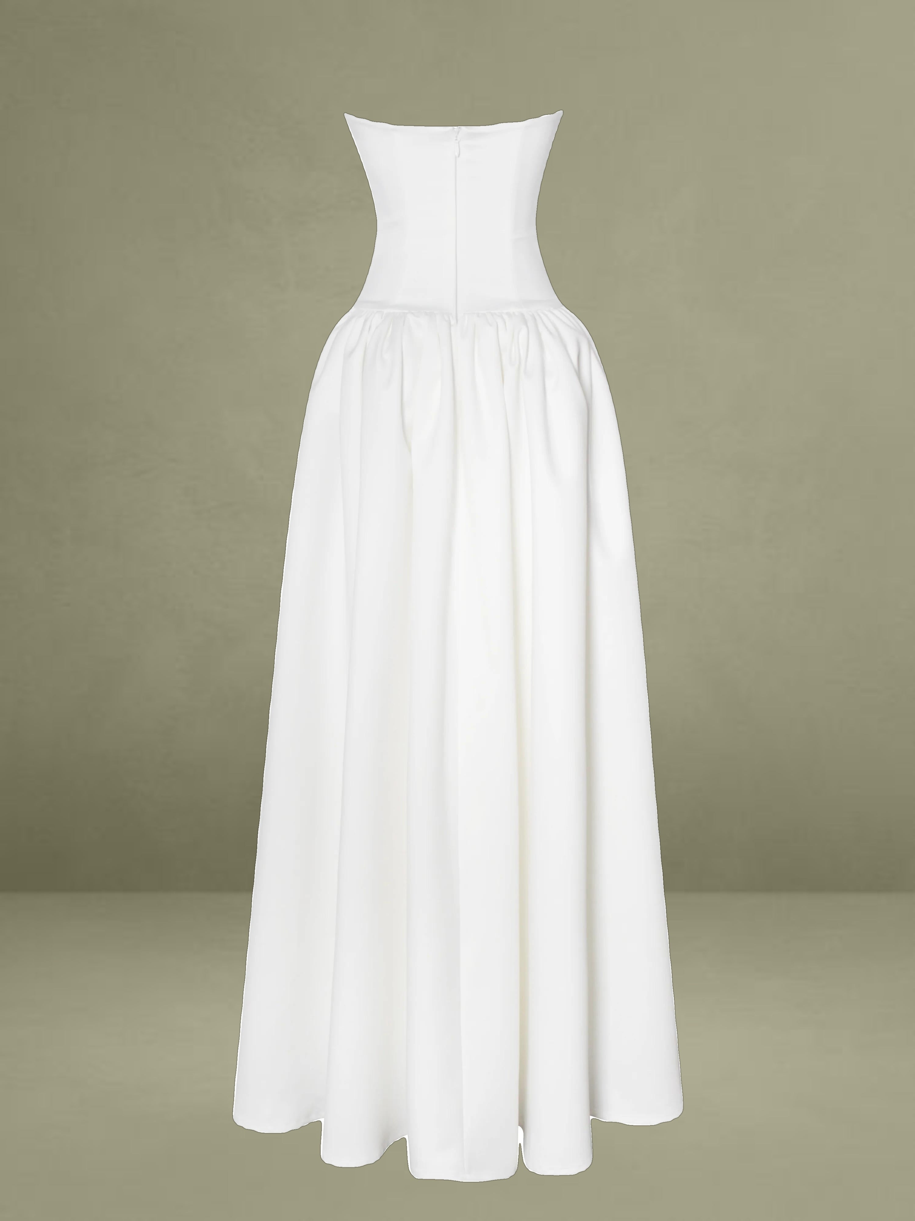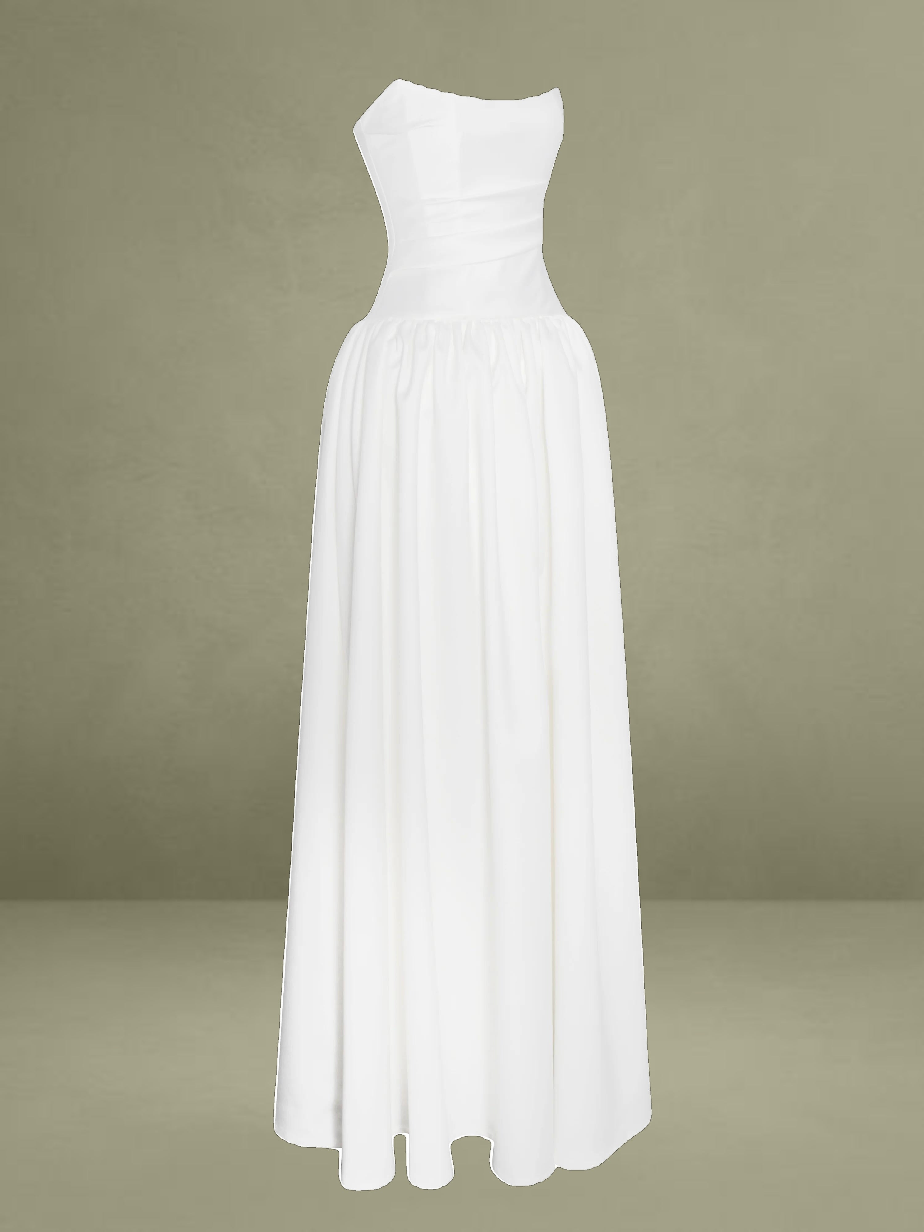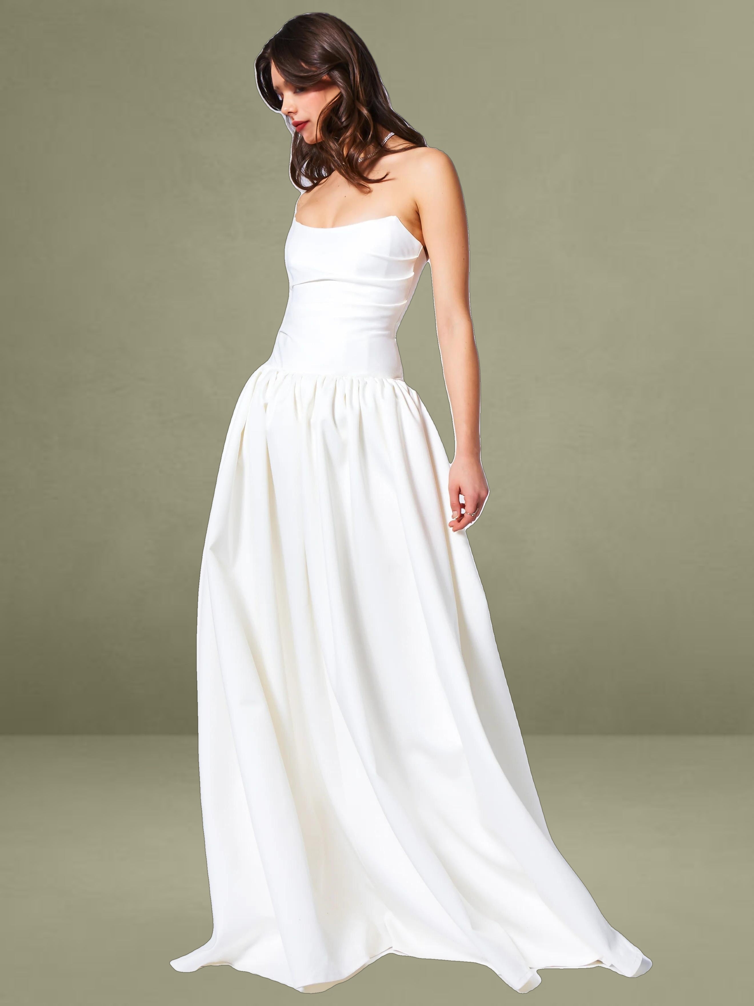 Experience the epitome of timeless elegance with our latest drop waist dress, a stunning creation designed for the most memorable moments in life. Crafted from luxurious white satin, this dress radiates sophistication and is the perfect choice for weddings or other special occasions. The full-length skirt cascades with graceful volume, creating a silhouette that is both romantic and captivating, while discreet side pockets offer a practical touch without compromising the dress's refined aesthetic.