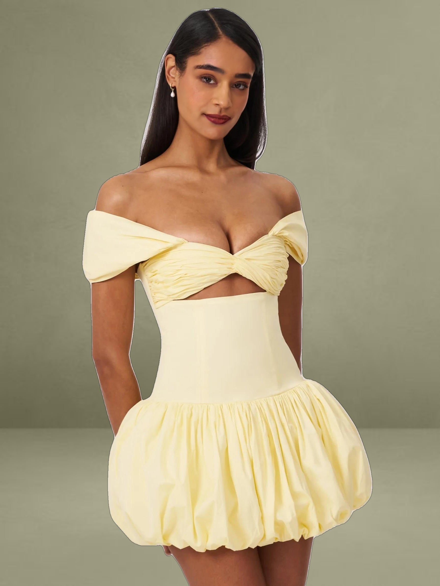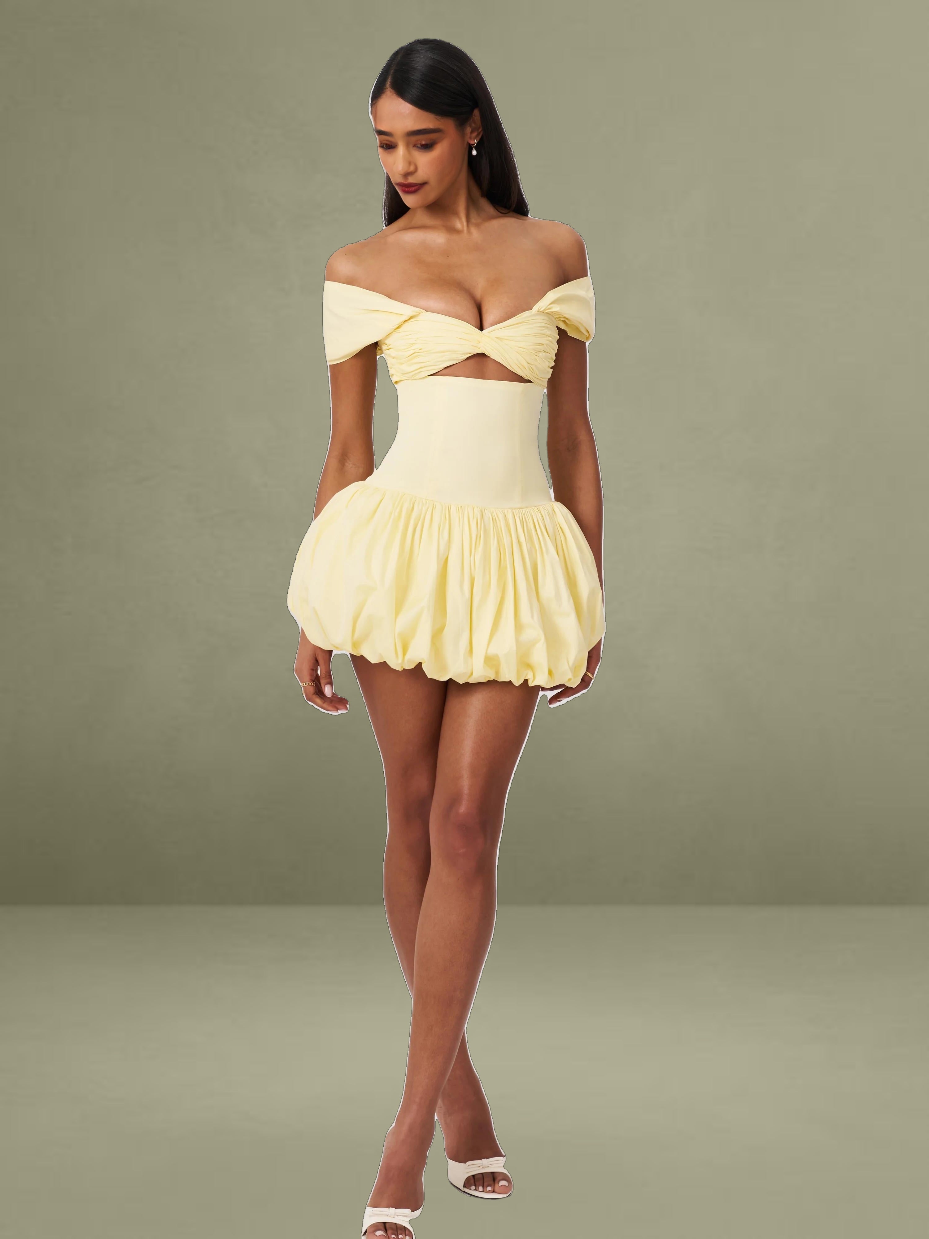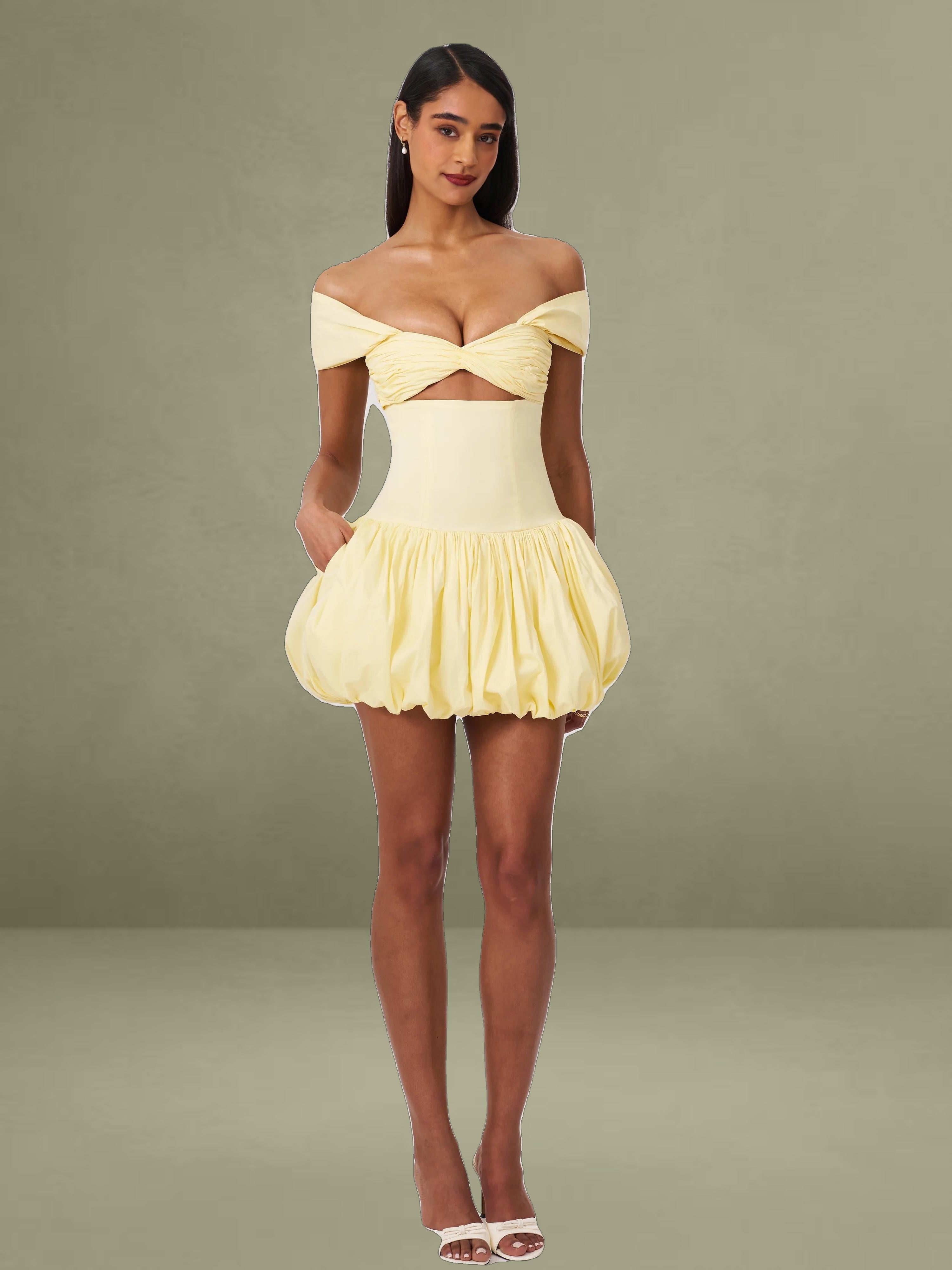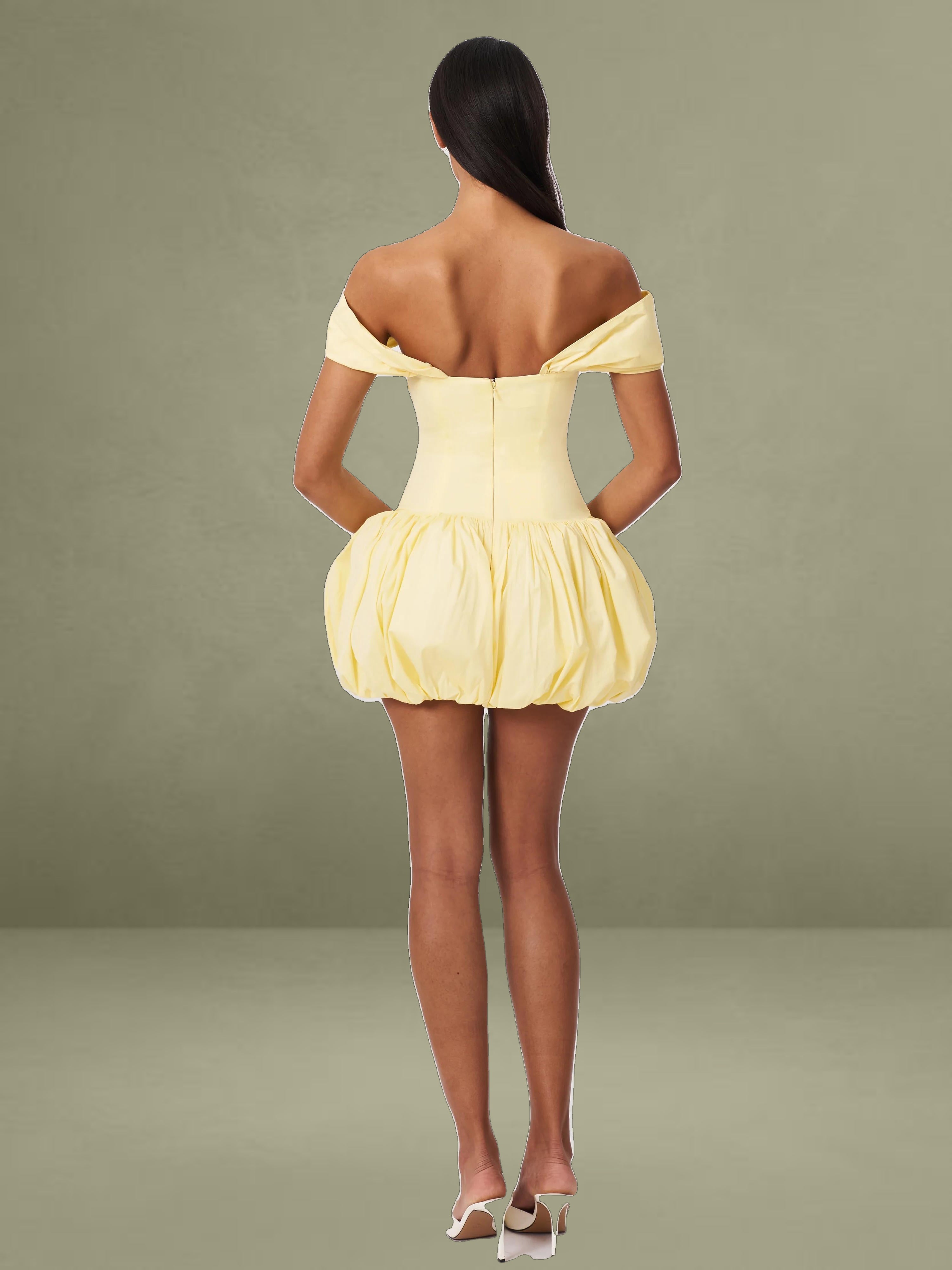 Step into timeless elegance with our Umika dress, a captivating blend of classic charm and modern flair. This off-shoulder mini dress features a drop waist and a unique bubble hem, elevating your style with every step. The pleated cups offer a touch of sophistication, while built-in boning ensures a flattering silhouette. Practicality meets chic with convenient pockets and a fully lined design. Seamlessly slip into this dress with its invisible zipper, embracing both comfort and style effortlessly. Perfect for any occasion, it's a versatile piece that will leave a lasting impression. It is also available in White and Black.