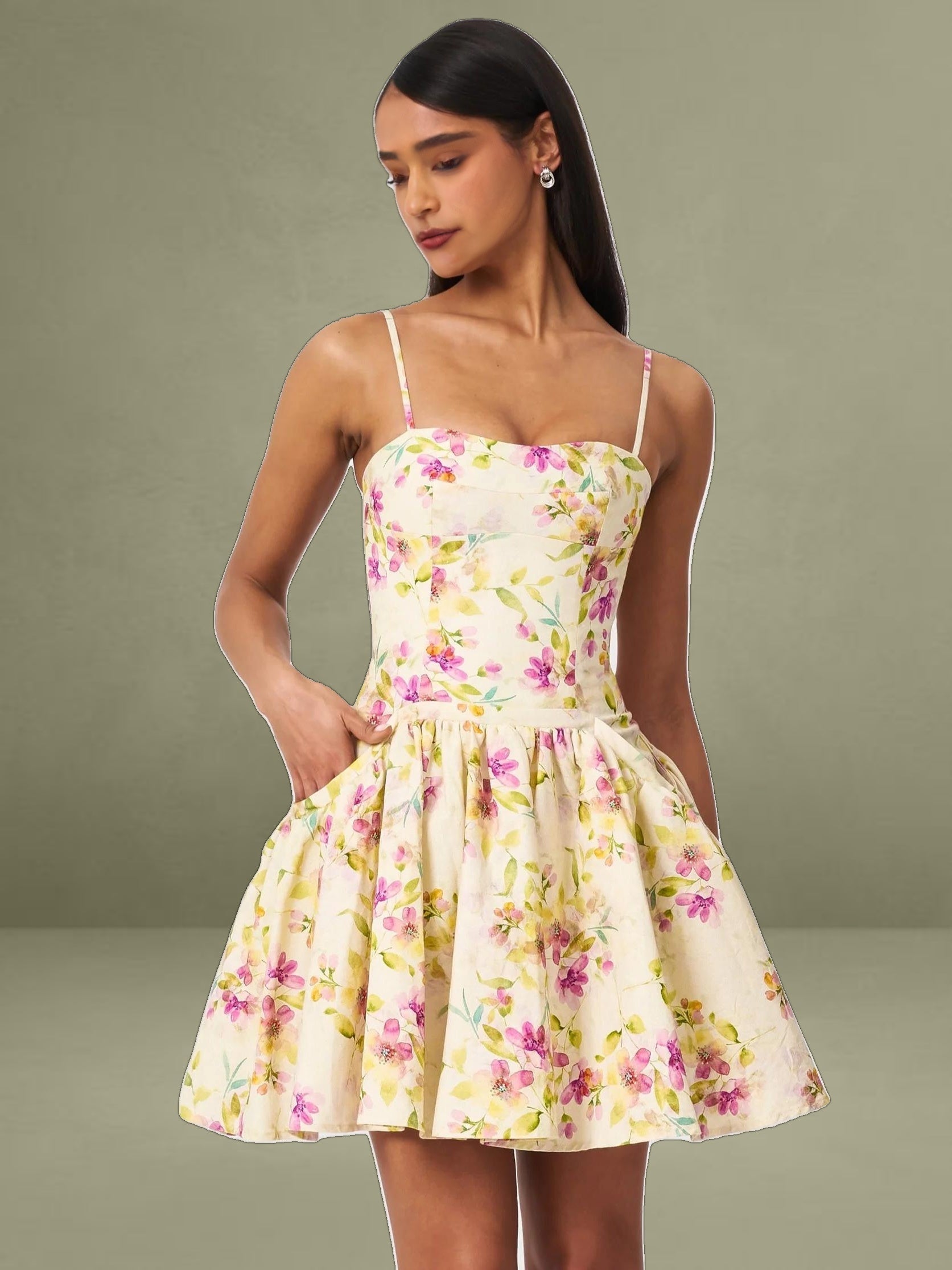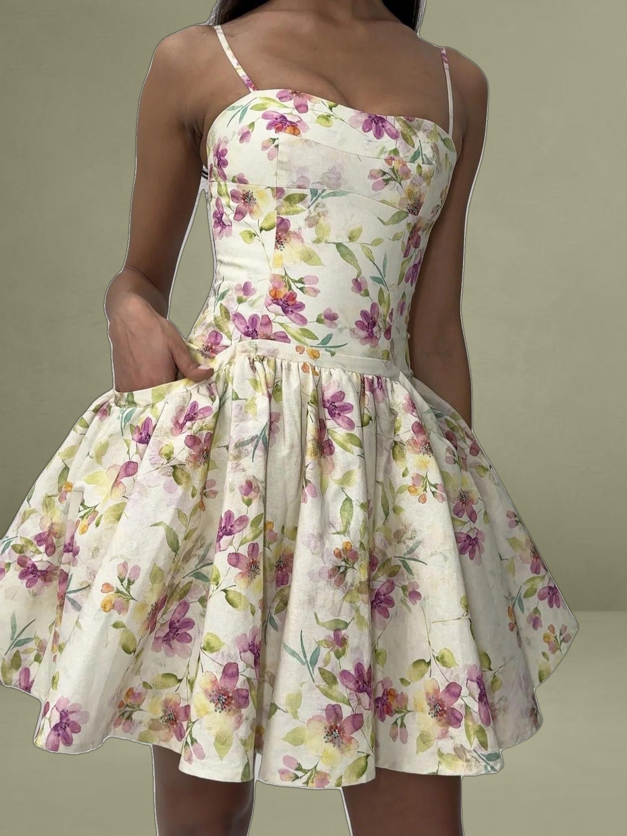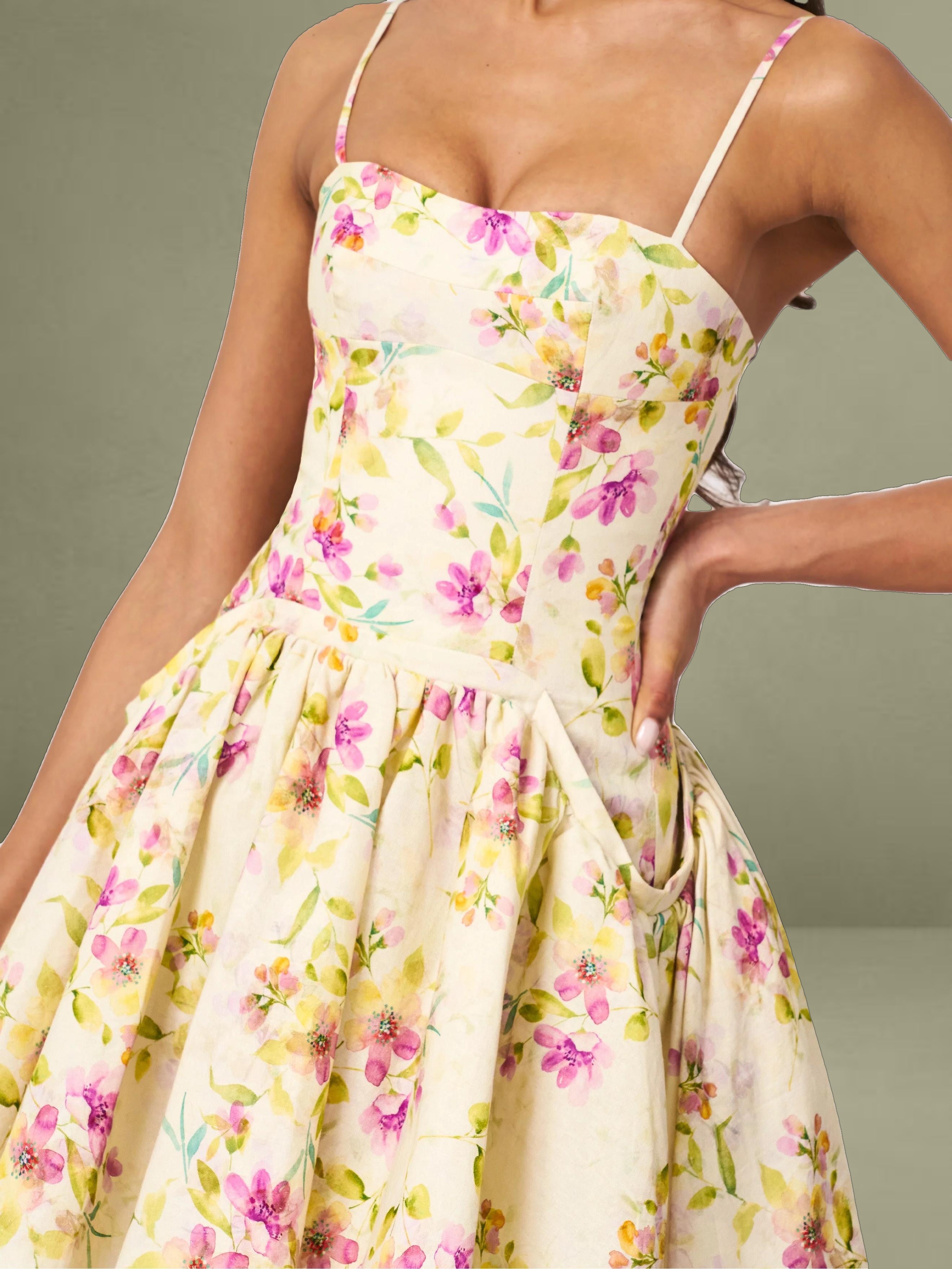 The Valda Dress is a charming spring essential, perfect for picnics, vacations, holidays, and casual outings. Crafted from breathable linen fabric, it features a yellow base with a delicate pink floral print, exuding warmth and femininity. The pleated skirt adds graceful movement, while the big pockets bring both style and practicality. Designed for a customizable fit, the dress includes adjustable straps and an invisible zipper for a seamless look. Light, airy, and effortlessly elegant, the Valda Dress is a must-have for a breezy and romantic spring wardrobe.