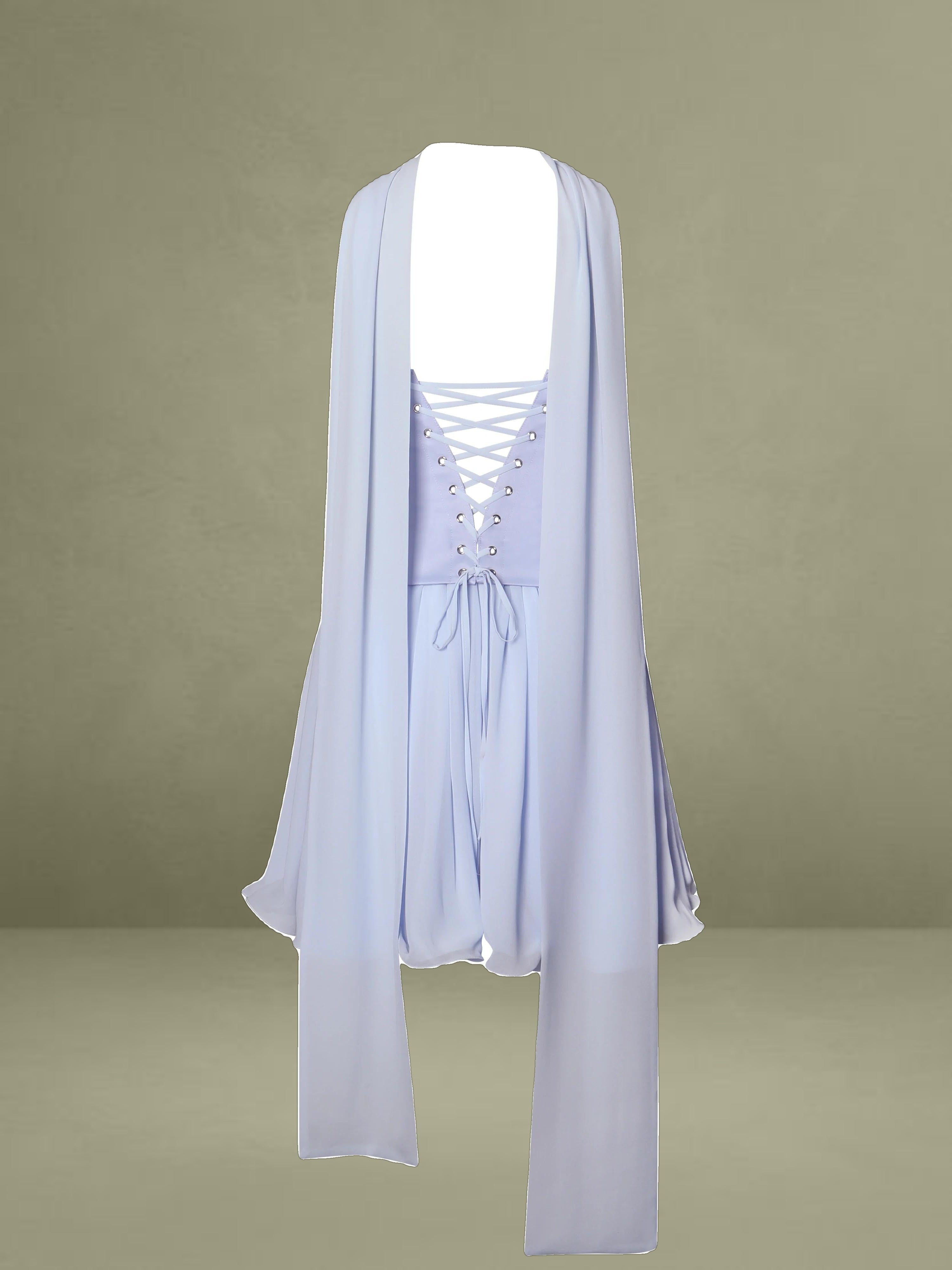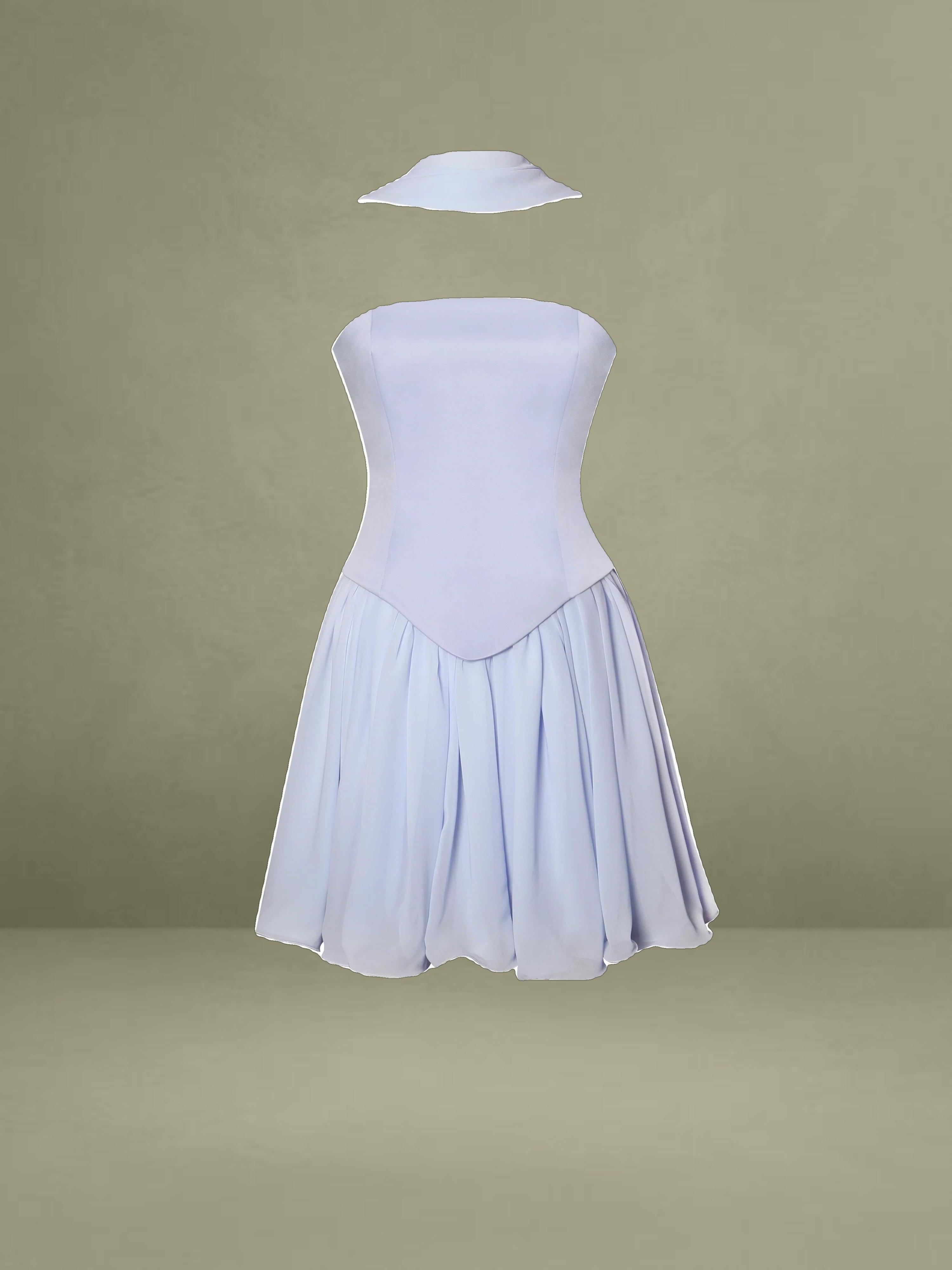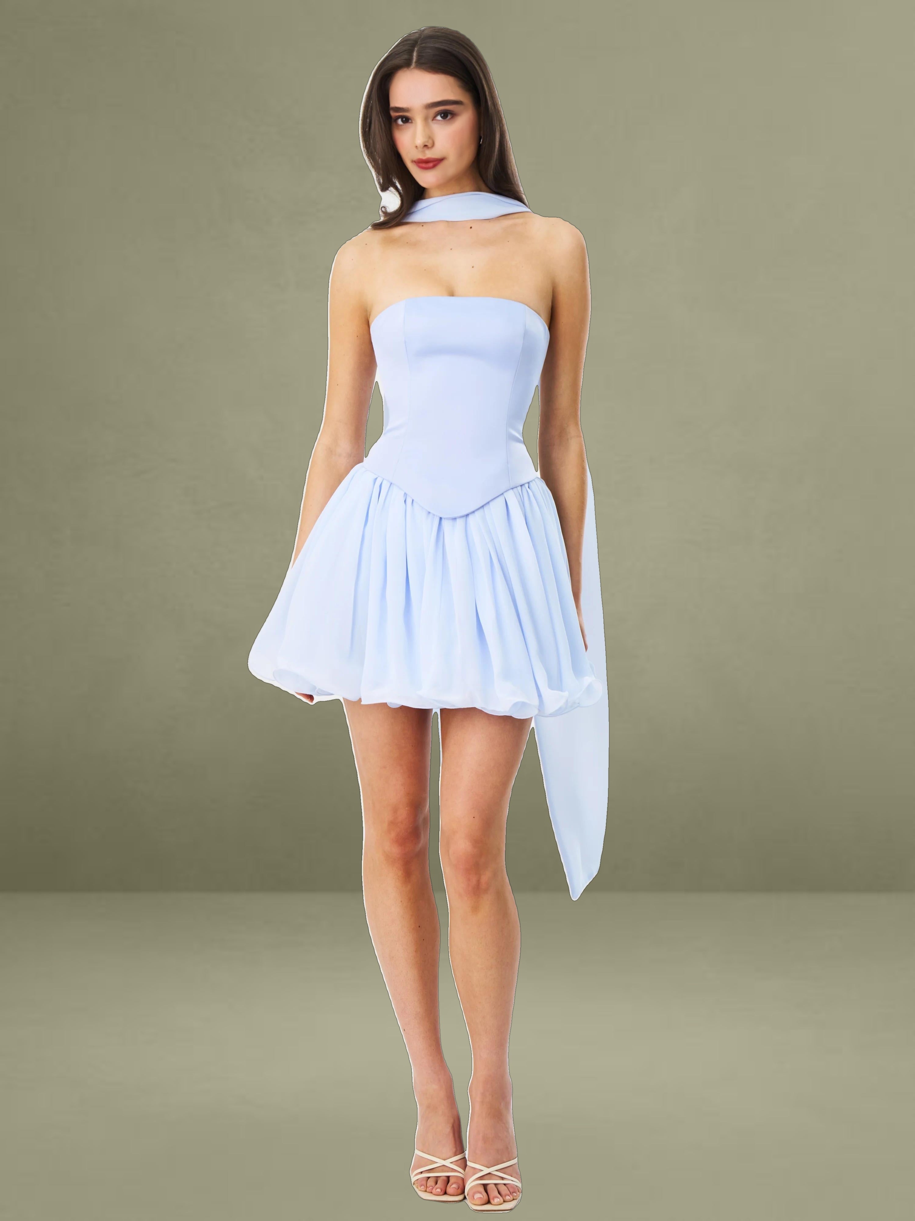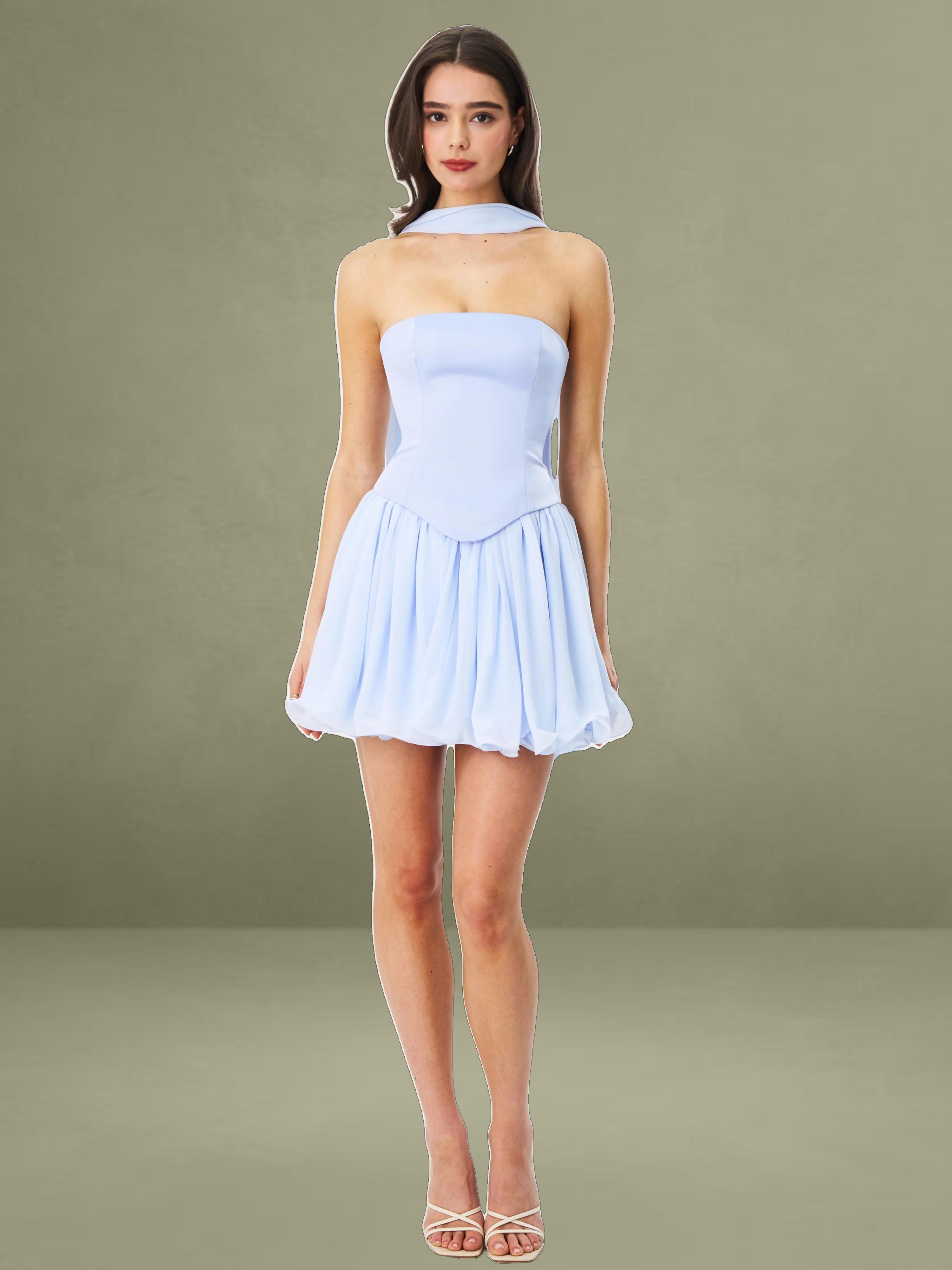 Charming and romantic, the Valentina Dress is a baby blue mini that blends playful elegance with elevated details. Featuring a strapless satin top with a structured boned curve edge and built-in corset, it’s designed to flatter and support. A delicate peplum waist flows into a layered chiffon skirt, bringing softness and graceful movement to the silhouette. Finished with a lace-up back for an adjustable fit, this dress comes fully lined and includes a matching chiffon scarf for added versatility. Perfect for special events or summer soirées, and also available as a Maxi Gown for a more formal take.