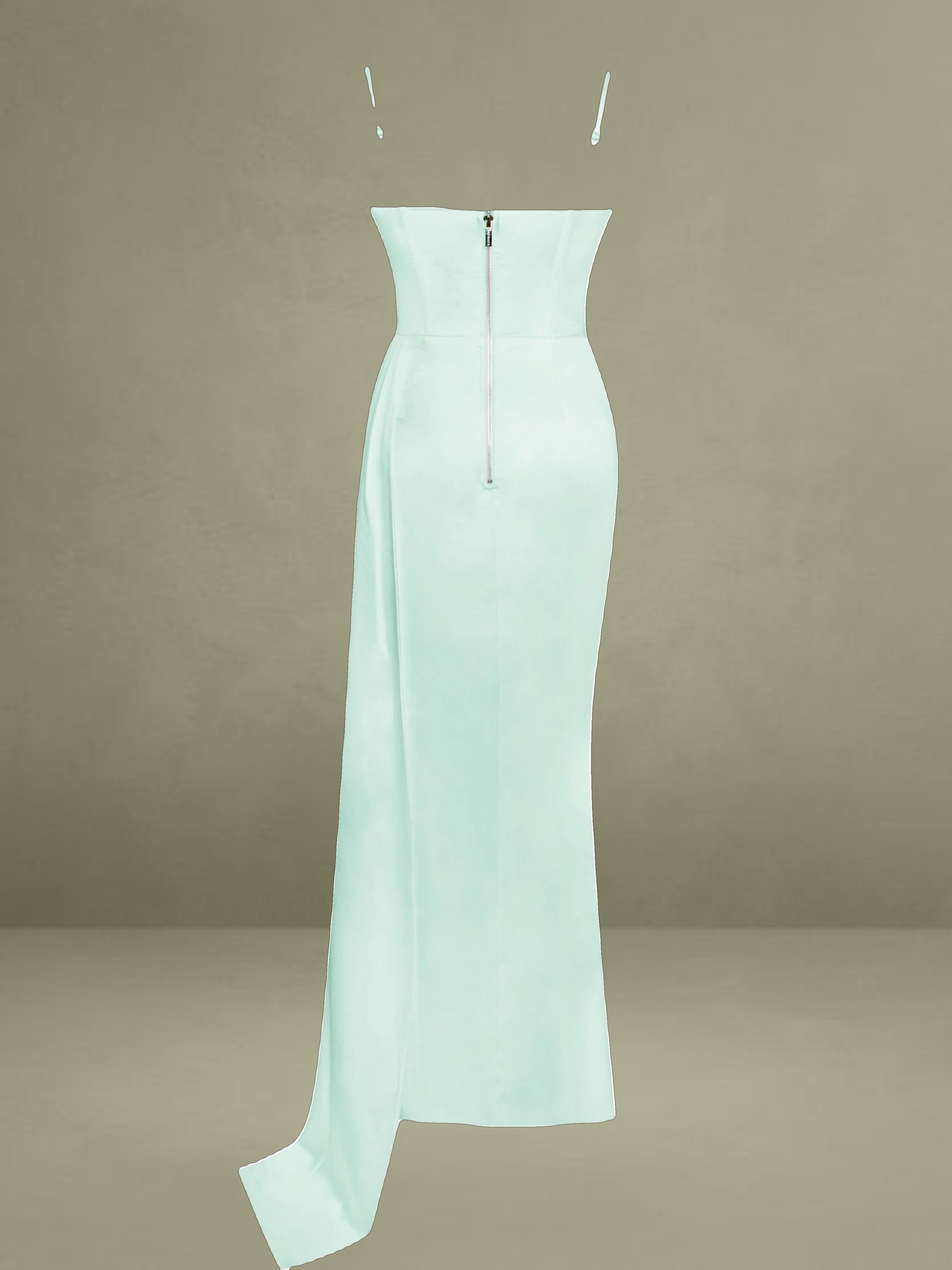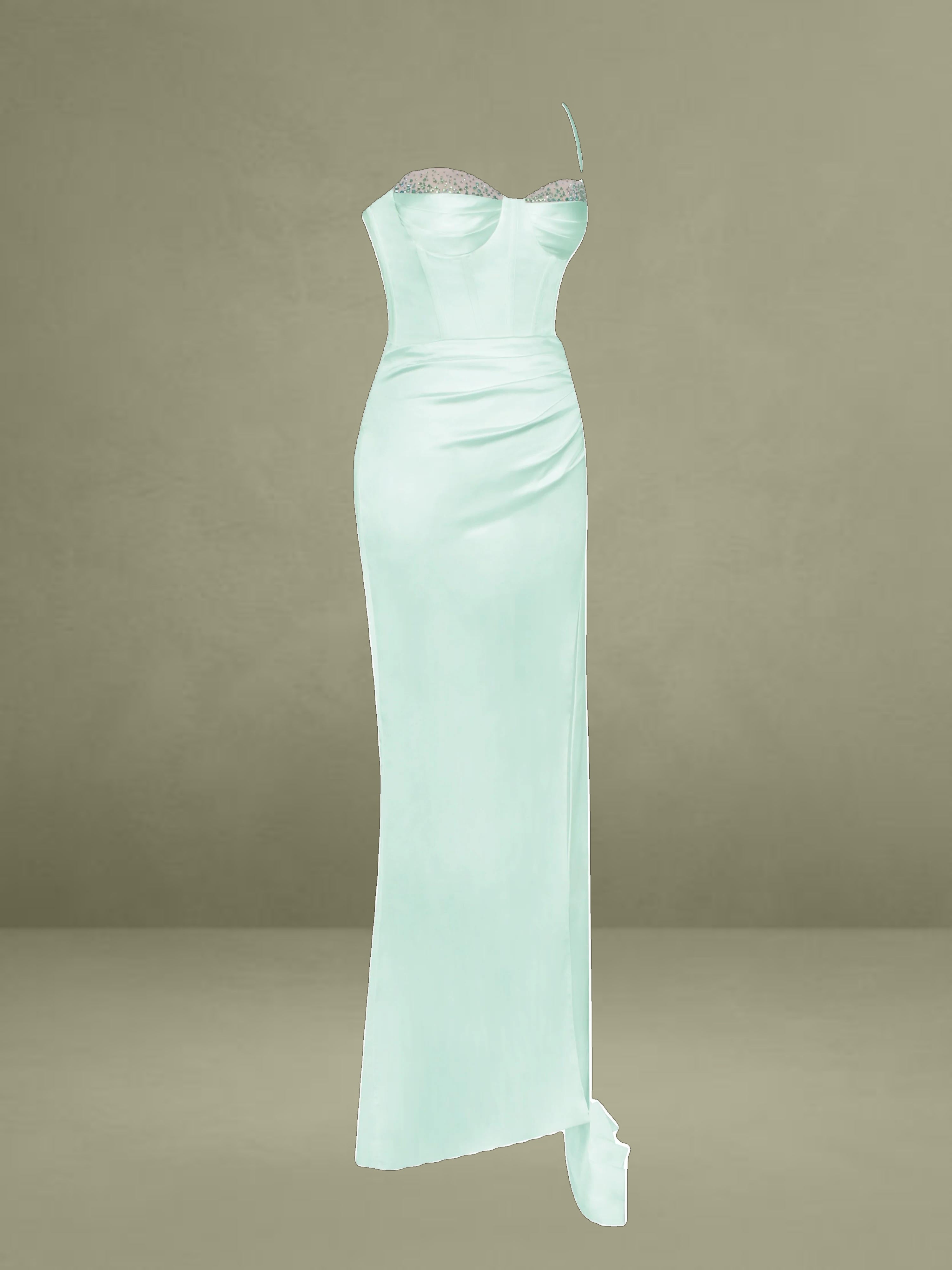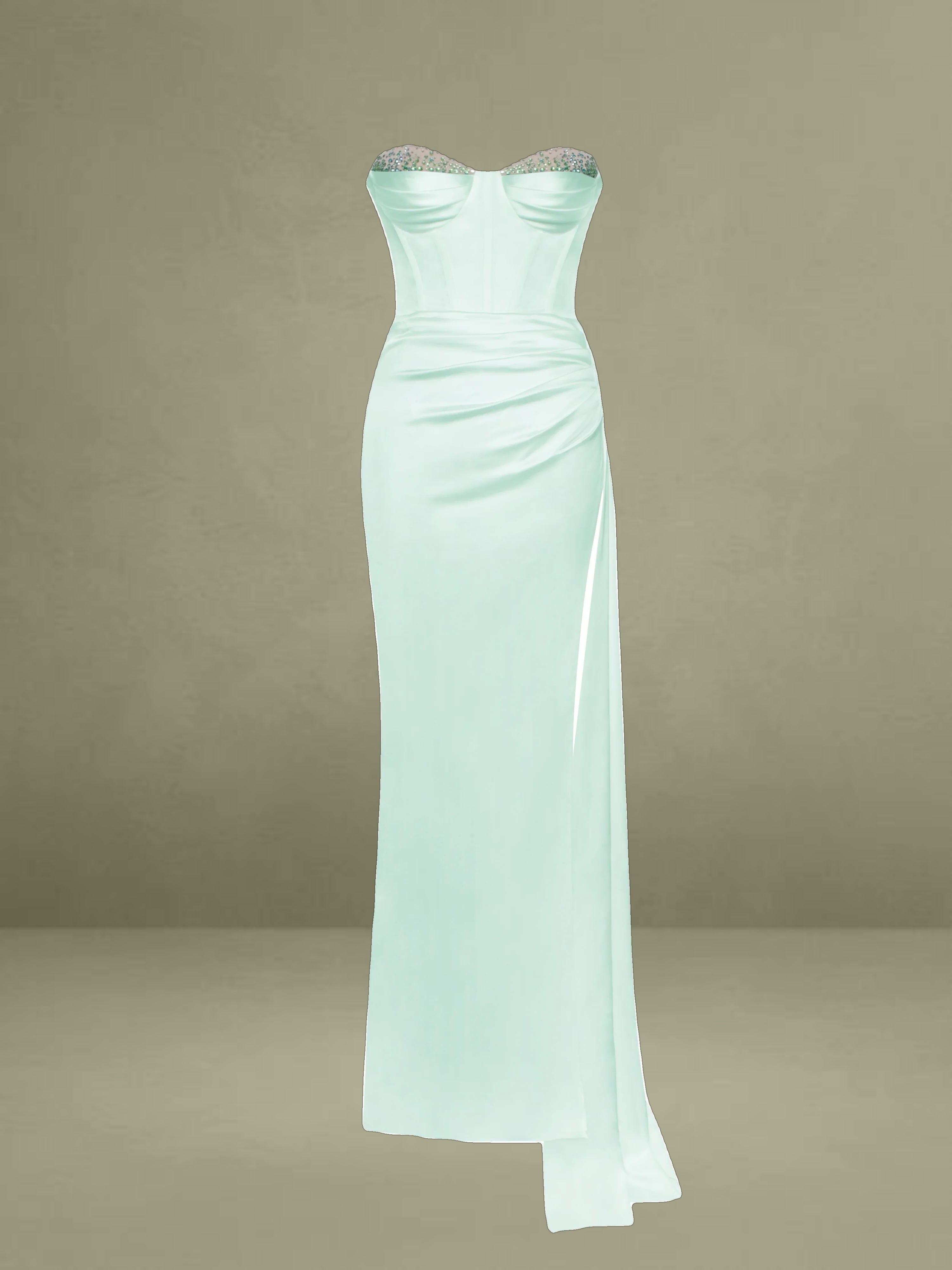 Illuminate in exquisite style. This classic Miss Circle corset gown with mid-thigh slit and ruched draping at the hip is handcrafted with stunning detail. Adorned with hand-placed crystals on the cups of the sweetheart neckline, you'll be a vision of beauty at any special occasion. The soft and luxurious look and feel will have you stunning with every step. Find Vanity in blush pink, white, and green.